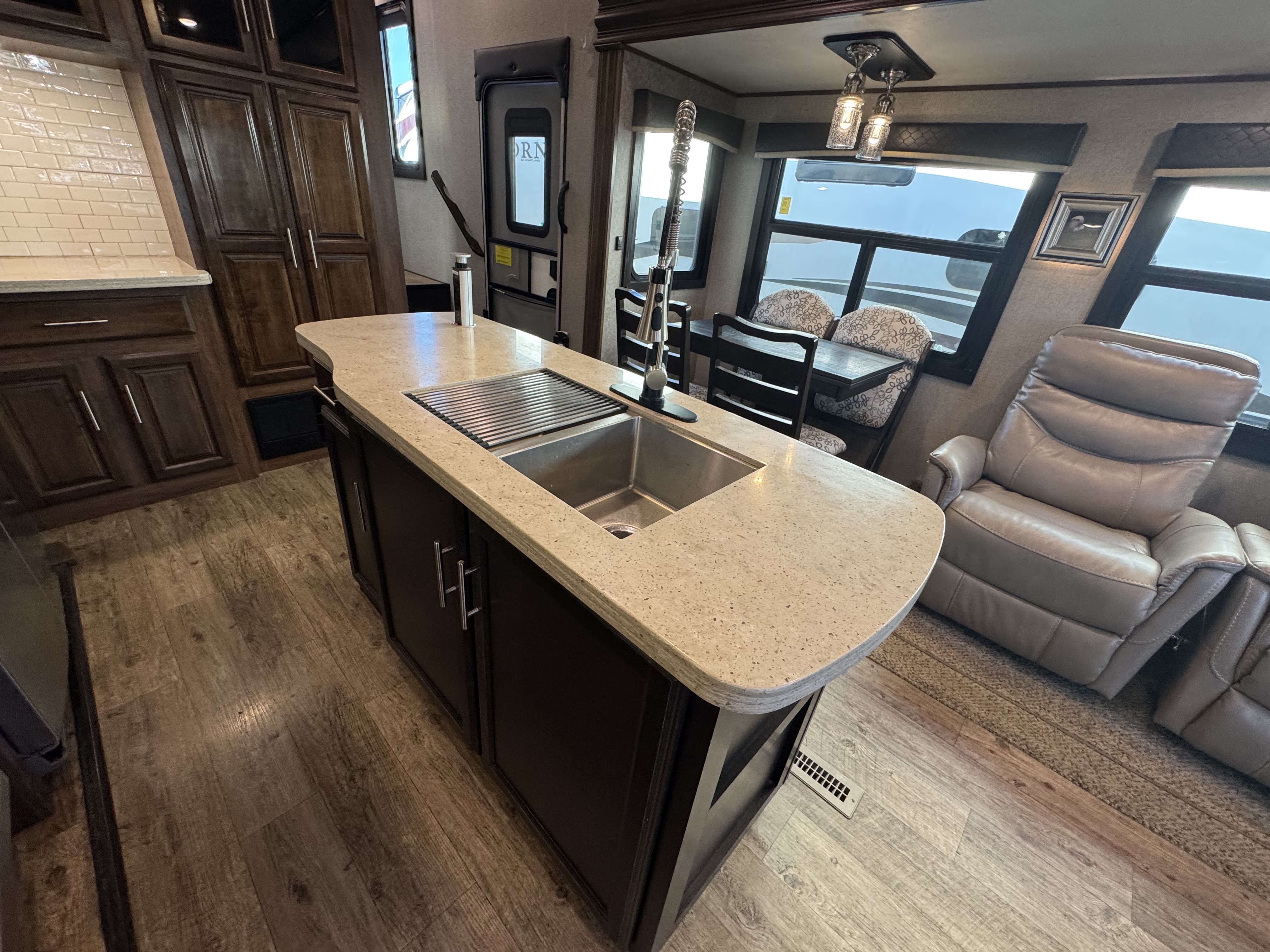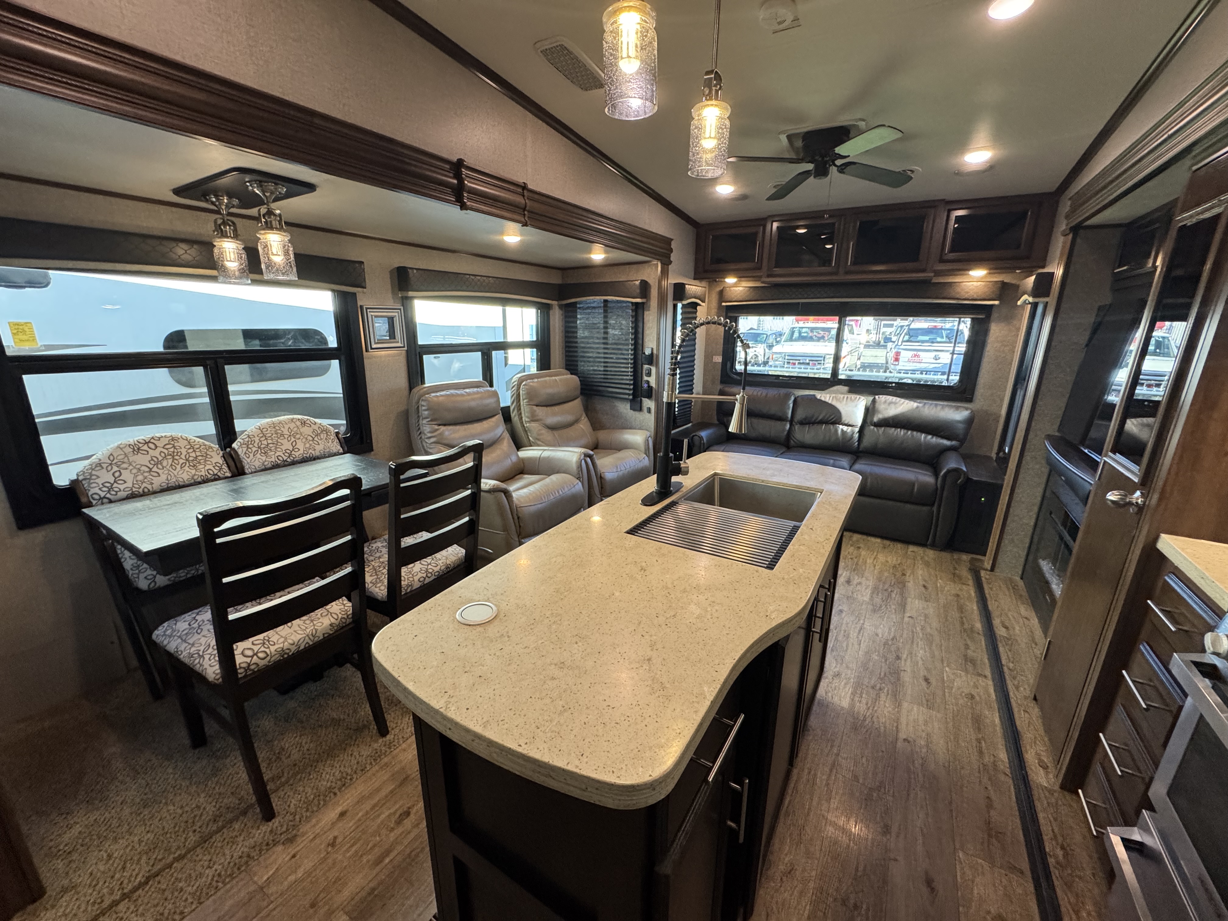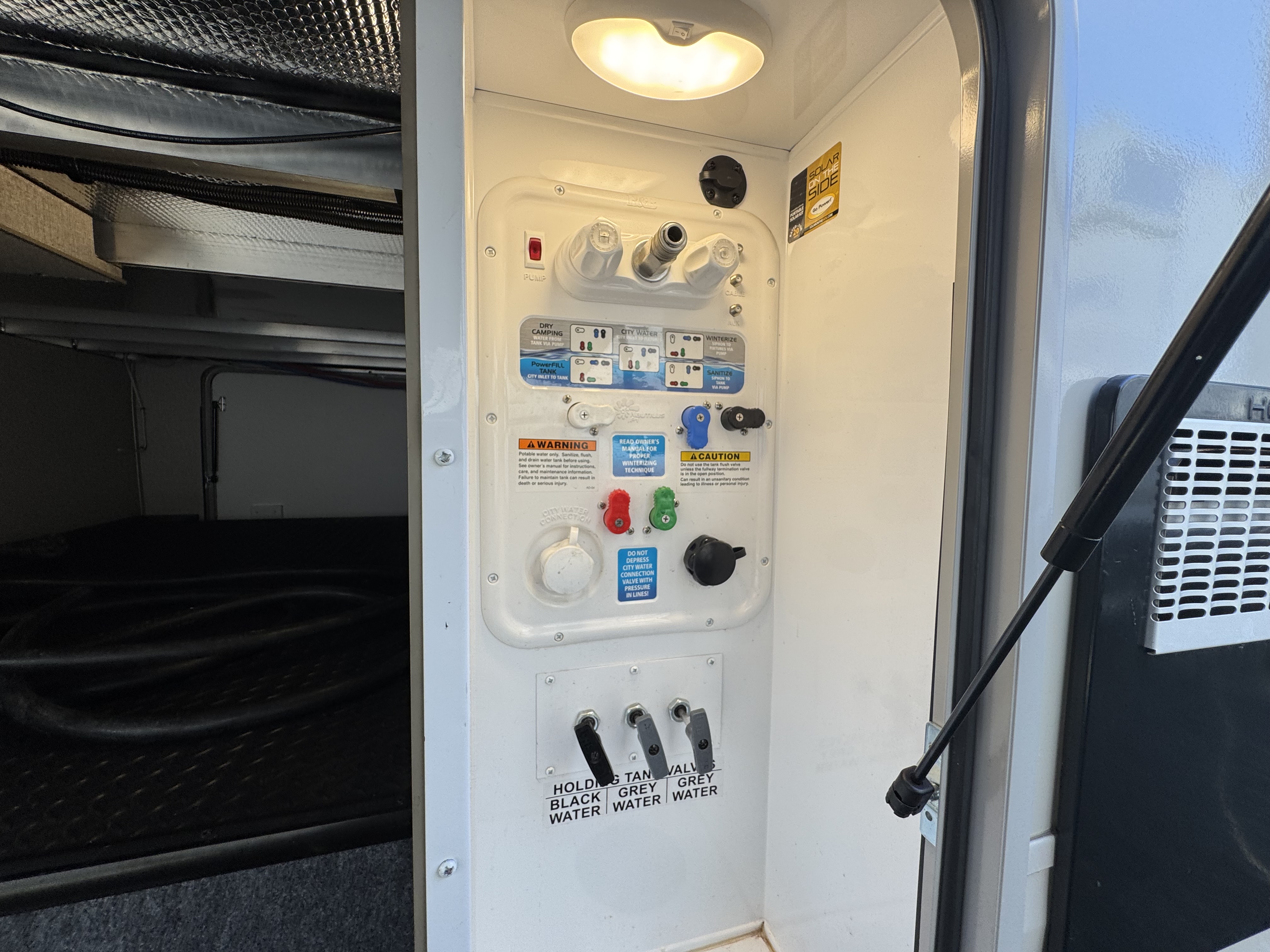 - Fully enclosed, LED lit universal docking center with quick connect outside shower, city water connection, and black tank flush