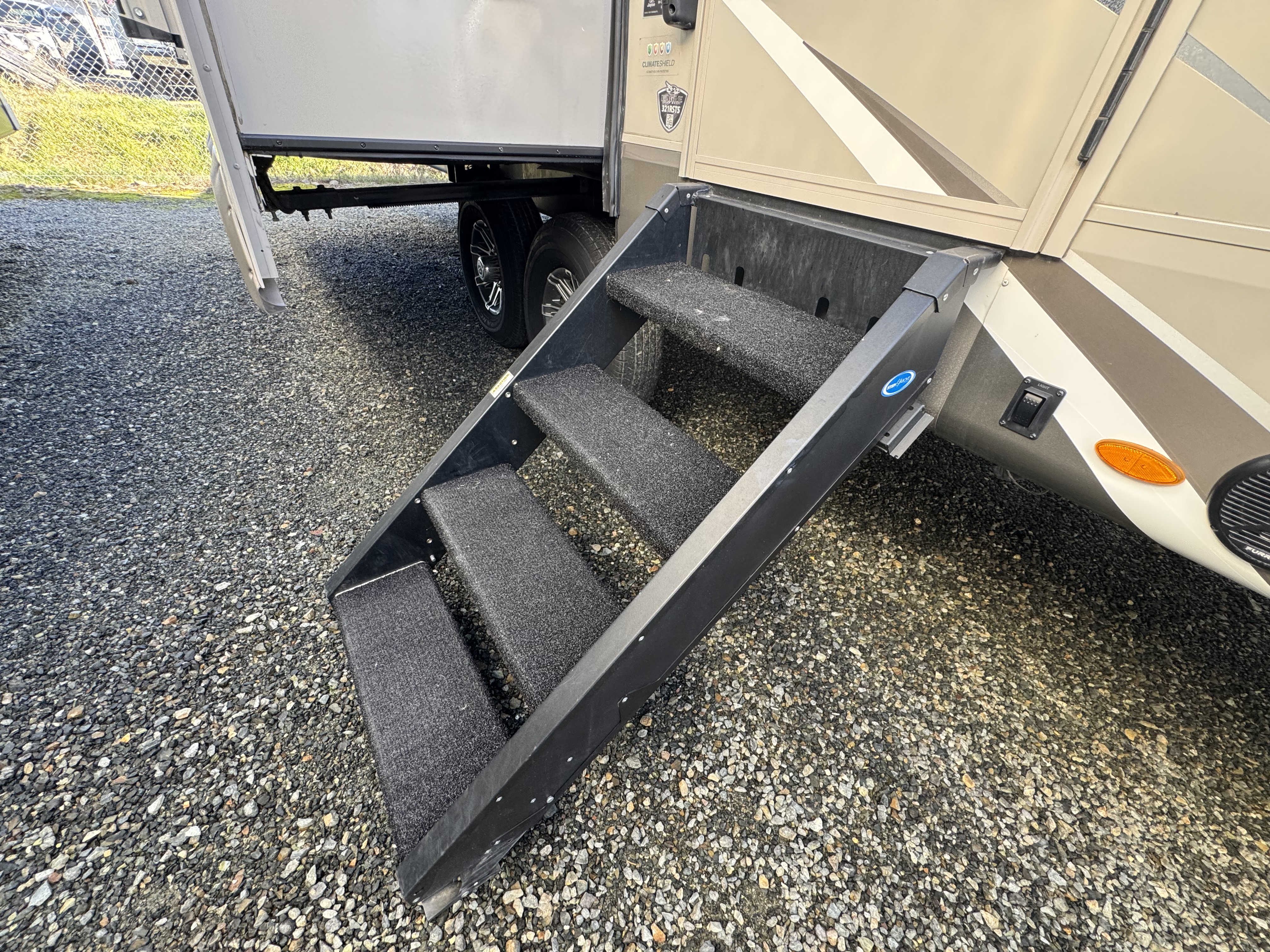 - Sturdy, anti-slip aluminum entrance steps (Made in U.S.A.) with blue LED light