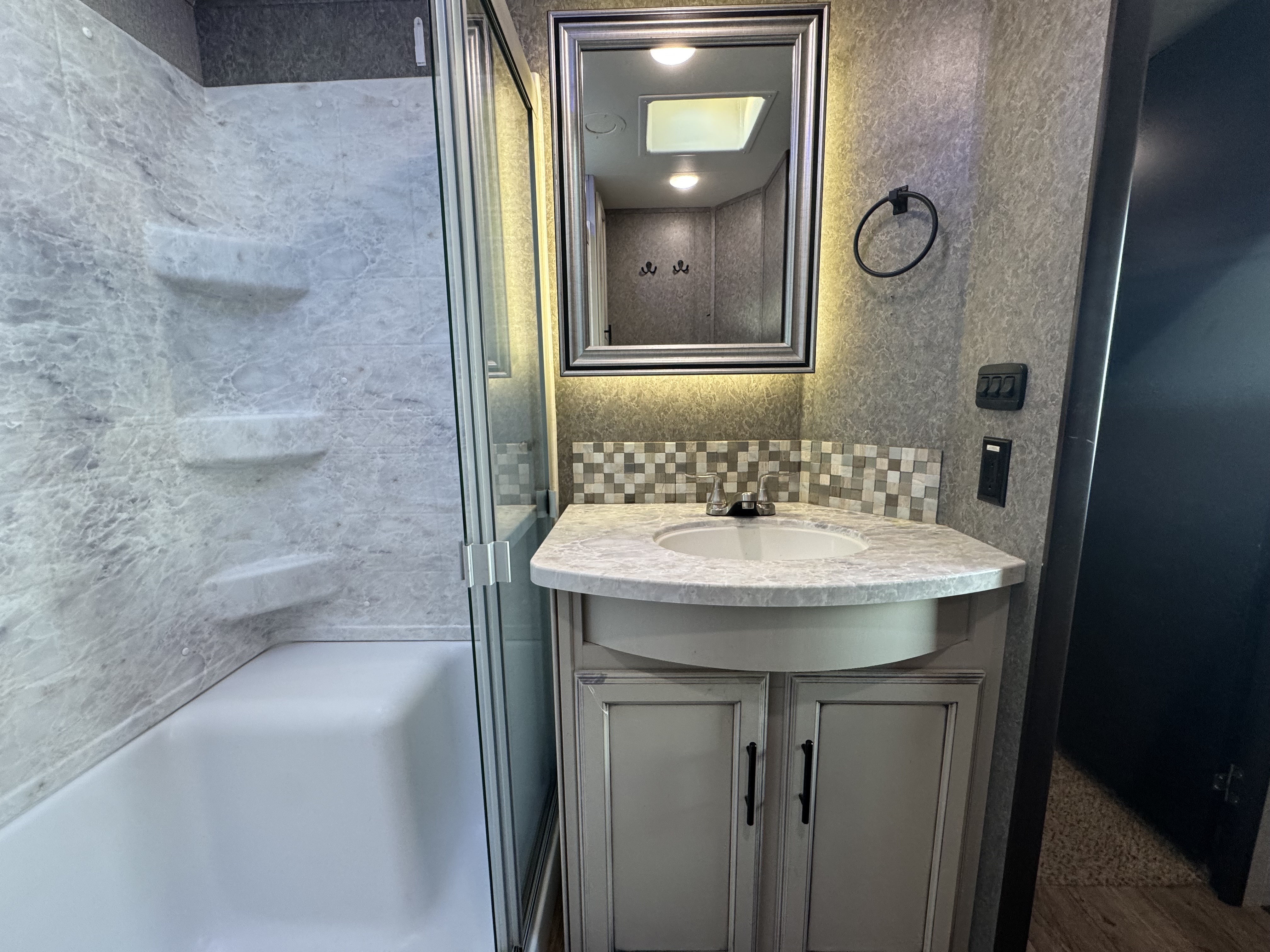 - Bathroom stone and glass tile backsplash