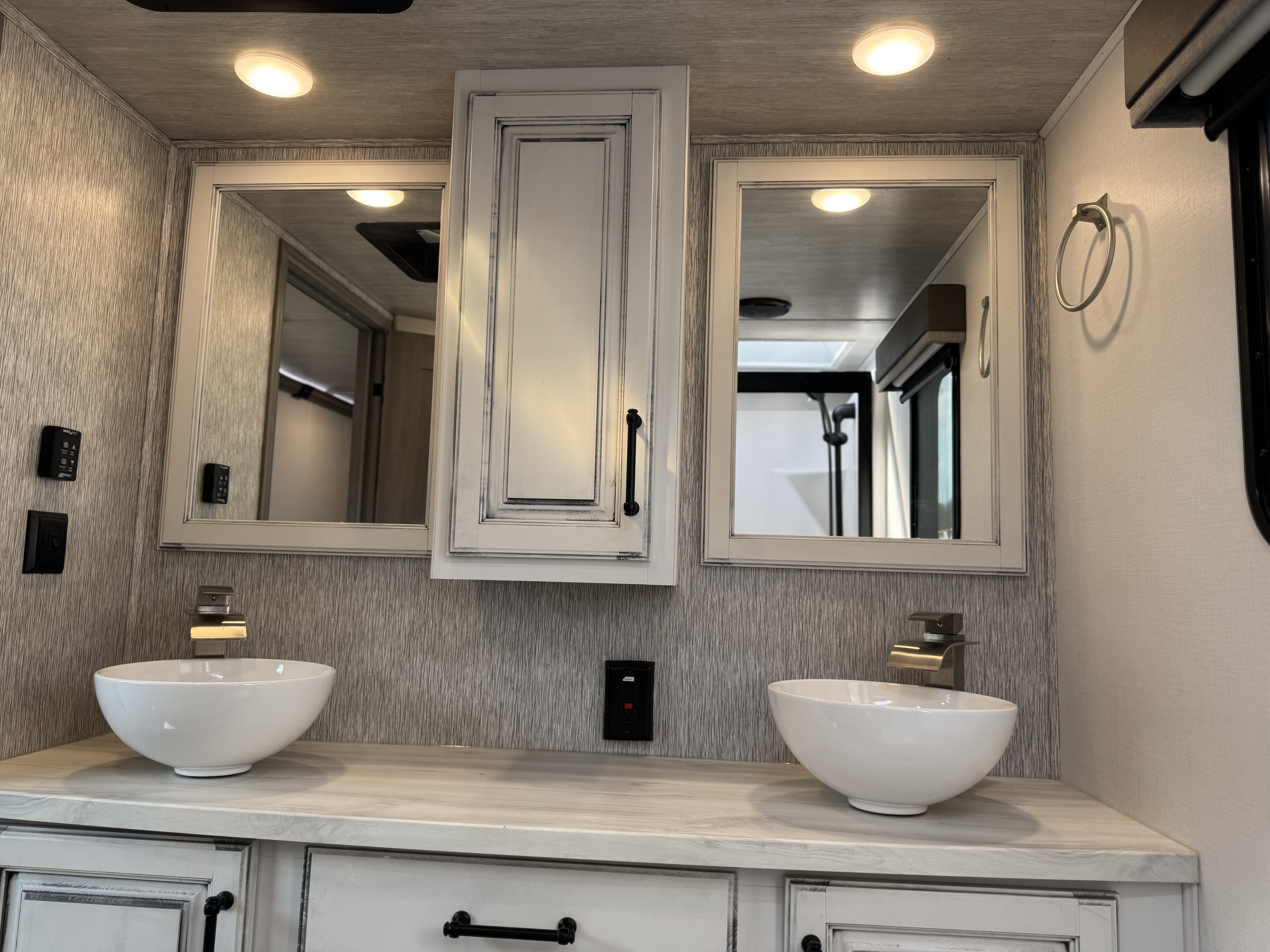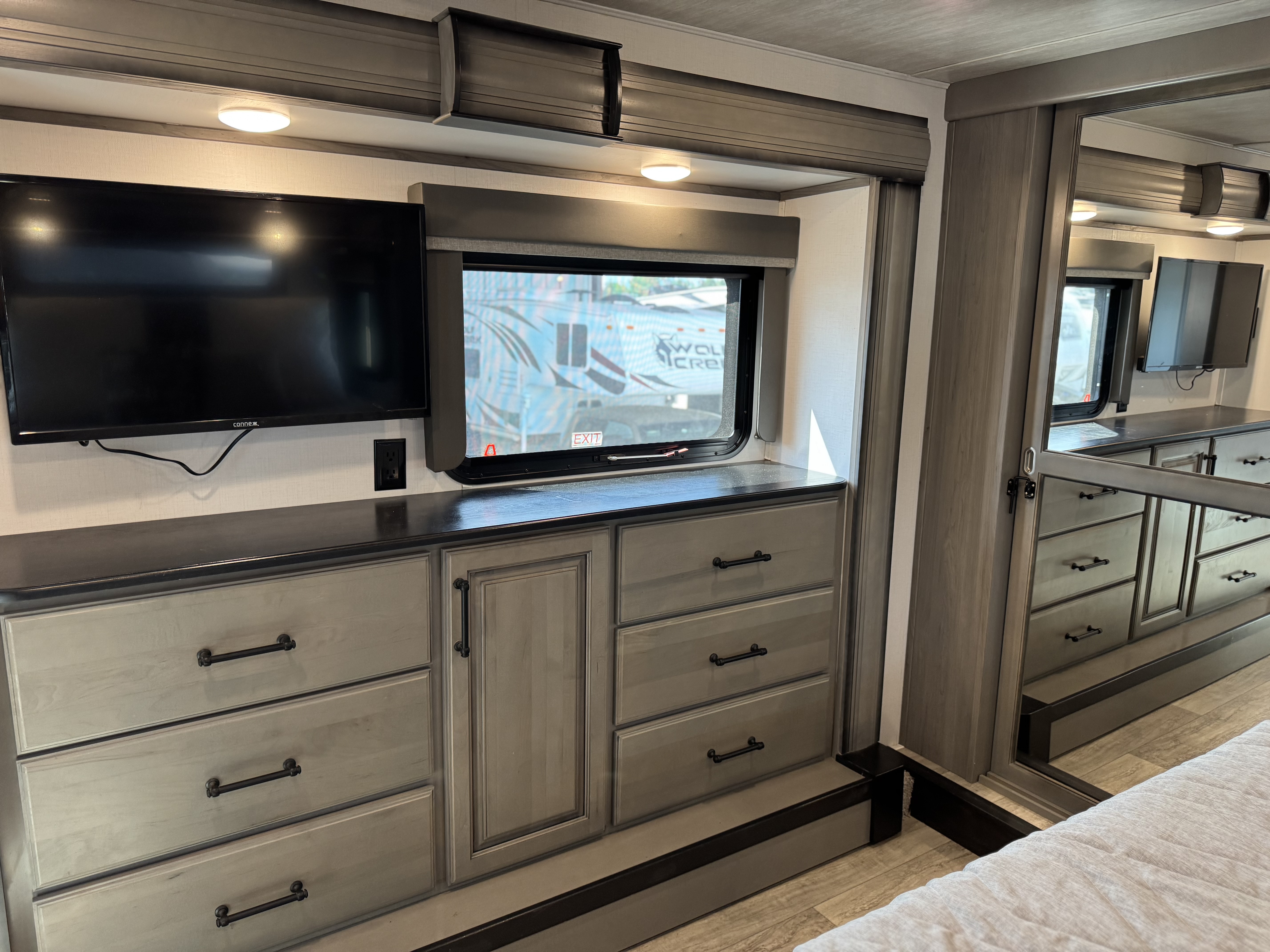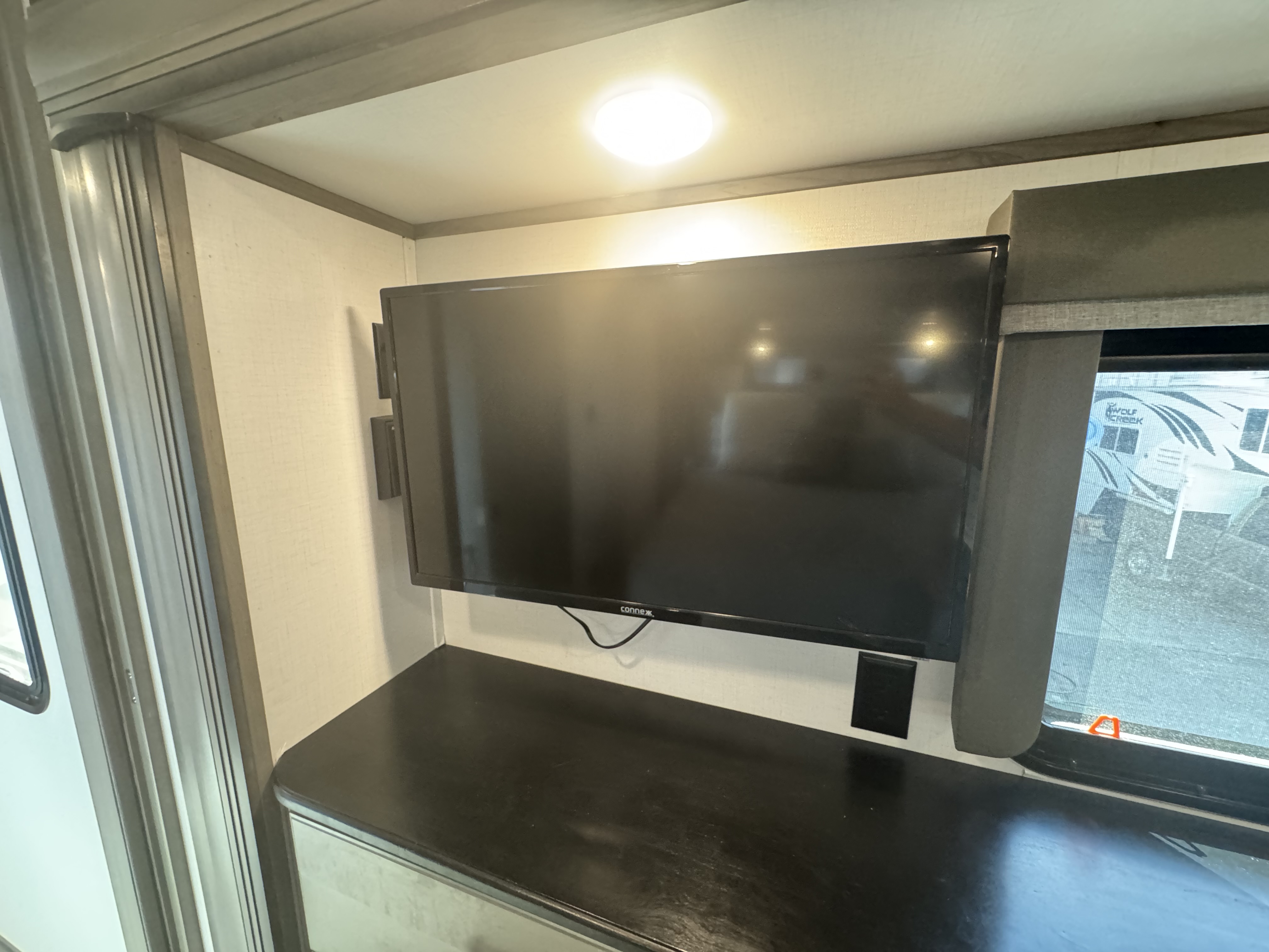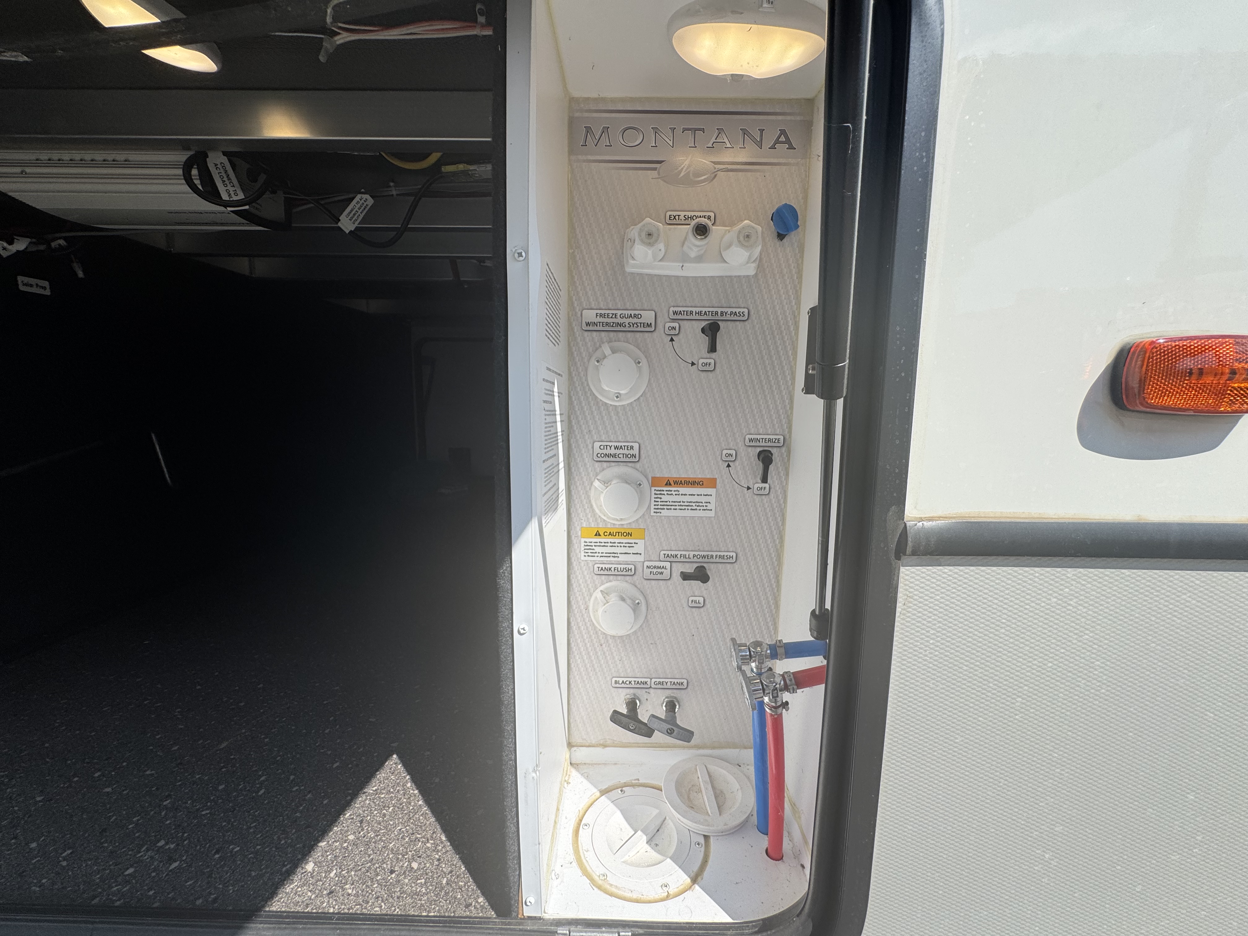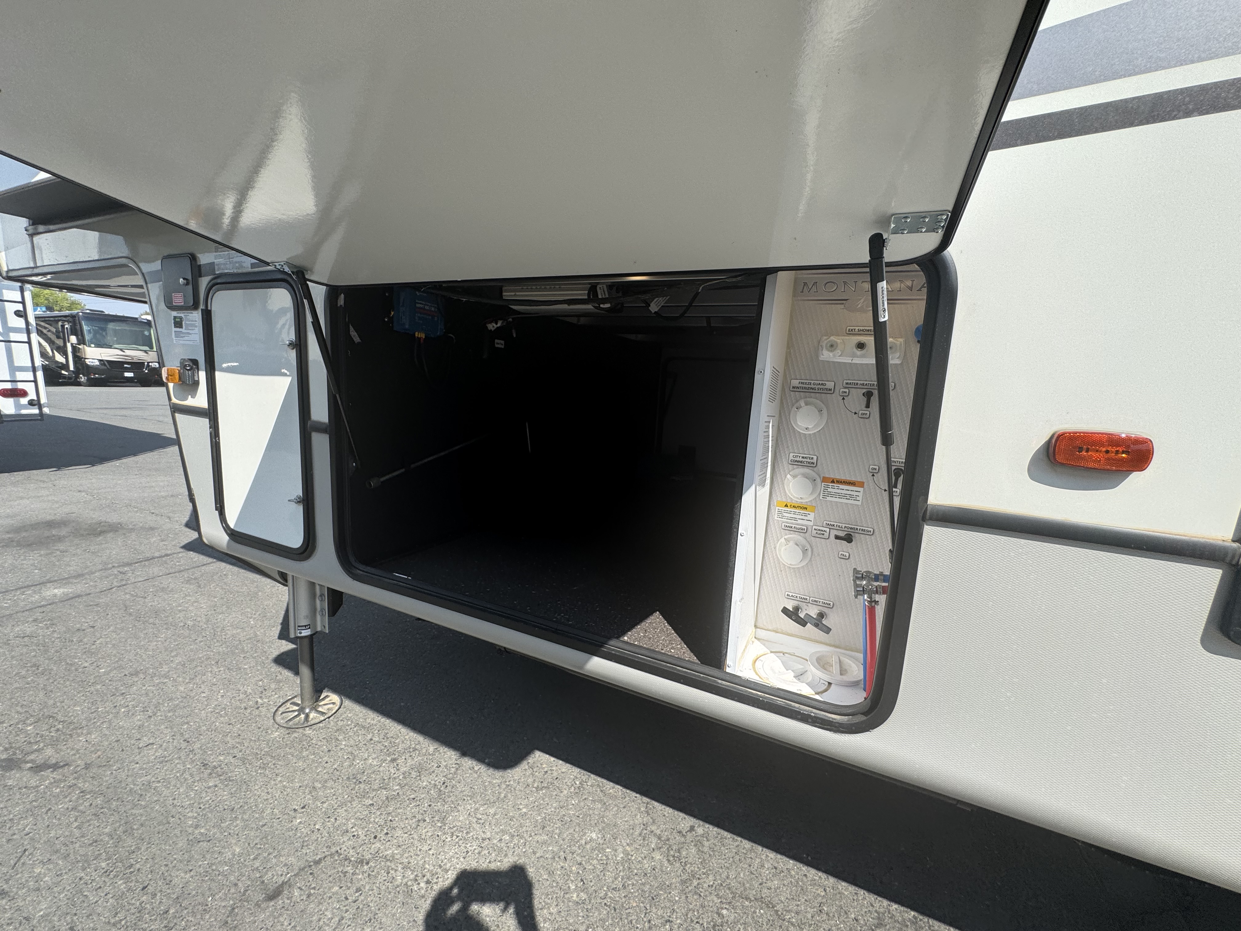 - Water connections, black tank flush, outside shower w/ quick connect hose, winterization kit, water heater bypass, power tank fill, waste & water handle valves, 110V outlet, shutoff valve, 12V compartment light, enclosed low point drains, unit battery disconnect, intuitive KeyTV™ satellite/cable/ antenae source control