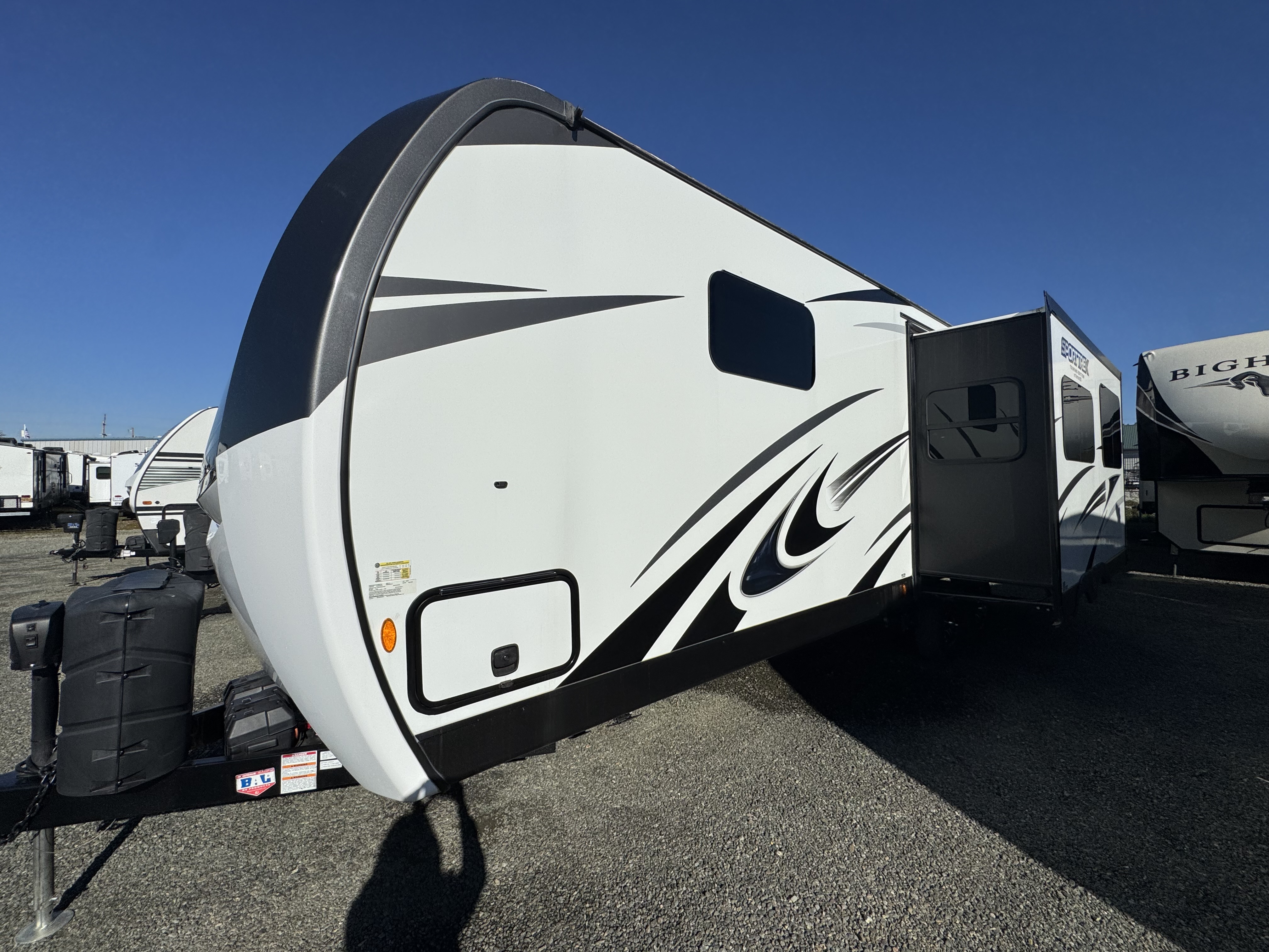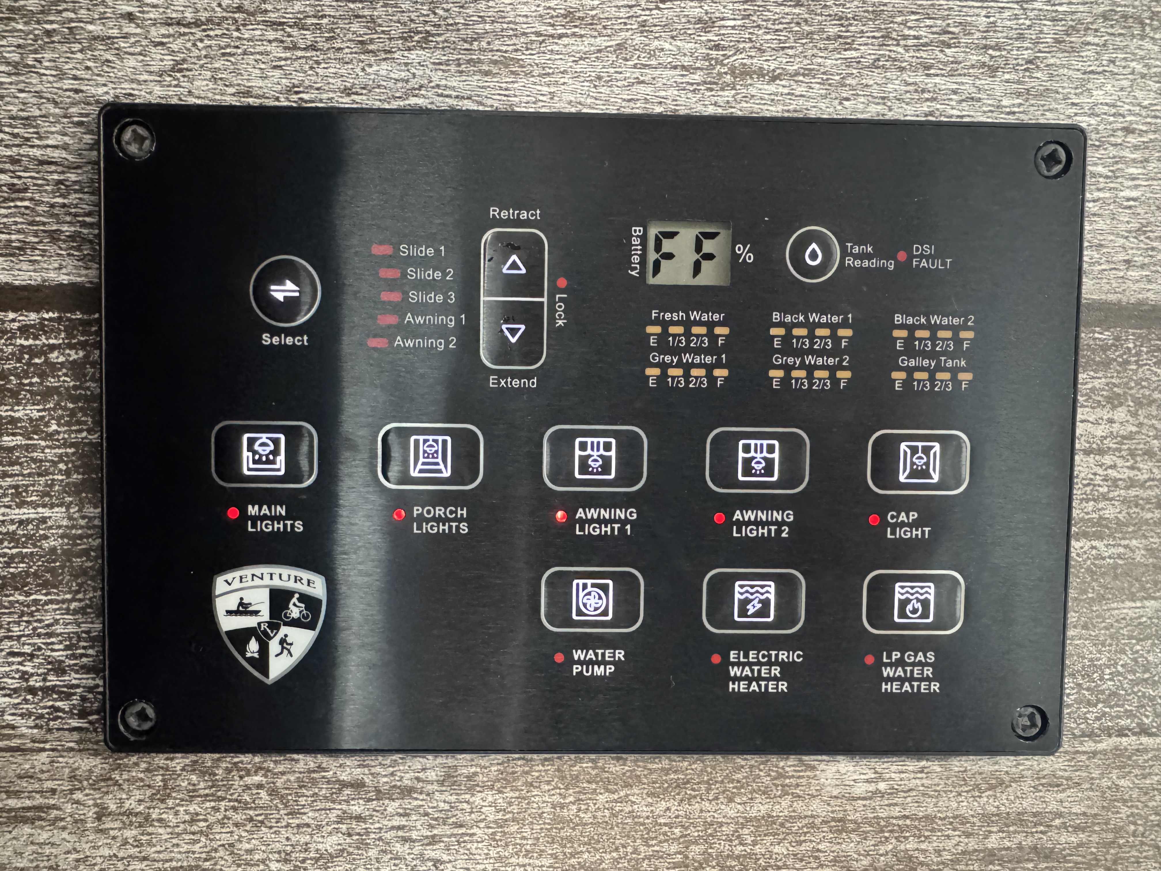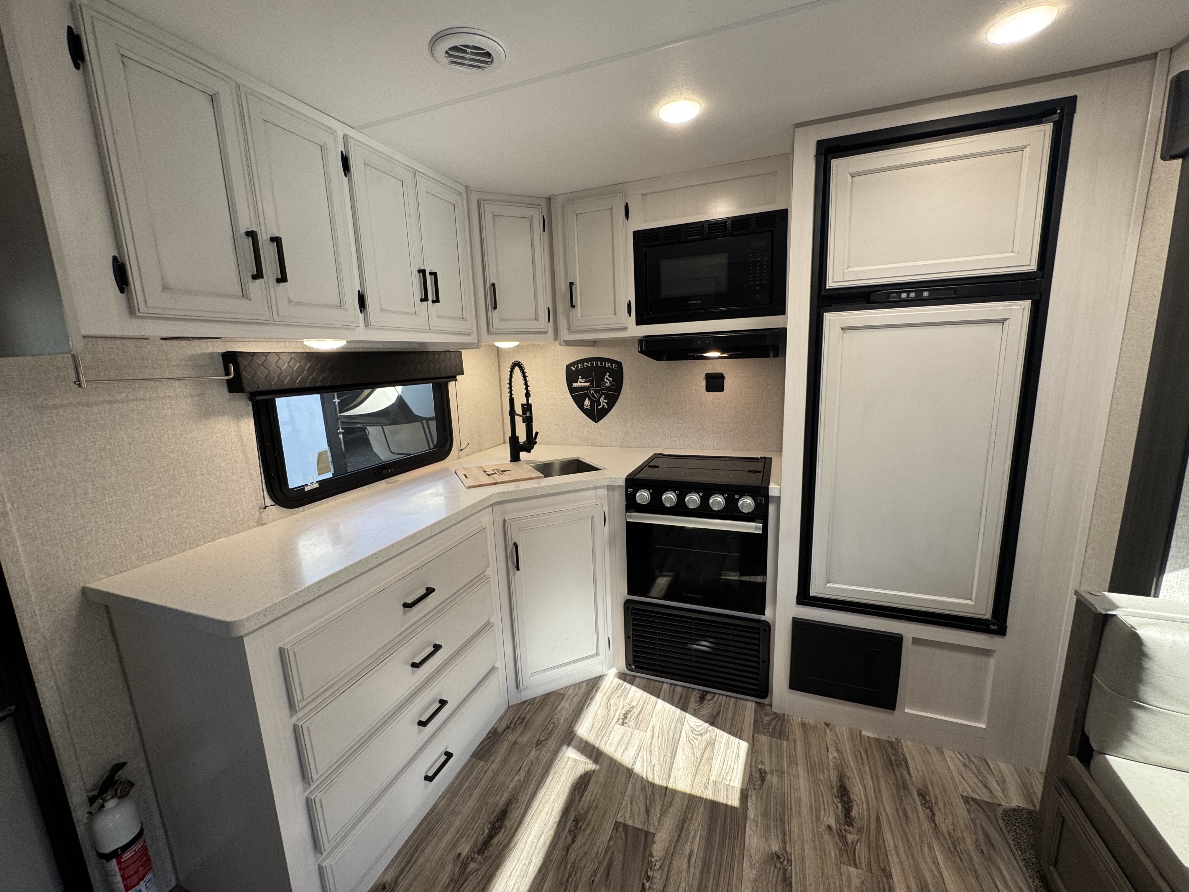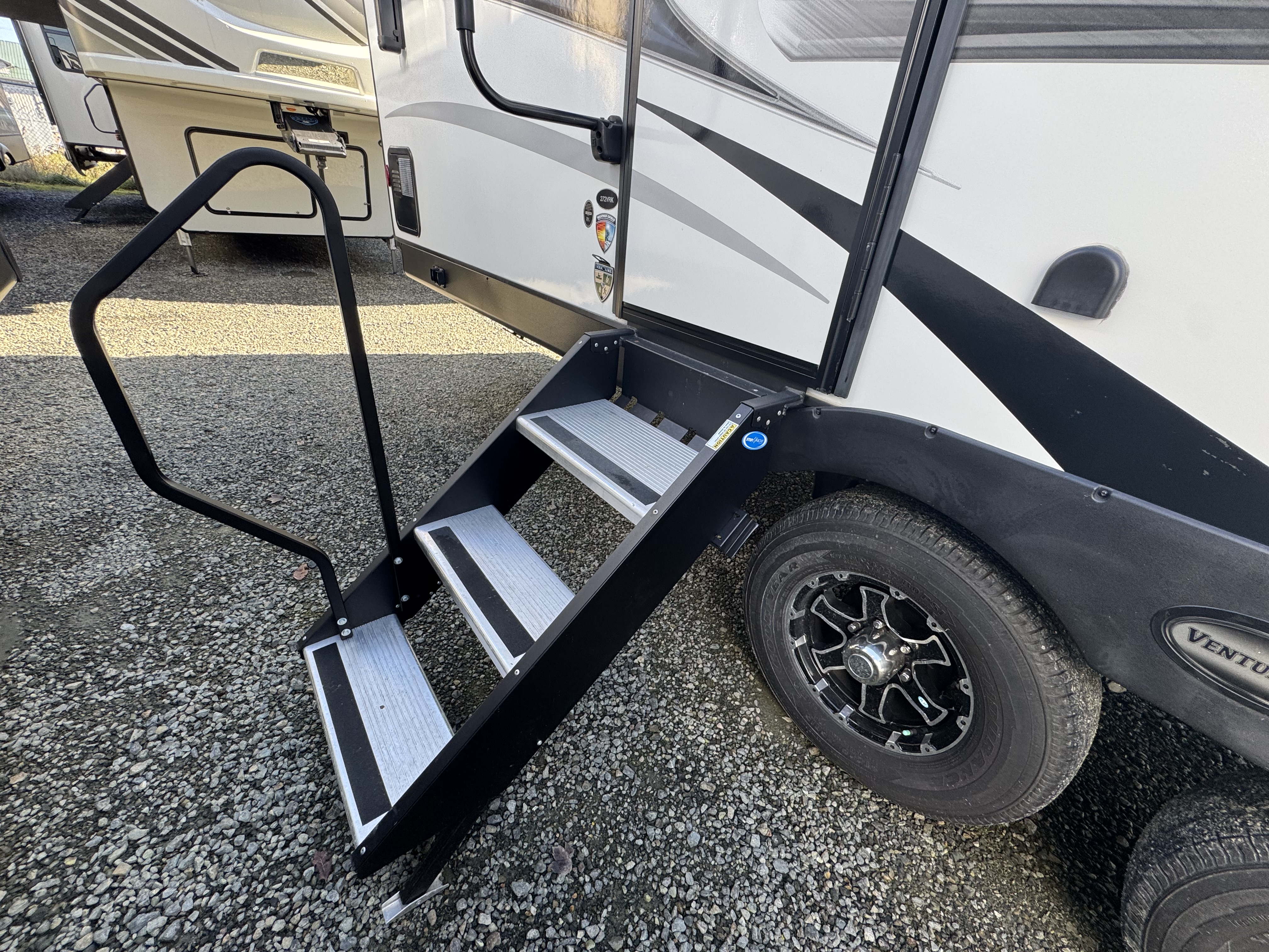 Painted fiberglass front cap w/integrated LED light, upgraded graphics package, BAL independent electric stabilizer jacks, lighted power tongue jack, tinted frameless windows, slam-latch baggage doors w/magnetic catches, motion-activated pass-thru storage light, foldup trek step, Venture bottle opener/dog tie down, (2) 30 LB LP tanks w/cover, screen shot screen door.