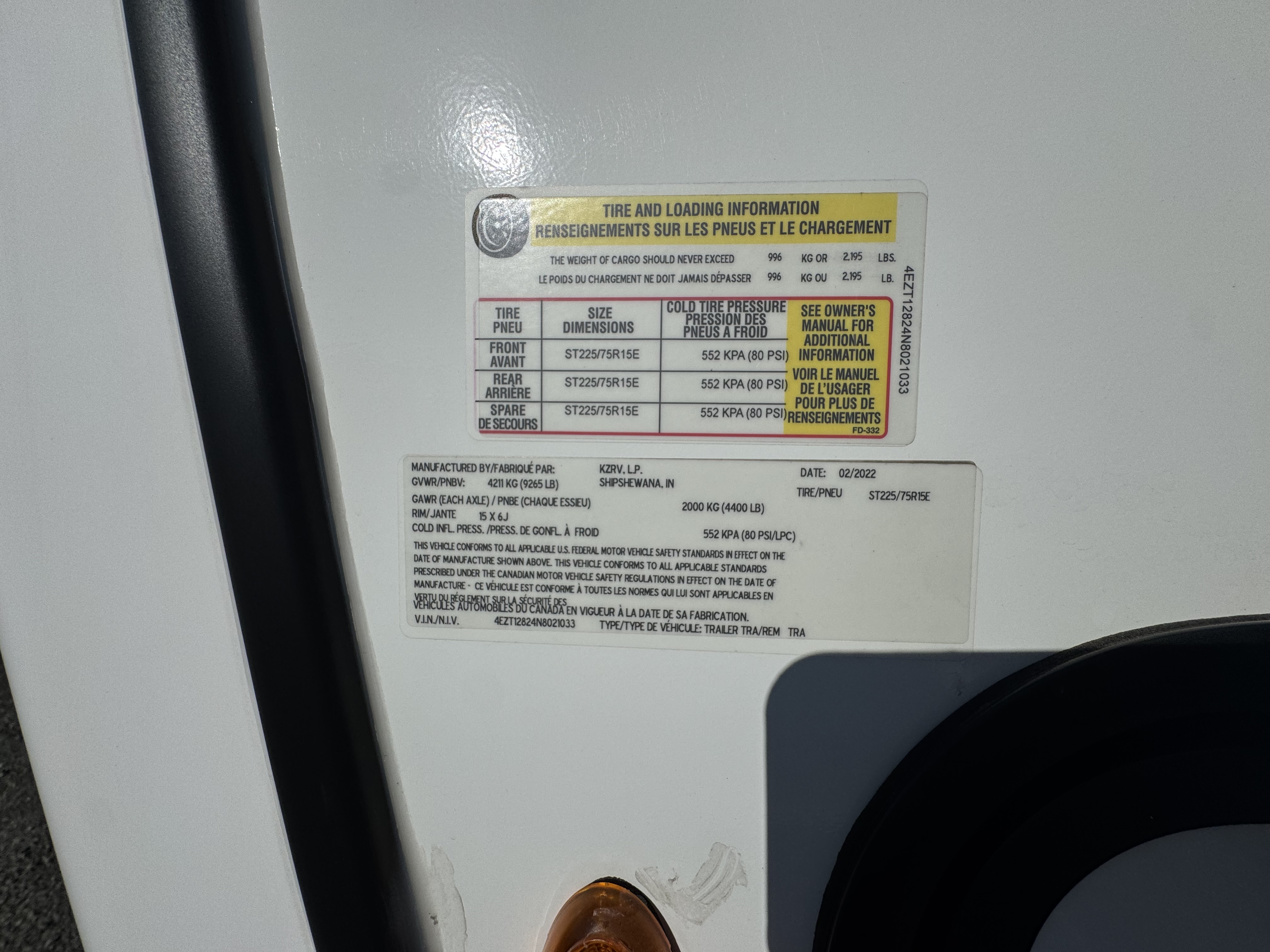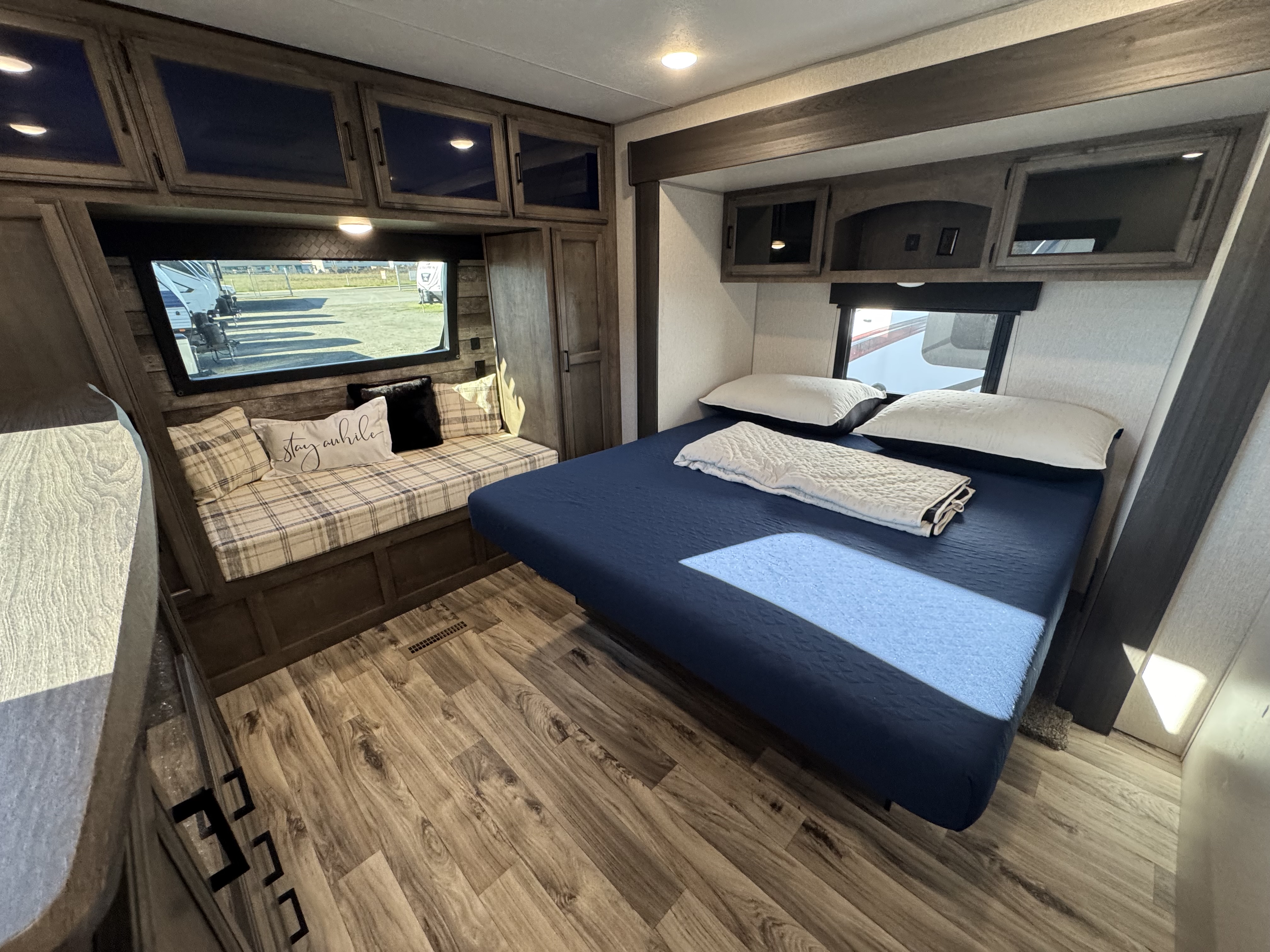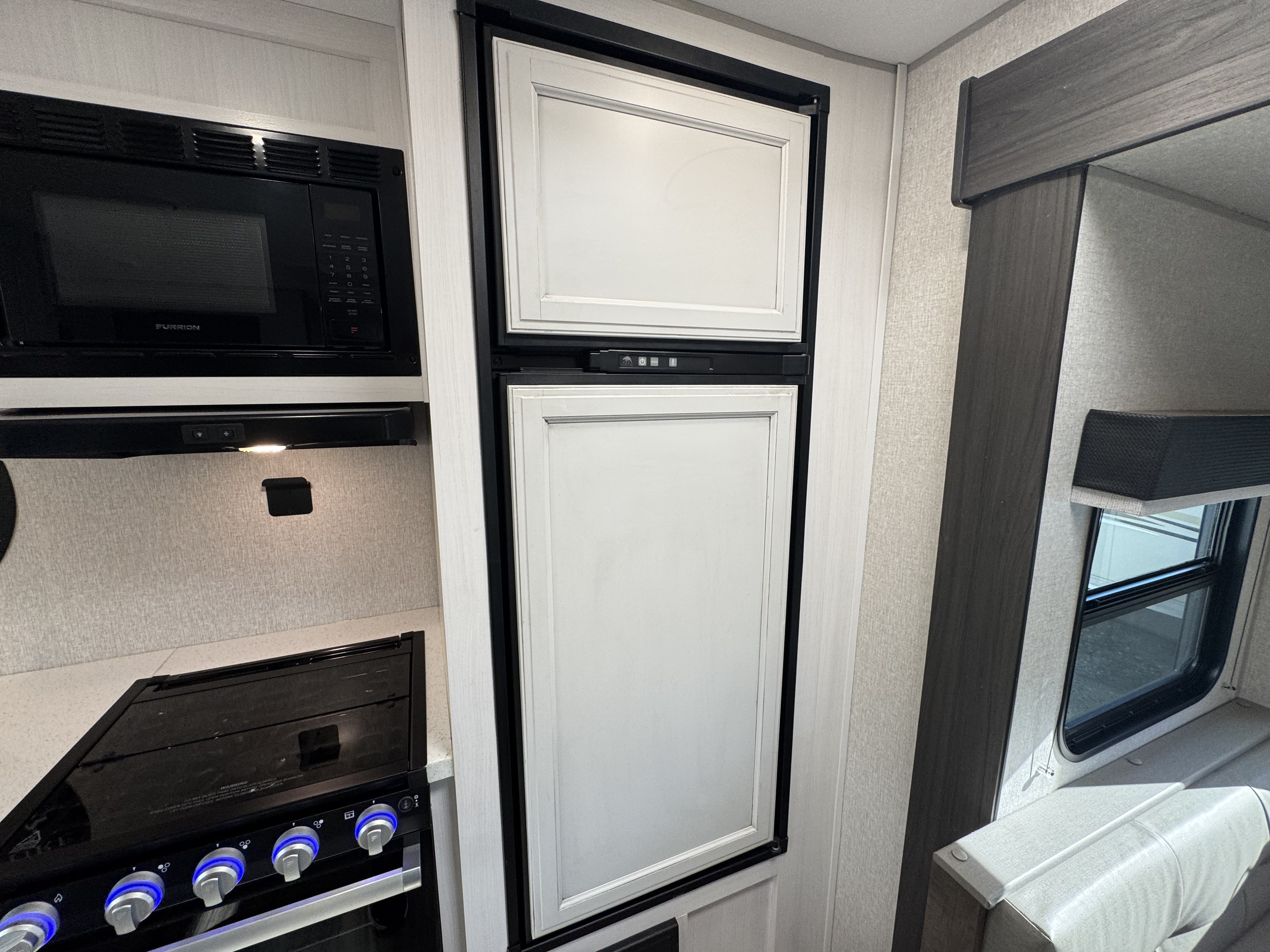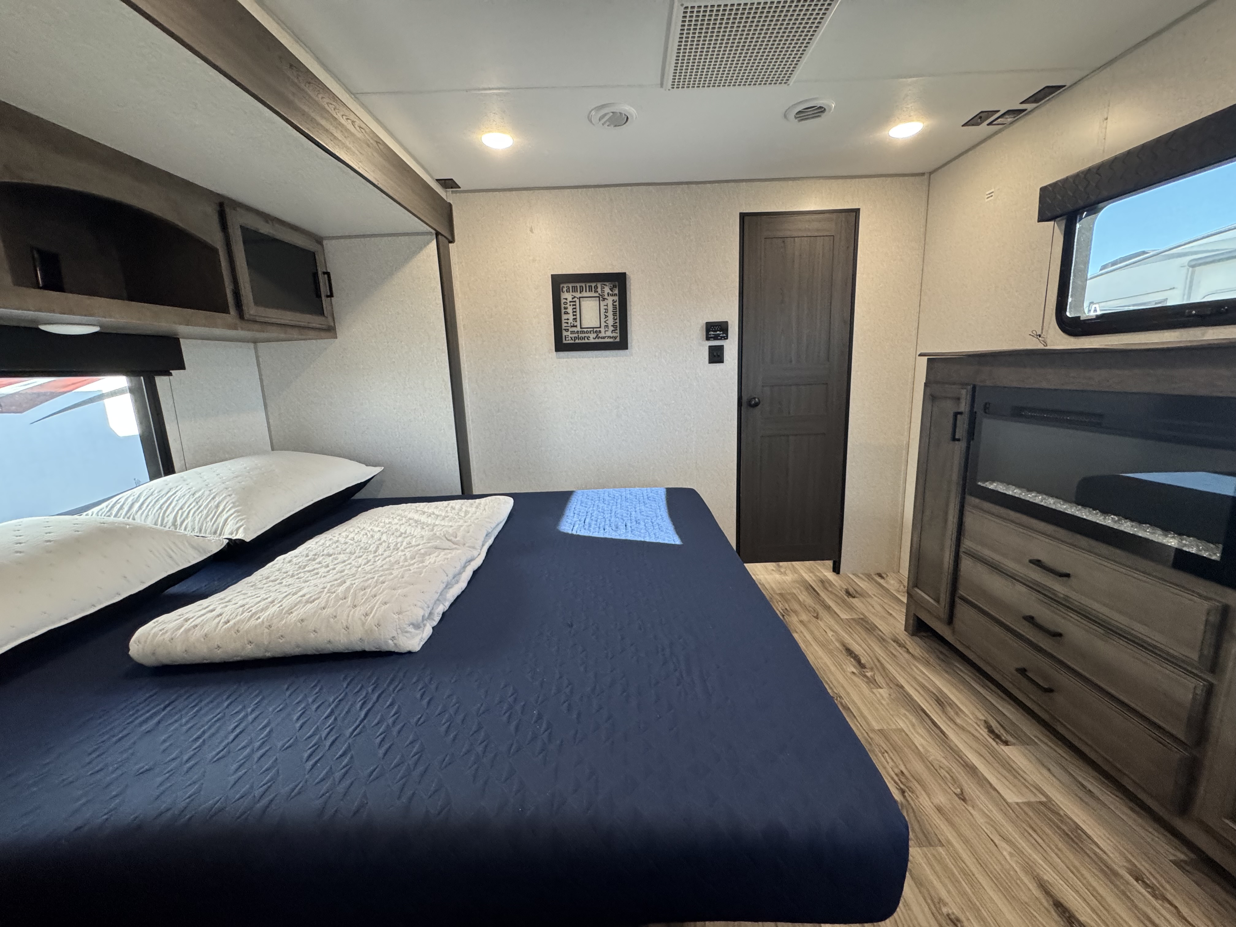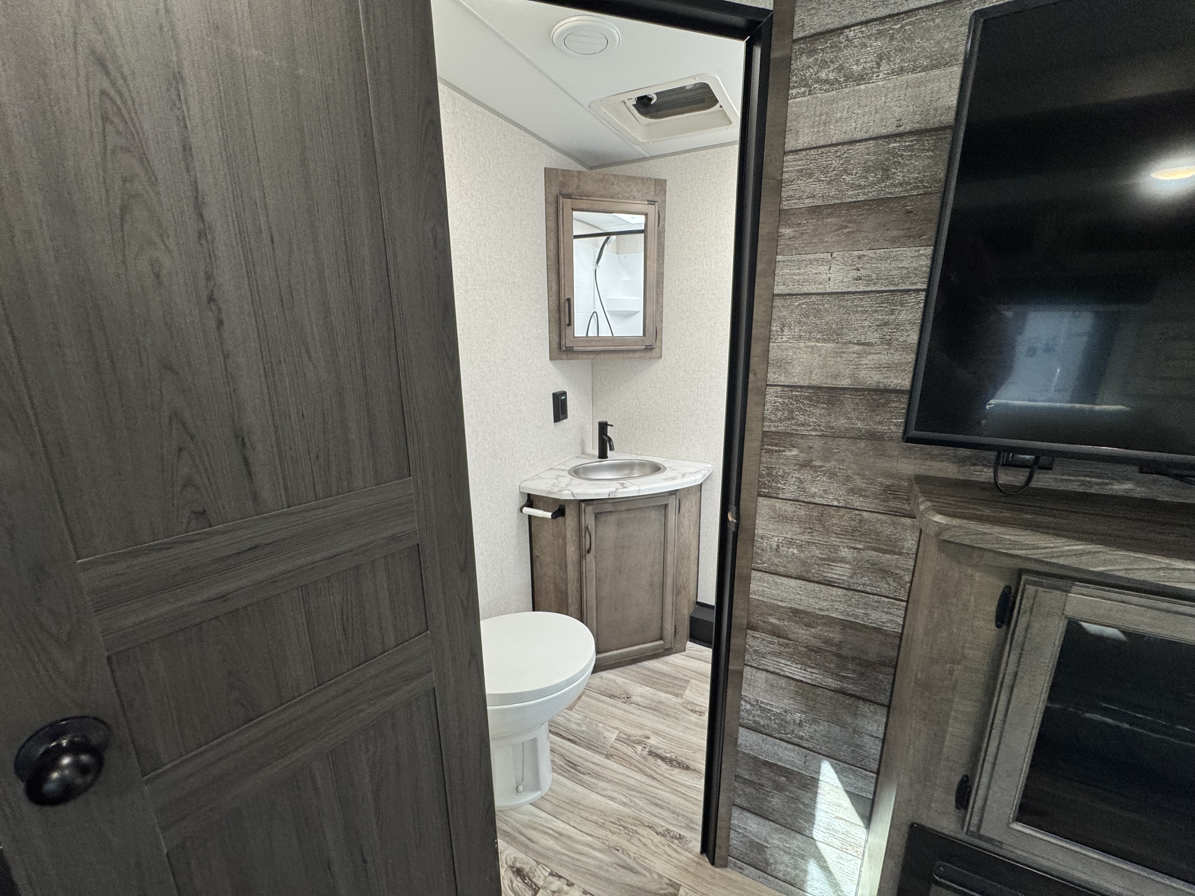 Painted fiberglass front cap w/integrated LED light, upgraded graphics package, BAL independent electric stabilizer jacks, lighted power tongue jack, tinted frameless windows, slam-latch baggage doors w/magnetic catches, motion-activated pass-thru storage light, foldup trek step, Venture bottle opener/dog tie down, (2) 30 LB LP tanks w/cover, screen shot screen door.