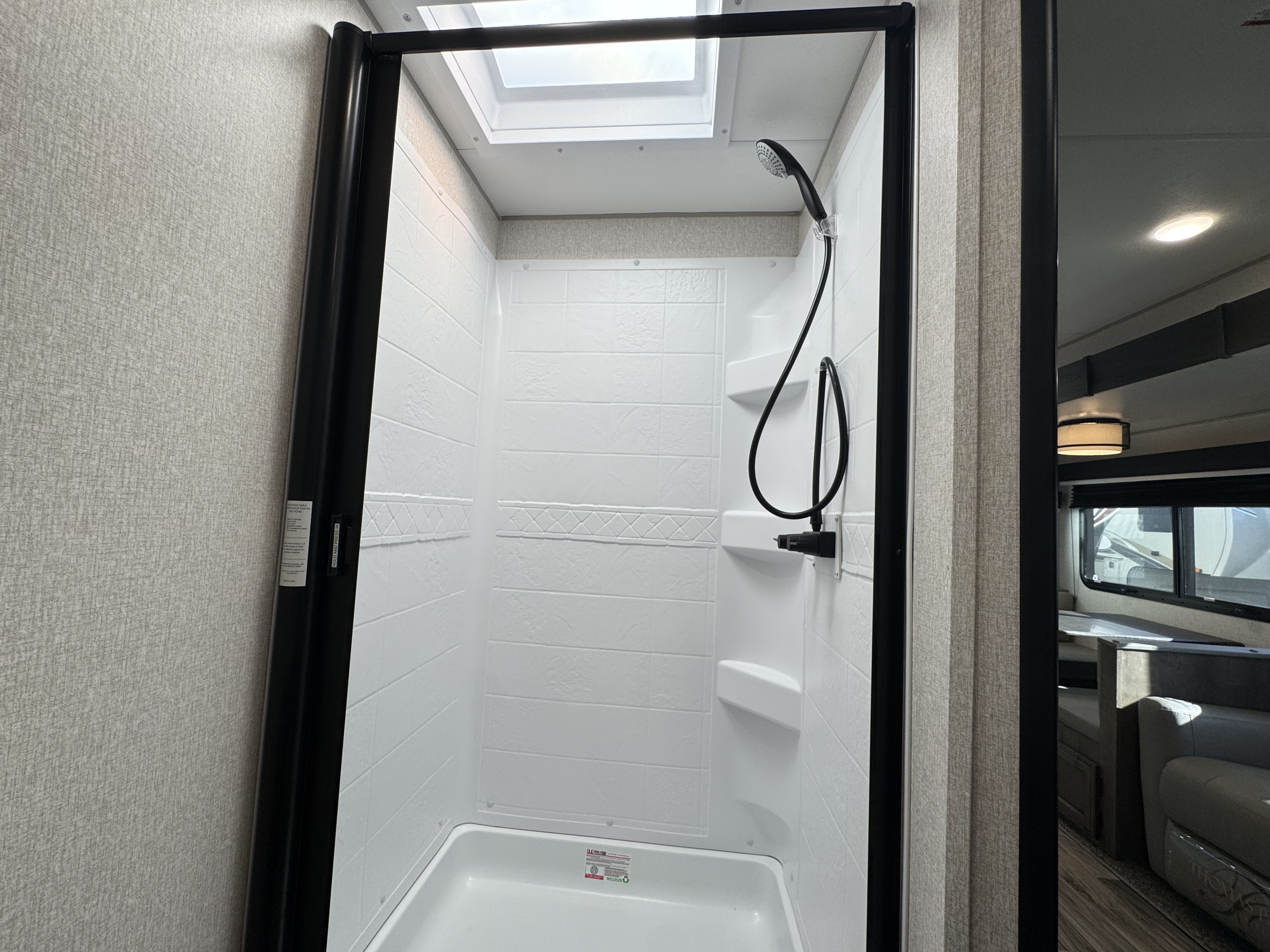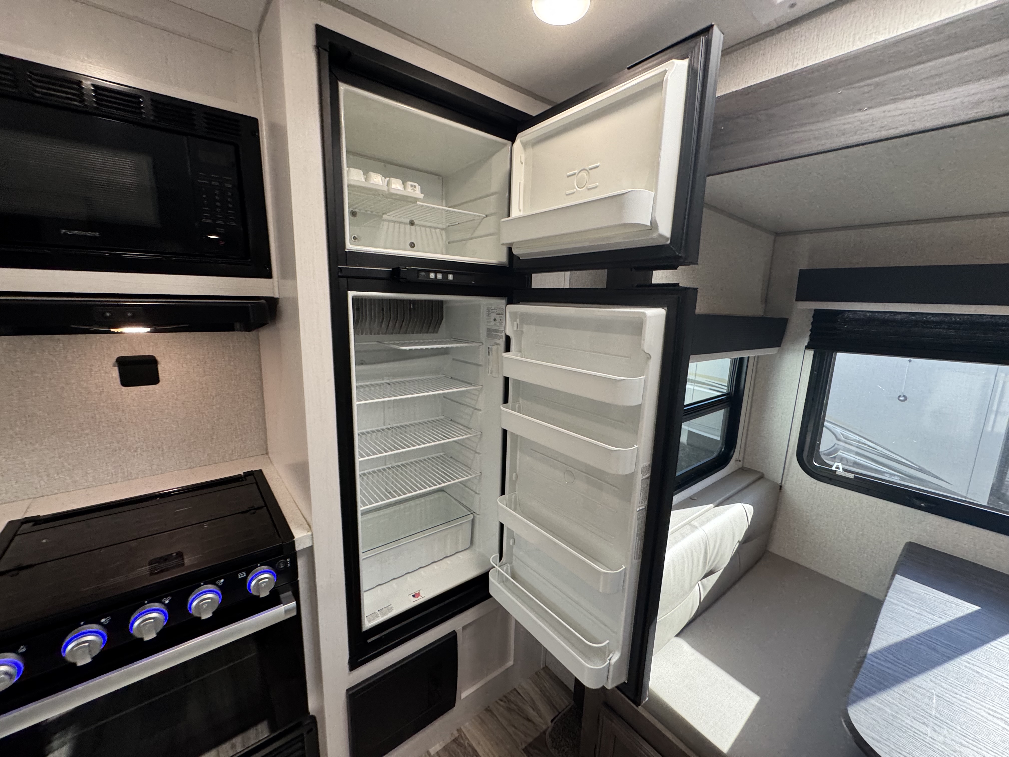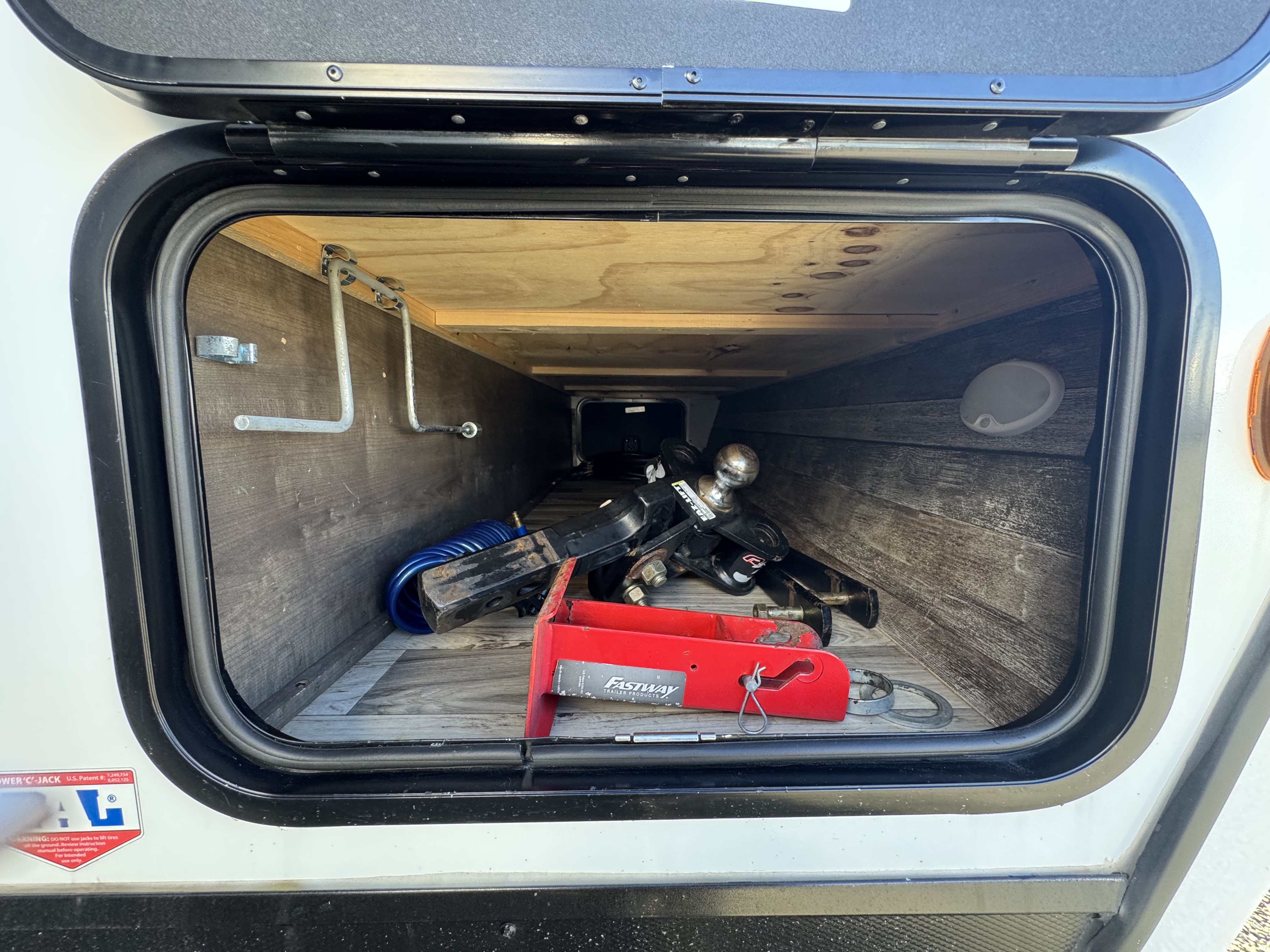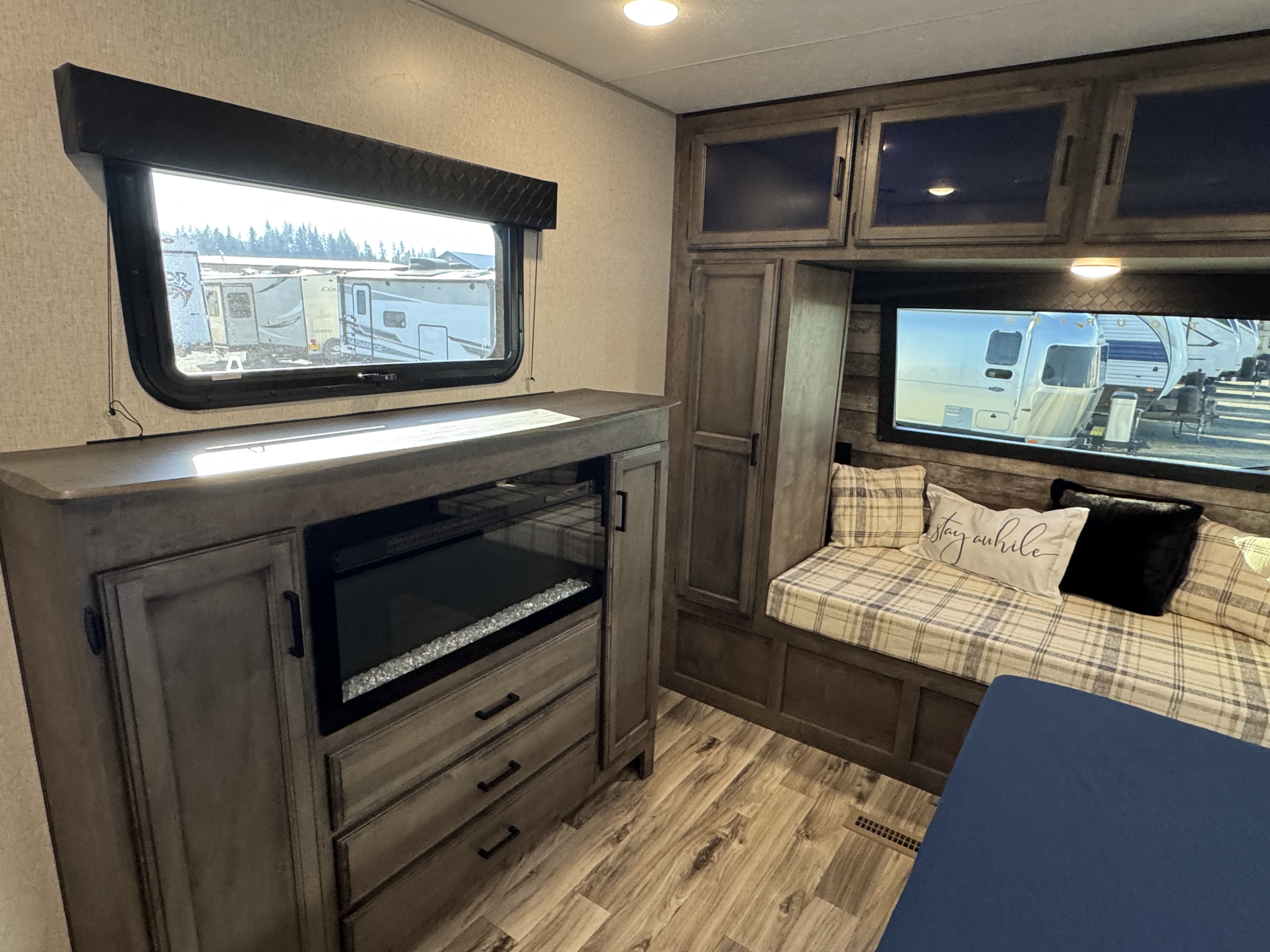 Painted fiberglass front cap w/integrated LED light, upgraded graphics package, BAL independent electric stabilizer jacks, lighted power tongue jack, tinted frameless windows, slam-latch baggage doors w/magnetic catches, motion-activated pass-thru storage light, foldup trek step, Venture bottle opener/dog tie down, (2) 30 LB LP tanks w/cover, screen shot screen door.