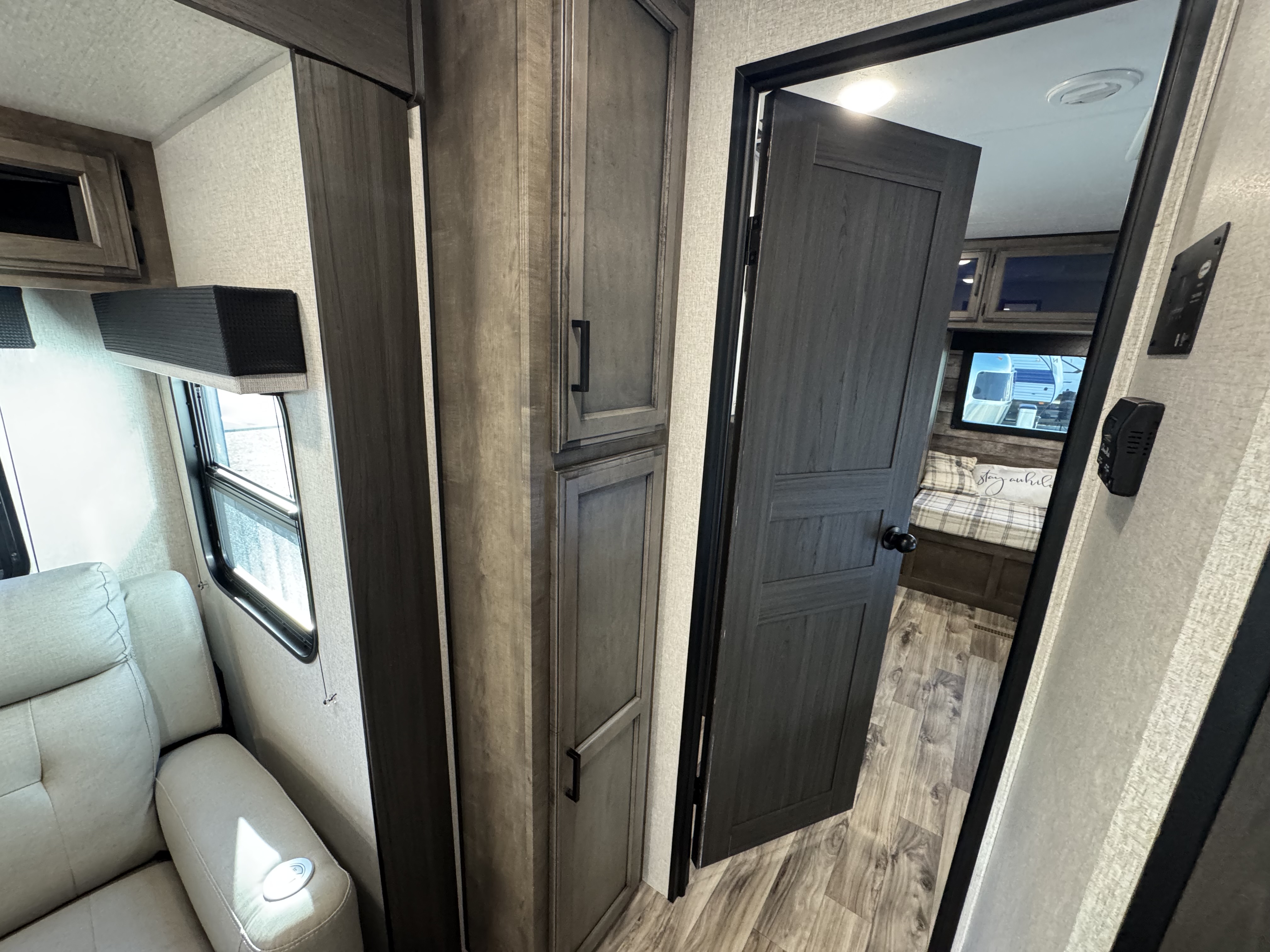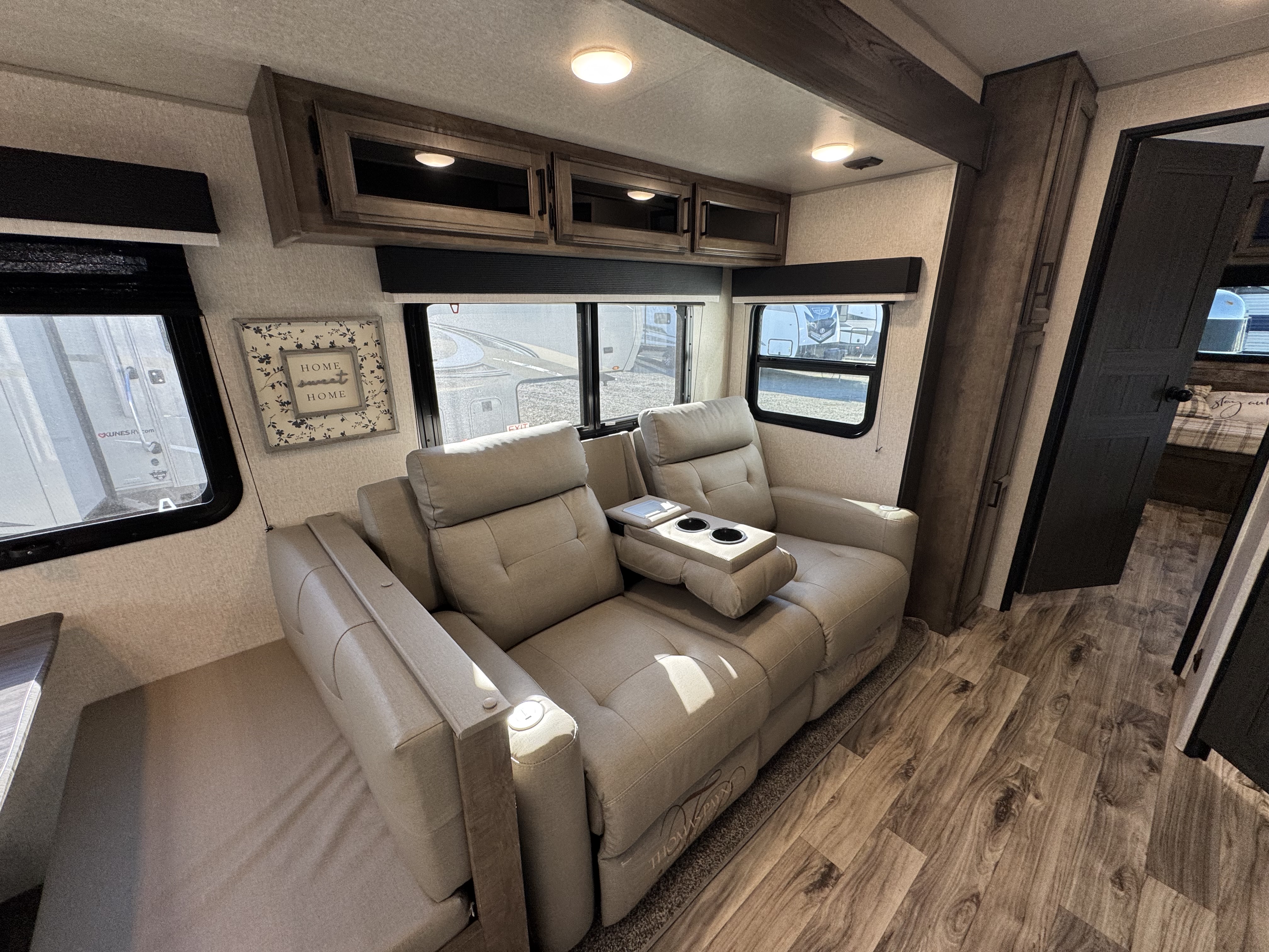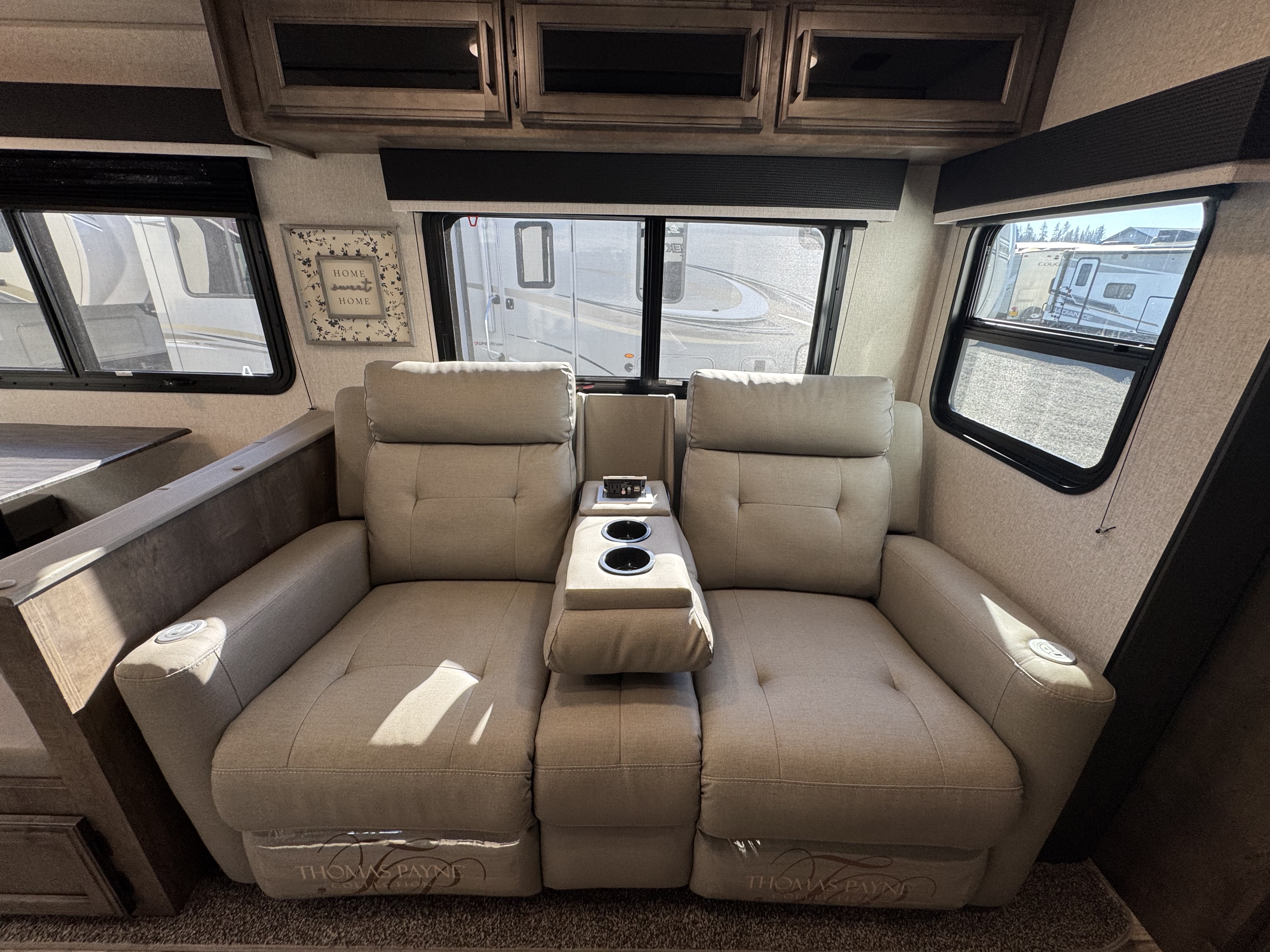 Solid-surface kitchen countertops, designer valances w/fabric nightshades, solid hardwood cabinet doors & drawer faces, residential carpet, motion-activated interior entry light, Beauflor wood plank flooring w/7-year limited warranty, porcelain foot-flush toilet, deluxe tri-fold sofa & theater seats (varies by model), king bed master suite (queen 343VBH, 343VIB), washer/dryer prep (VBF), heat & message in theater seating (VBF), (2) 30" frameless fireplaces.