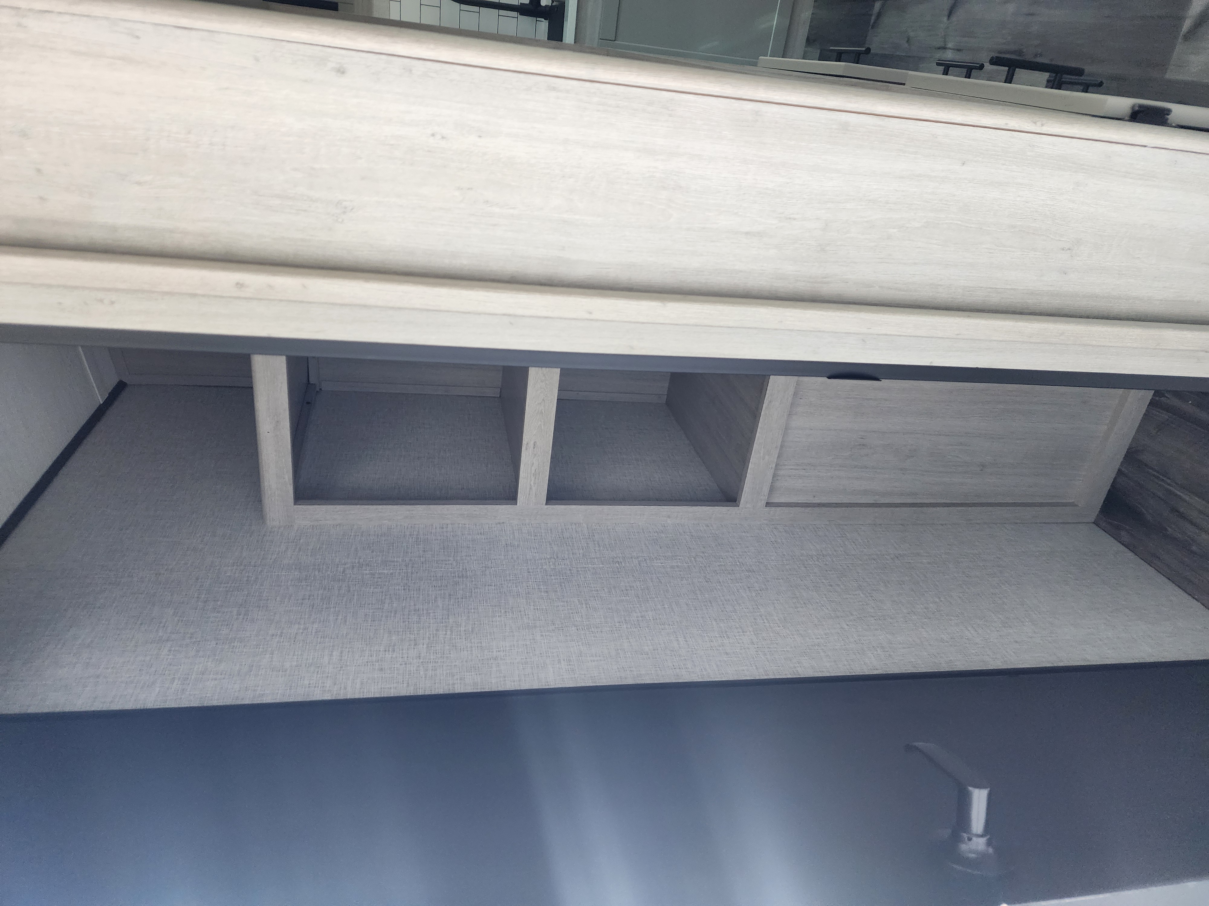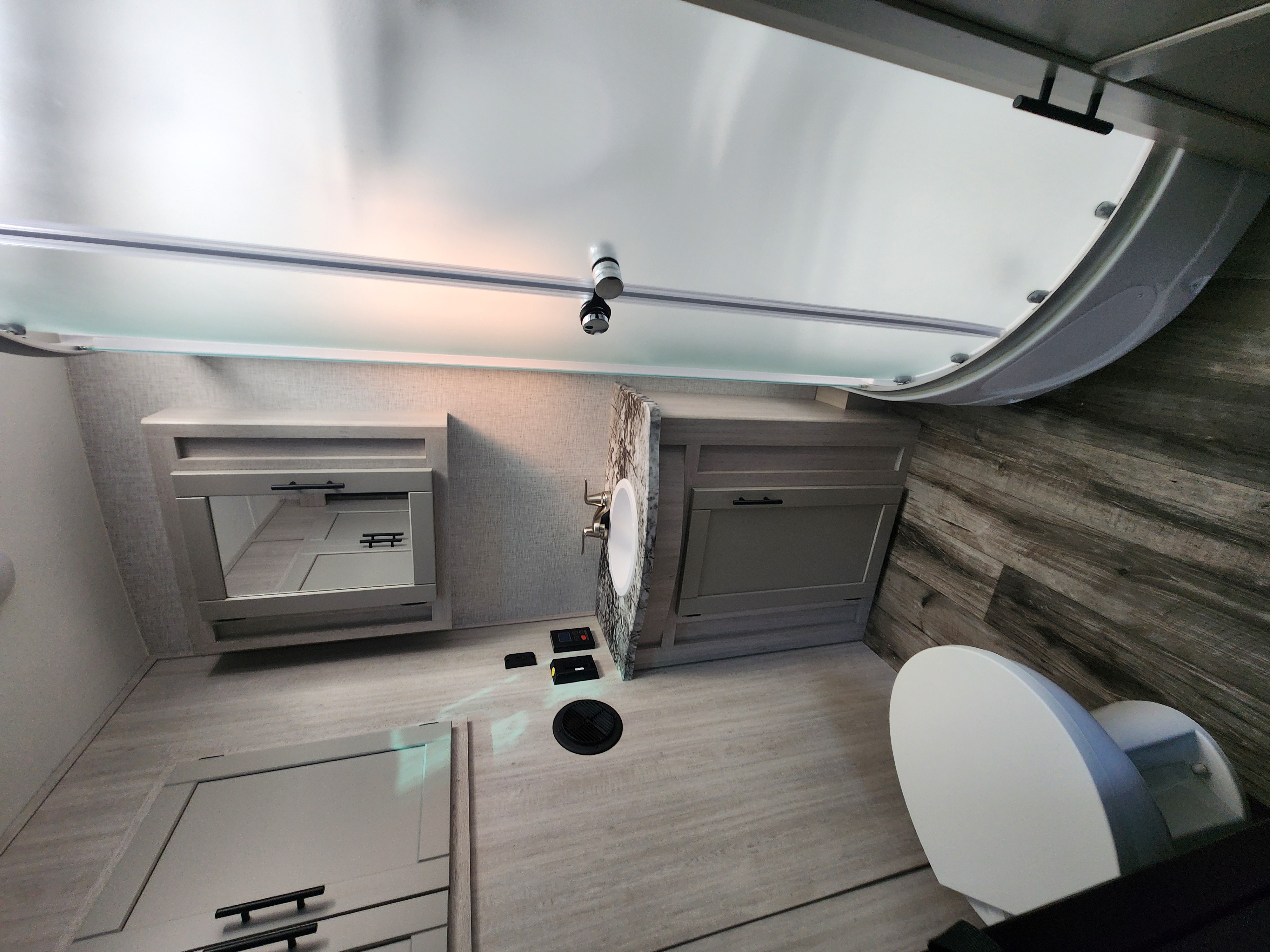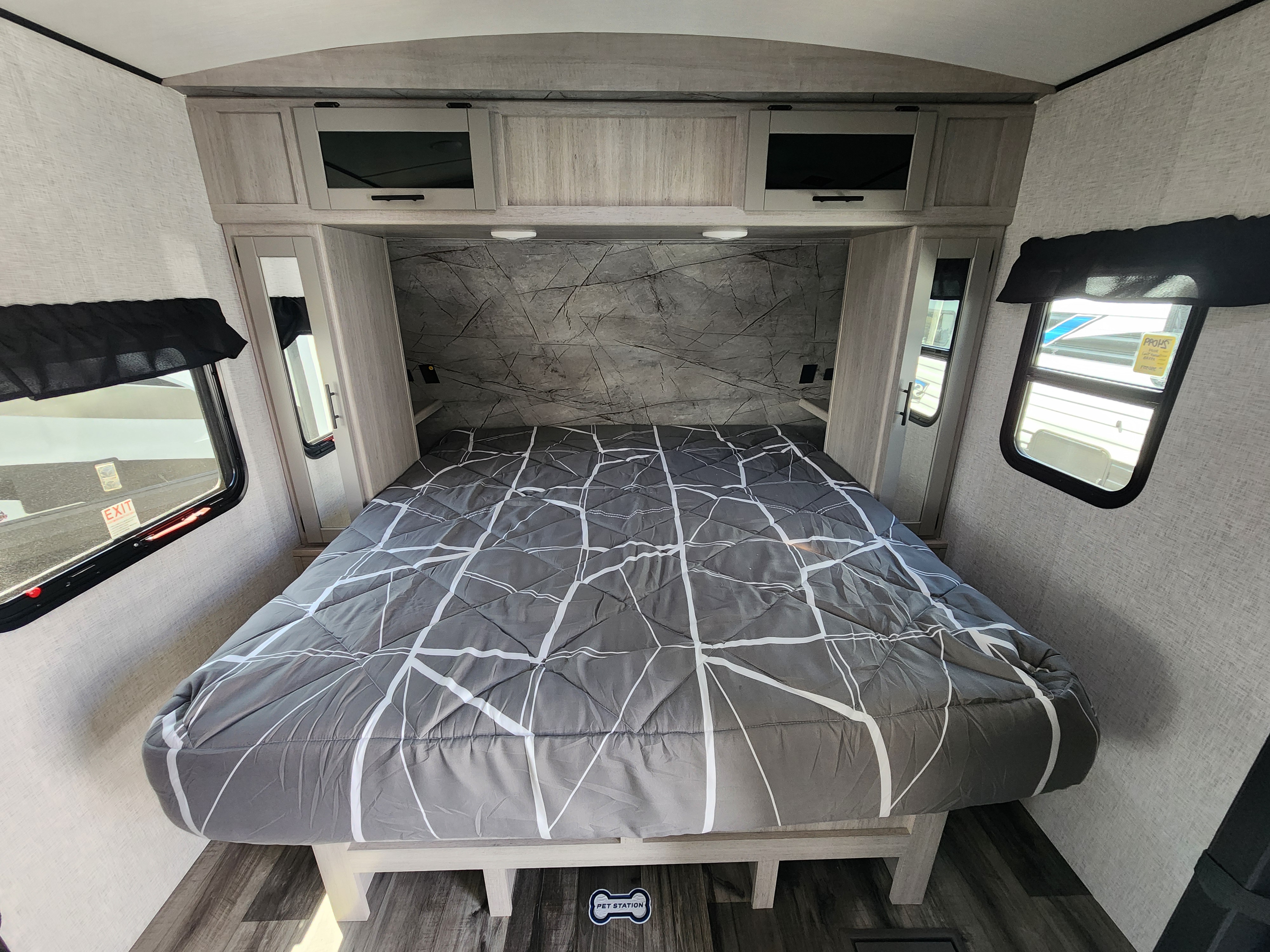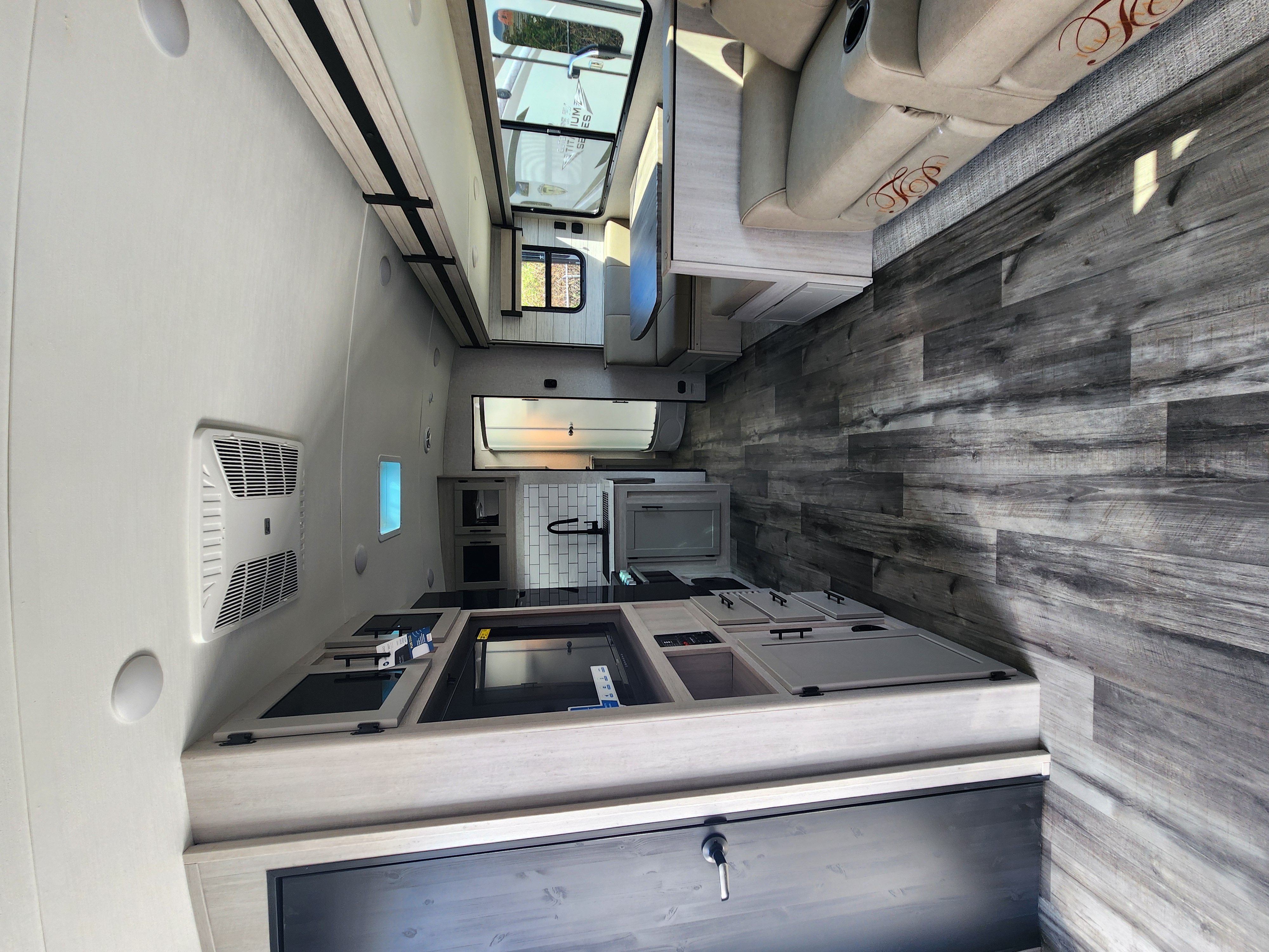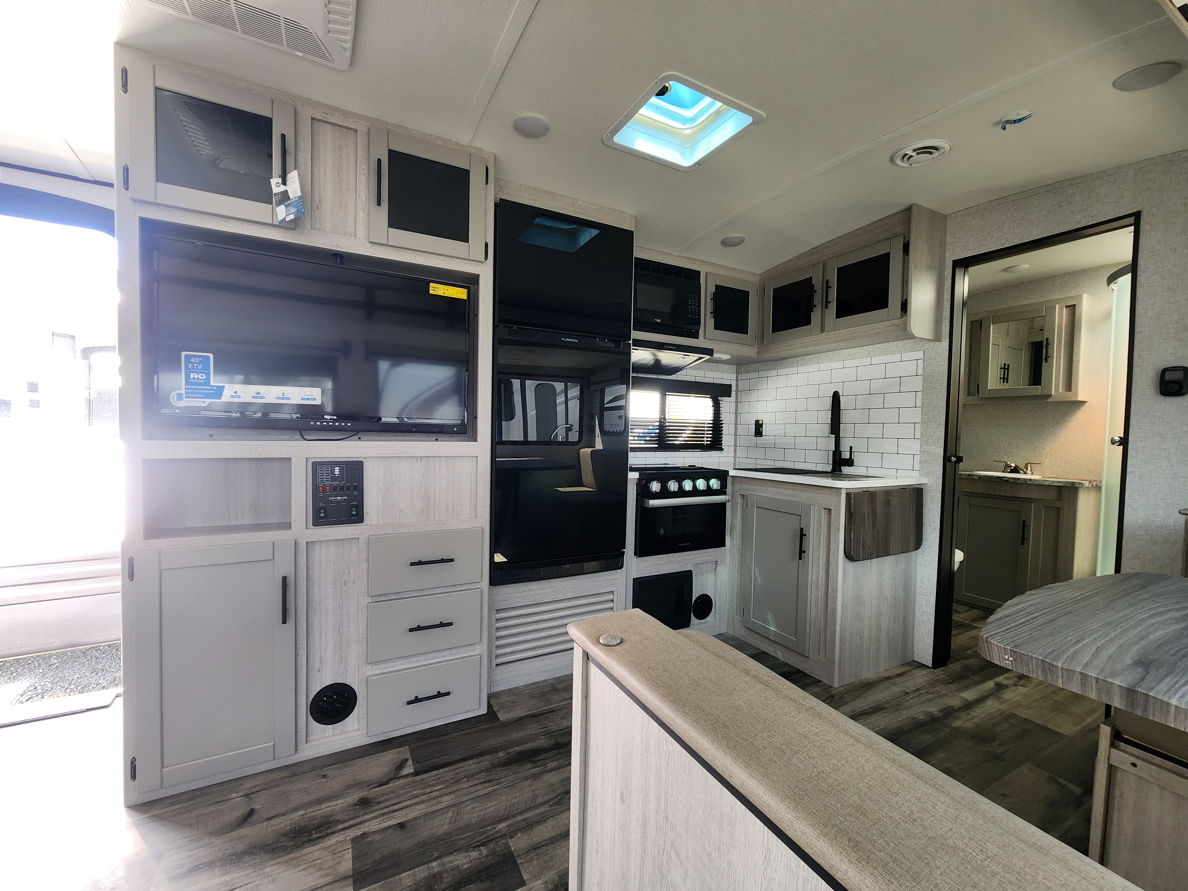 Solid-surface countertops, stainless farmhouse sink, docking station with 12 V, USB & 110 V outlets, LED lighting, and vinyl flooring elevate the design and usability.