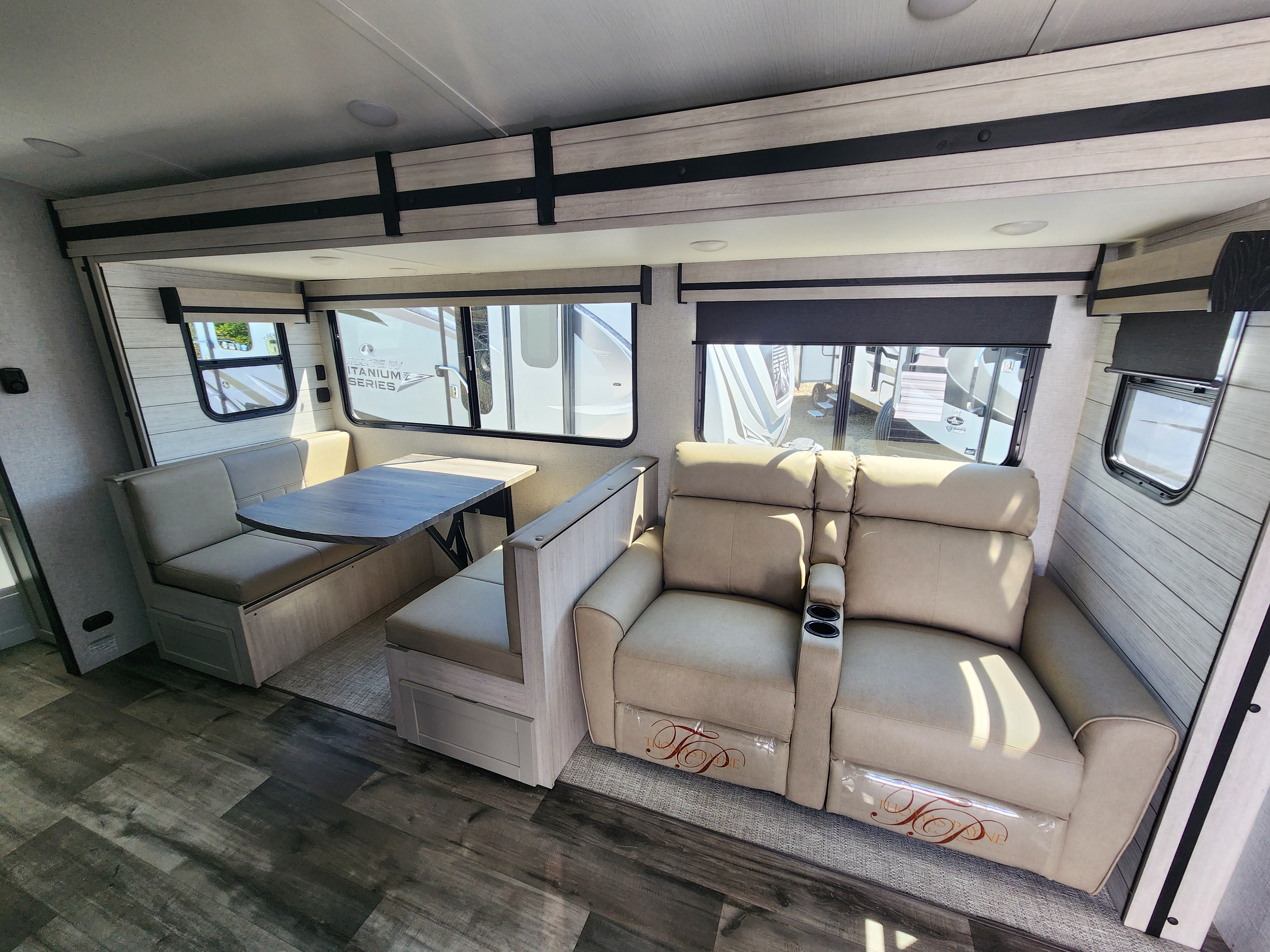 XL booth dinette and tri-fold sofa create a roomy living area ideal for dining, relaxing, and socializing. -