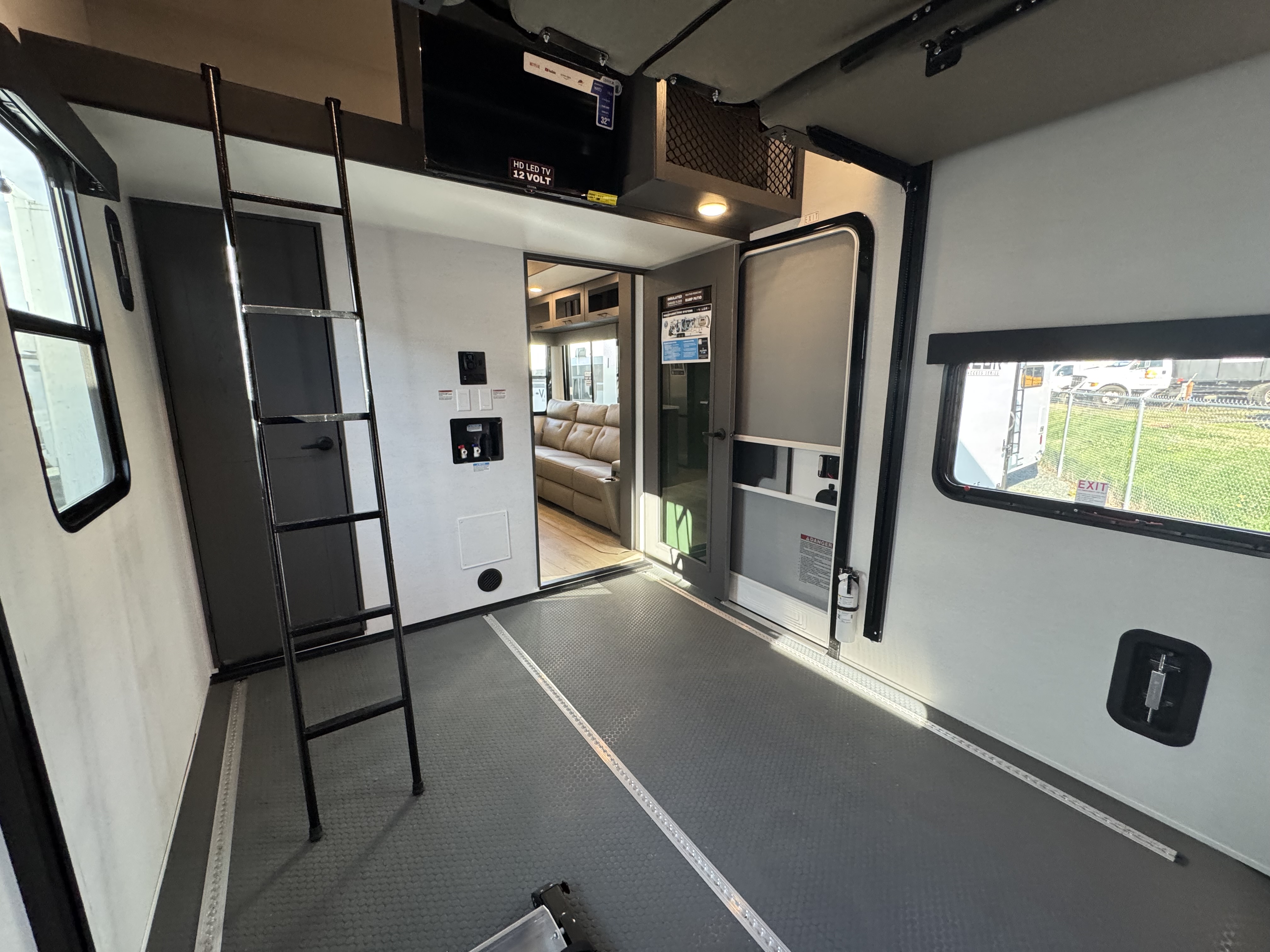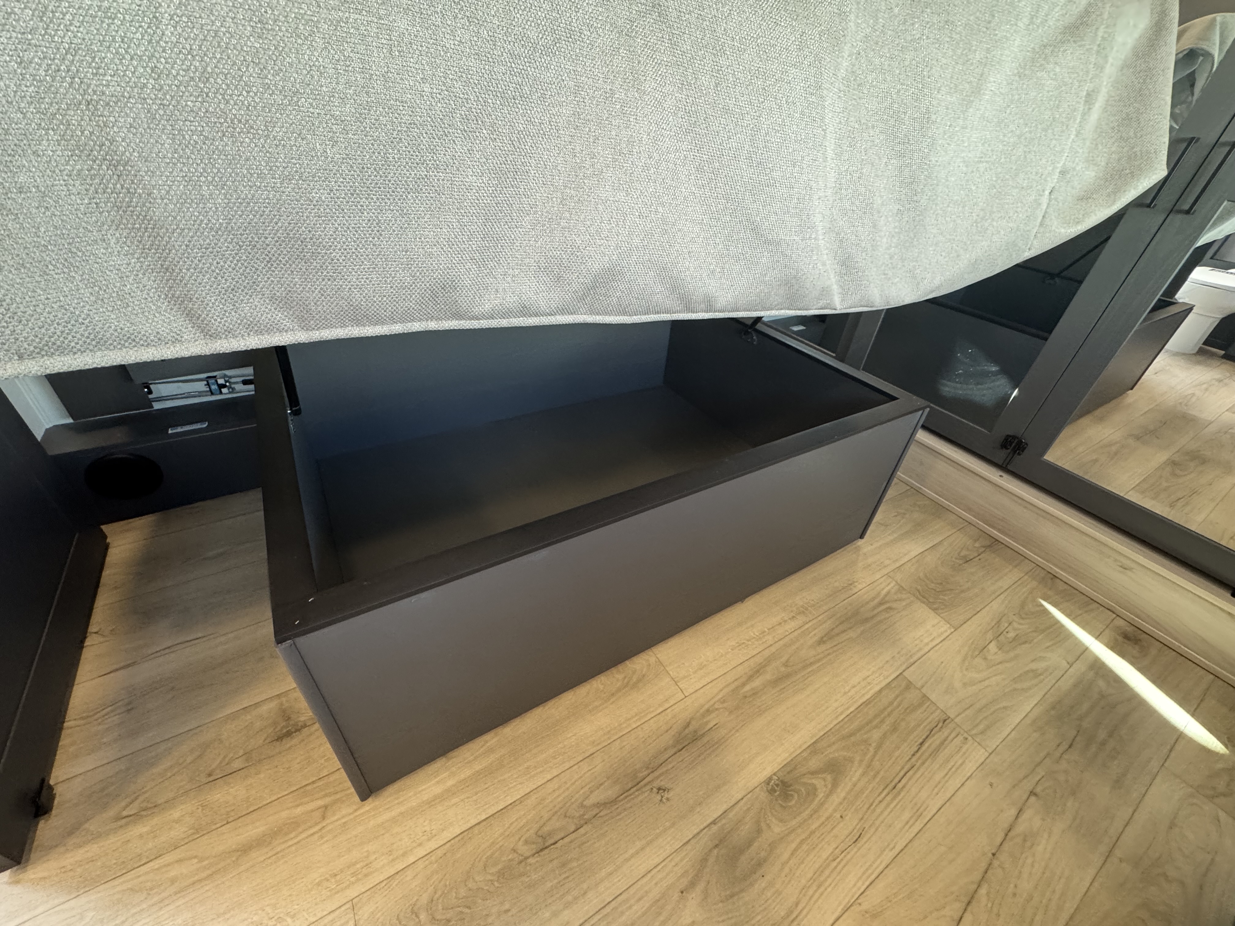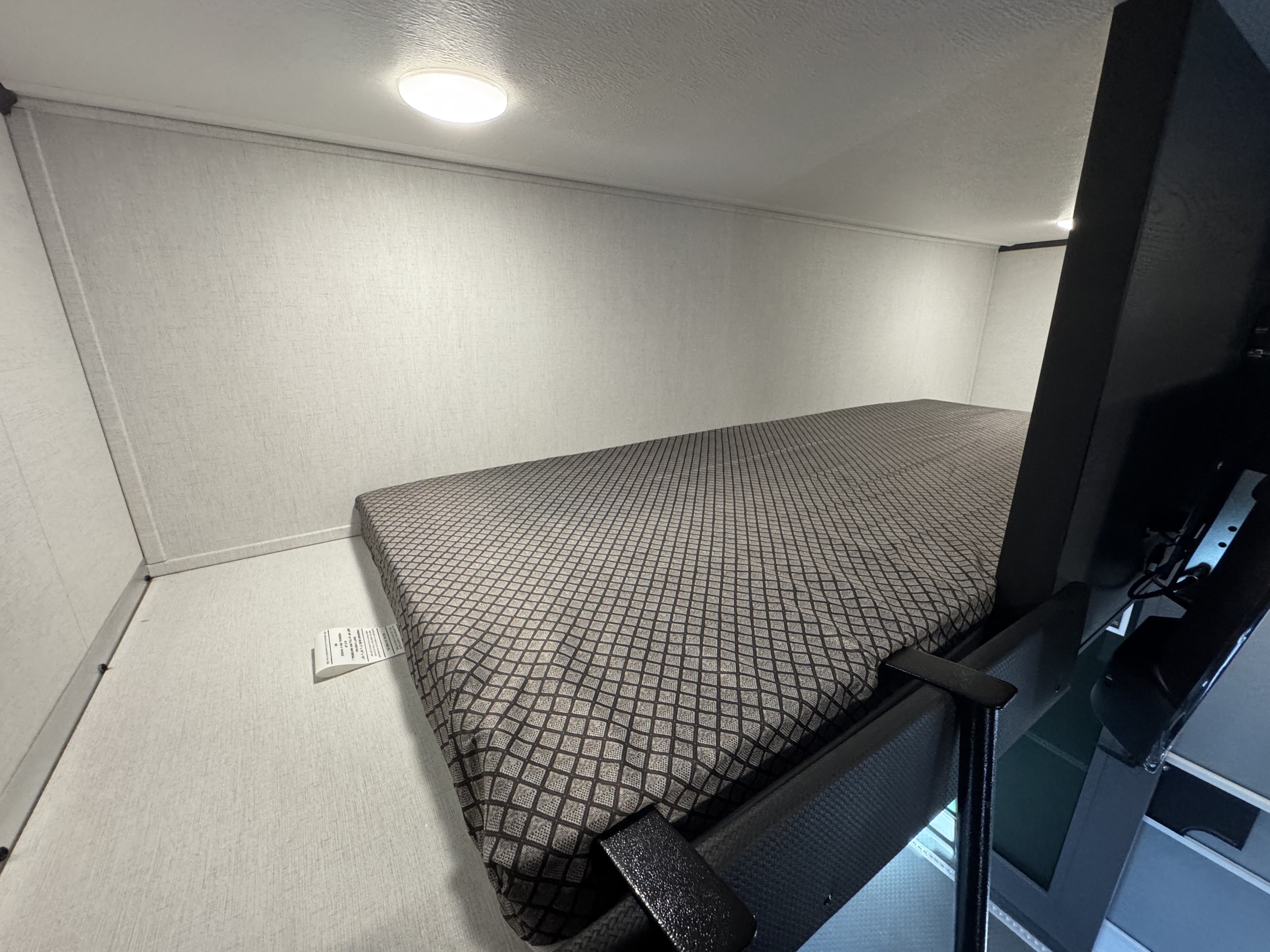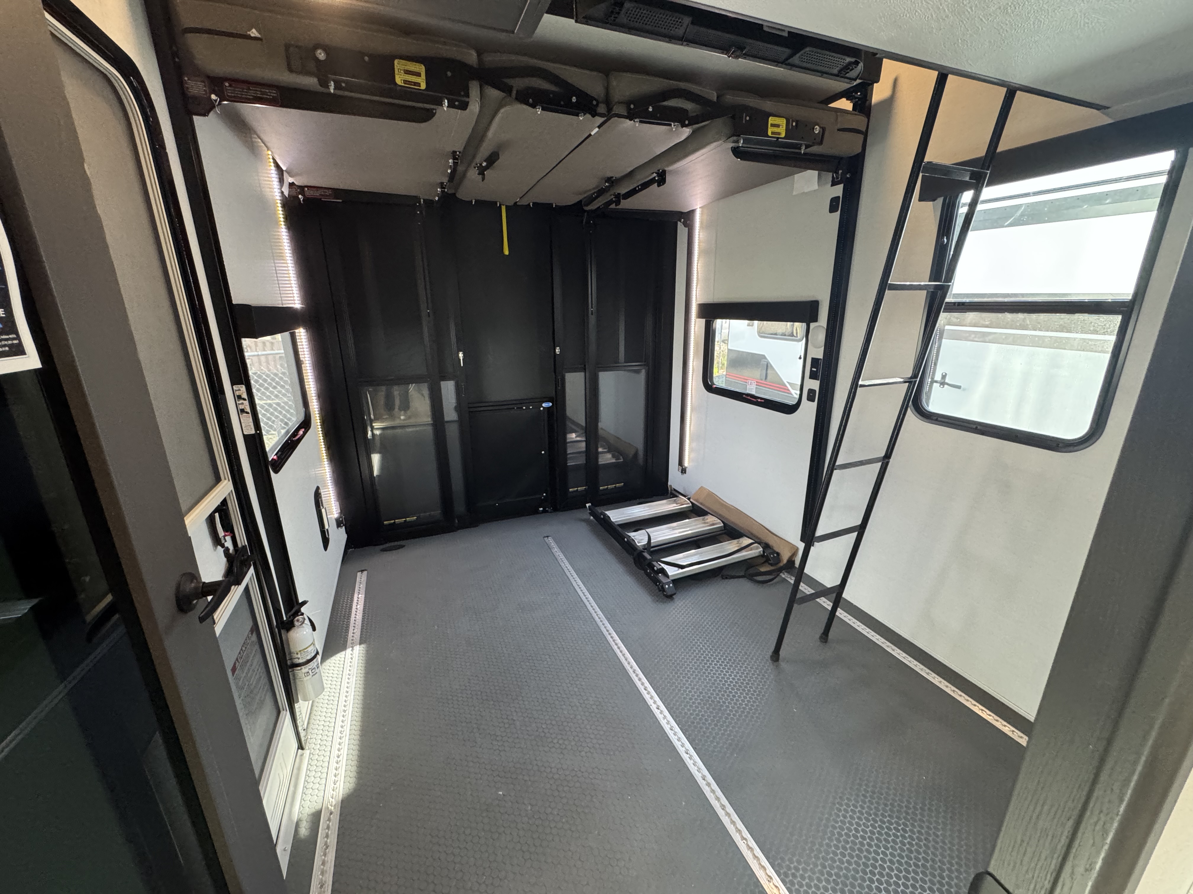 Once you've unloaded your toys, the garage area easily transforms into a spacious living area. The opposing HappiJac sofas provide ample seating, and the drop-down queen mattress offers extra sleeping space when needed. Above the living area, a loft opens to the living room, perfect for additional storage or a cozy sleeping nook. The half bathroom adds convenience for your guests.