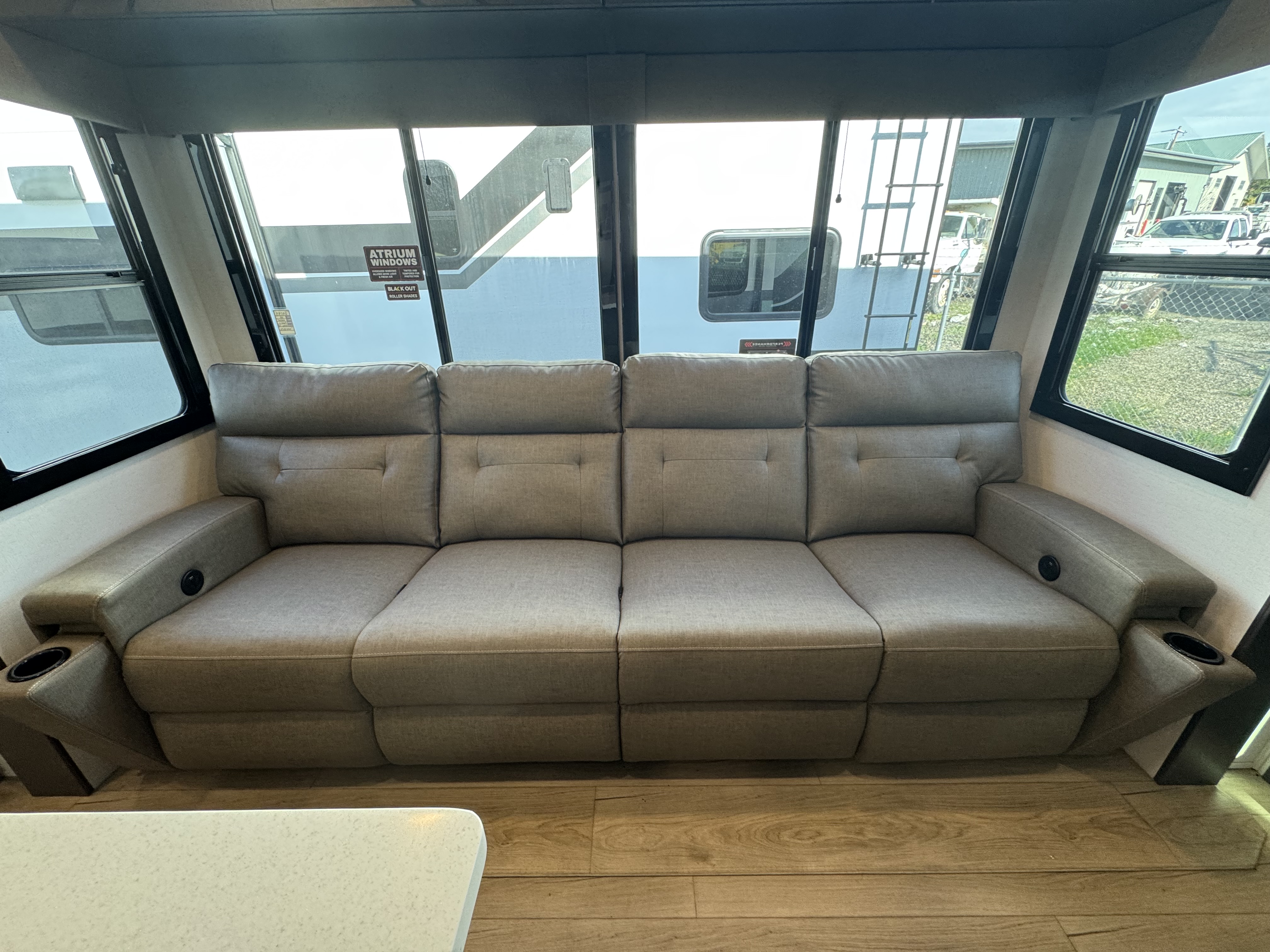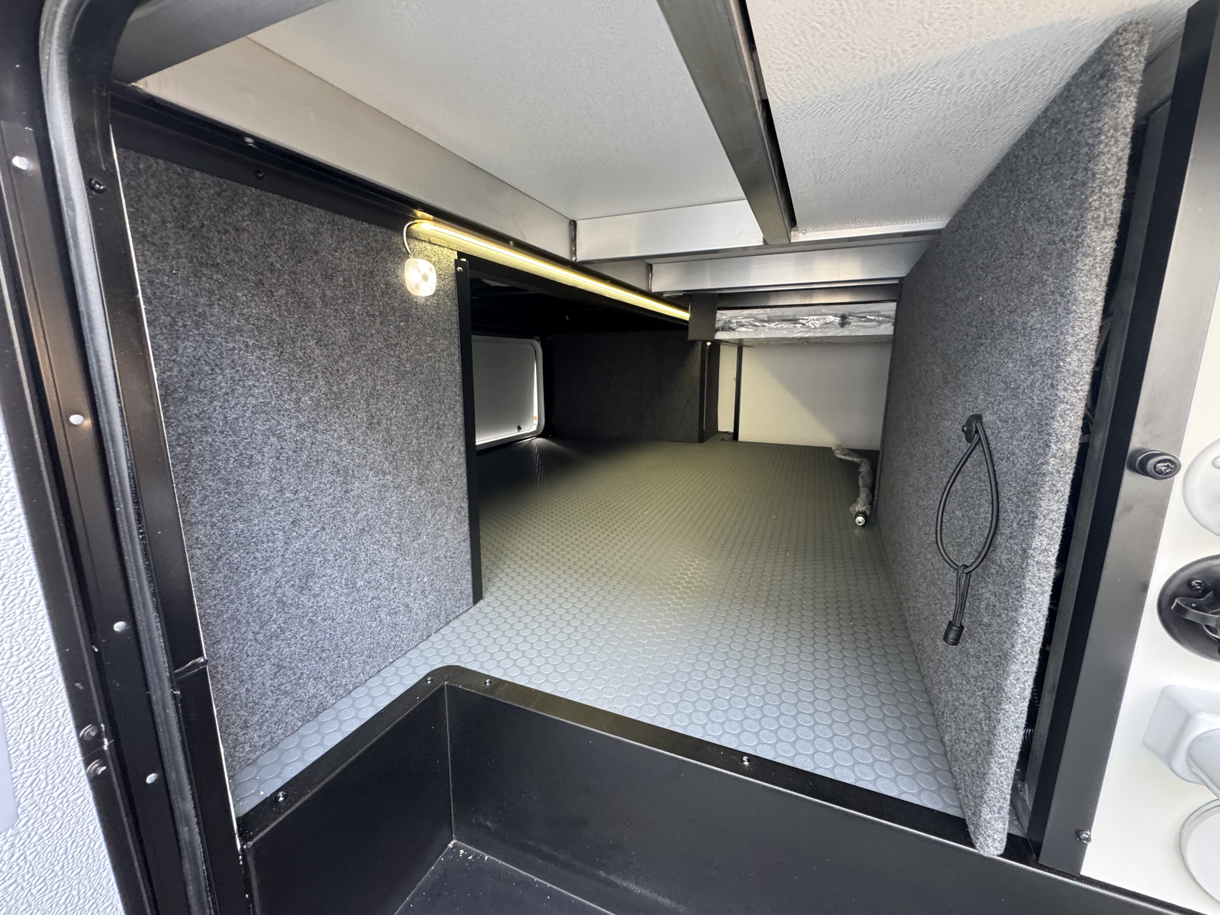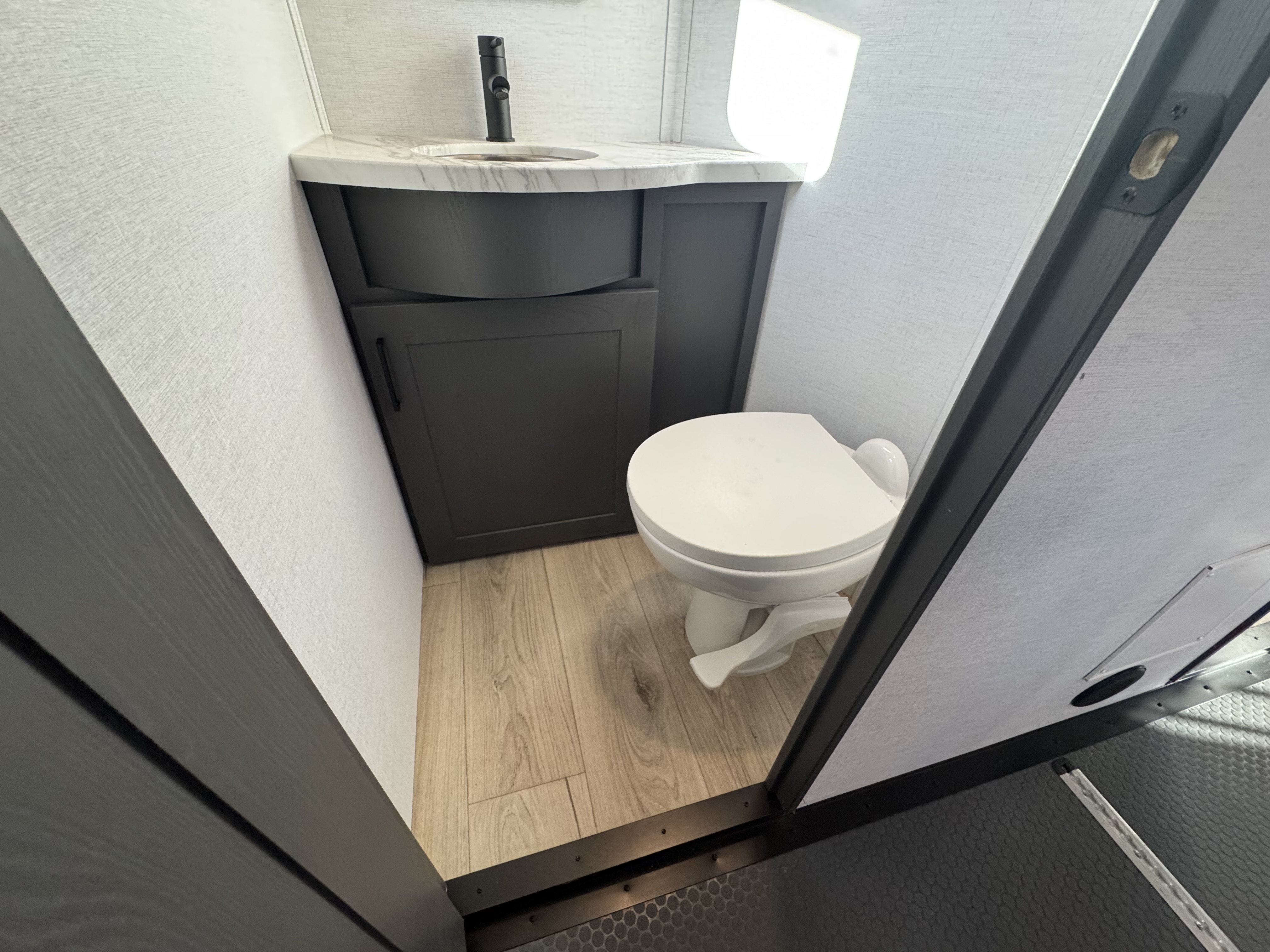 Once you've unloaded your toys, the garage area easily transforms into a spacious living area. The opposing HappiJac sofas provide ample seating, and the drop-down queen mattress offers extra sleeping space when needed. Above the living area, a loft opens to the living room, perfect for additional storage or a cozy sleeping nook. The half bathroom adds convenience for your guests.