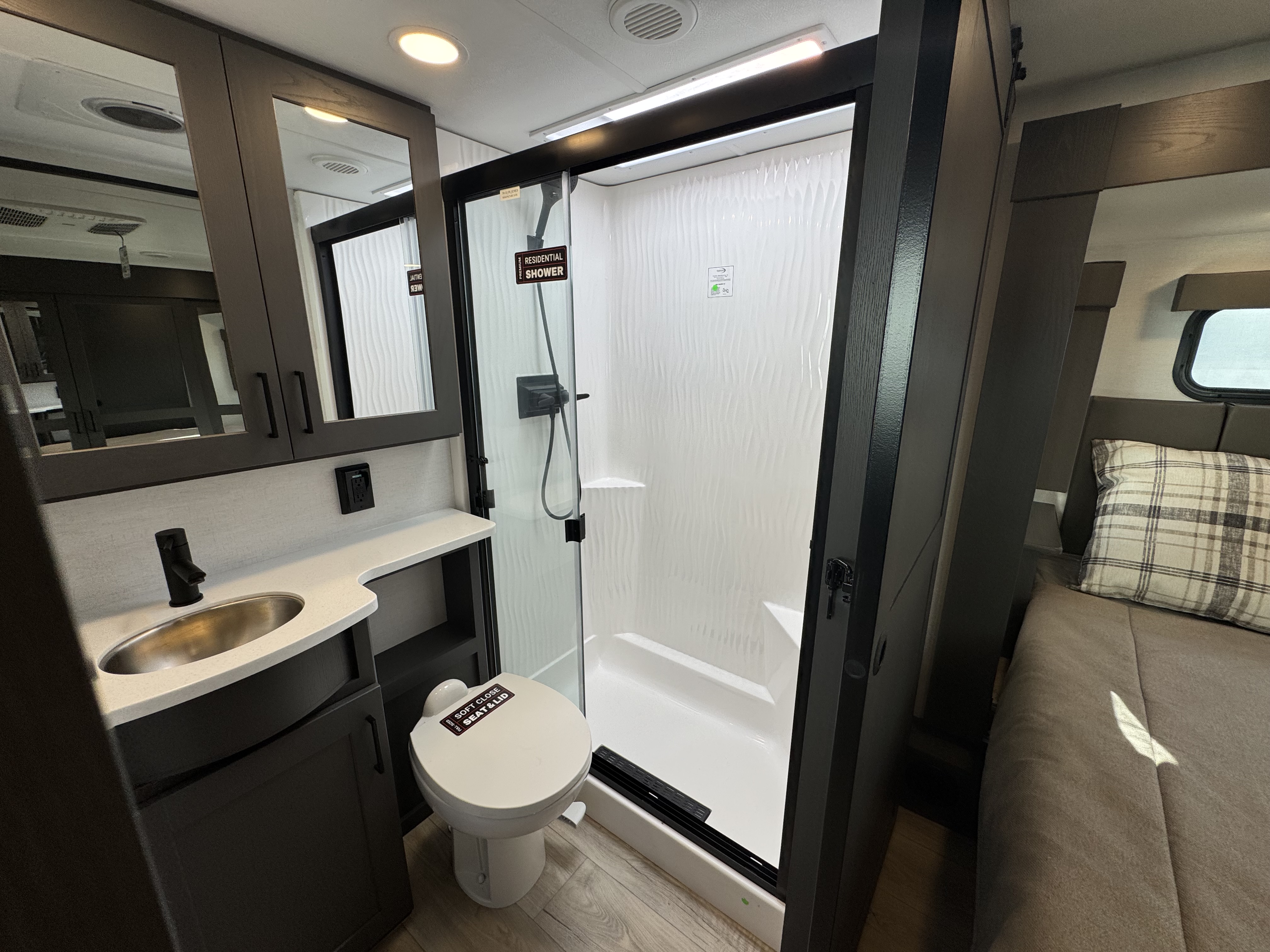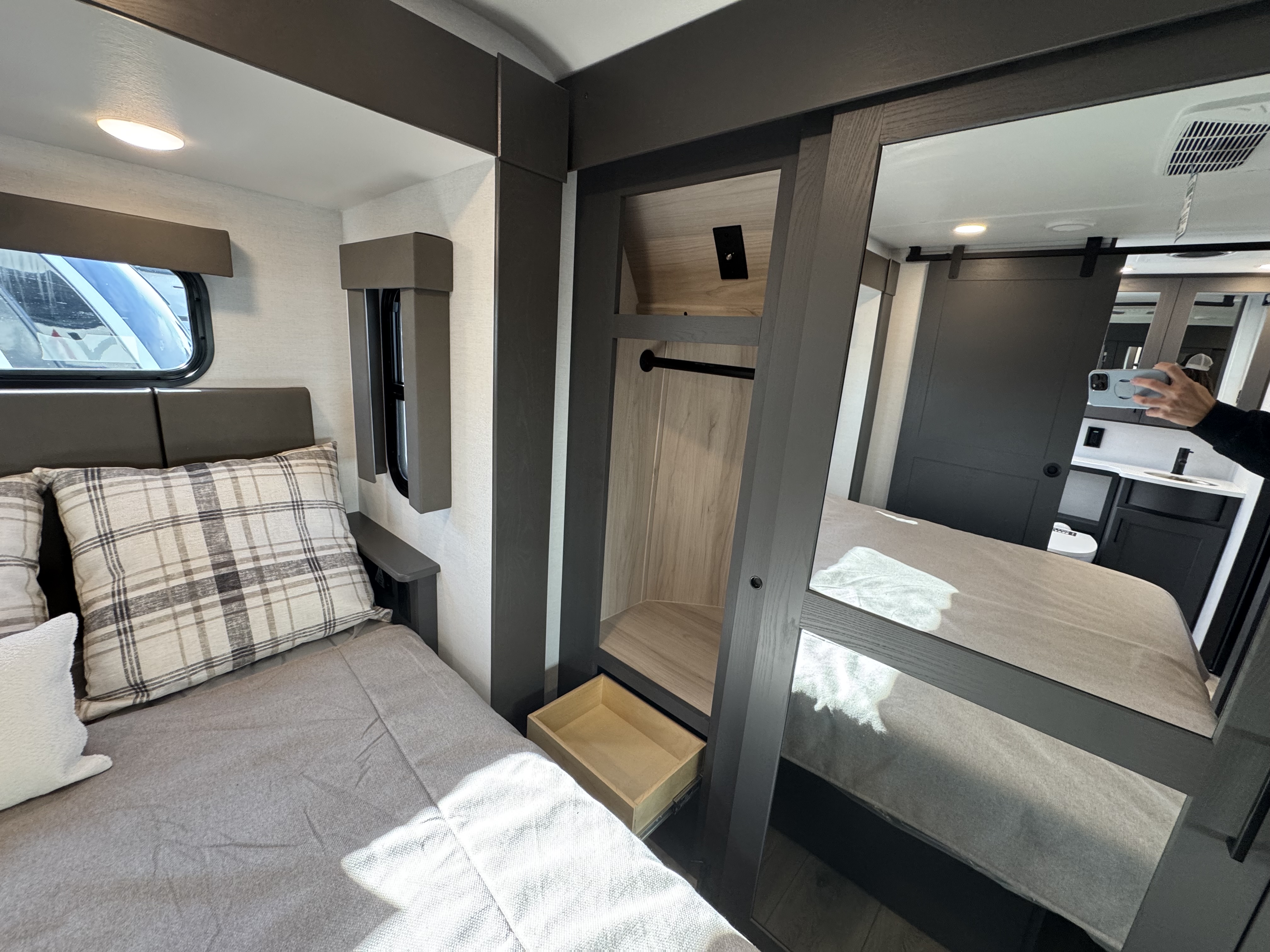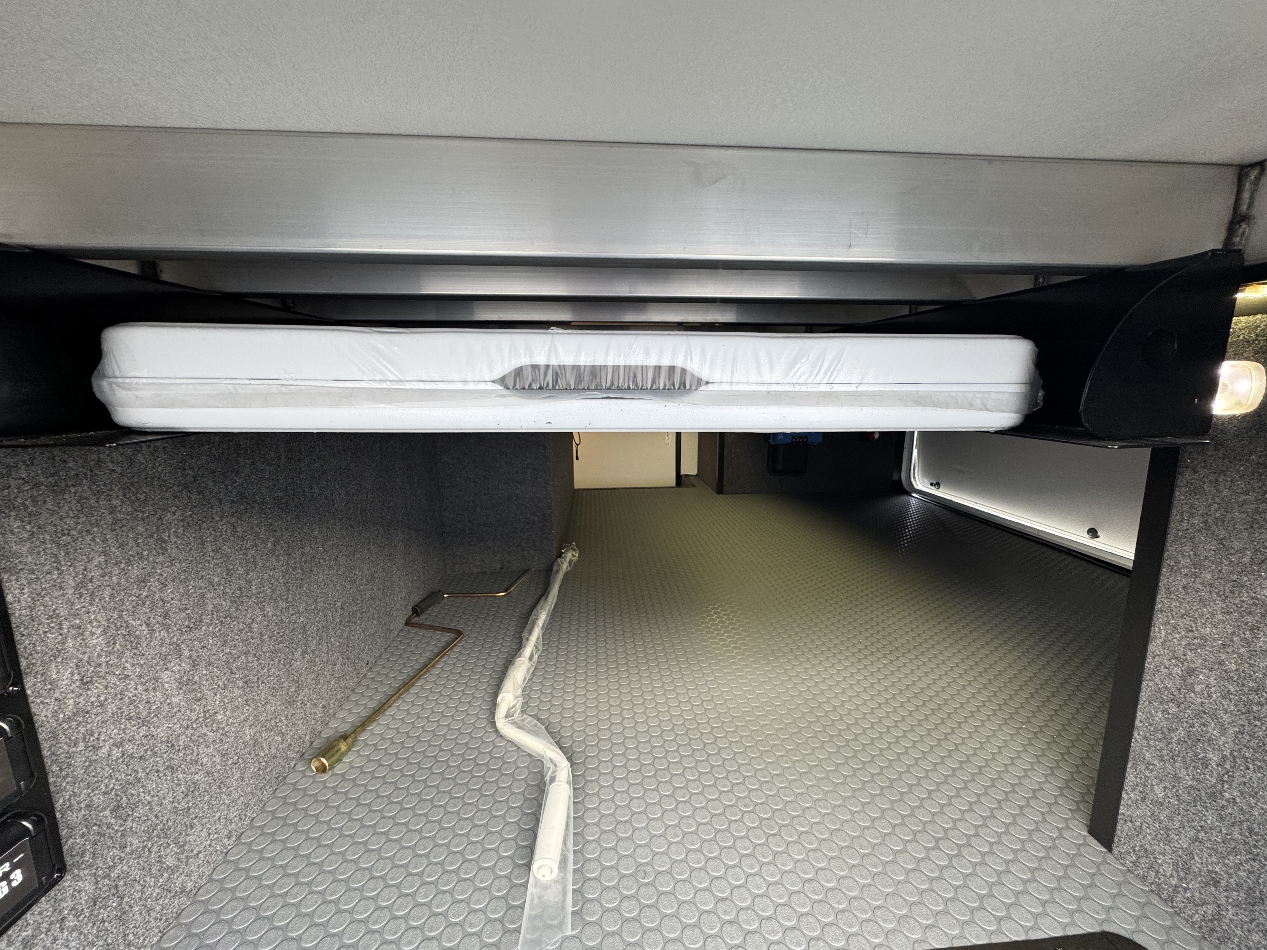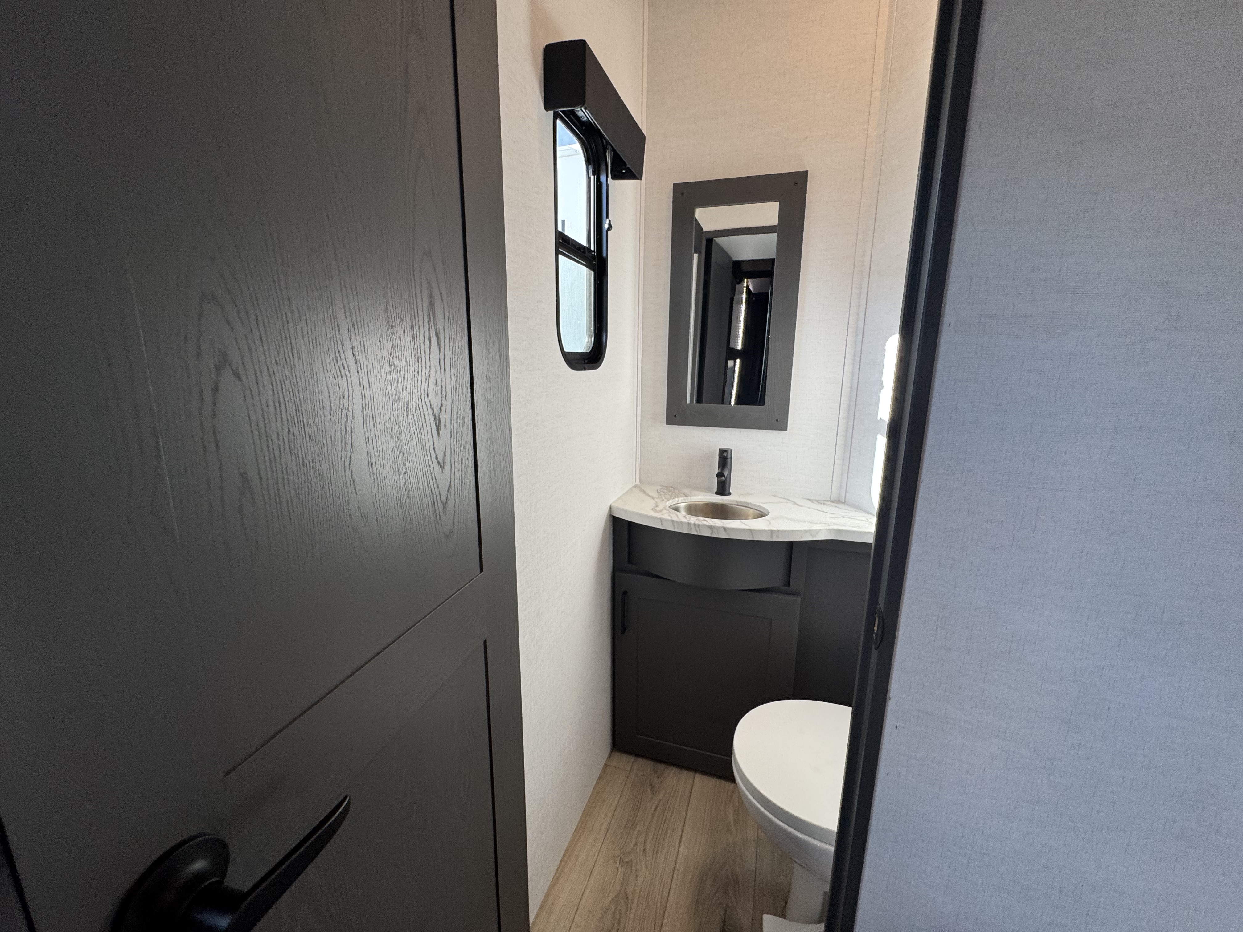 Once you've unloaded your toys, the garage area easily transforms into a spacious living area. The opposing HappiJac sofas provide ample seating, and the drop-down queen mattress offers extra sleeping space when needed. Above the living area, a loft opens to the living room, perfect for additional storage or a cozy sleeping nook. The half bathroom adds convenience for your guests.