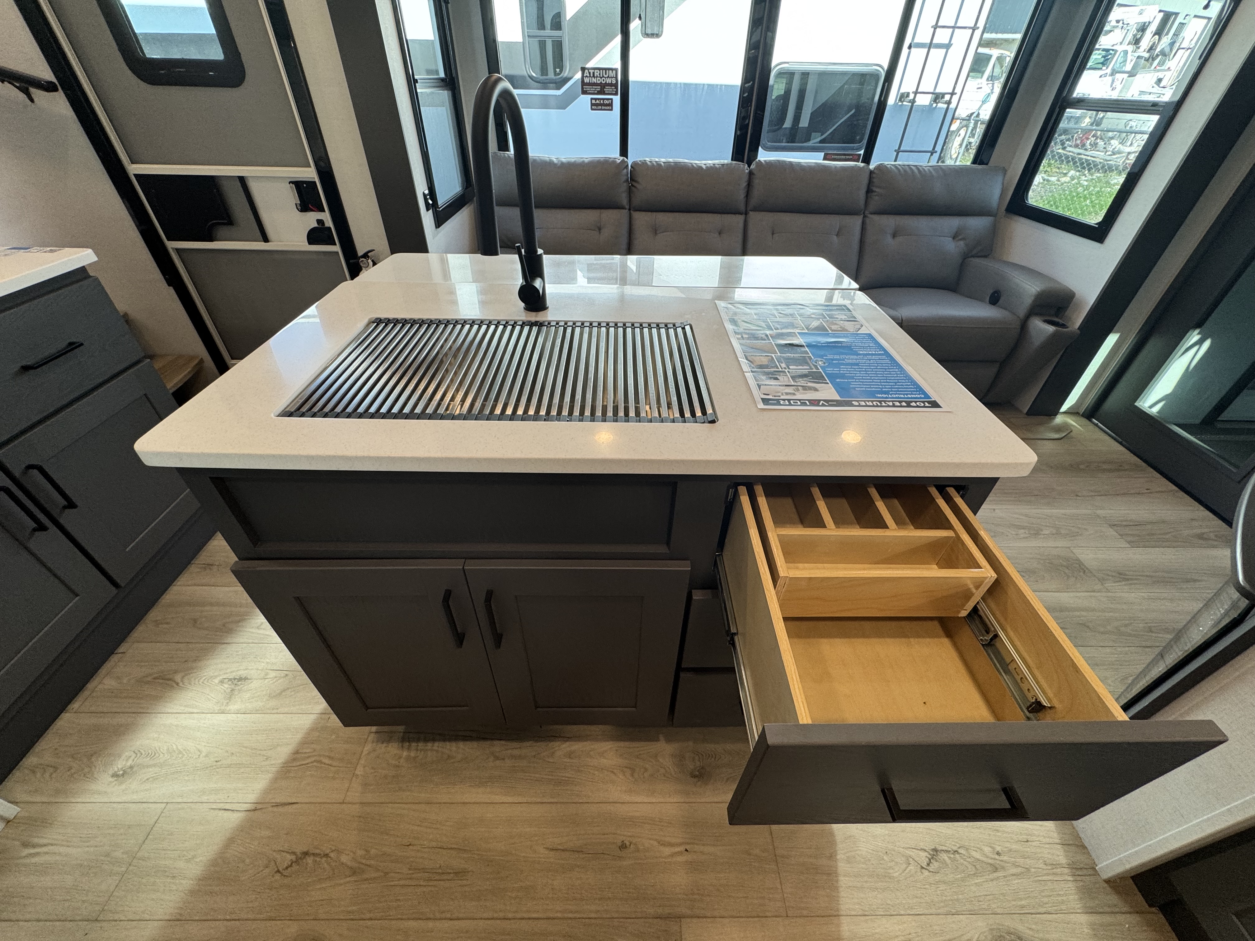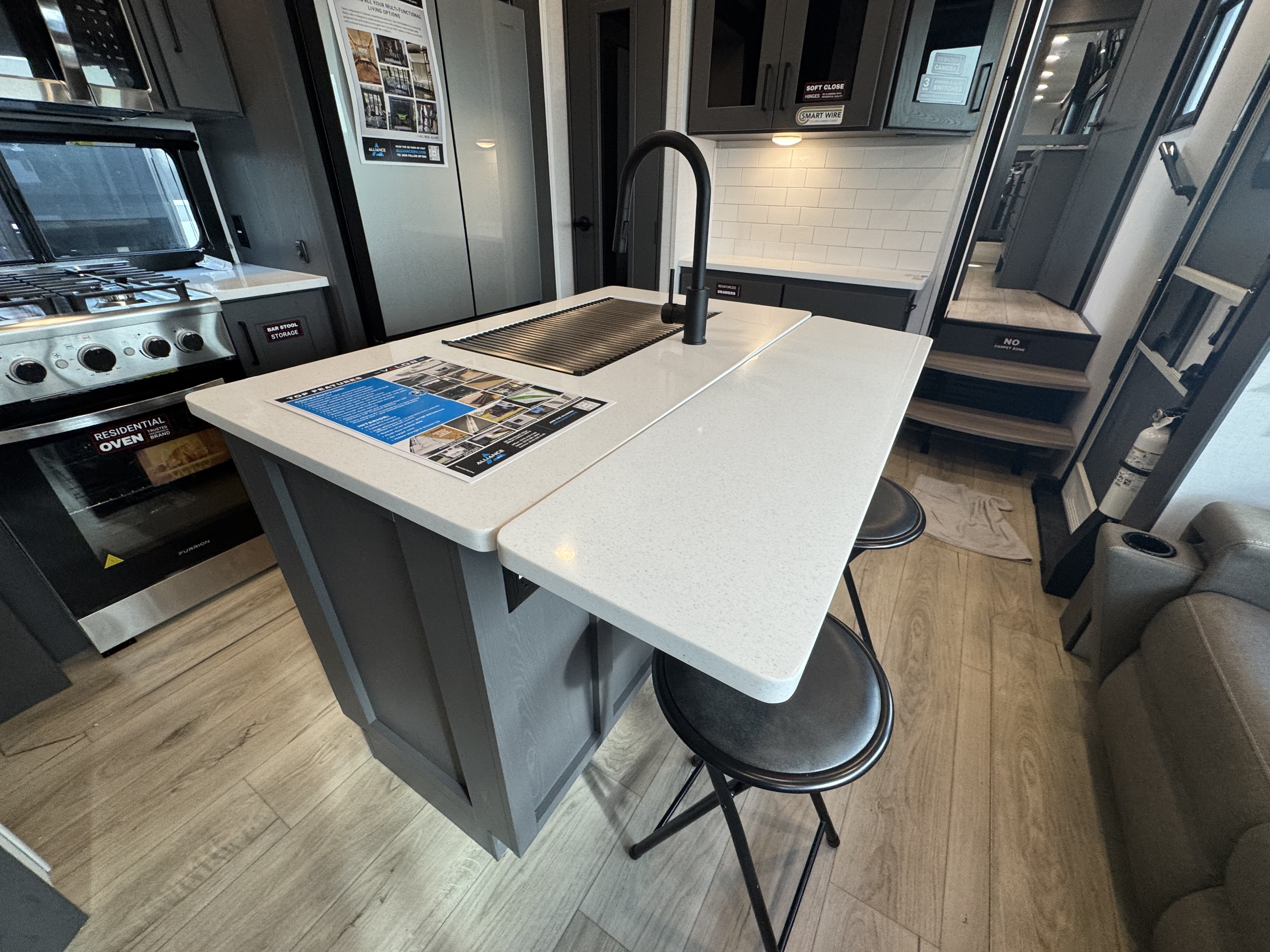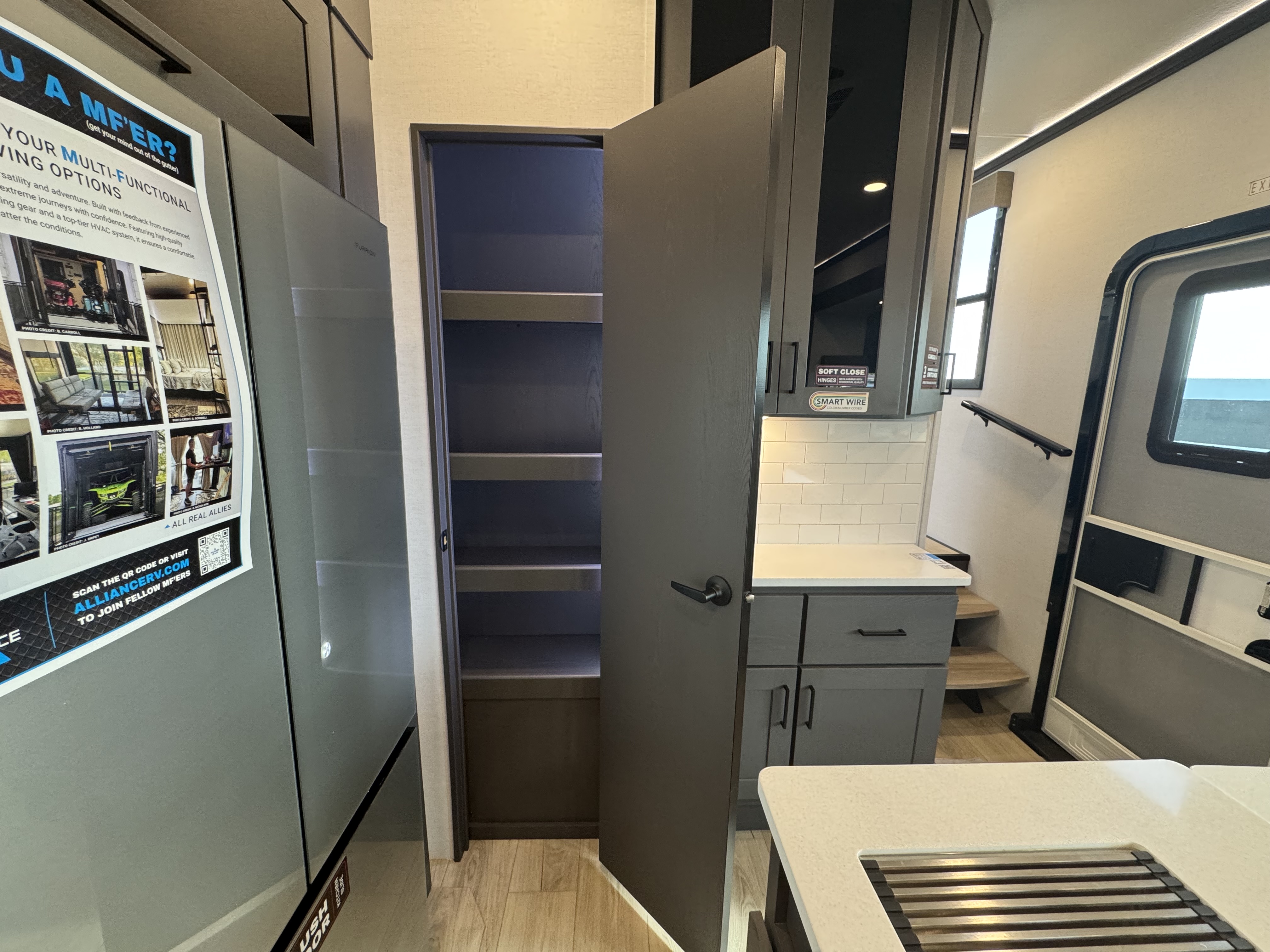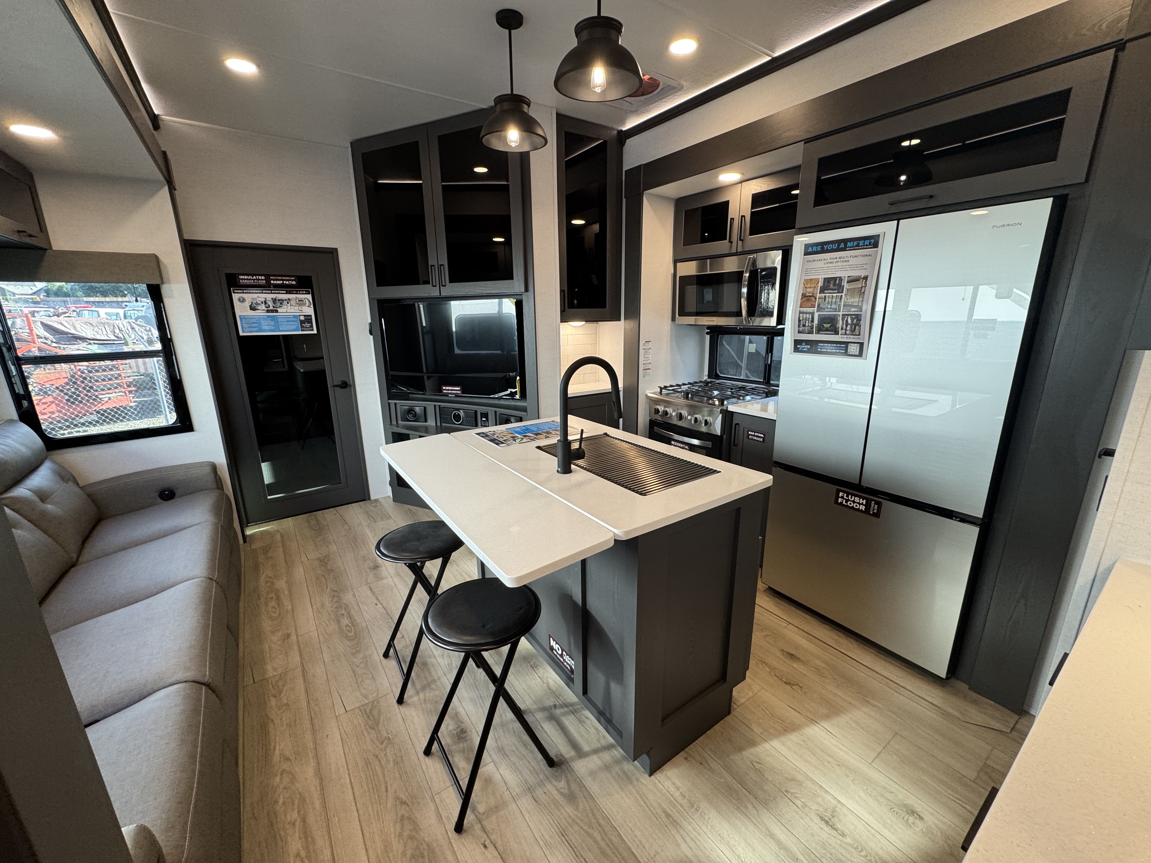 The kitchen is fully equipped to prepare your best meals with two hutches, three pantries, and a kitchen island with two bar stools for a casual dining experience. The dual-entry bathroom includes a 48" x 30" shower and provides direct access to the private front bedroom, ensuring your comfort and privacy. Inside the bedroom, the king bed slide-out gives you extra floor space, while a flip-top dresser and a large front wardrobe (prepped for an optional washer/dryer) provide ample storage.