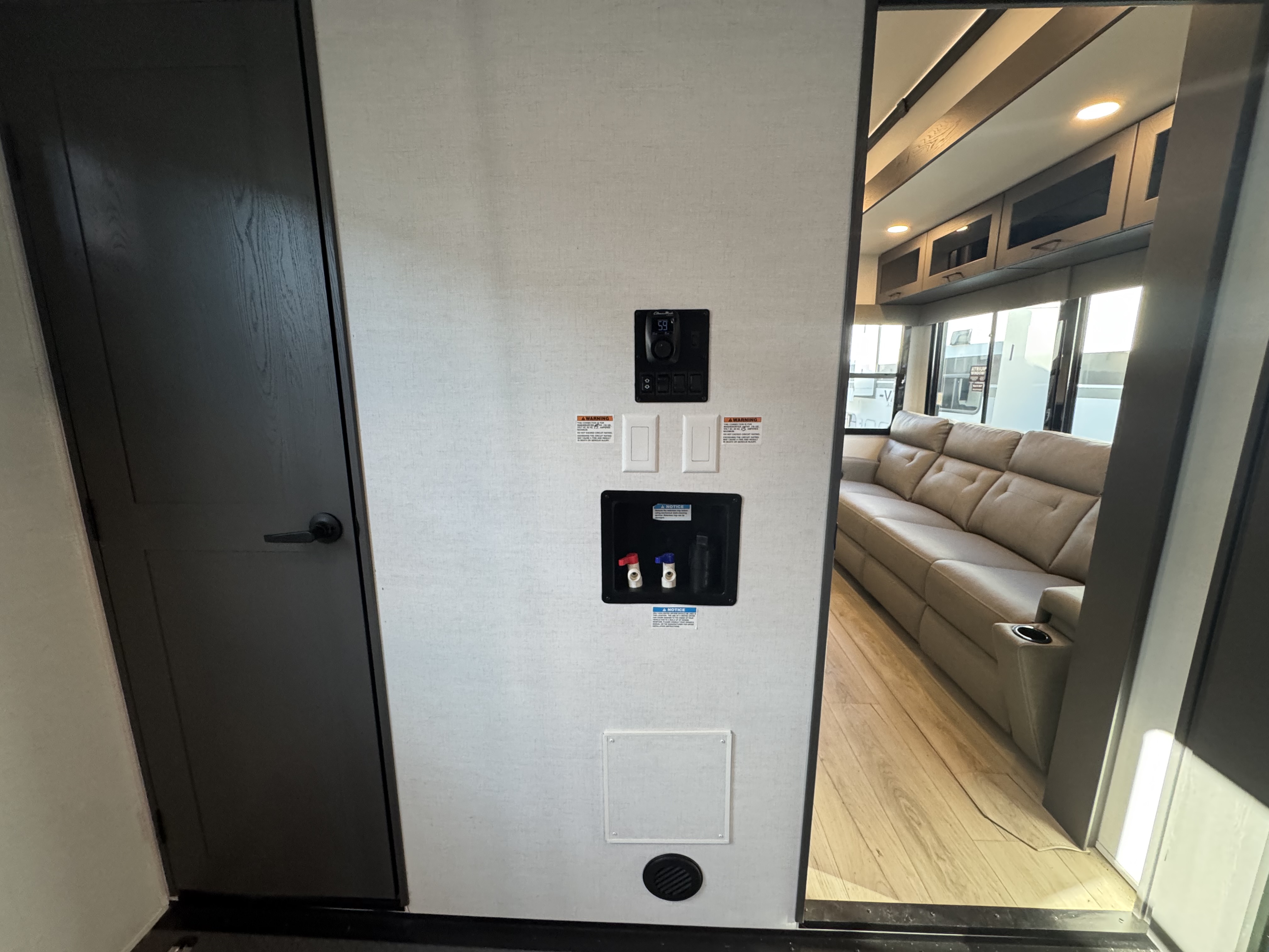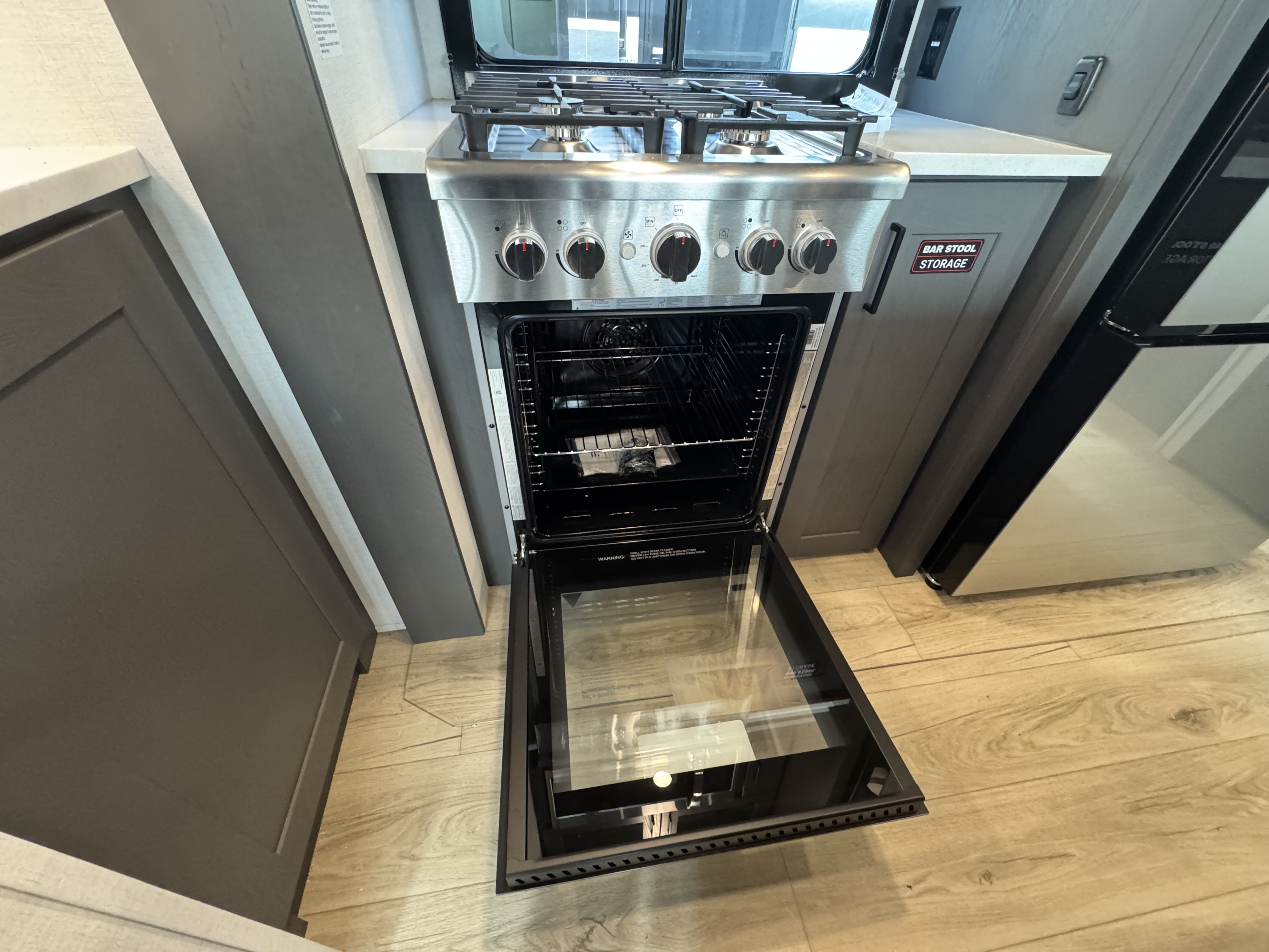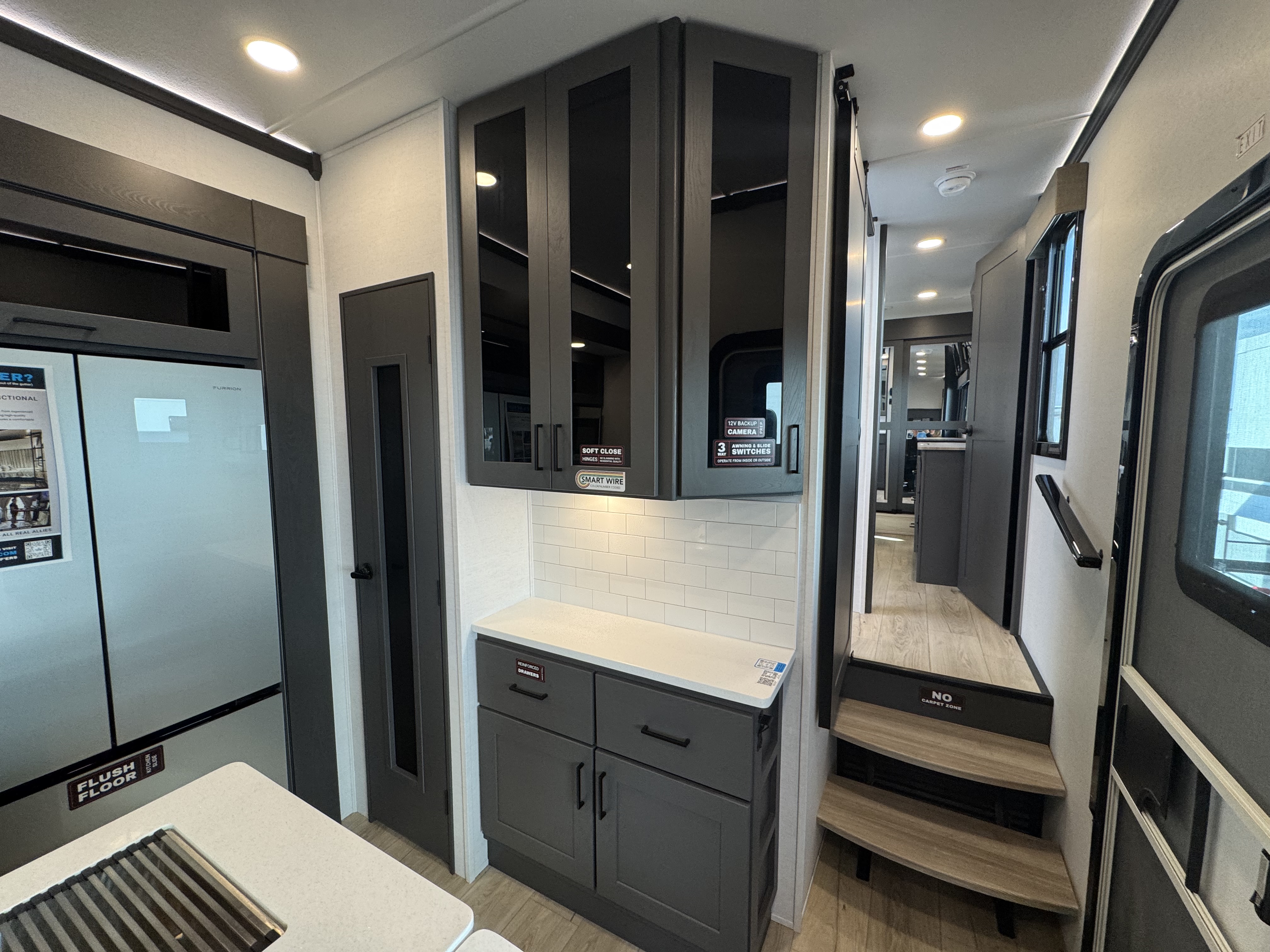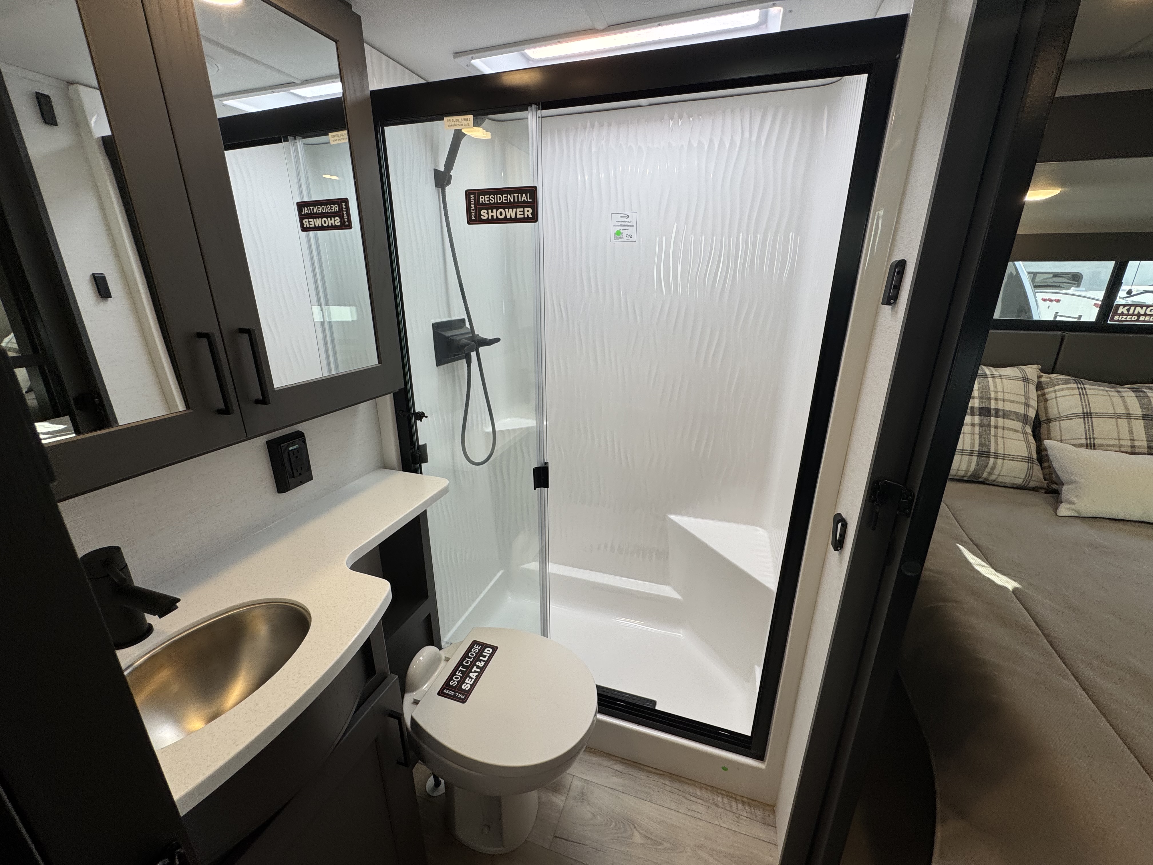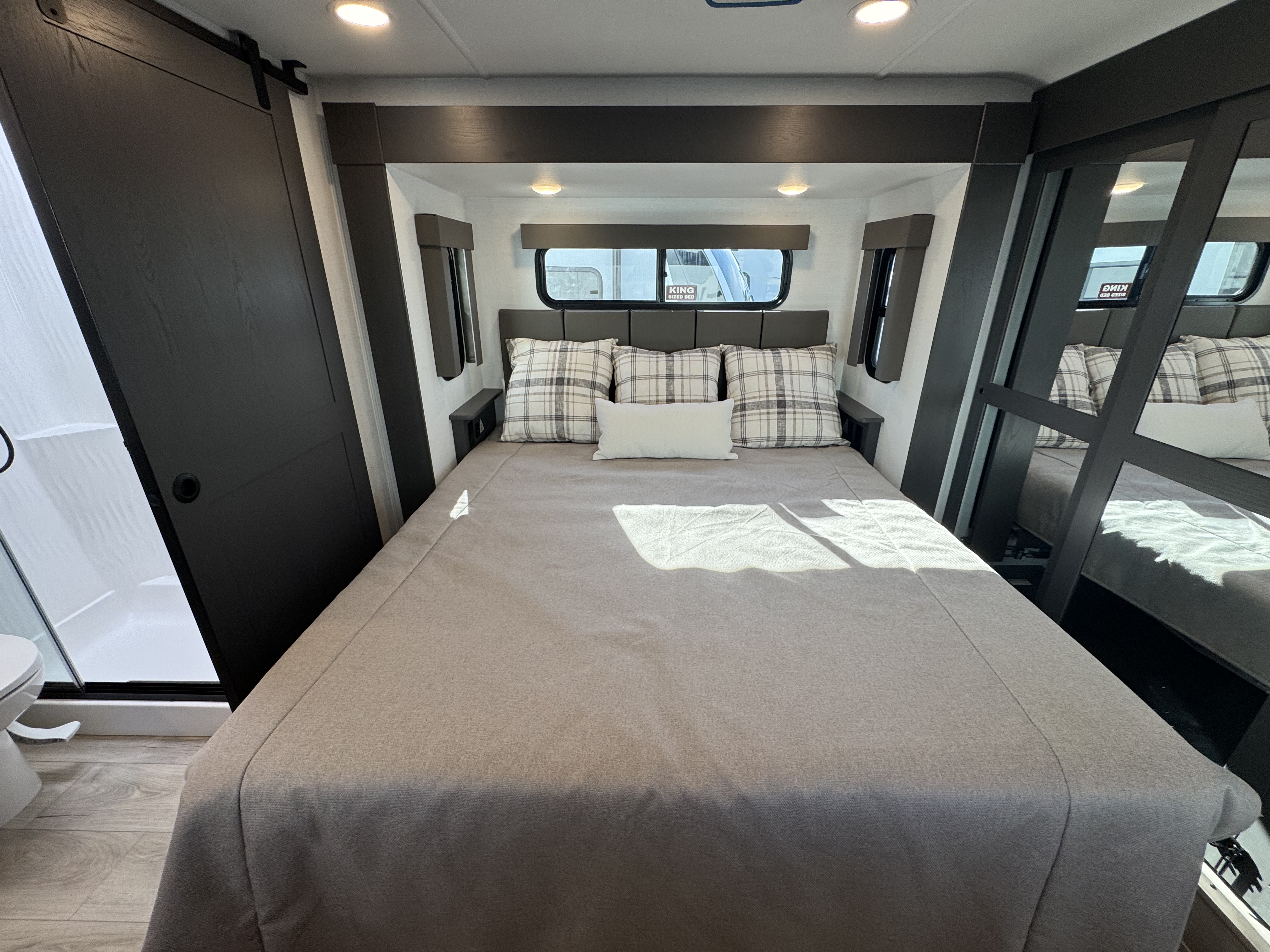 The kitchen is fully equipped to prepare your best meals with two hutches, three pantries, and a kitchen island with two bar stools for a casual dining experience. The dual-entry bathroom includes a 48" x 30" shower and provides direct access to the private front bedroom, ensuring your comfort and privacy. Inside the bedroom, the king bed slide-out gives you extra floor space, while a flip-top dresser and a large front wardrobe (prepped for an optional washer/dryer) provide ample storage.