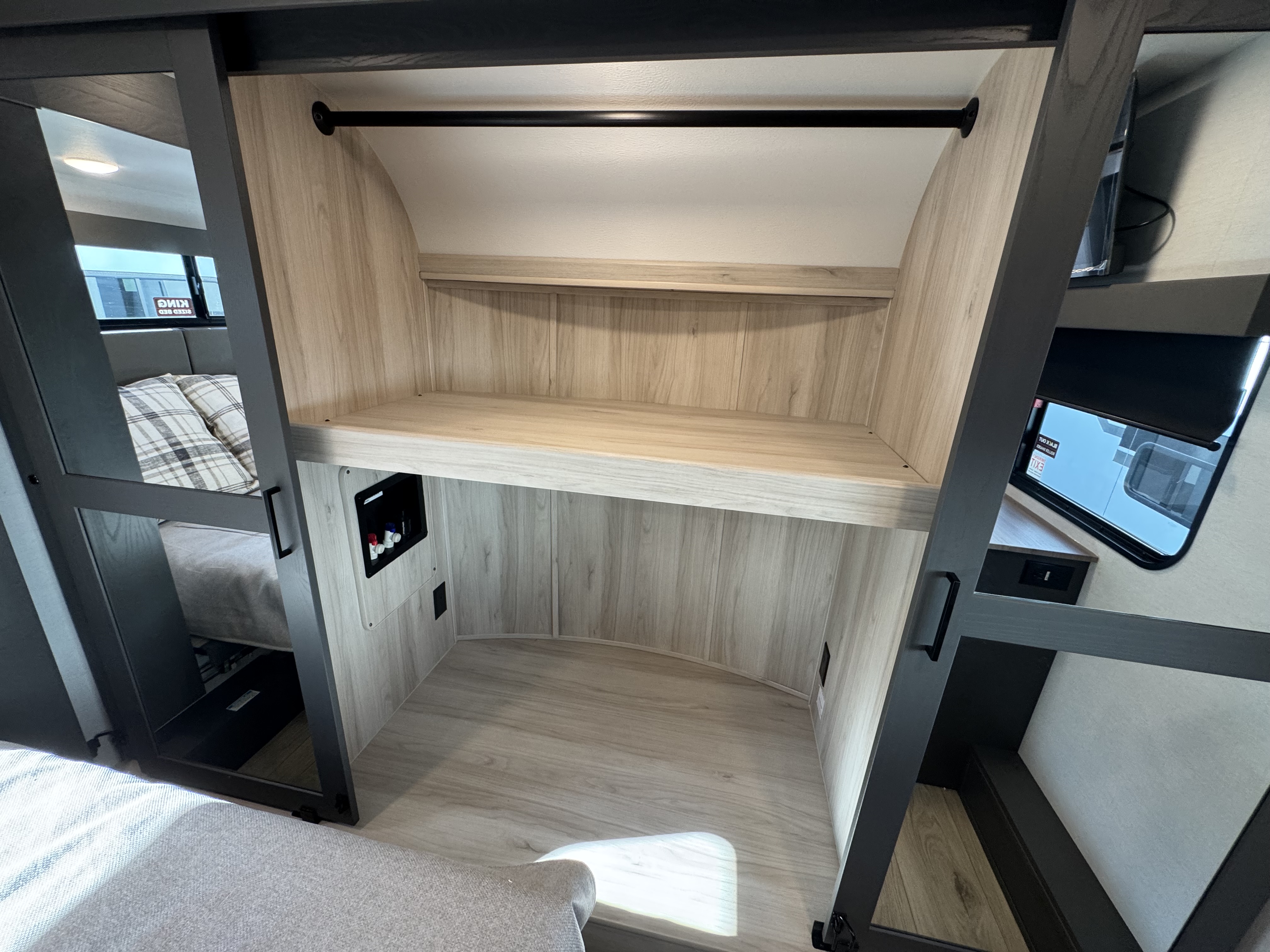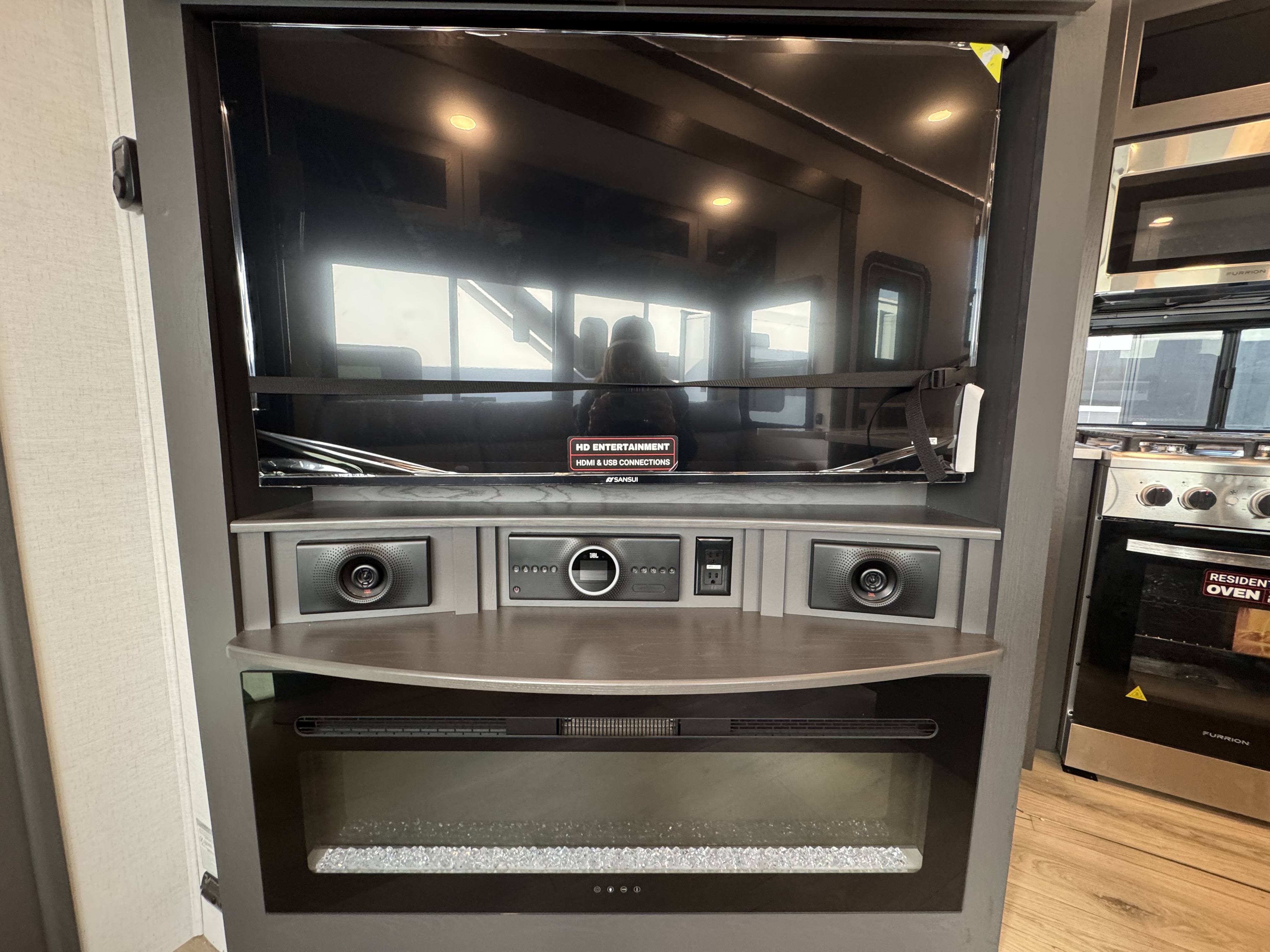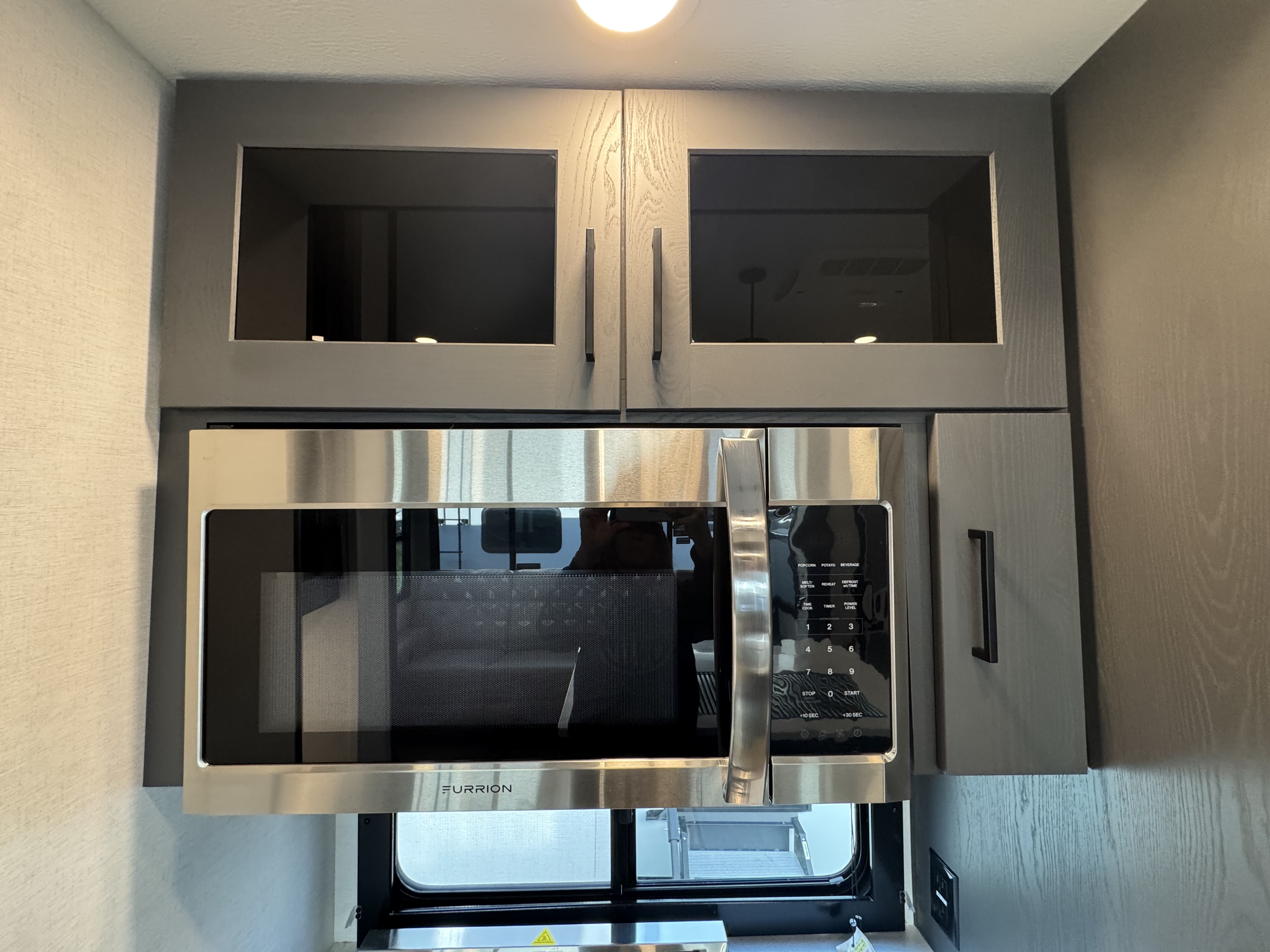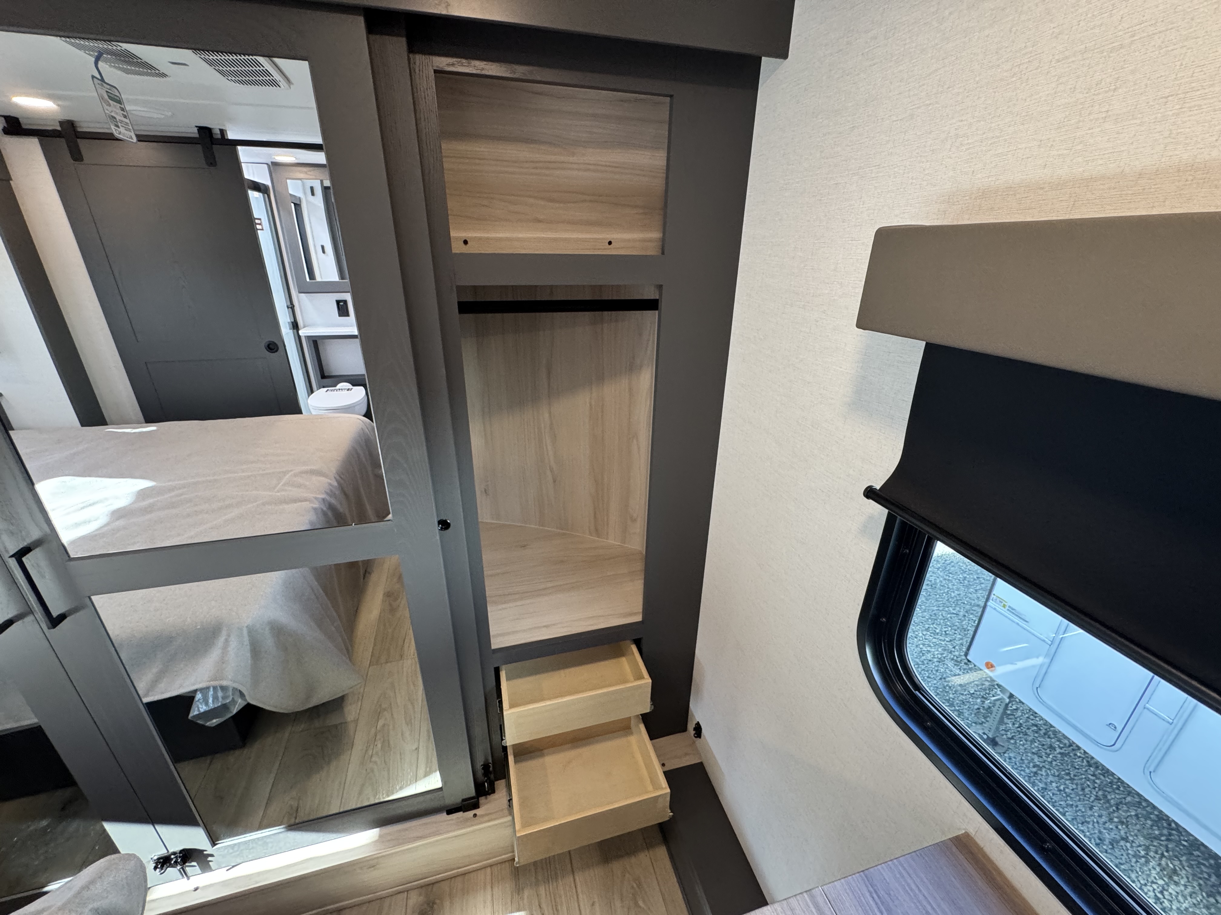 The kitchen is fully equipped to prepare your best meals with two hutches, three pantries, and a kitchen island with two bar stools for a casual dining experience. The dual-entry bathroom includes a 48" x 30" shower and provides direct access to the private front bedroom, ensuring your comfort and privacy. Inside the bedroom, the king bed slide-out gives you extra floor space, while a flip-top dresser and a large front wardrobe (prepped for an optional washer/dryer) provide ample storage.