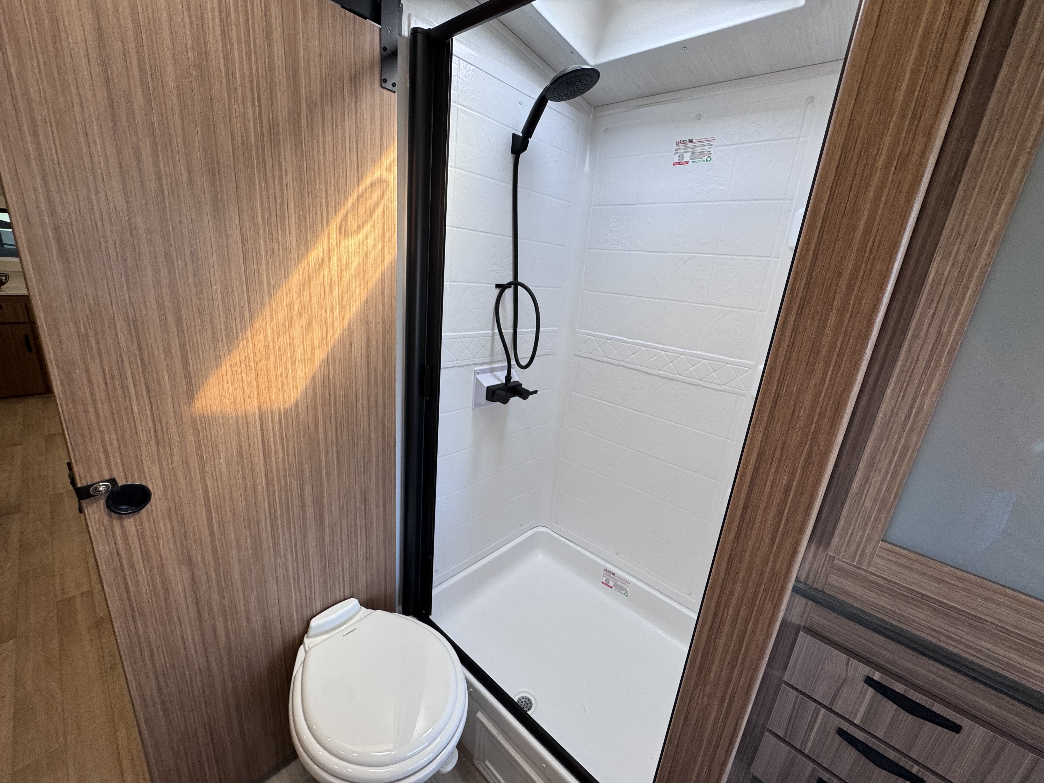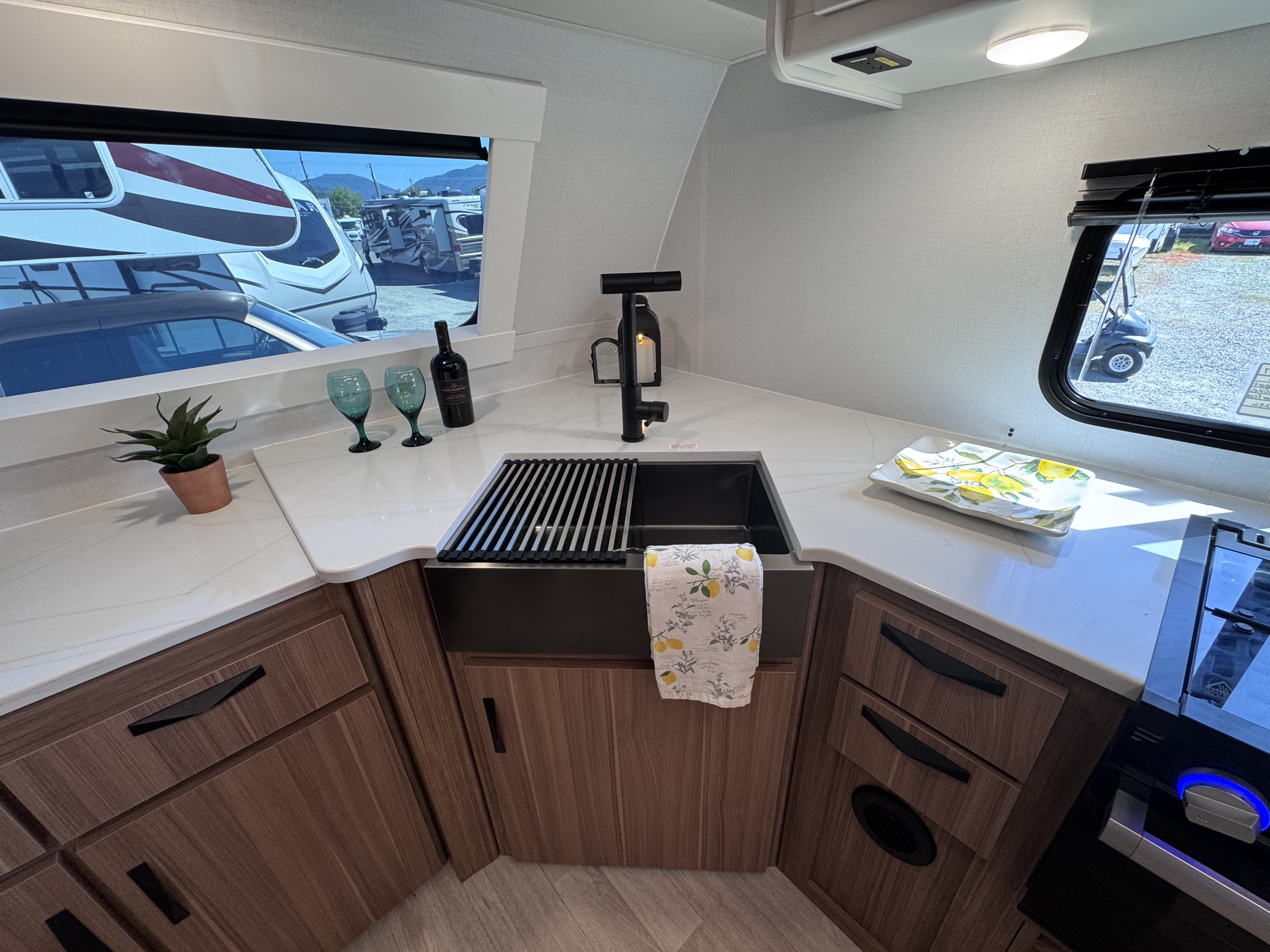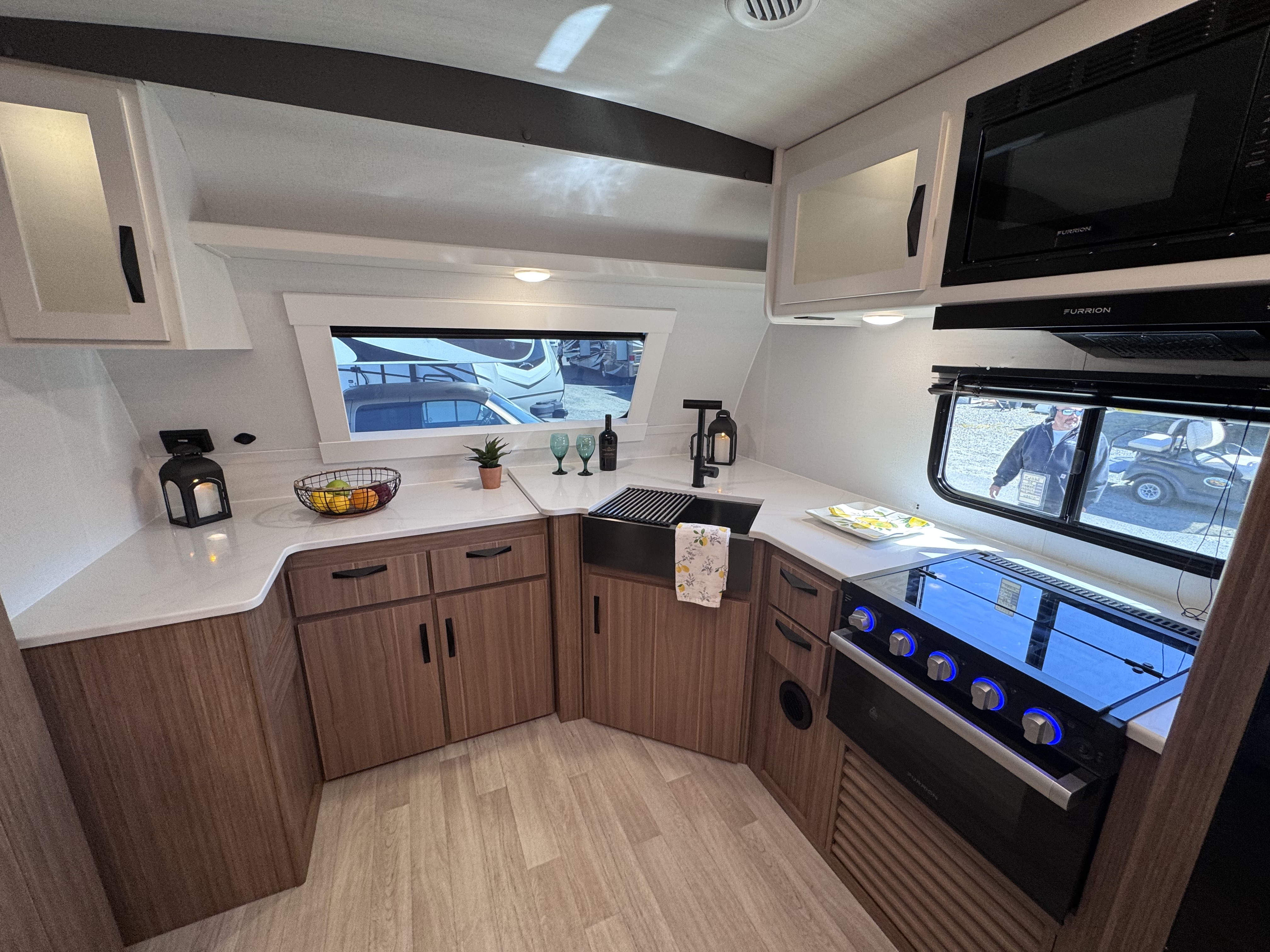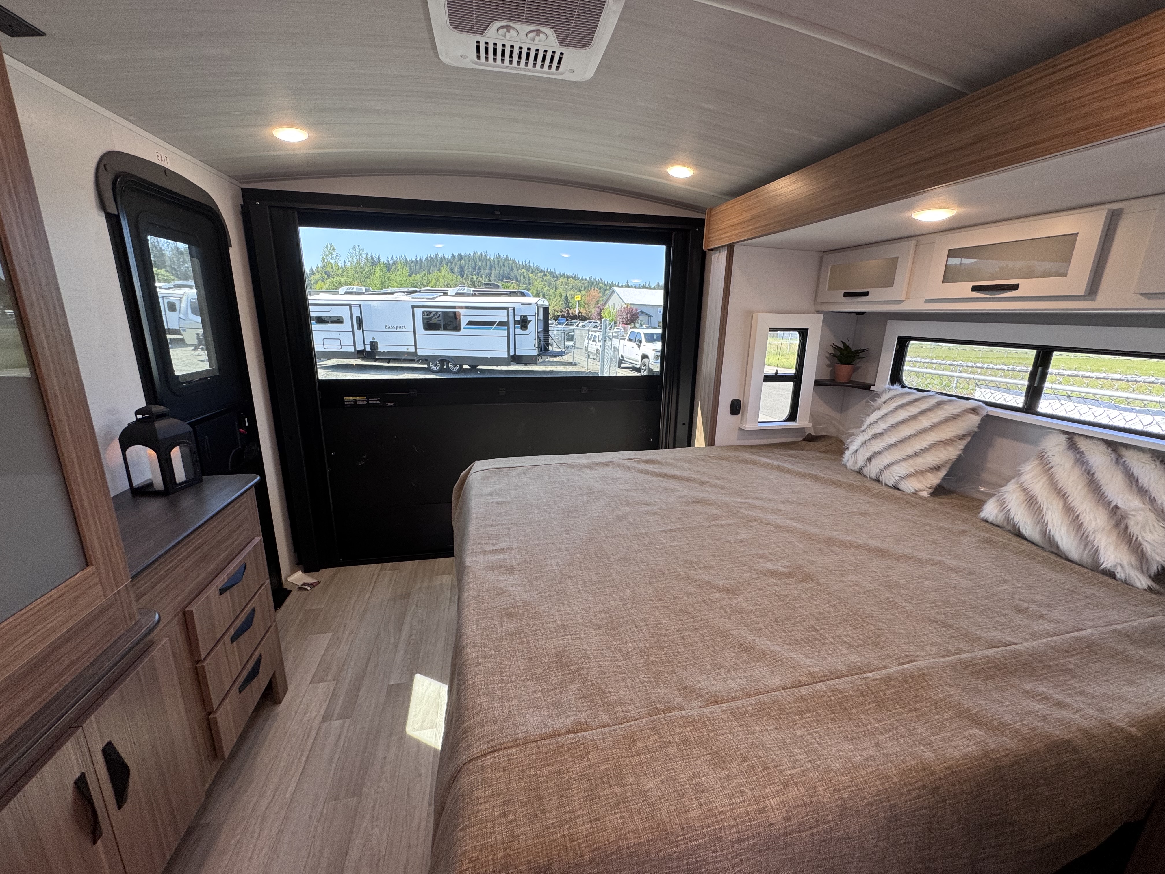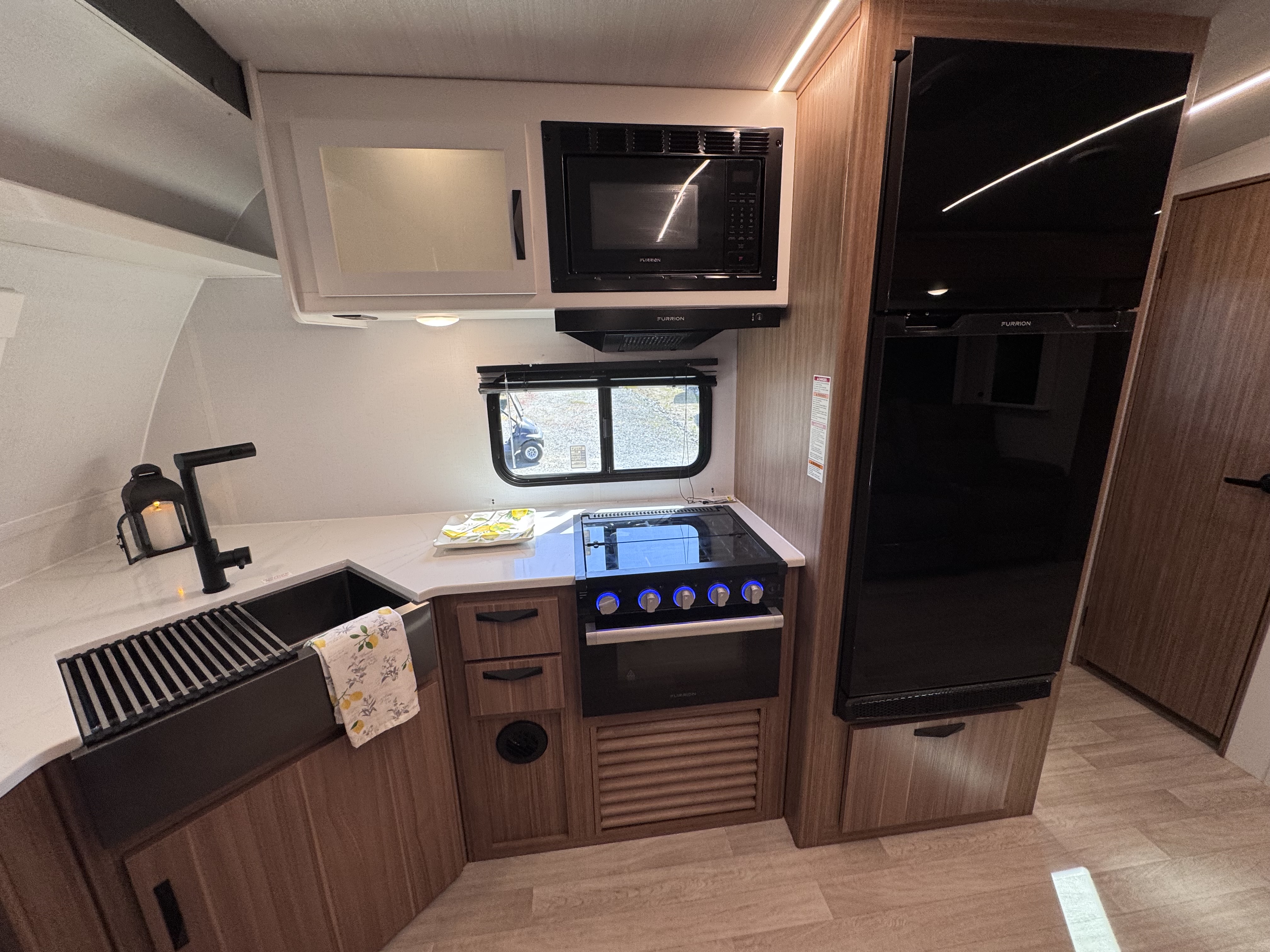 Passport delivers ultra-lightweight camping loaded with multi-functional features and best-in-class storage. Passport premium models features the brand's most spacious floorplans—including vaulted ceilings. A new front cap profile not only adds more interior room at the front of these models, it's molded from high-impact resin is lighter and three times more resilient -- even in cold temperatures. For 2024, Passport has warmed up their signature teak cabinetry with new light countertops, upholstery, and flooring. An accent wall featuring a gold geometric pattern, black appliances and bold origami-inspired door pulls punch up this exciting look.