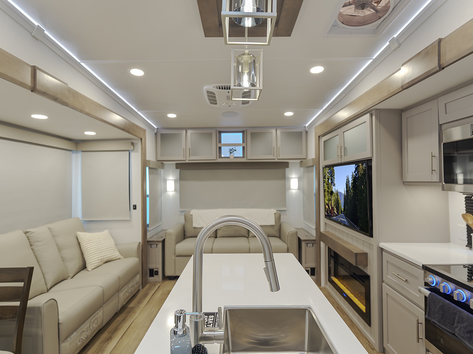 - Rear living area with dual recliner theater seating, ideal for relaxation and entertainment.