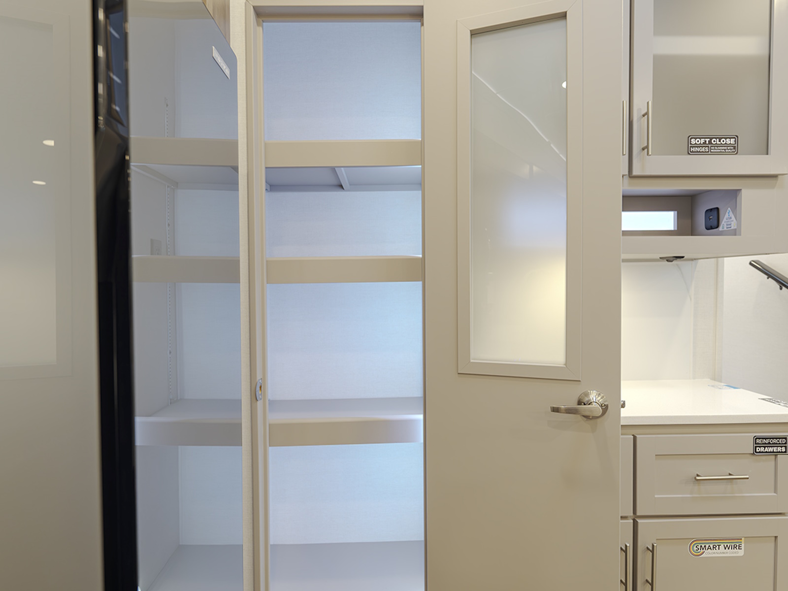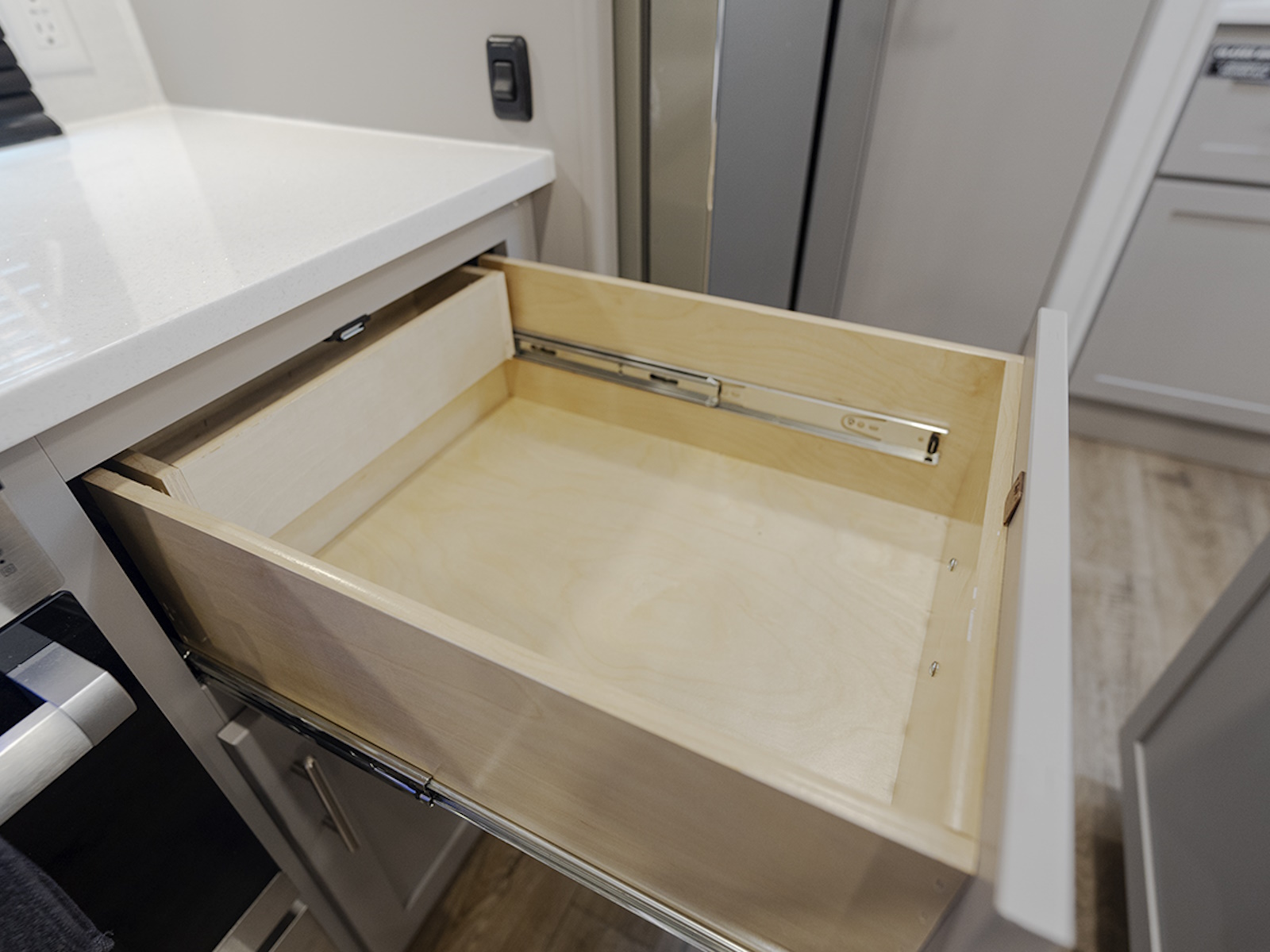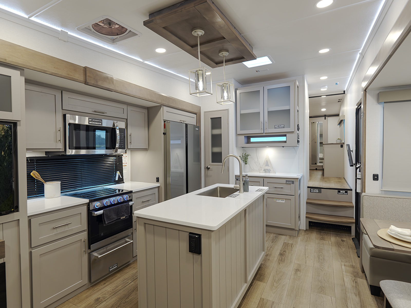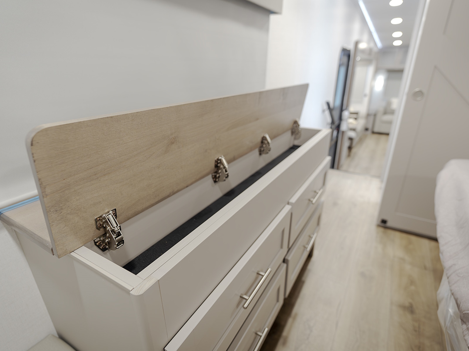 - The private front bedroom offers a queen bed slide (with optional king bed), dresser, and large wardrobe for all your clothing and gear. The wardrobe is prepped for a washer and dryer, making this RV perfect for longer stays or extended trips.