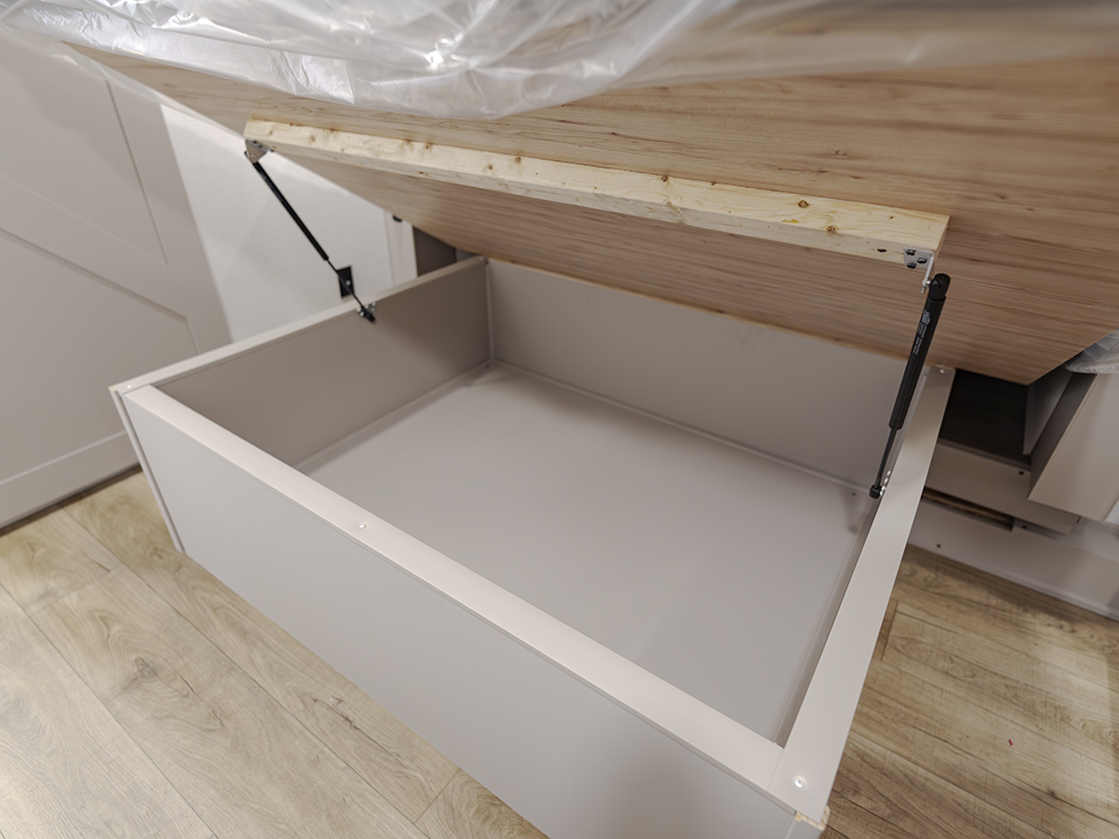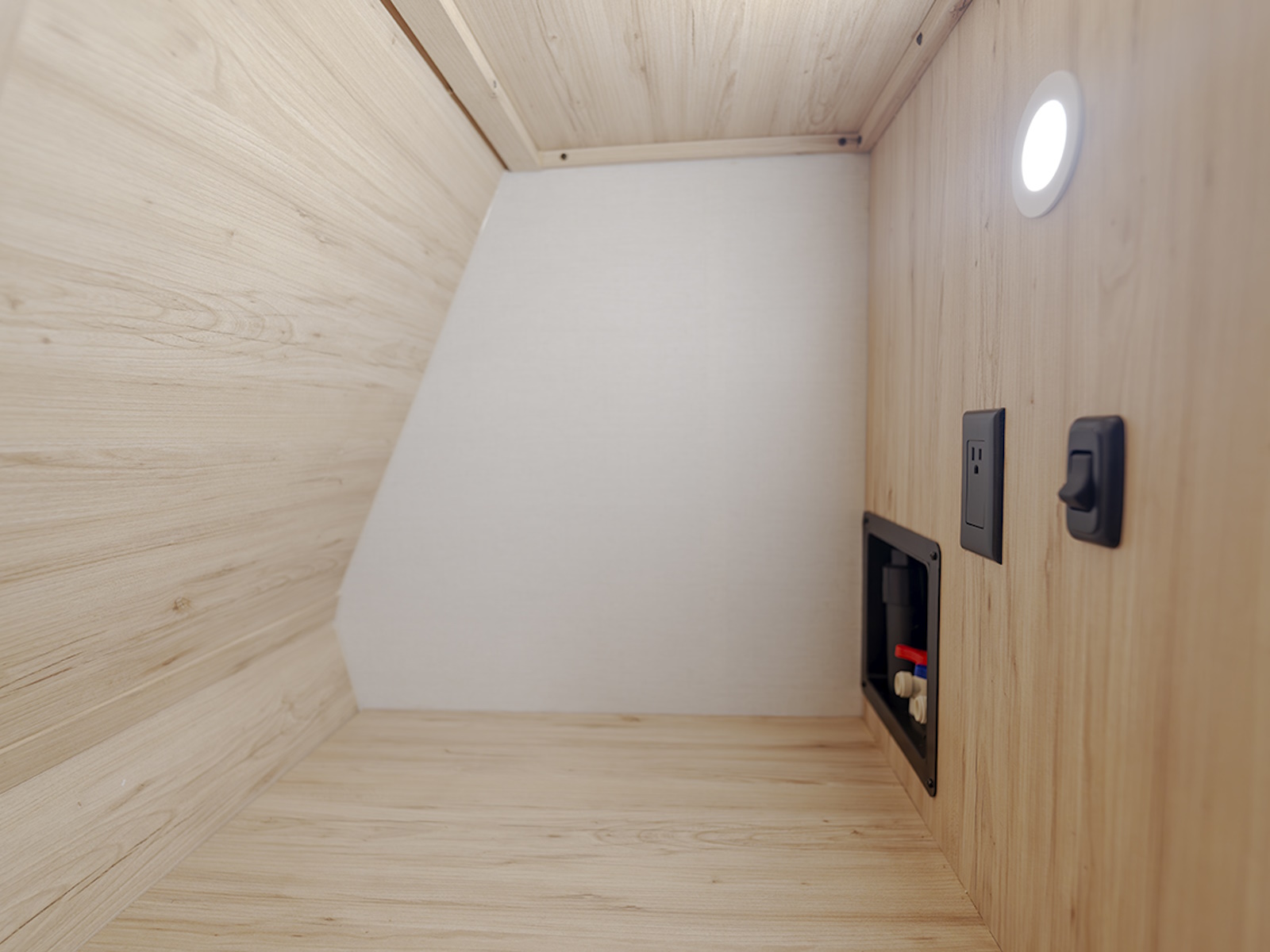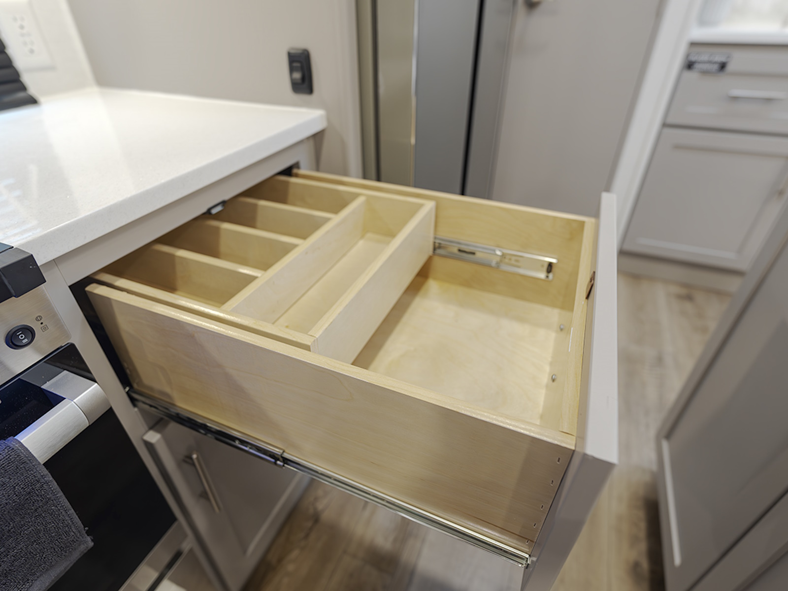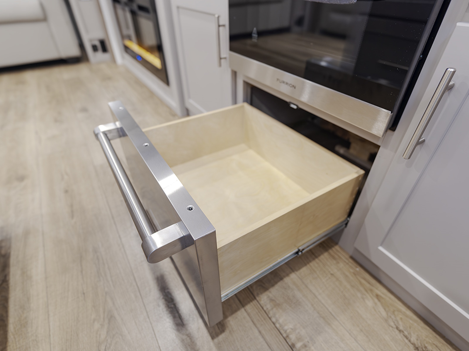 - The private front bedroom offers a queen bed slide (with optional king bed), dresser, and large wardrobe for all your clothing and gear. The wardrobe is prepped for a washer and dryer, making this RV perfect for longer stays or extended trips.