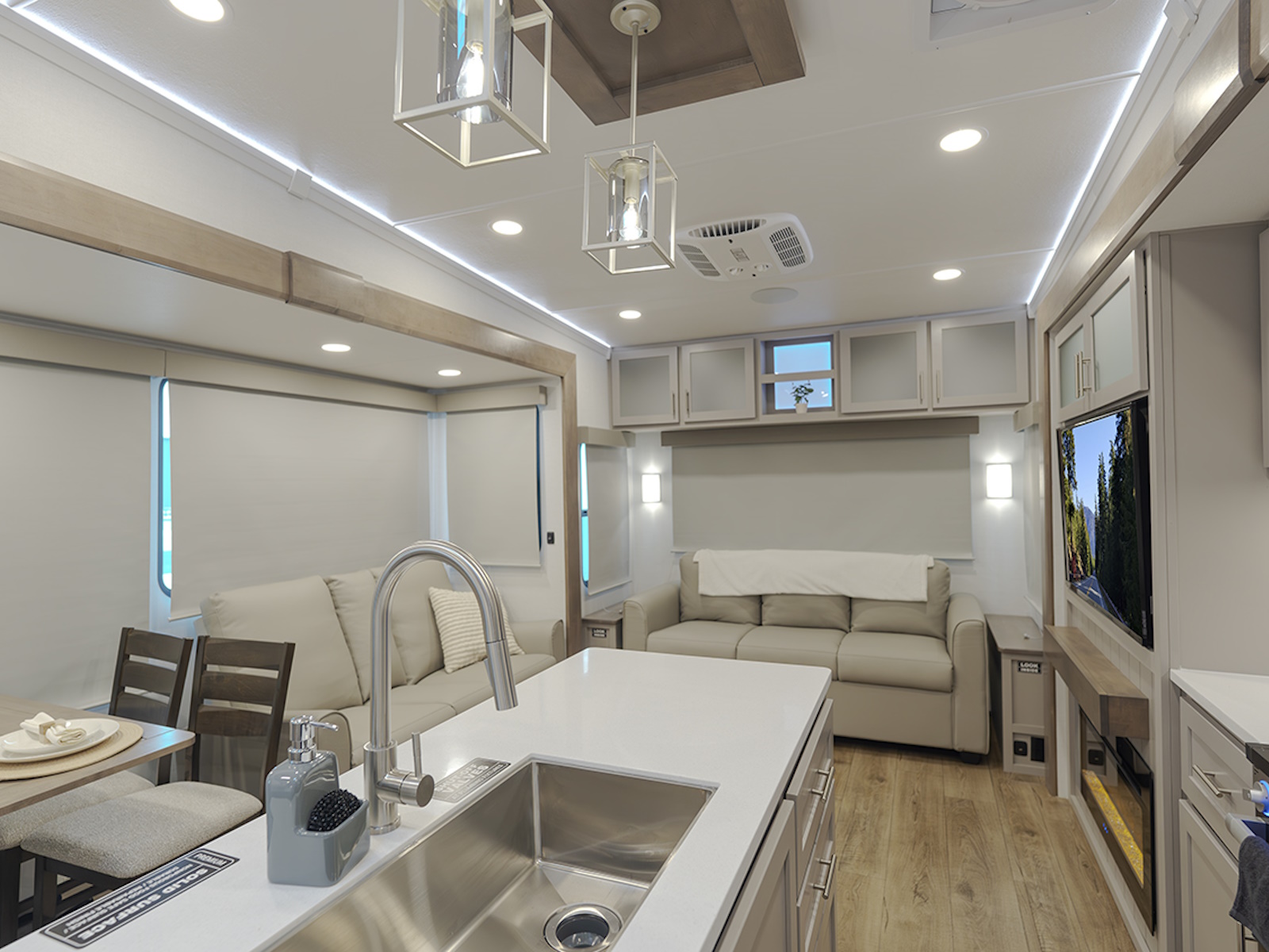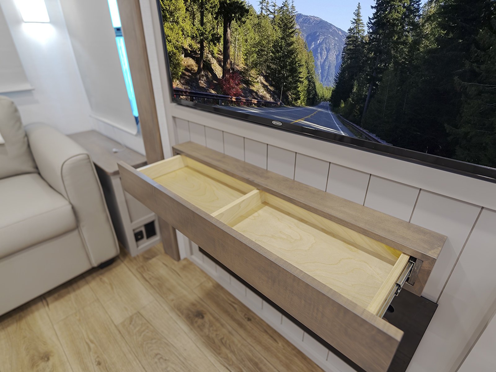 In the rear living area, enjoy the comfort of dual recliner theater seating across from the entertainment center, featuring a 50" HDTV on a swing mount, perfect for viewing from the rear sleeper sofa. Plus, hidden storage behind the TV ensures you can keep your living space tidy and organized.