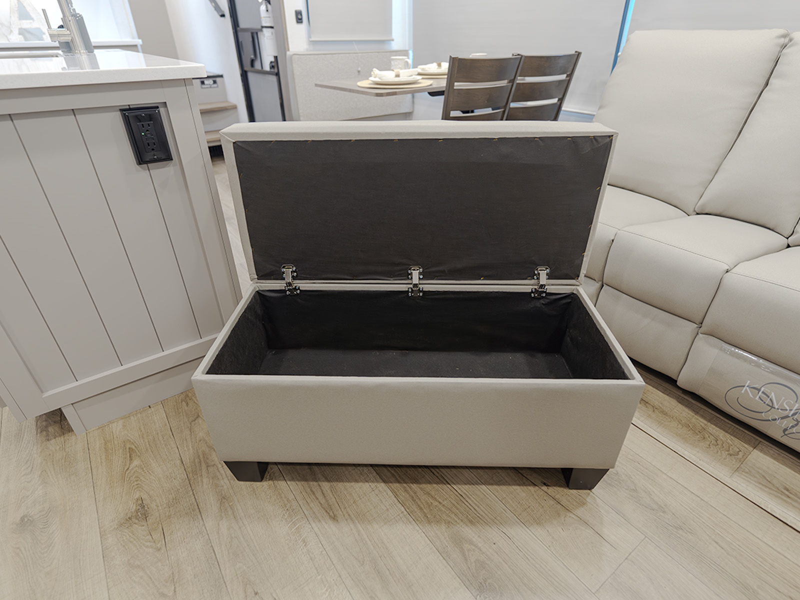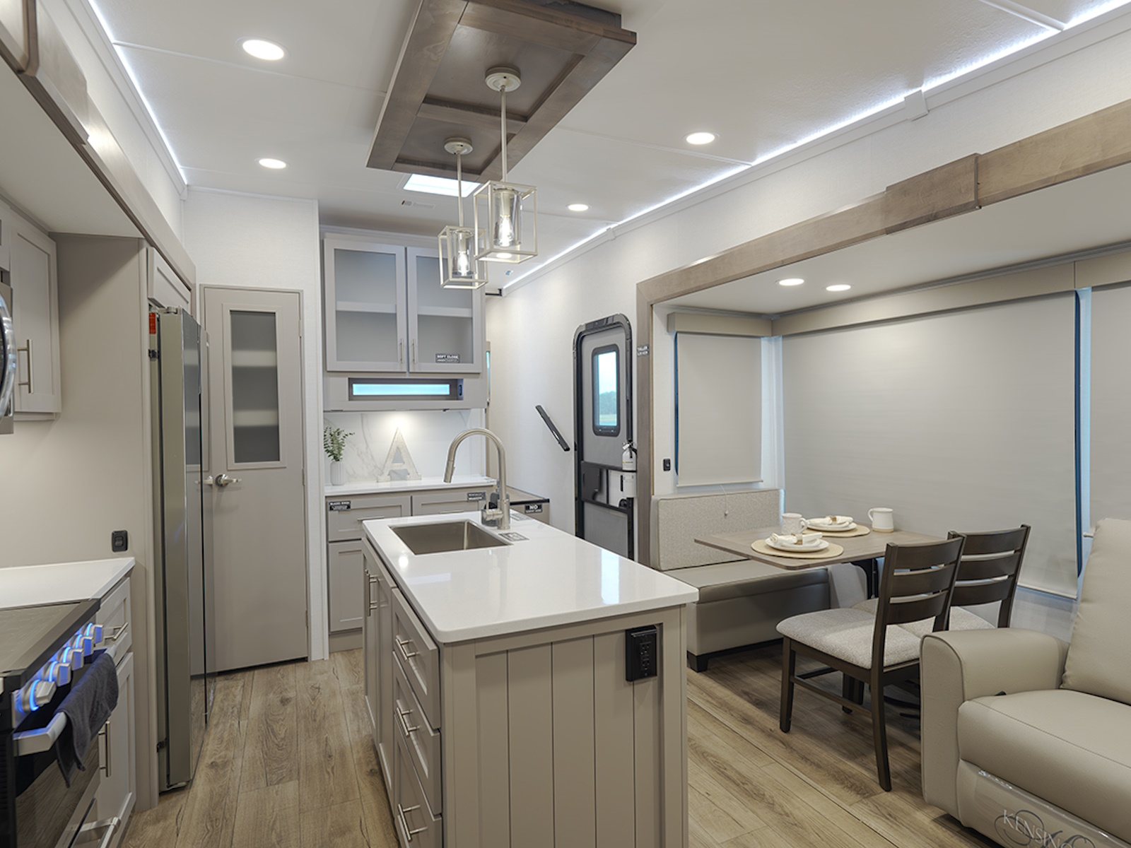 The Avenue 32RLS fifth wheel is designed for ultimate comfort and convenience. Featuring a kitchen island with ample counter space, meal prep is a breeze in this fully equipped kitchen. The floating dinette table is paired with two chairs on one side and a movable ottoman with hidden storage on the other, perfect for storing games or extra tablecloths. Enjoy additional storage in the hutch/pantry and a second pantry for snacks and essentials.