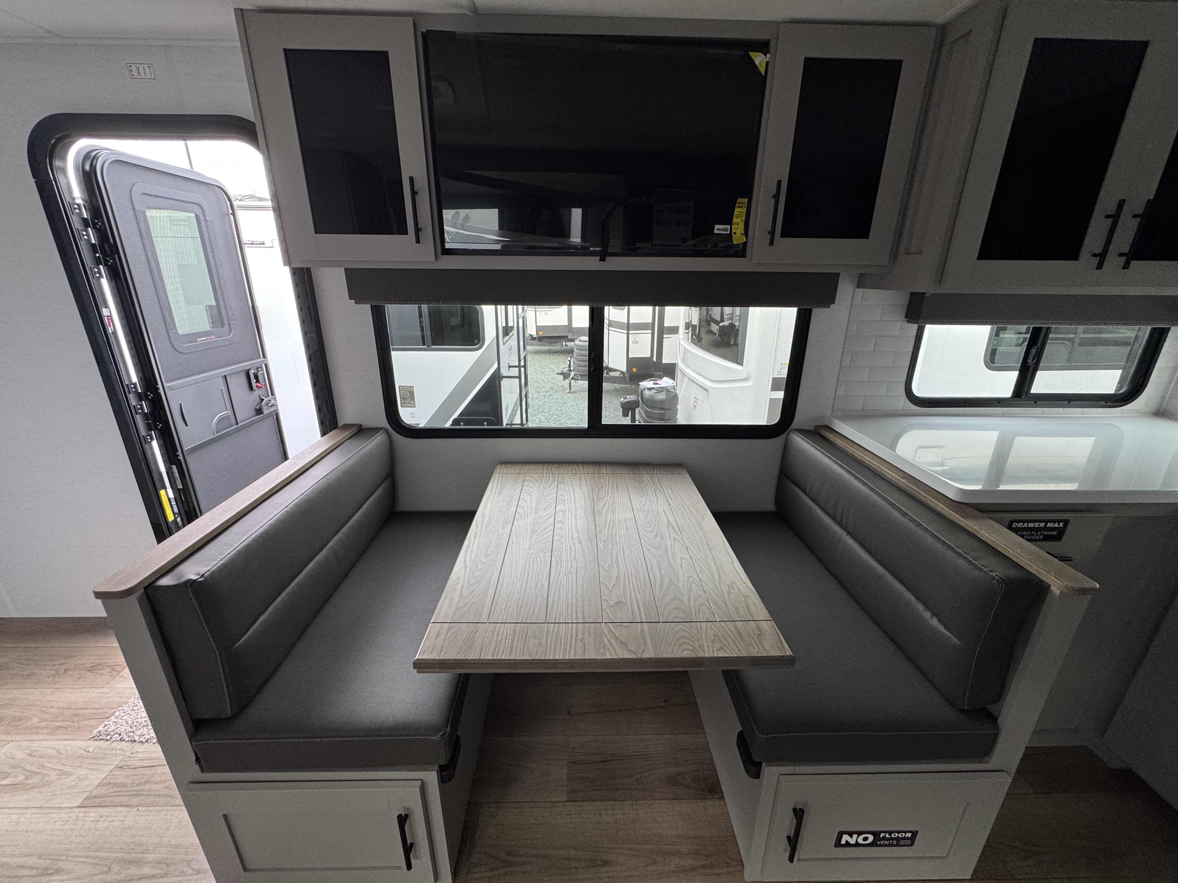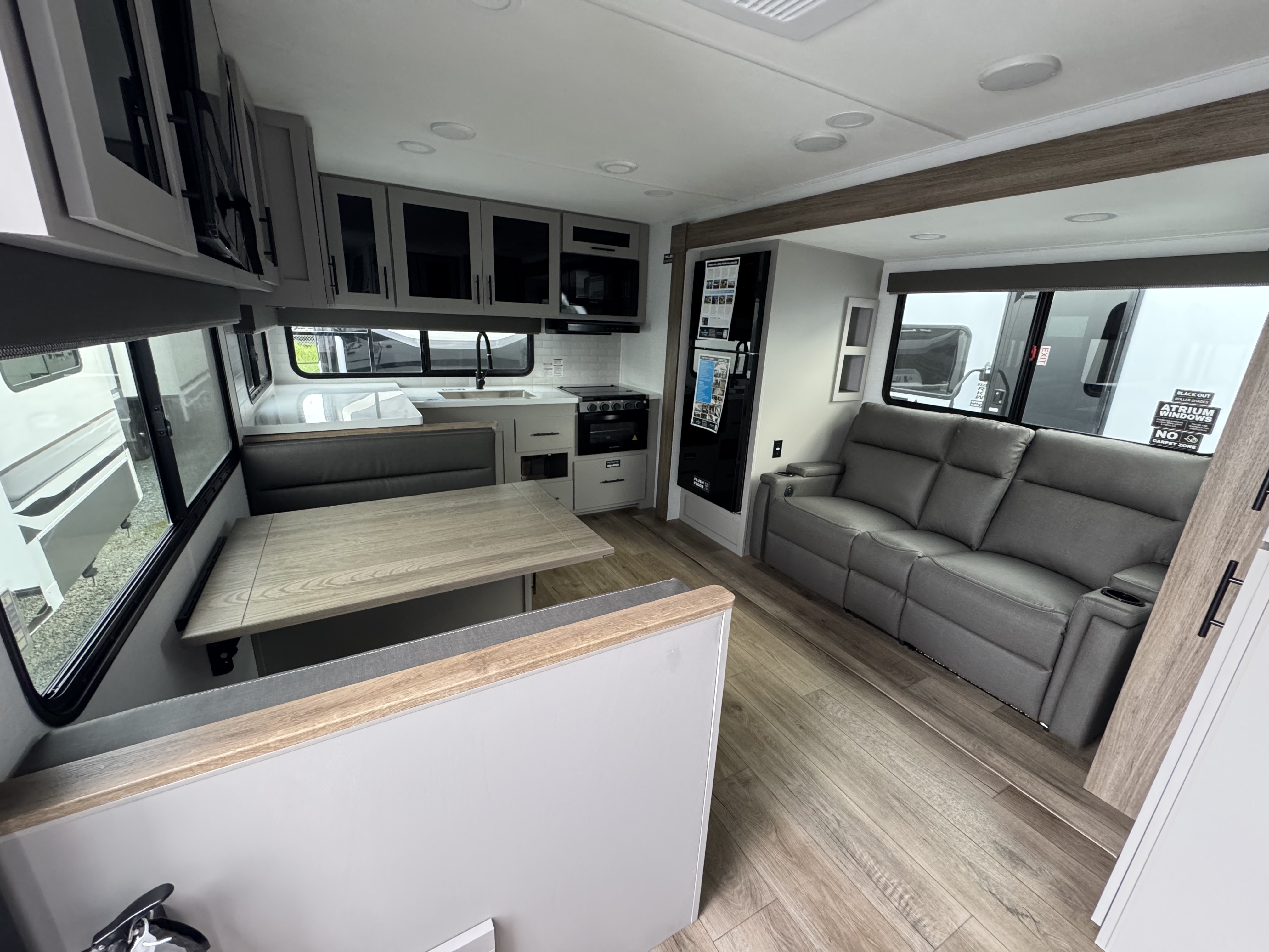 - Spacious Living Area – Comfortable theater seating and a dinette with an optional table & chairs for ultimate flexibility.