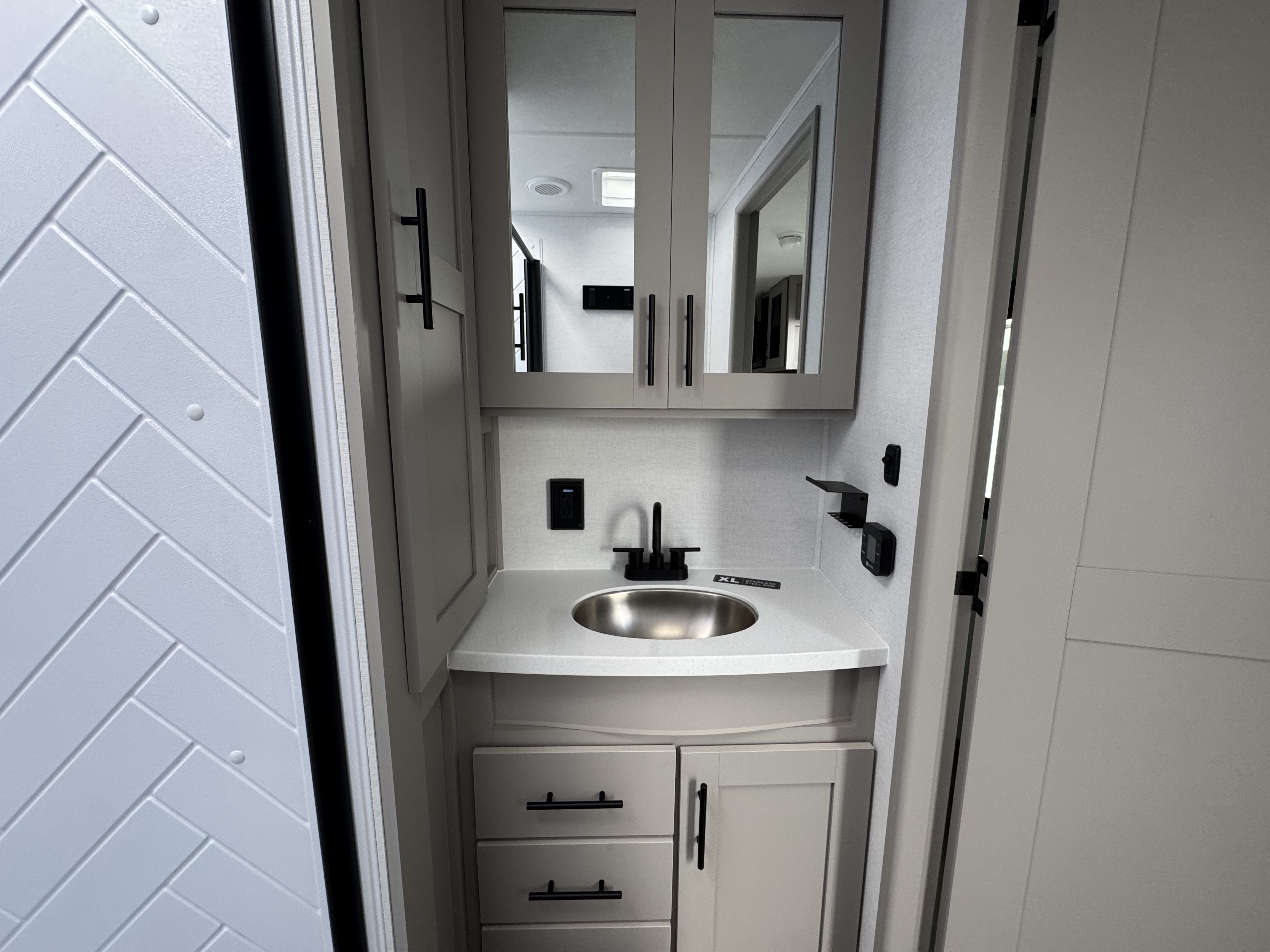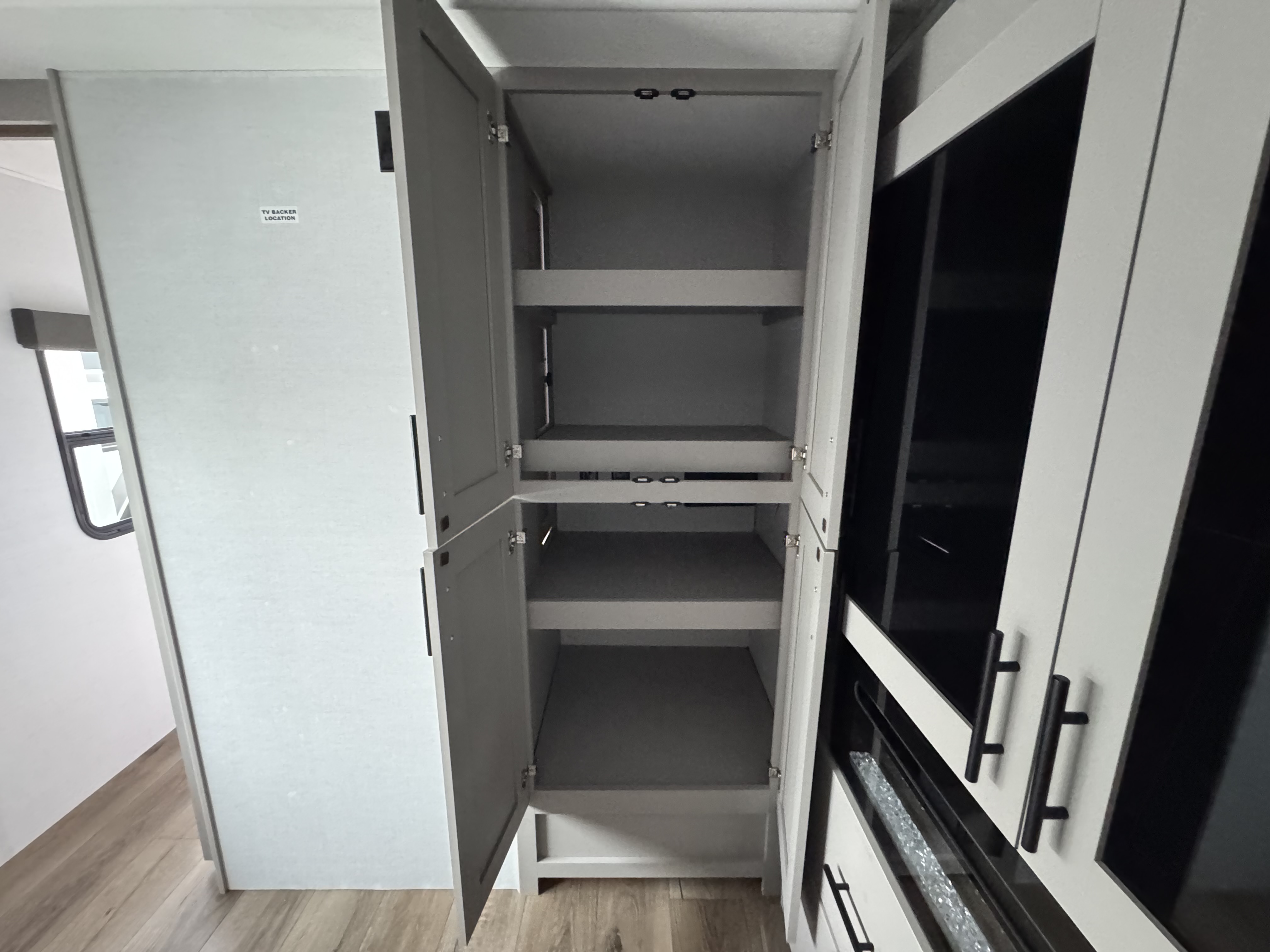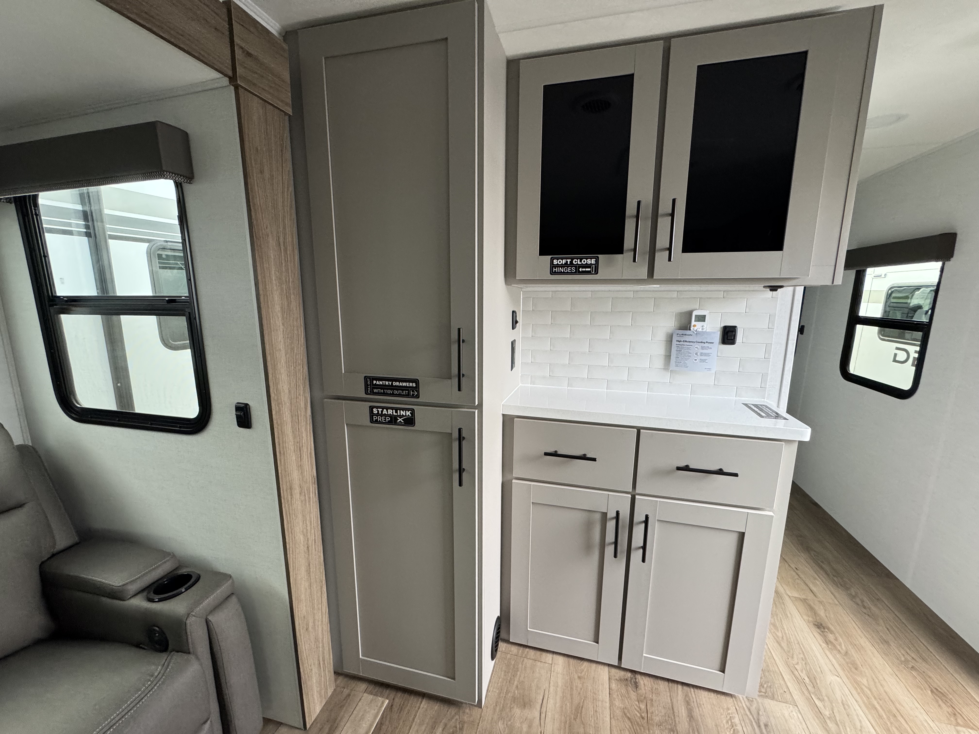 - Rear Kitchen Layout – Expansive counter space, a 10 cu. ft. 12-volt refrigerator, and a pull-out pantry for all your cooking essentials.