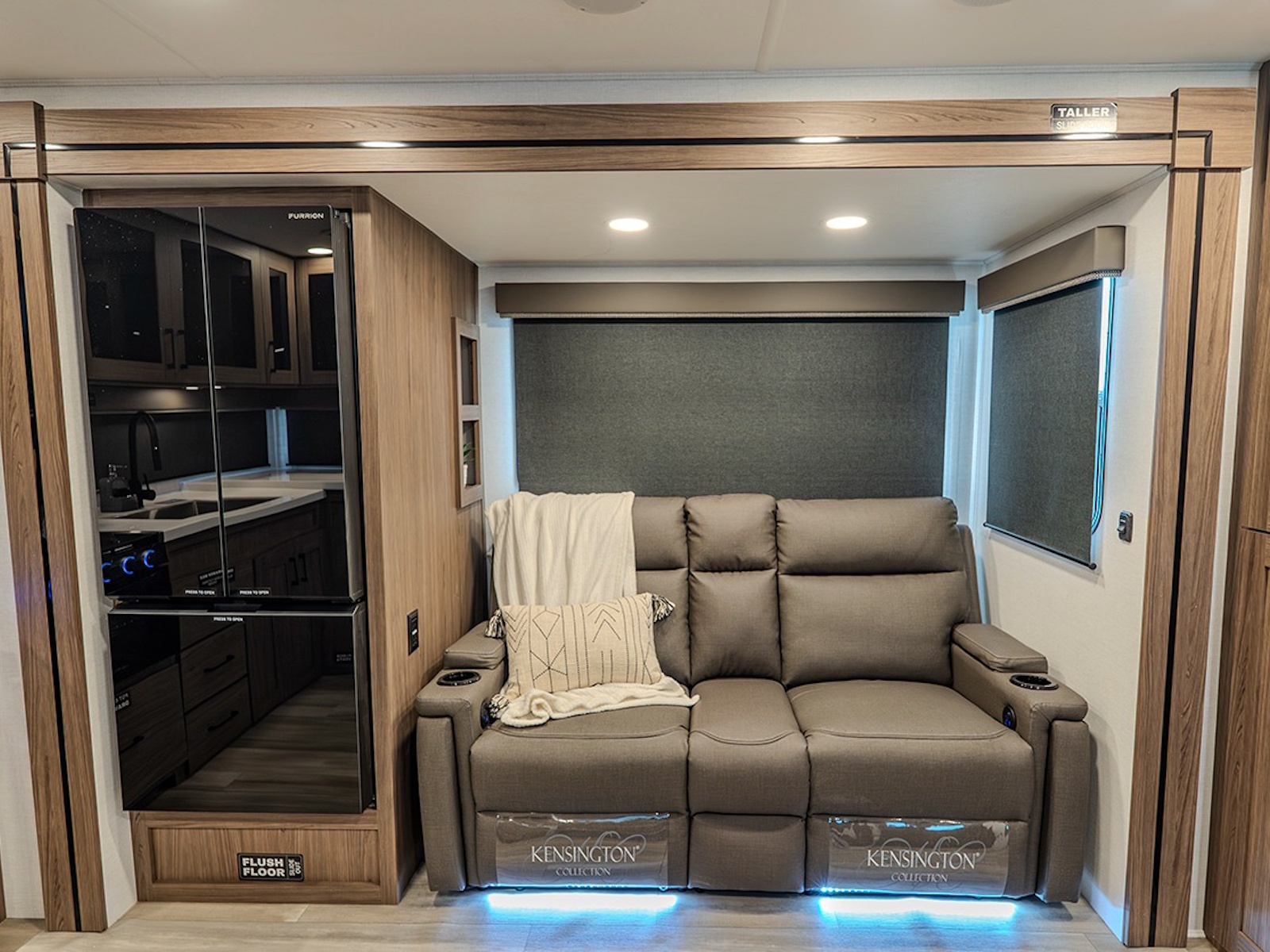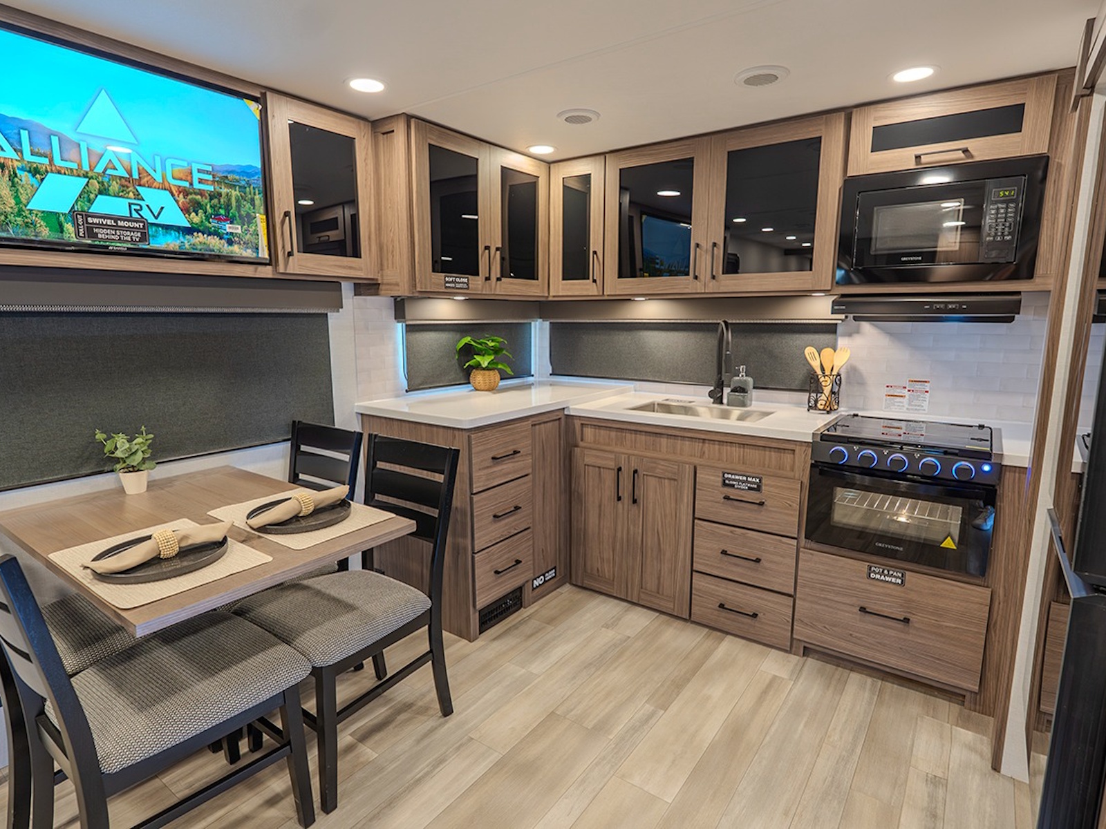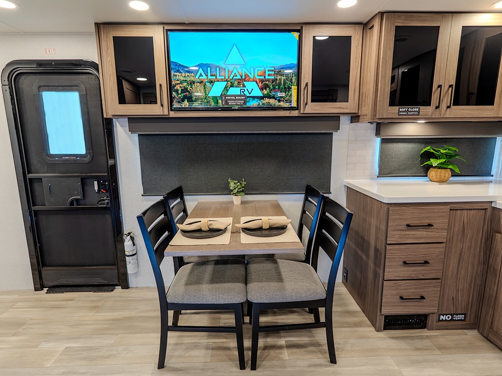 - Spacious Living Area – Comfortable theater seating and a dinette with an optional table & chairs for ultimate flexibility.