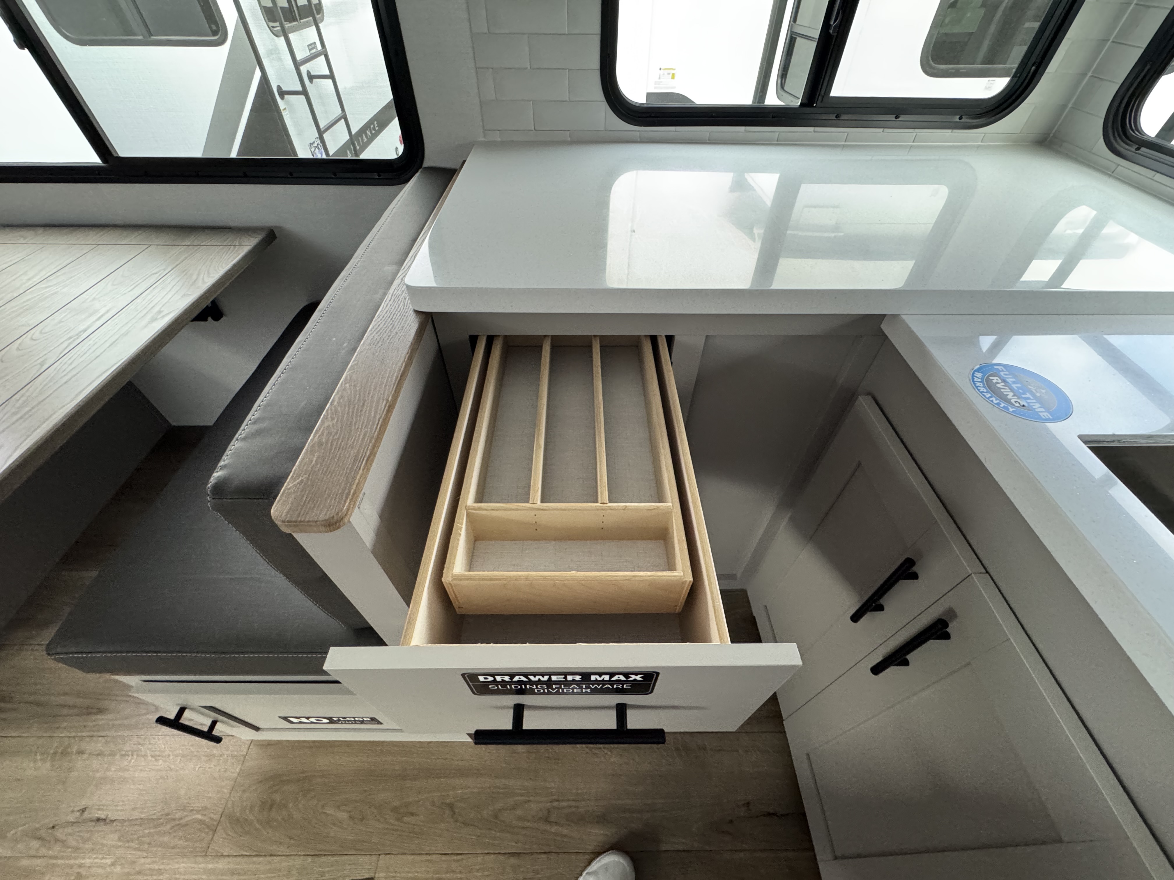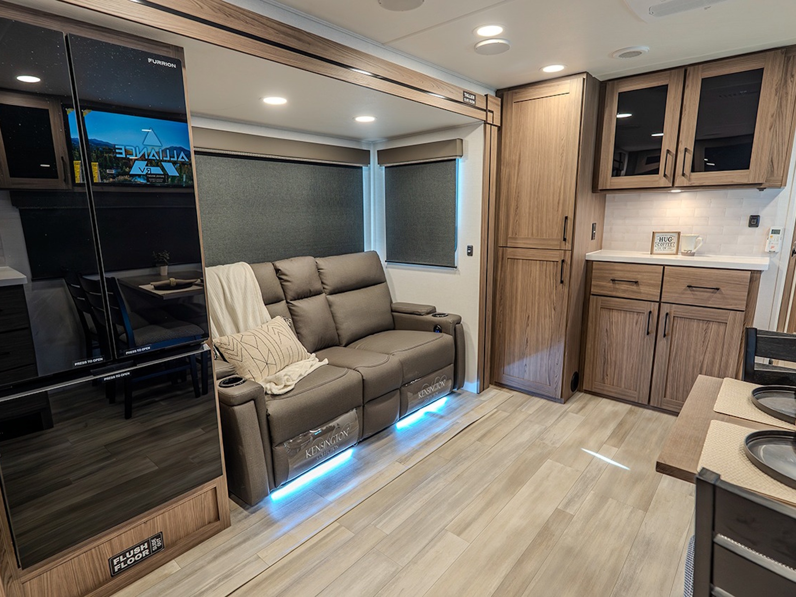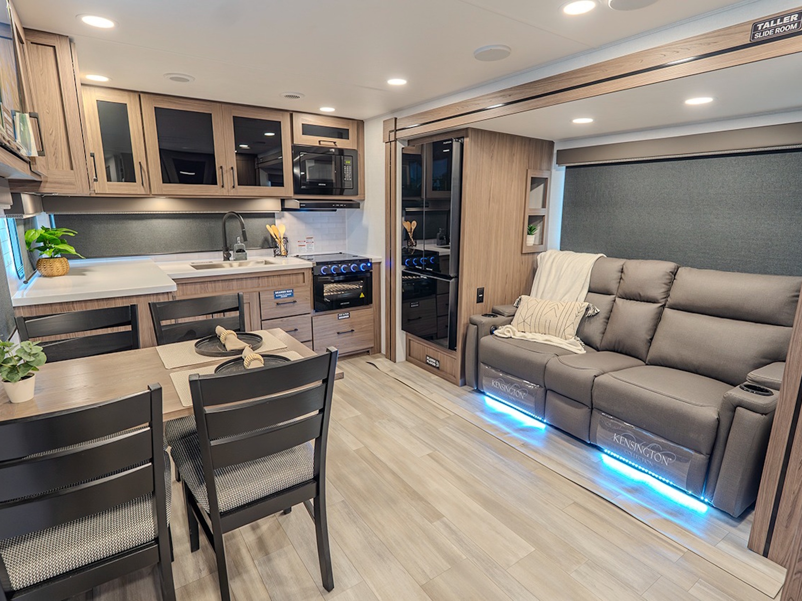 - Spacious Living Area – Comfortable theater seating and a dinette with an optional table & chairs for ultimate flexibility.