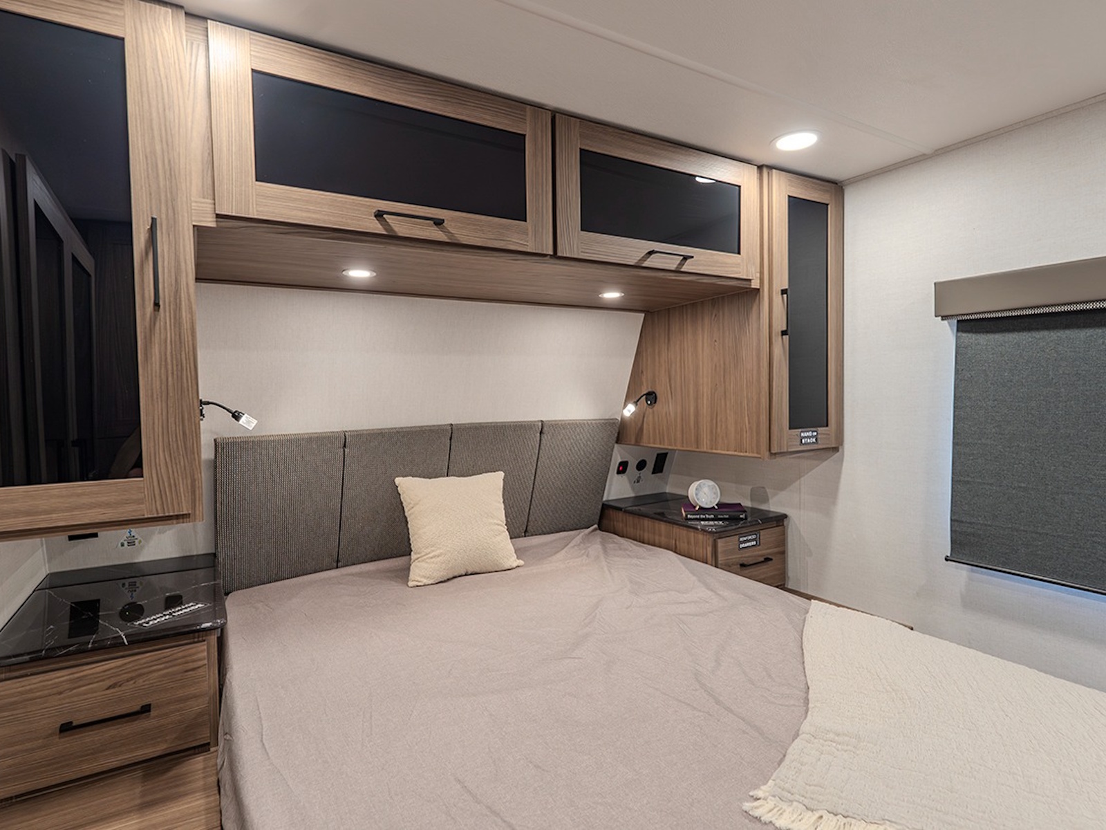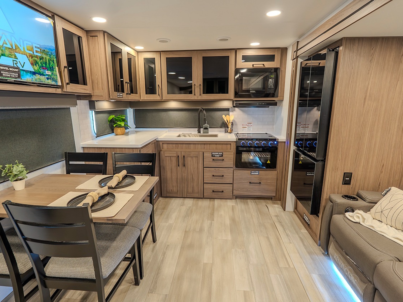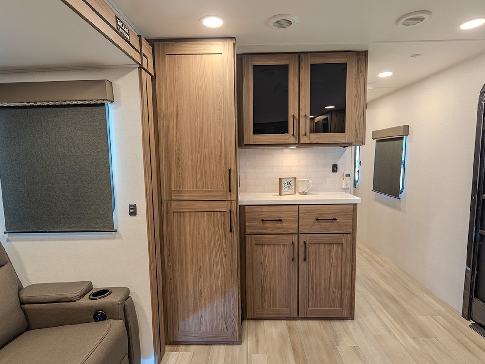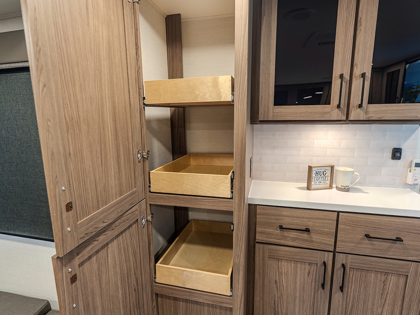 - Rear Kitchen Layout – Expansive counter space, a 10 cu. ft. 12-volt refrigerator, and a pull-out pantry for all your cooking essentials.