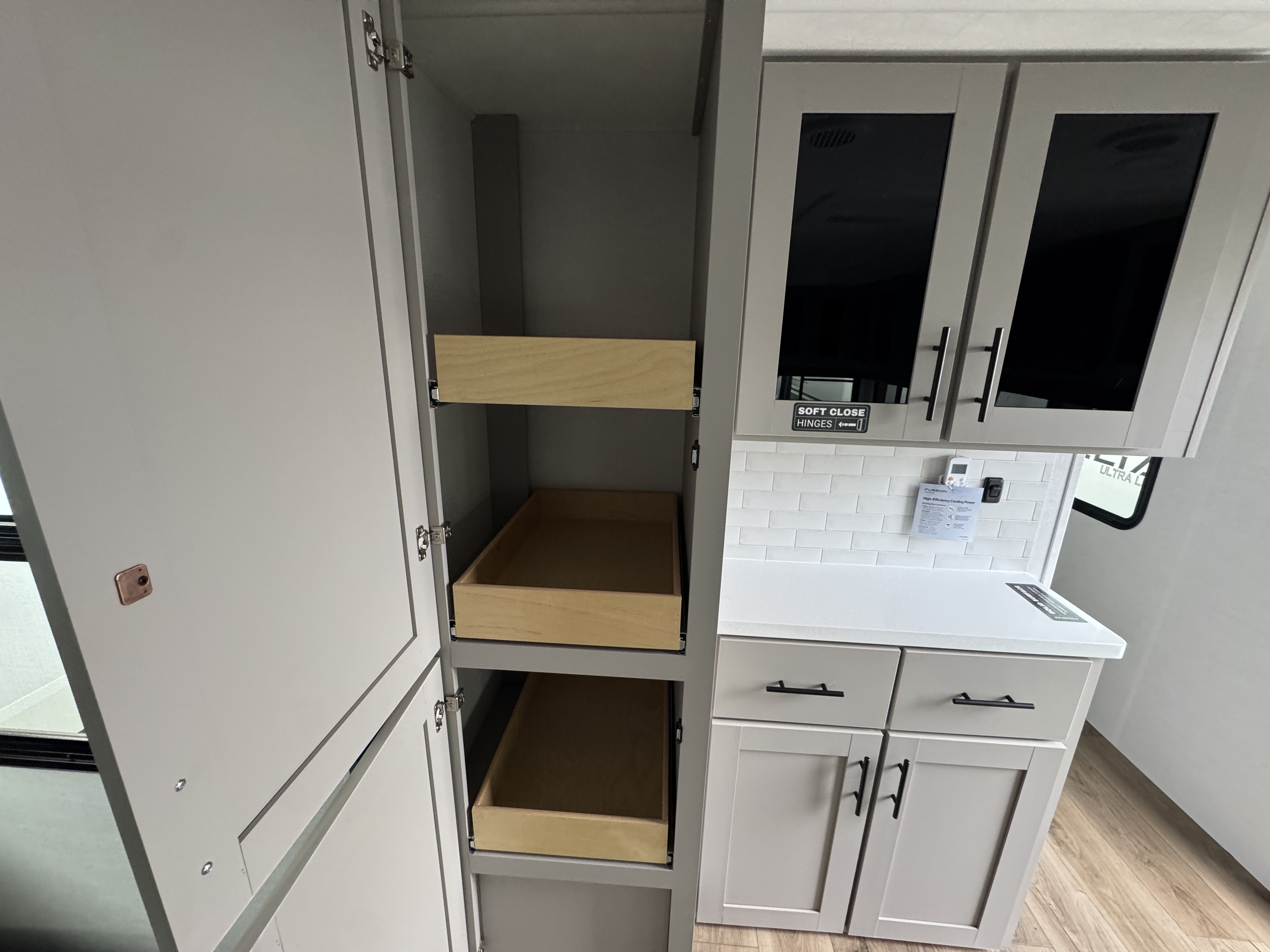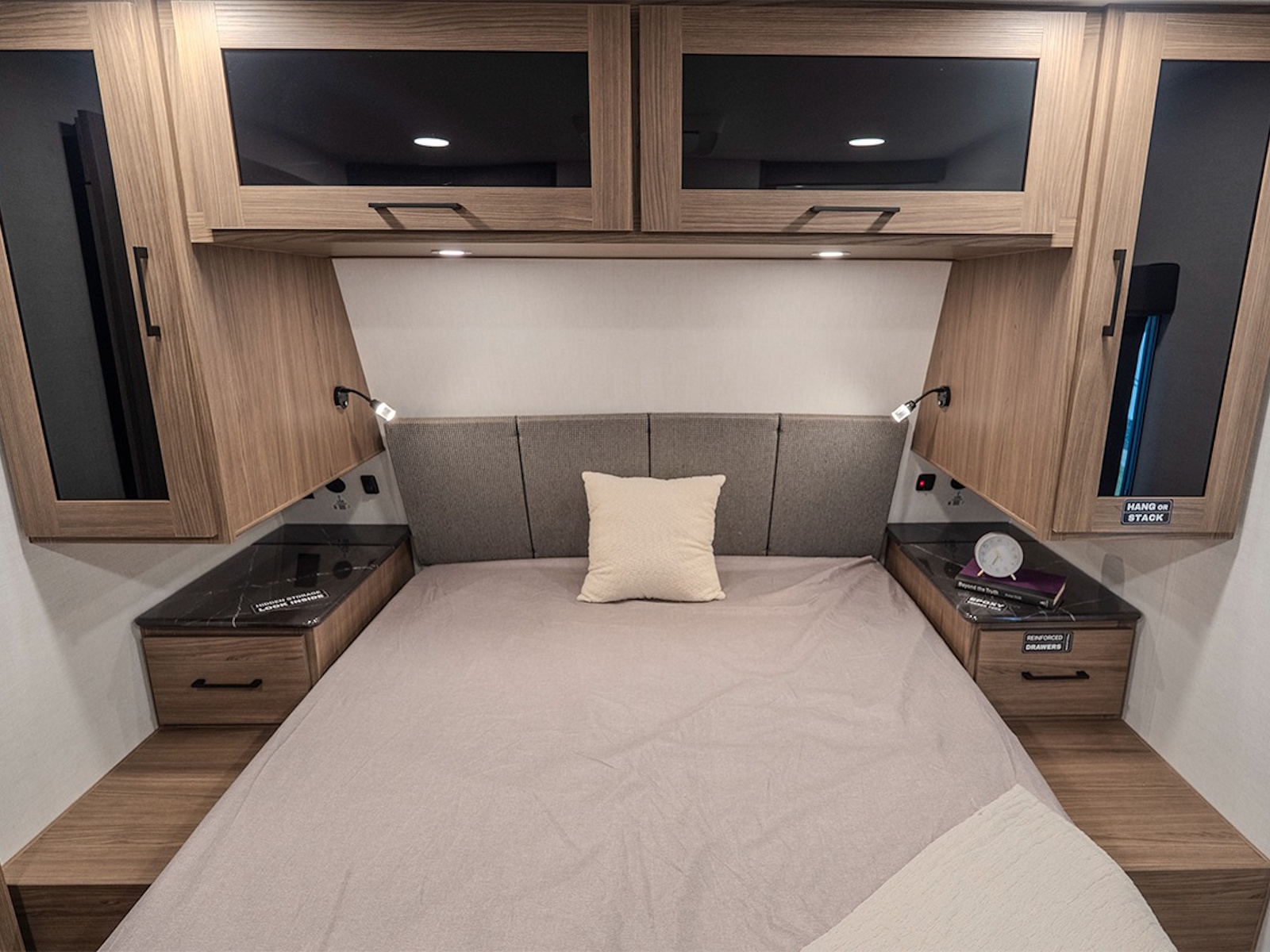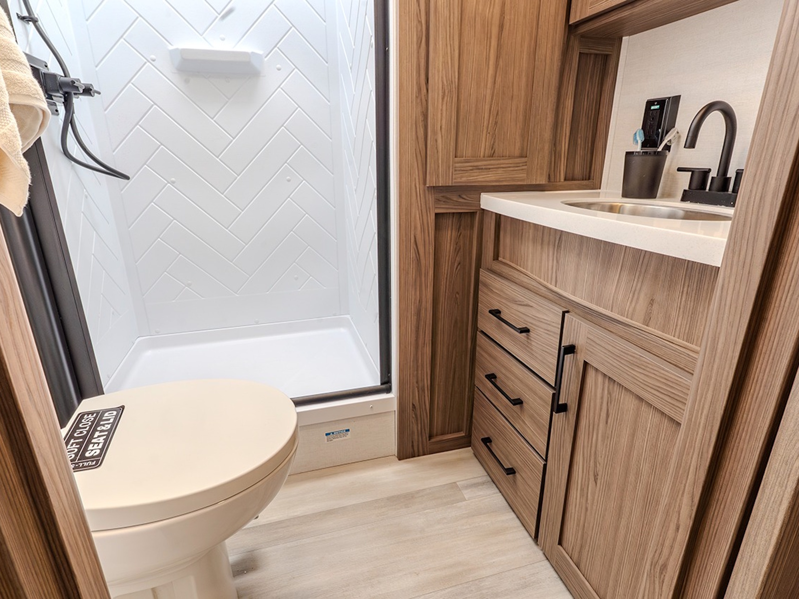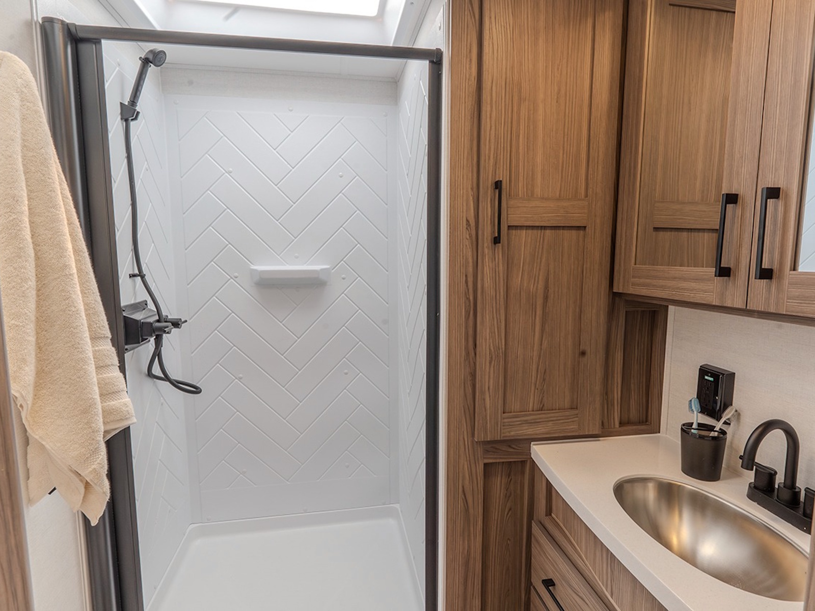 - Rear Kitchen Layout – Expansive counter space, a 10 cu. ft. 12-volt refrigerator, and a pull-out pantry for all your cooking essentials.