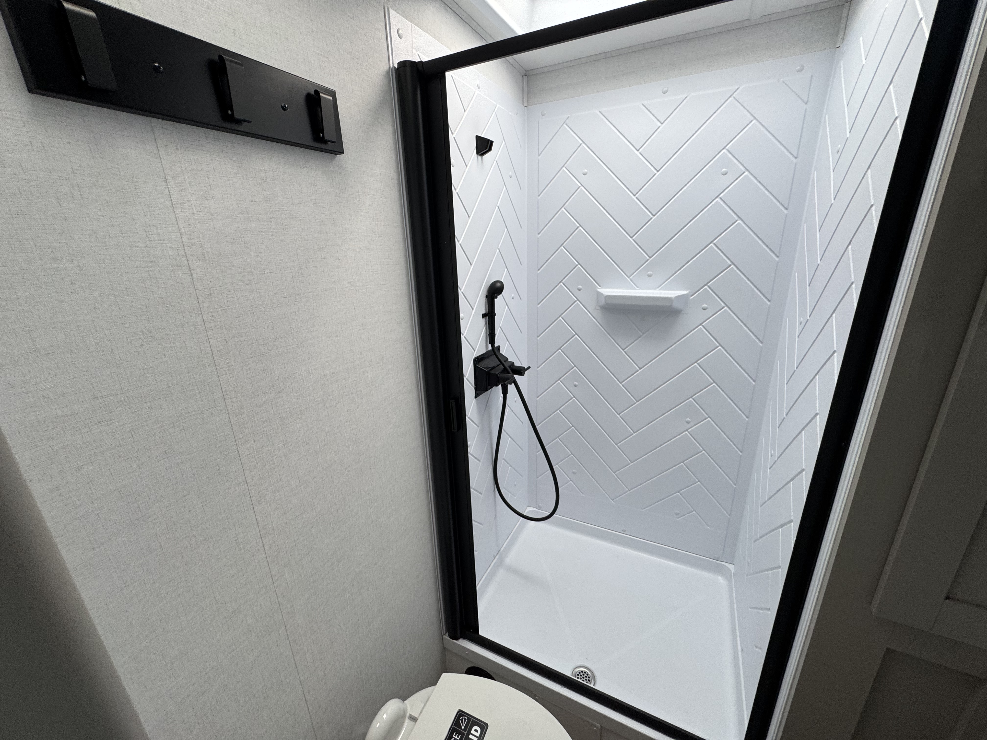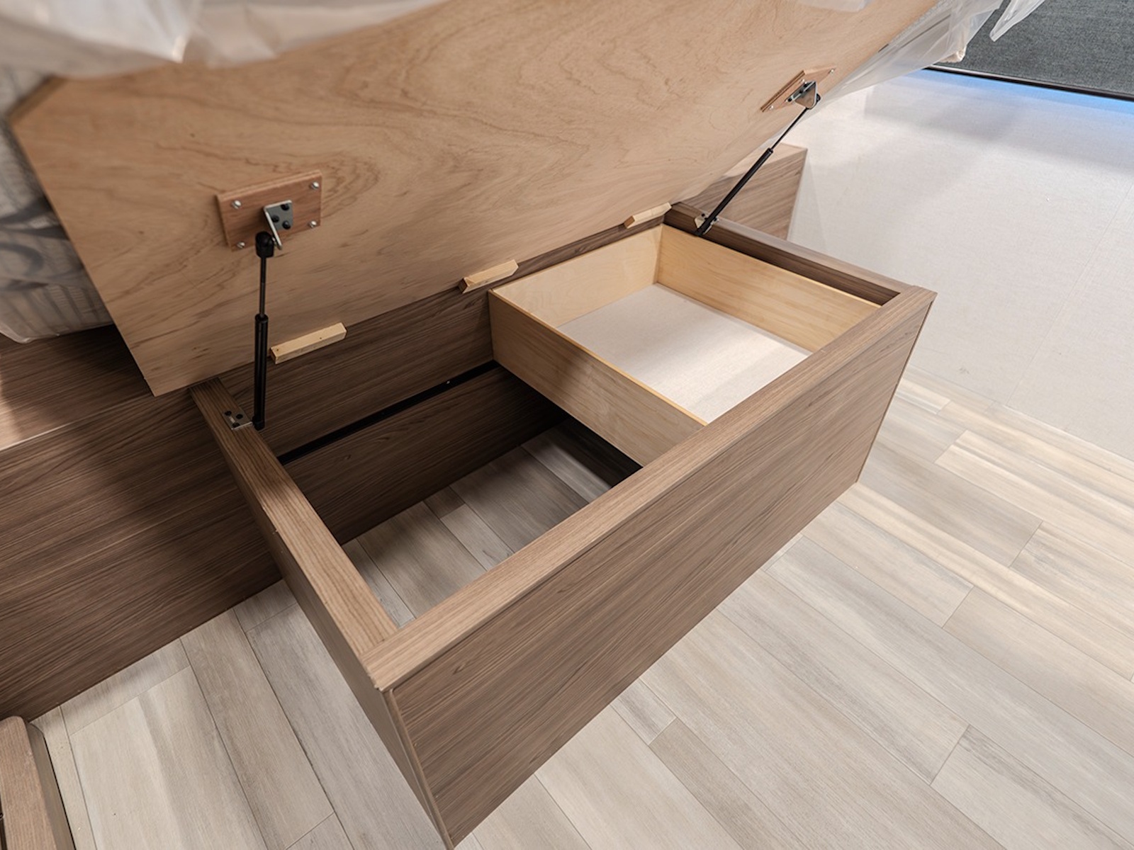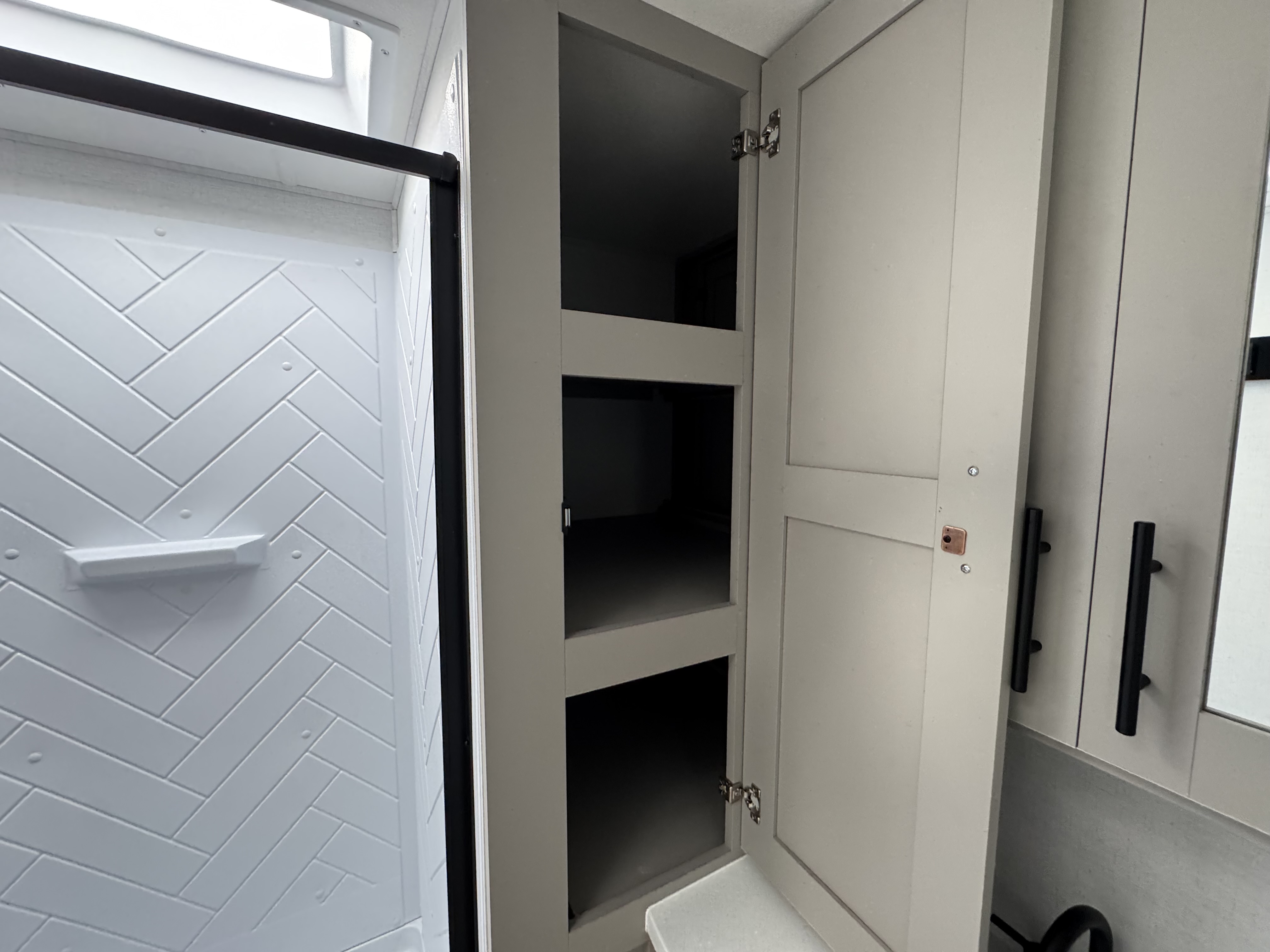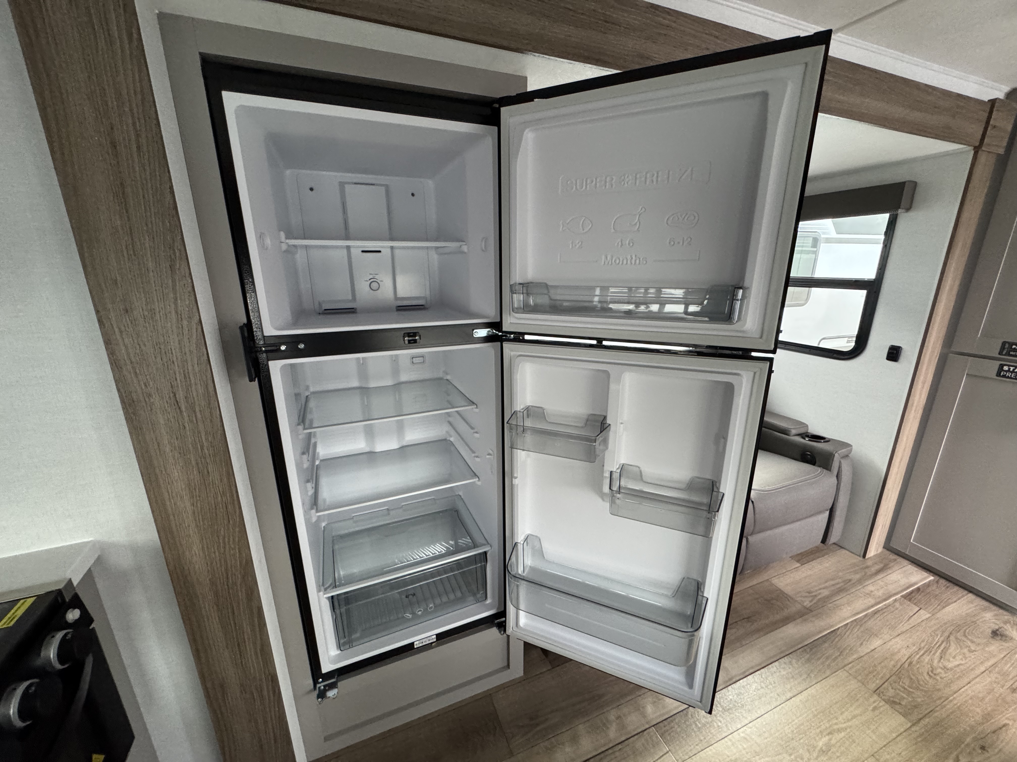- Rear Kitchen Layout – Expansive counter space, a 10 cu. ft. 12-volt refrigerator, and a pull-out pantry for all your cooking essentials.
