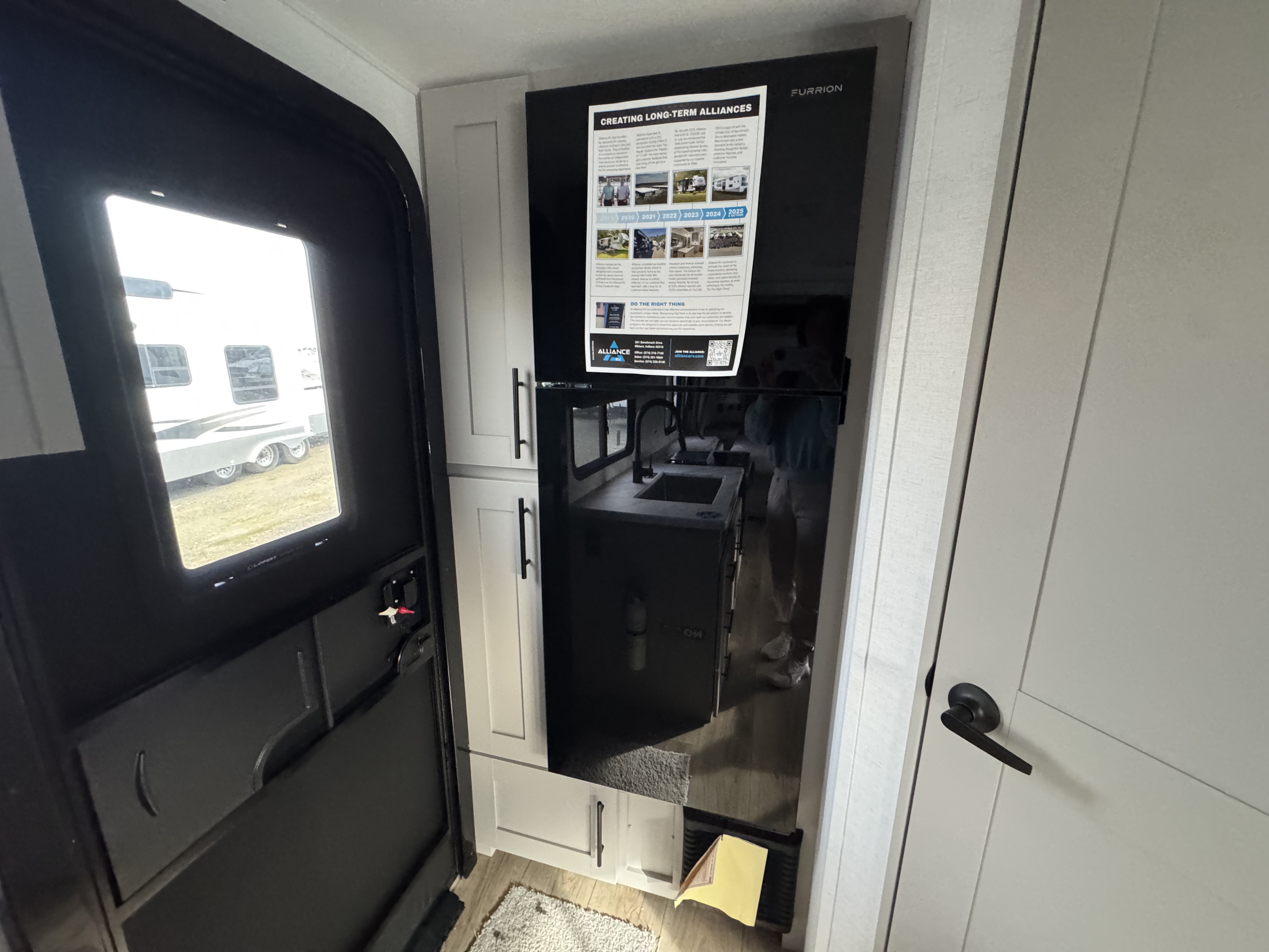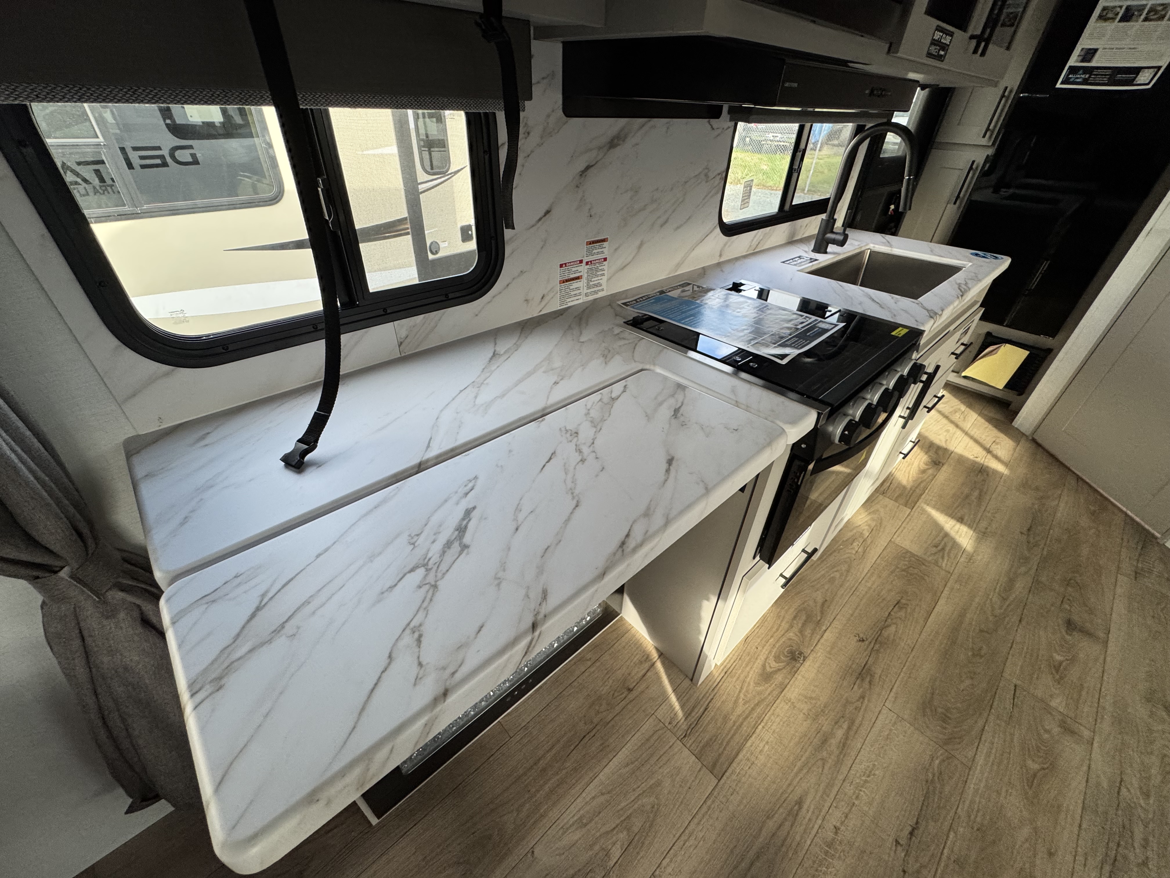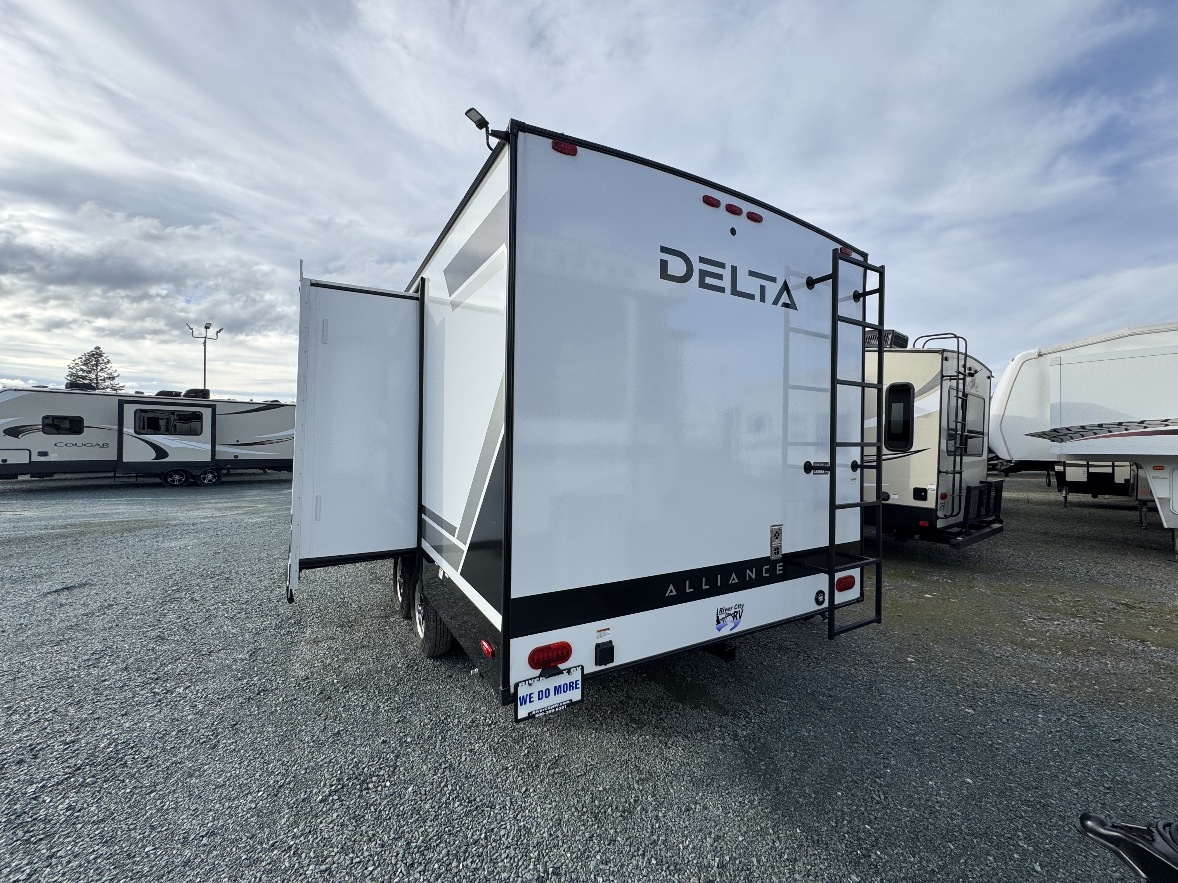 The Alliance RV Delta Ultra Lite travel trailer BH241 is a couple's trailer perfect for weekend trips. It includes a theater seat slide, fireplace, three burner cooktop, and front queen bed. The full bath has a toilet, sink, 32" shower, and linen closet. Storage with dual wardrobes, nightstands, and overhead storage. The Delta Ultra Lite BH241 is a family-friendly travel trailer designed for comfort and lightweight convenience. It is 29 feet 5 inches long and weighs 5,800 pounds, perfect for family adventures.19-foot awning, booth dinette, ample storage, bedroom, and rear bunkhouse. The exterior features of the Delta Ultra Lite travel trailer include oversized atrium windows, a carpet-free interior, magnet catches on cabinets, soft close cabinet doors, LED lighting, temperature-controlled spray ports, exterior awning controls, a 2" rear accessory hitch, and Goodyear Endurance tires.