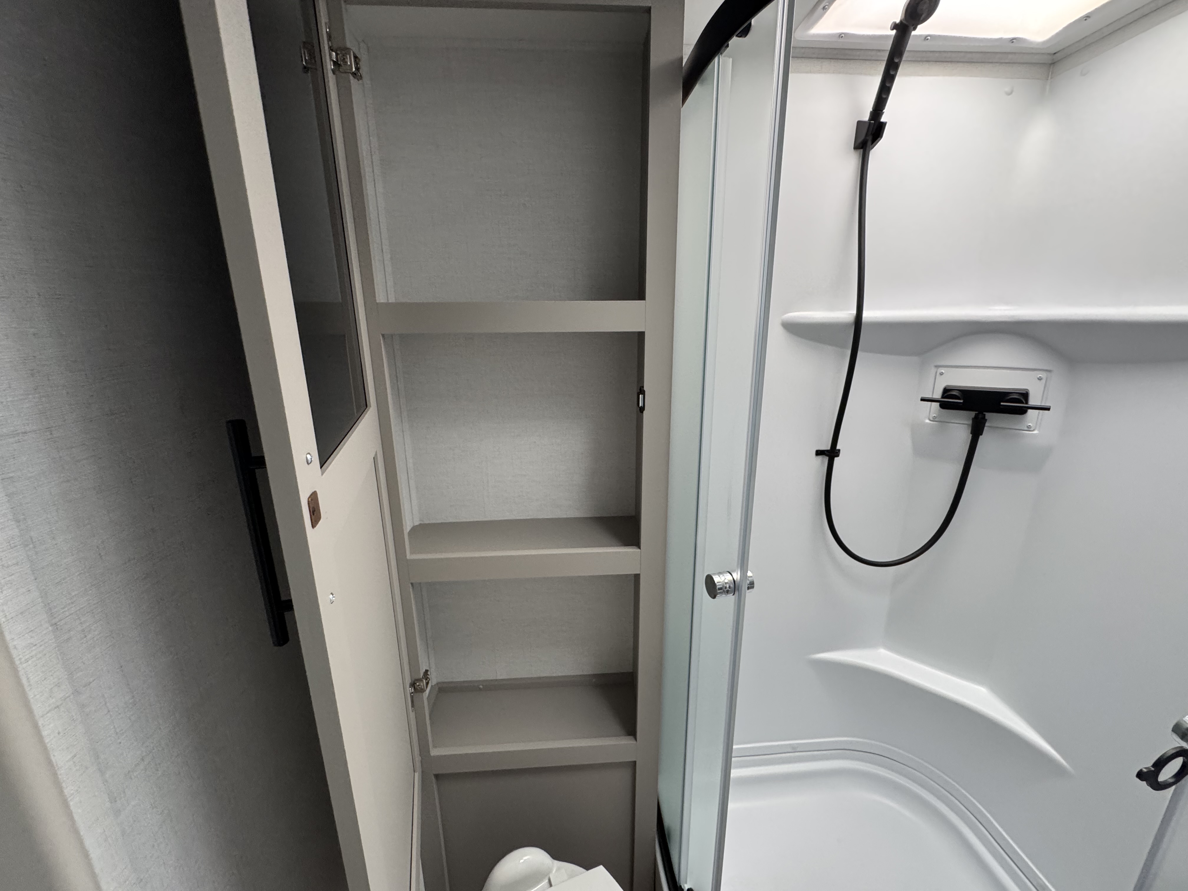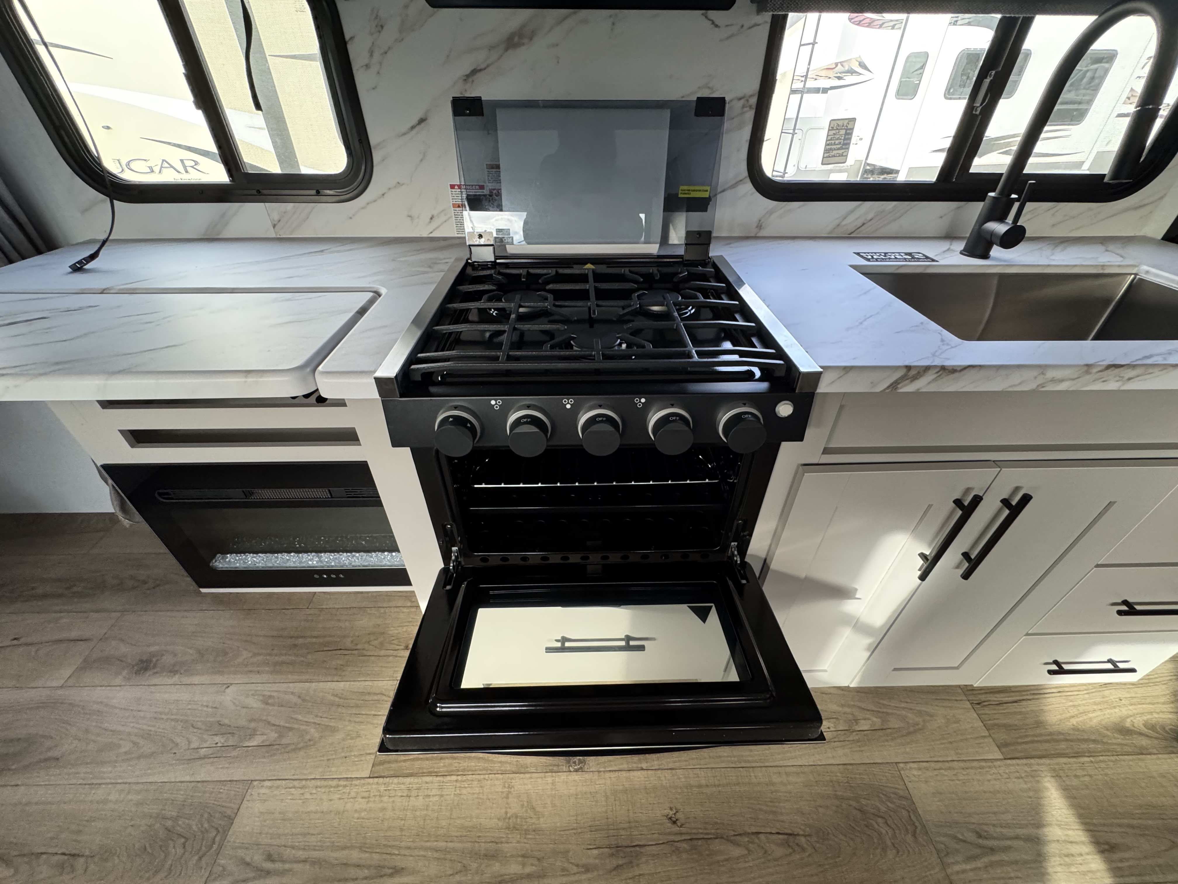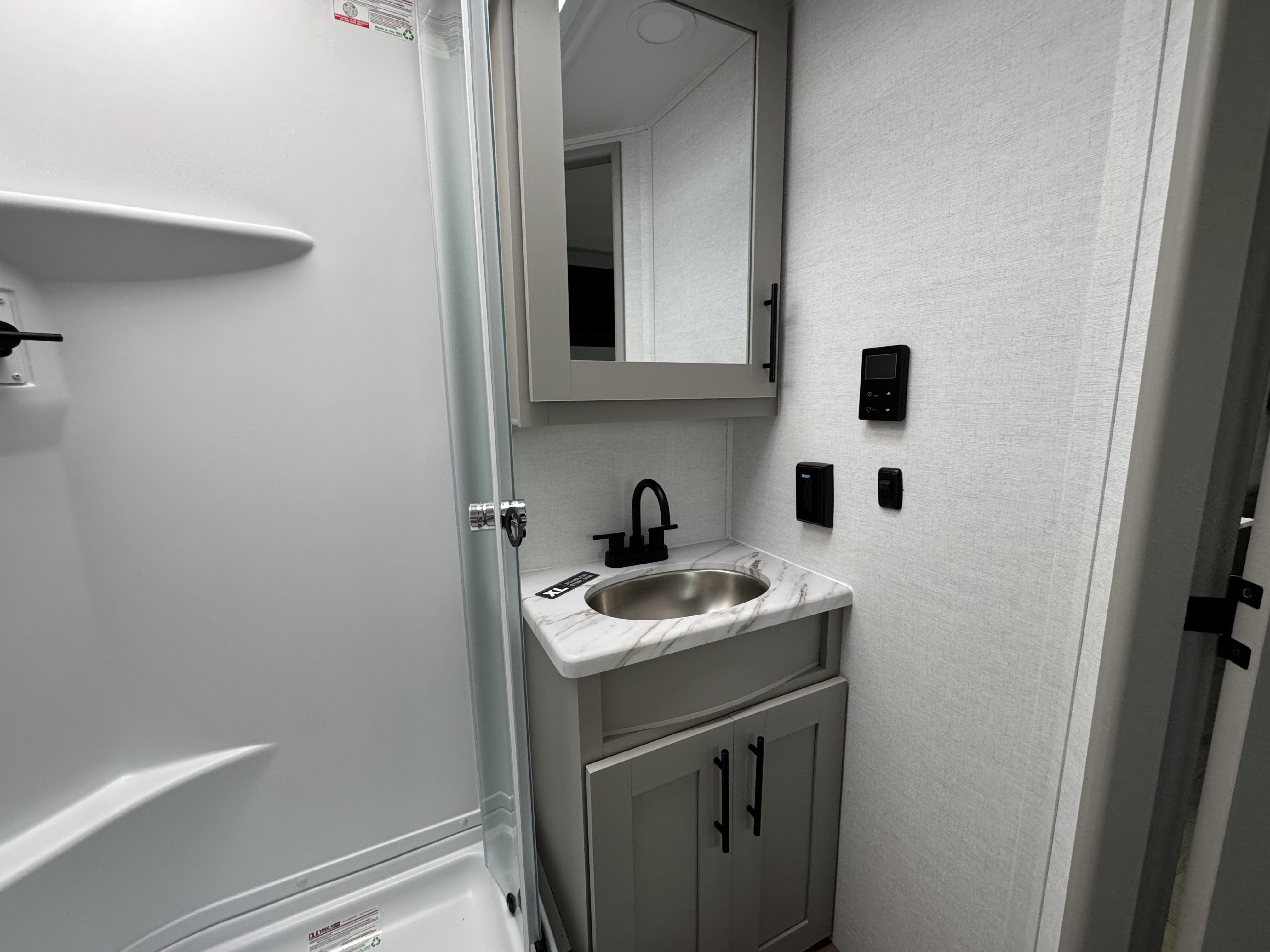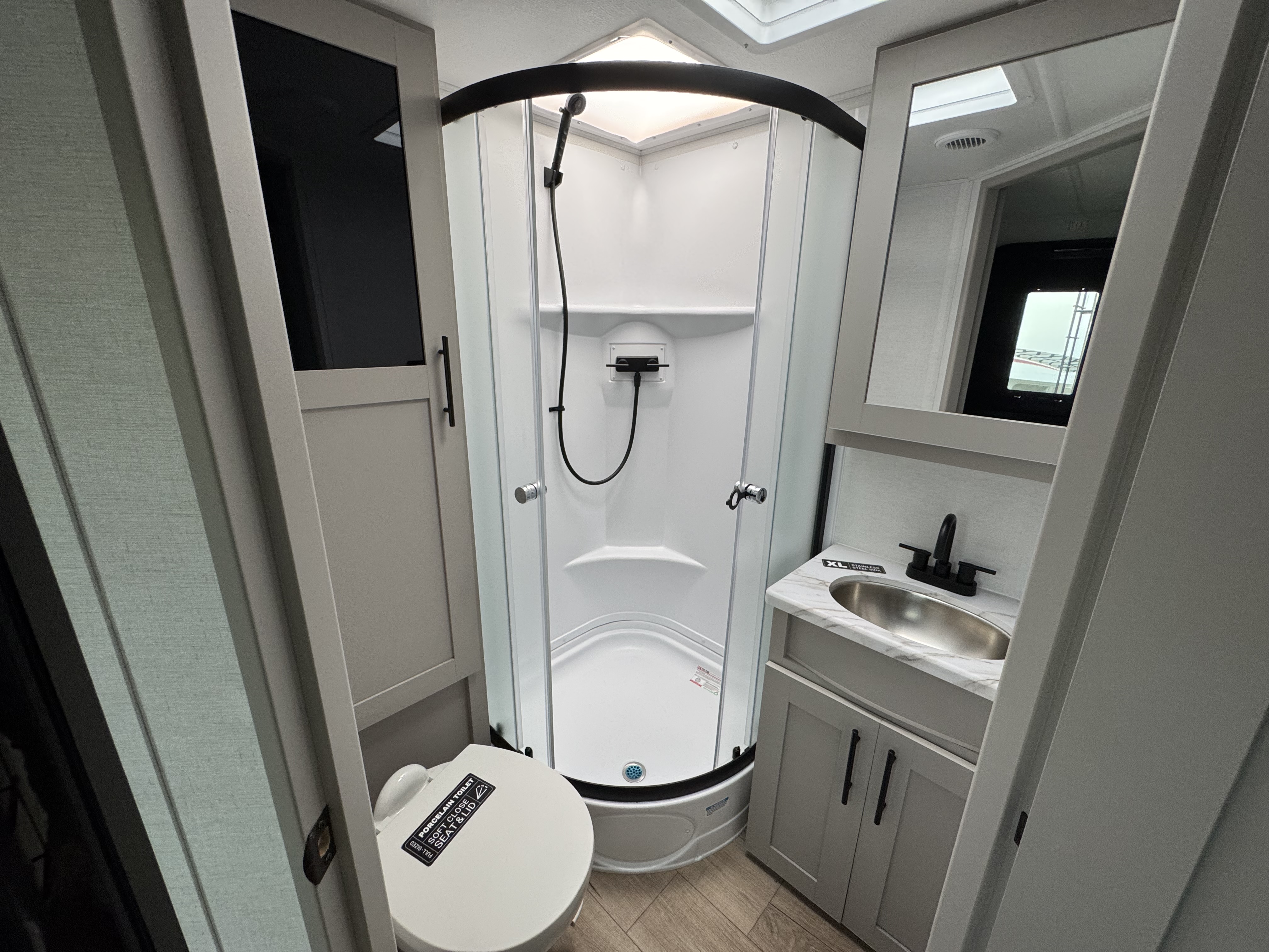 The Alliance RV Delta Ultra Lite travel trailer BH241 is a couple's trailer perfect for weekend trips. It includes a theater seat slide, fireplace, three burner cooktop, and front queen bed. The full bath has a toilet, sink, 32" shower, and linen closet. Storage with dual wardrobes, nightstands, and overhead storage. The Delta Ultra Lite BH241 is a family-friendly travel trailer designed for comfort and lightweight convenience. It is 29 feet 5 inches long and weighs 5,800 pounds, perfect for family adventures.19-foot awning, booth dinette, ample storage, bedroom, and rear bunkhouse. The exterior features of the Delta Ultra Lite travel trailer include oversized atrium windows, a carpet-free interior, magnet catches on cabinets, soft close cabinet doors, LED lighting, temperature-controlled spray ports, exterior awning controls, a 2" rear accessory hitch, and Goodyear Endurance tires.