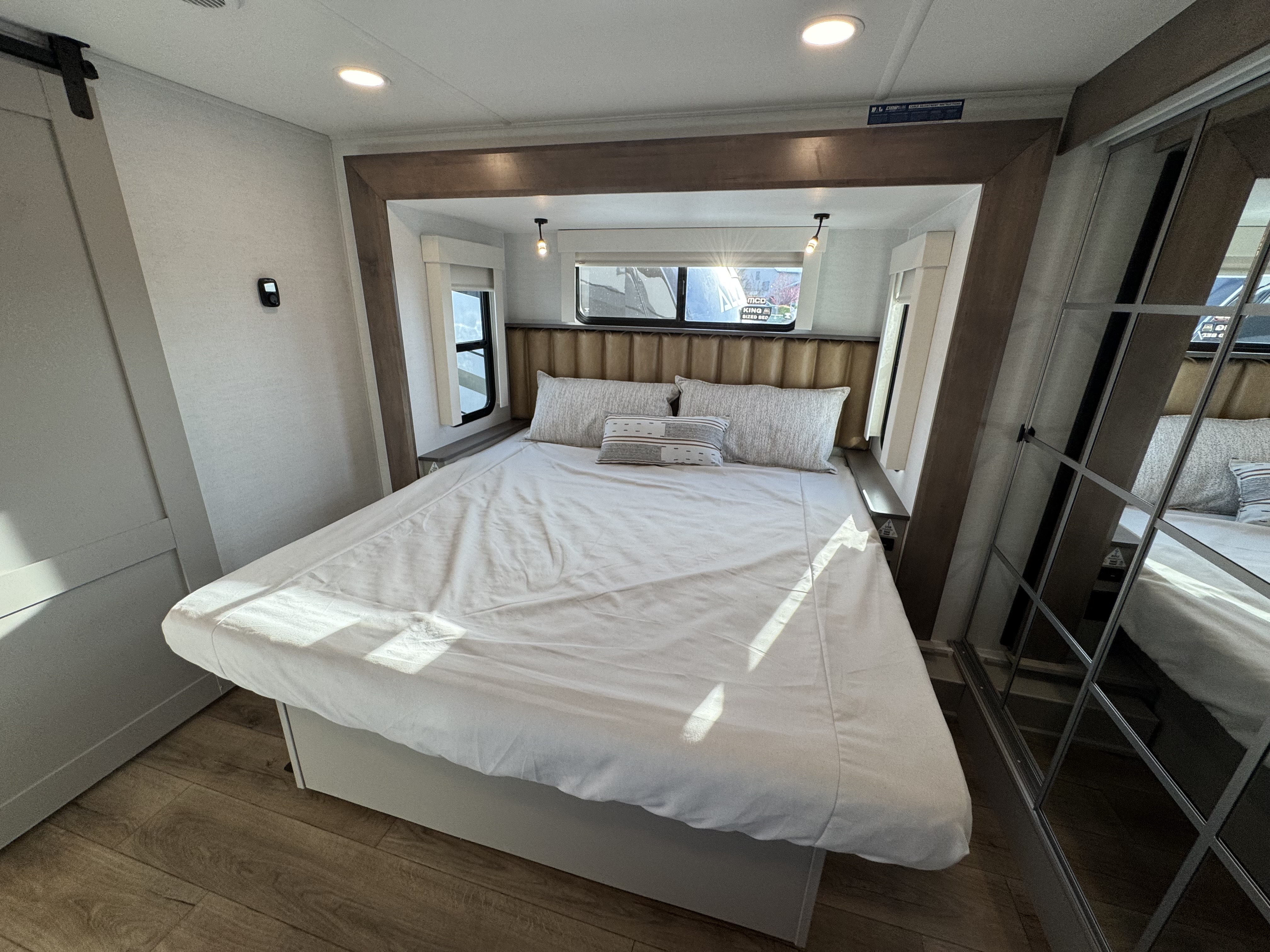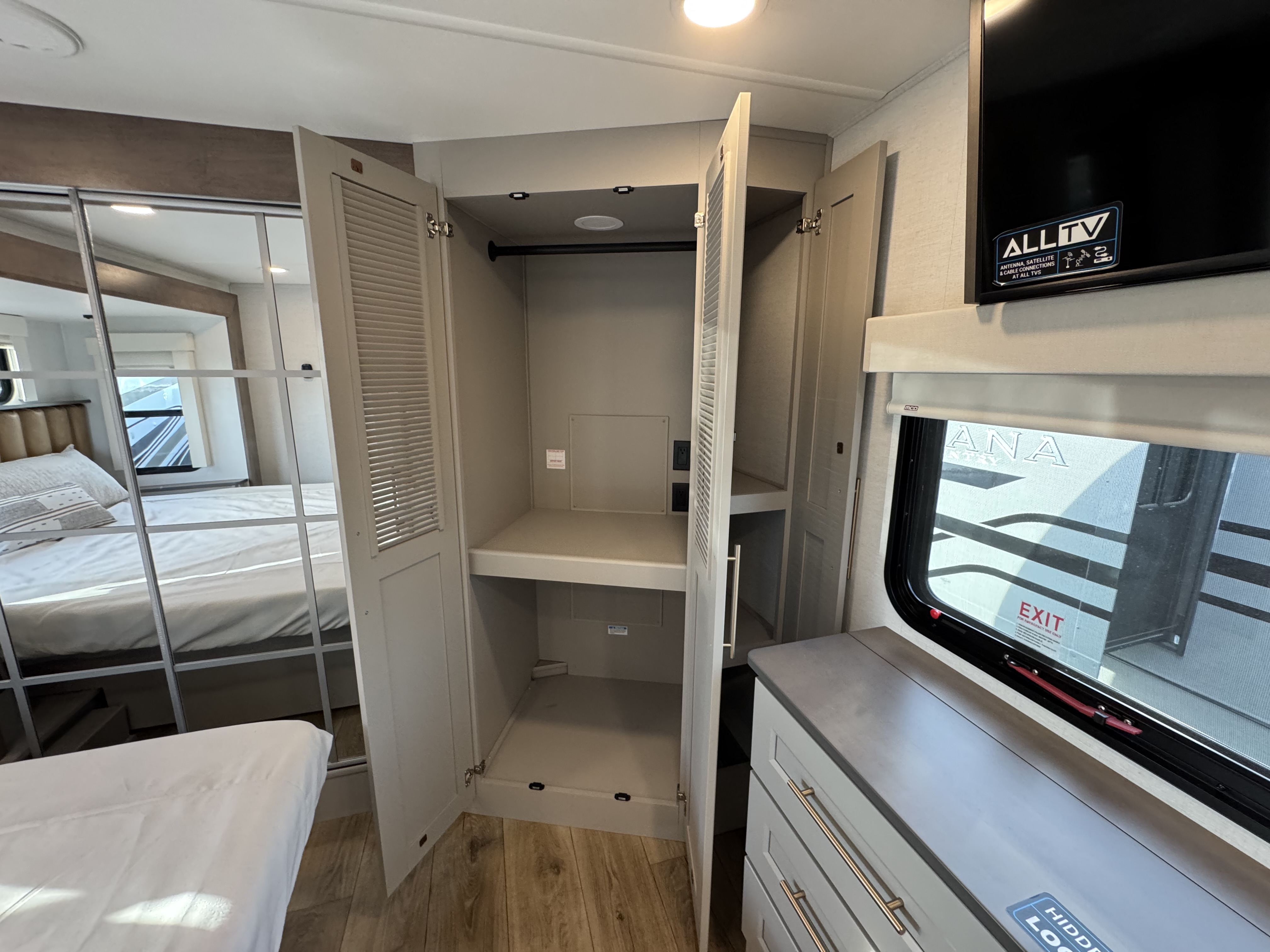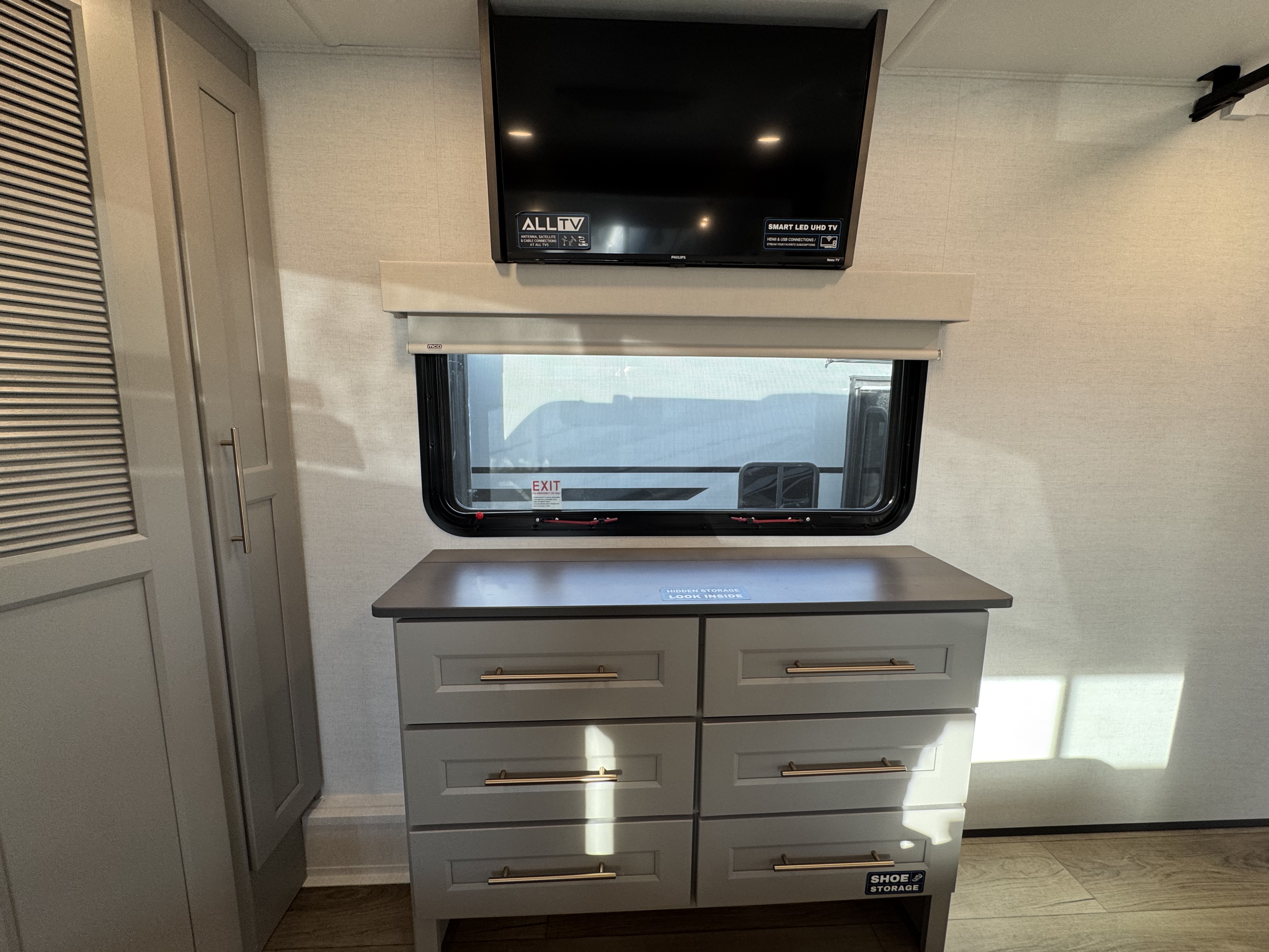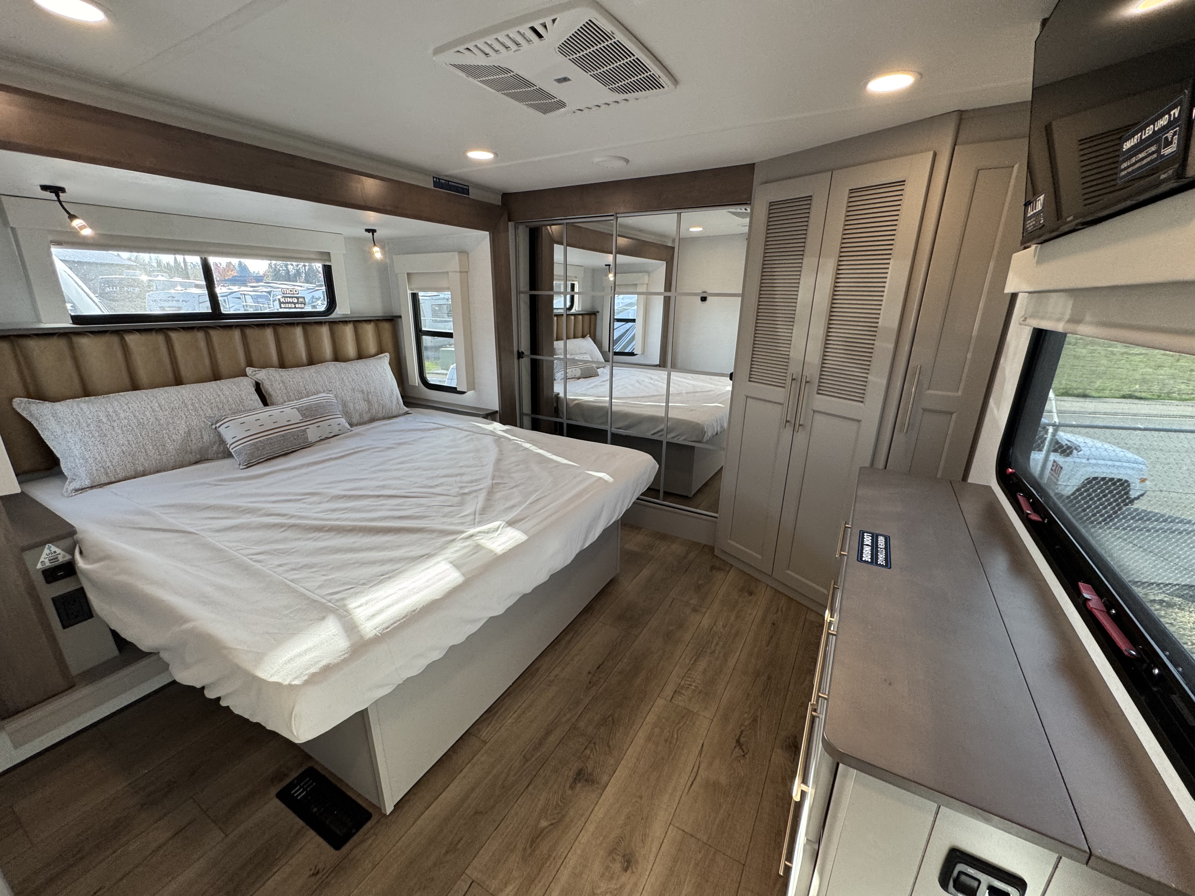 The master bedroom features a king bed slide and is equipped with a Smart TV, a dresser with flip-up hidden storage, and plenty of room for your belongings. The adjacent full bathroom offers a residential-style shower, a porcelain toilet with a soft-close seat, and dedicated linen storage for all your necessities.