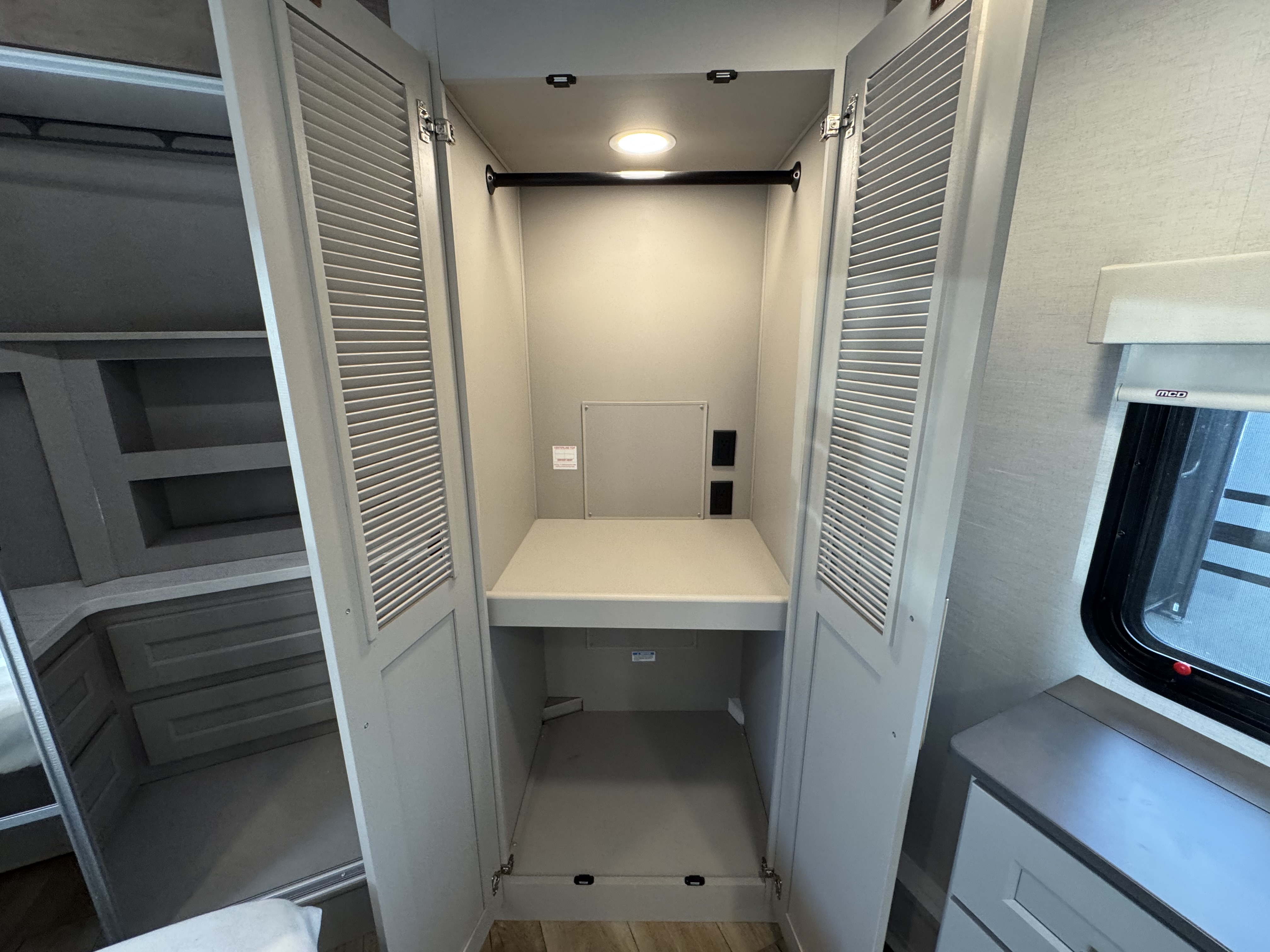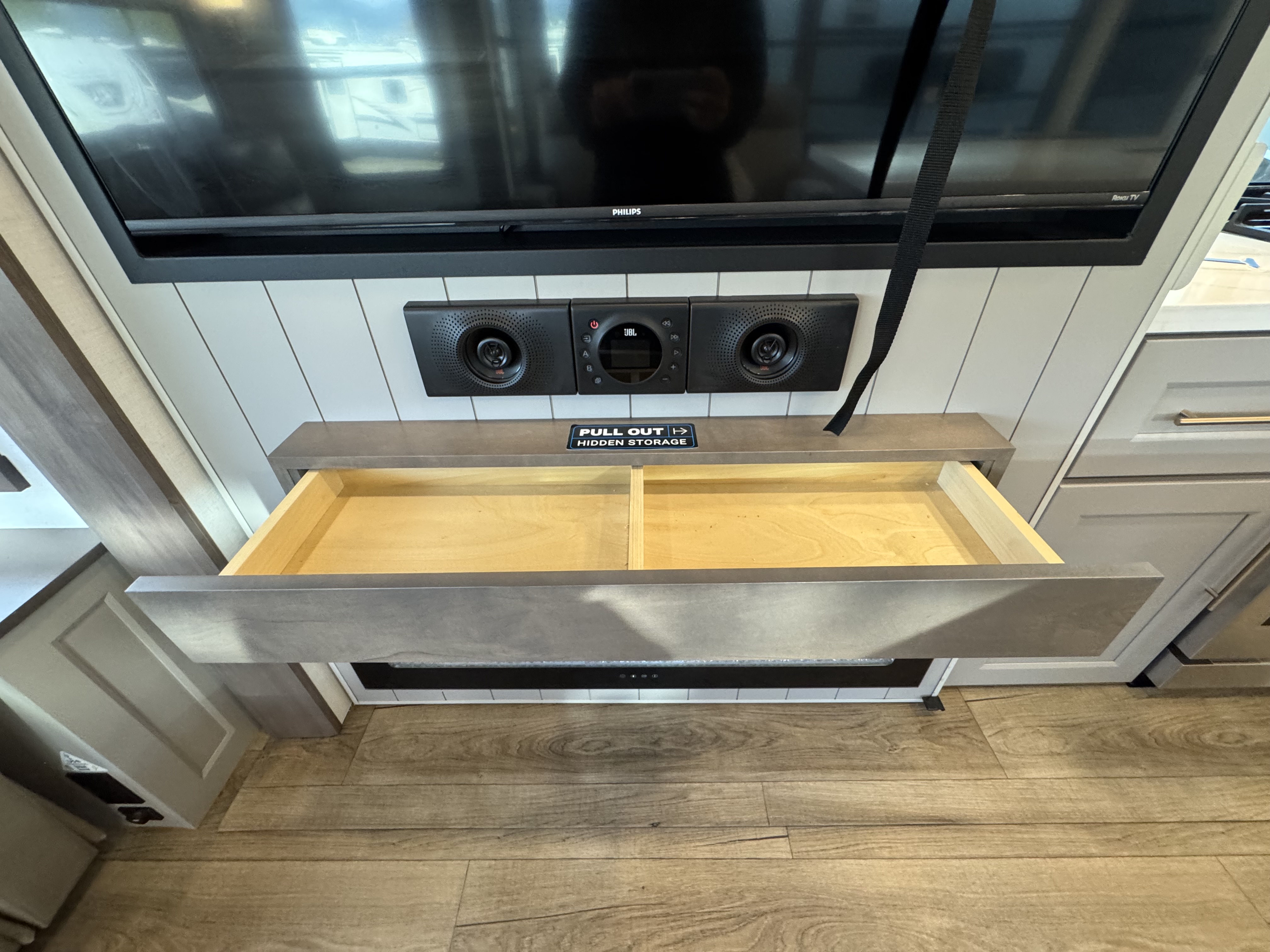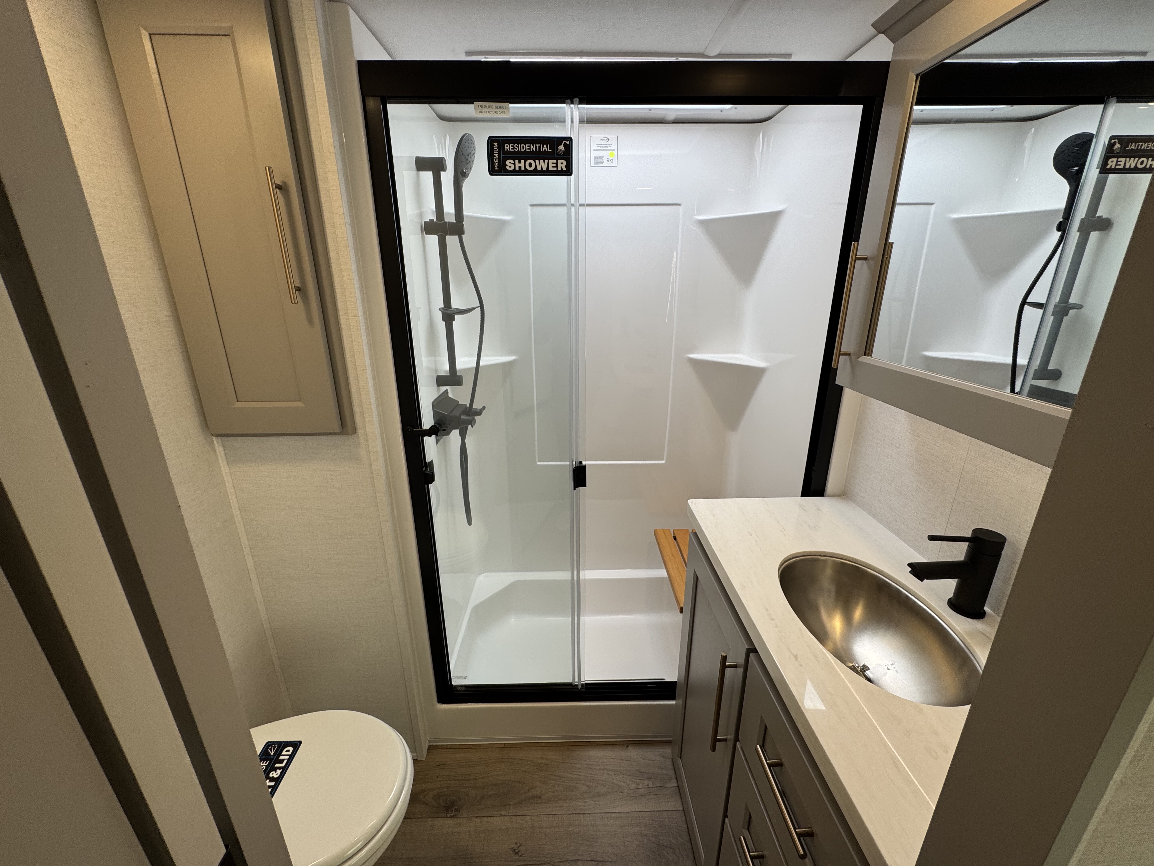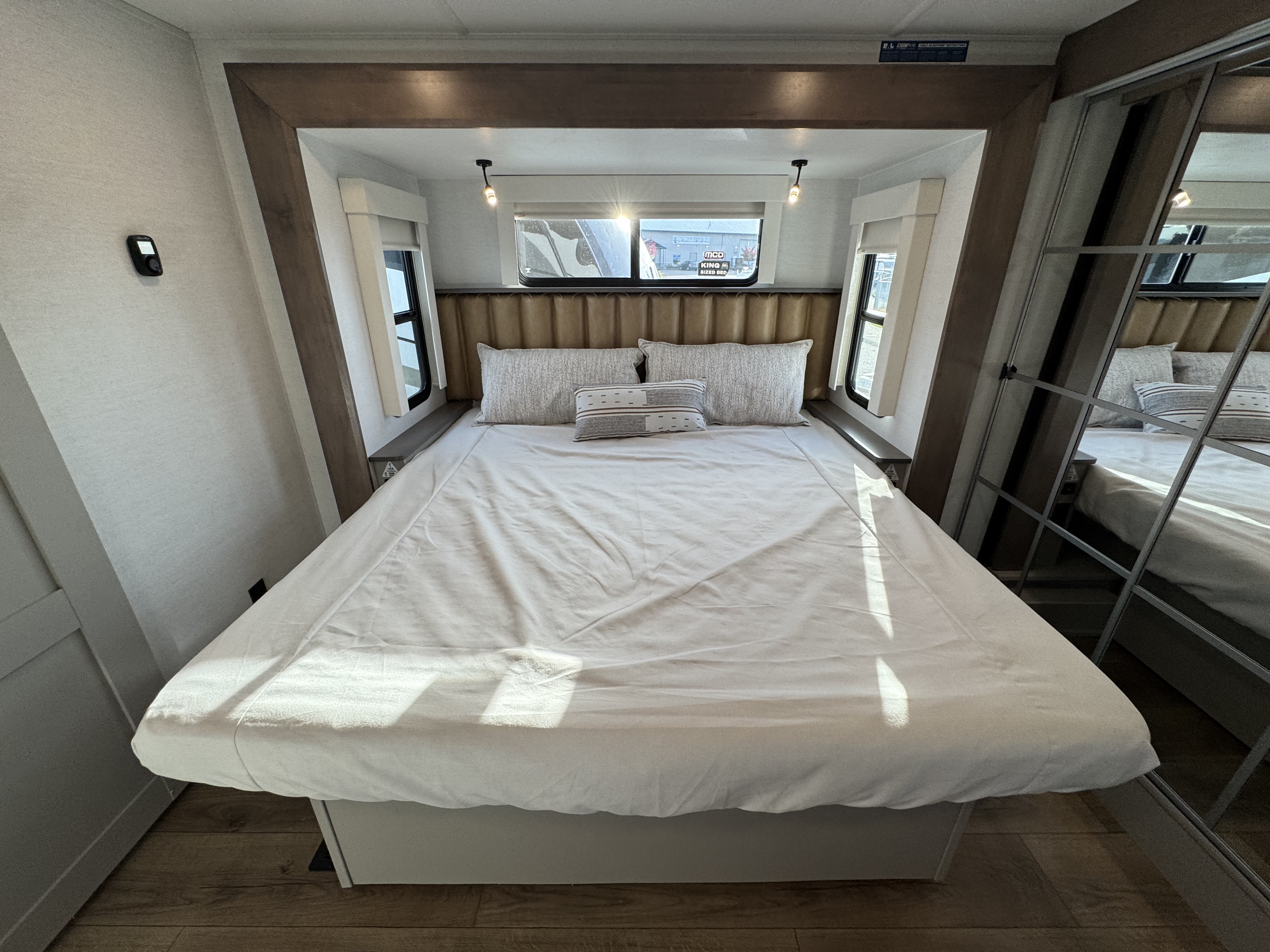 The master bedroom features a king bed slide and is equipped with a Smart TV, a dresser with flip-up hidden storage, and plenty of room for your belongings. The adjacent full bathroom offers a residential-style shower, a porcelain toilet with a soft-close seat, and dedicated linen storage for all your necessities.