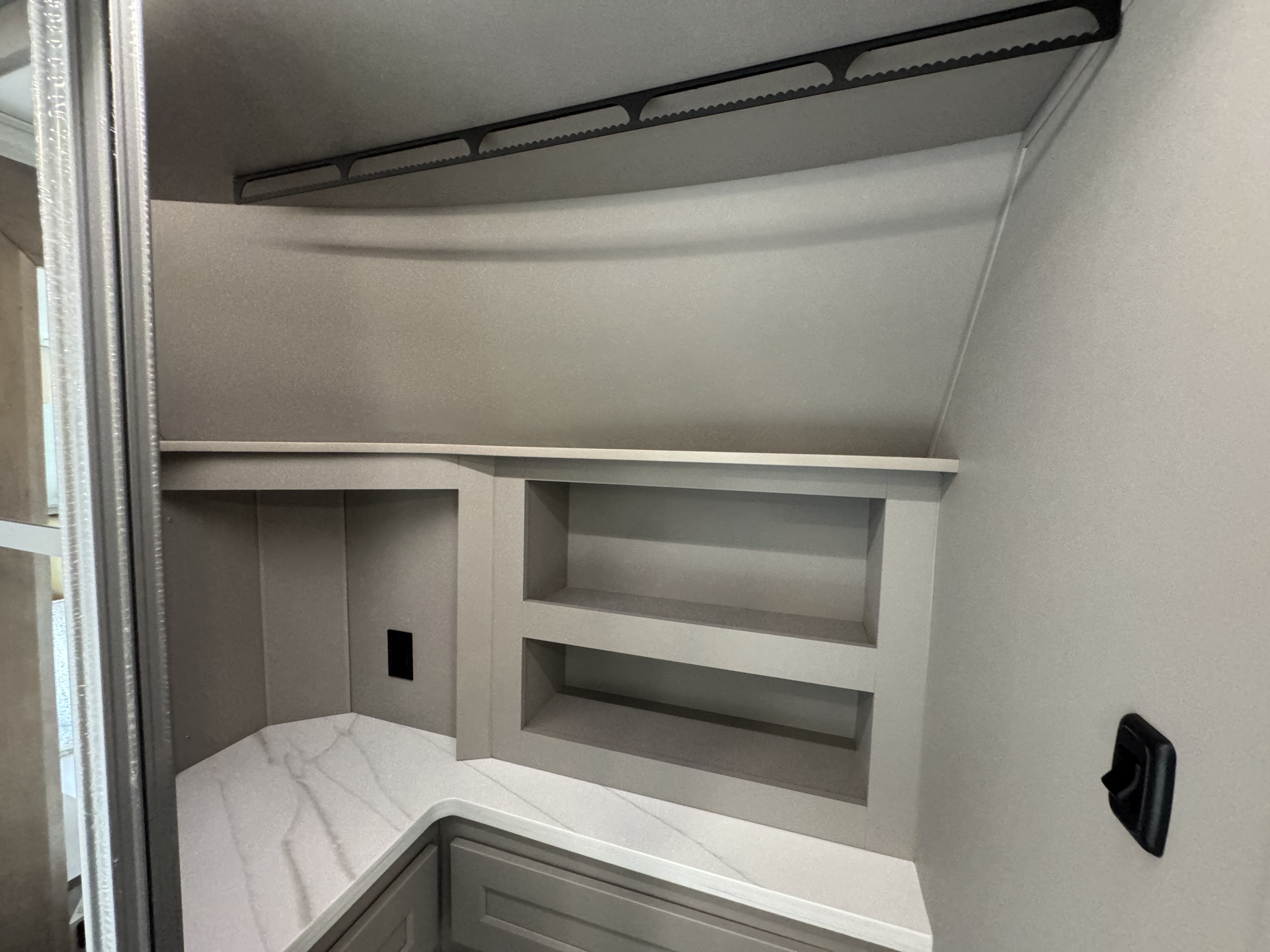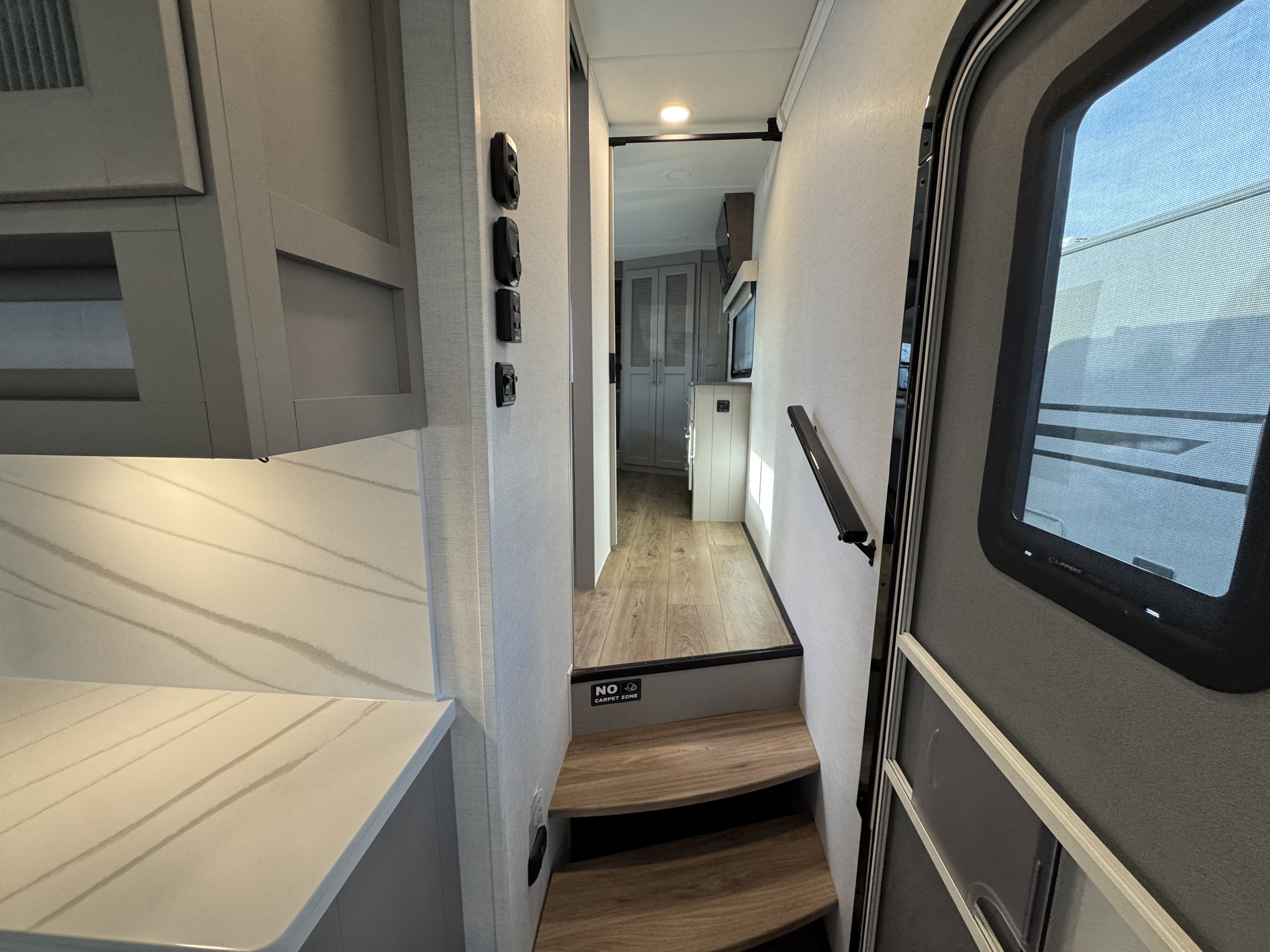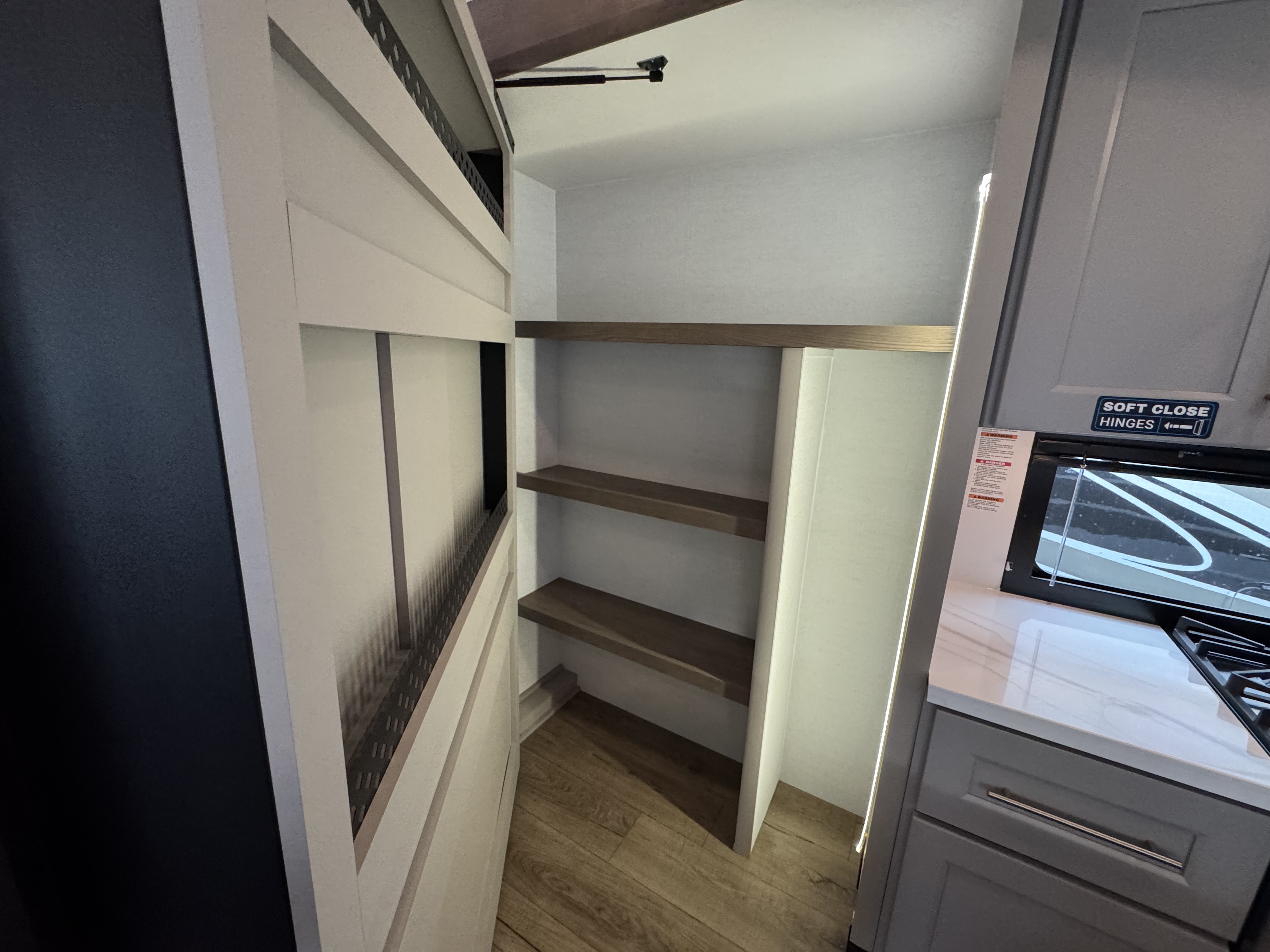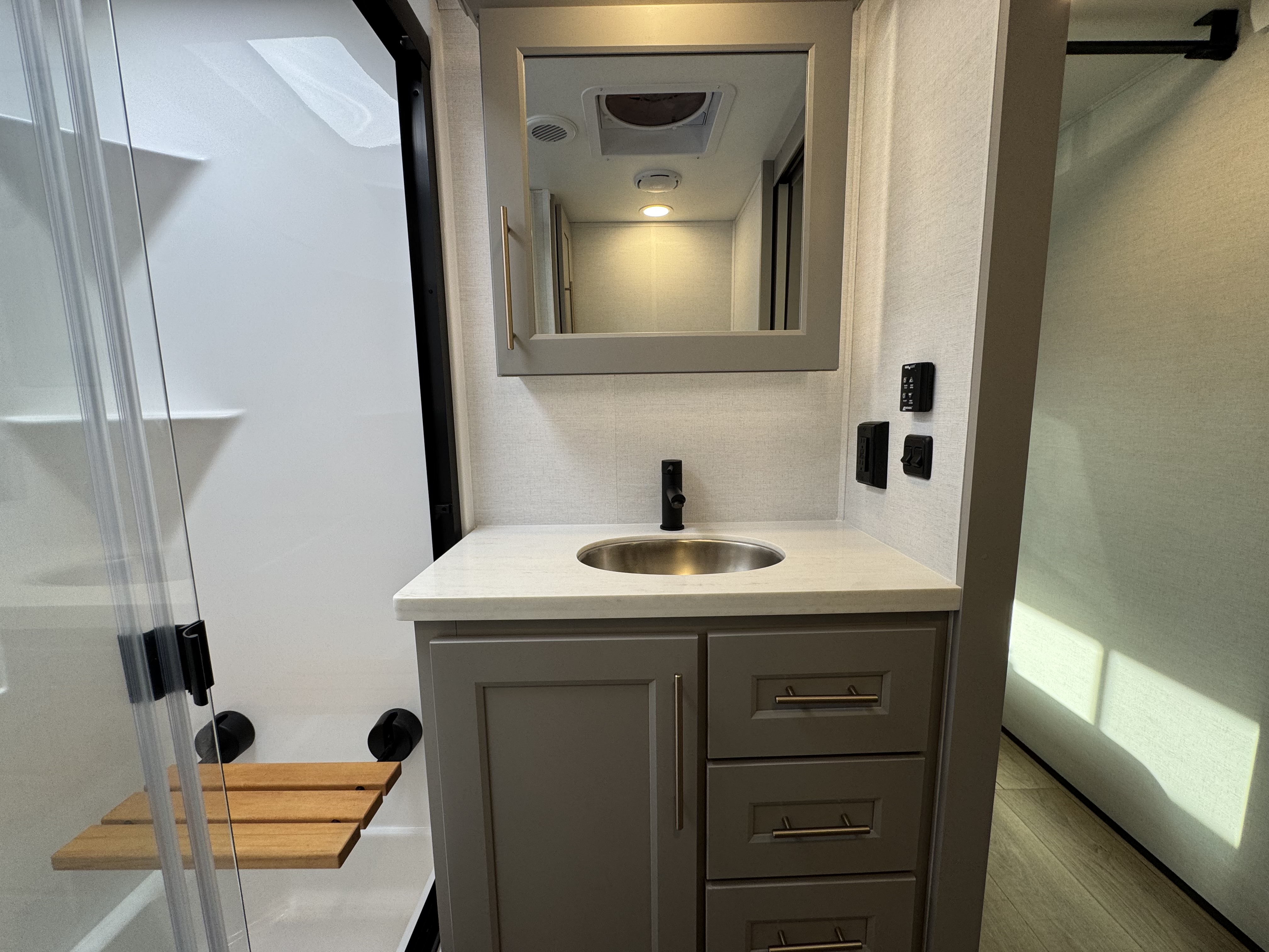 The master bedroom features a king bed slide and is equipped with a Smart TV, a dresser with flip-up hidden storage, and plenty of room for your belongings. The adjacent full bathroom offers a residential-style shower, a porcelain toilet with a soft-close seat, and dedicated linen storage for all your necessities.