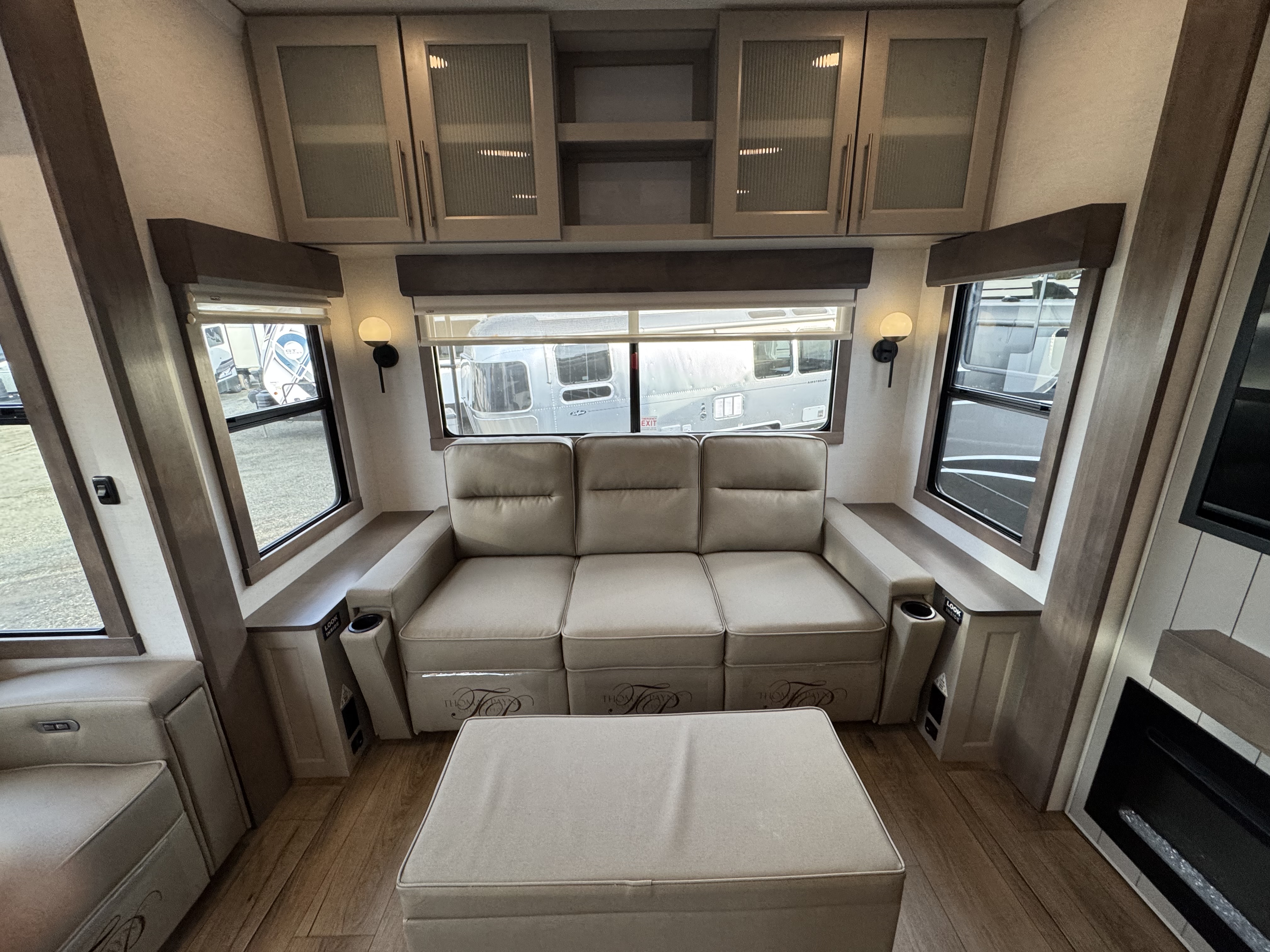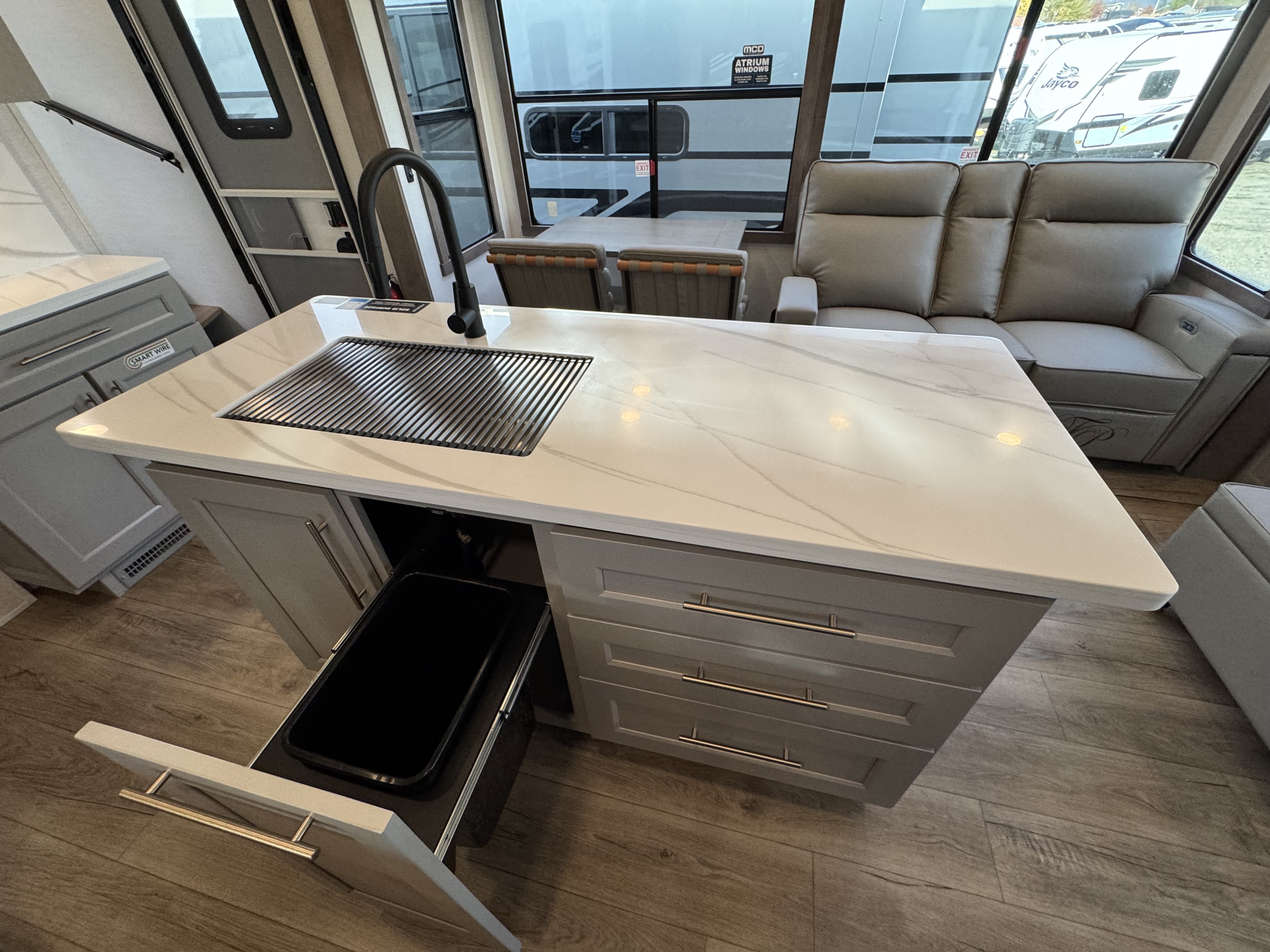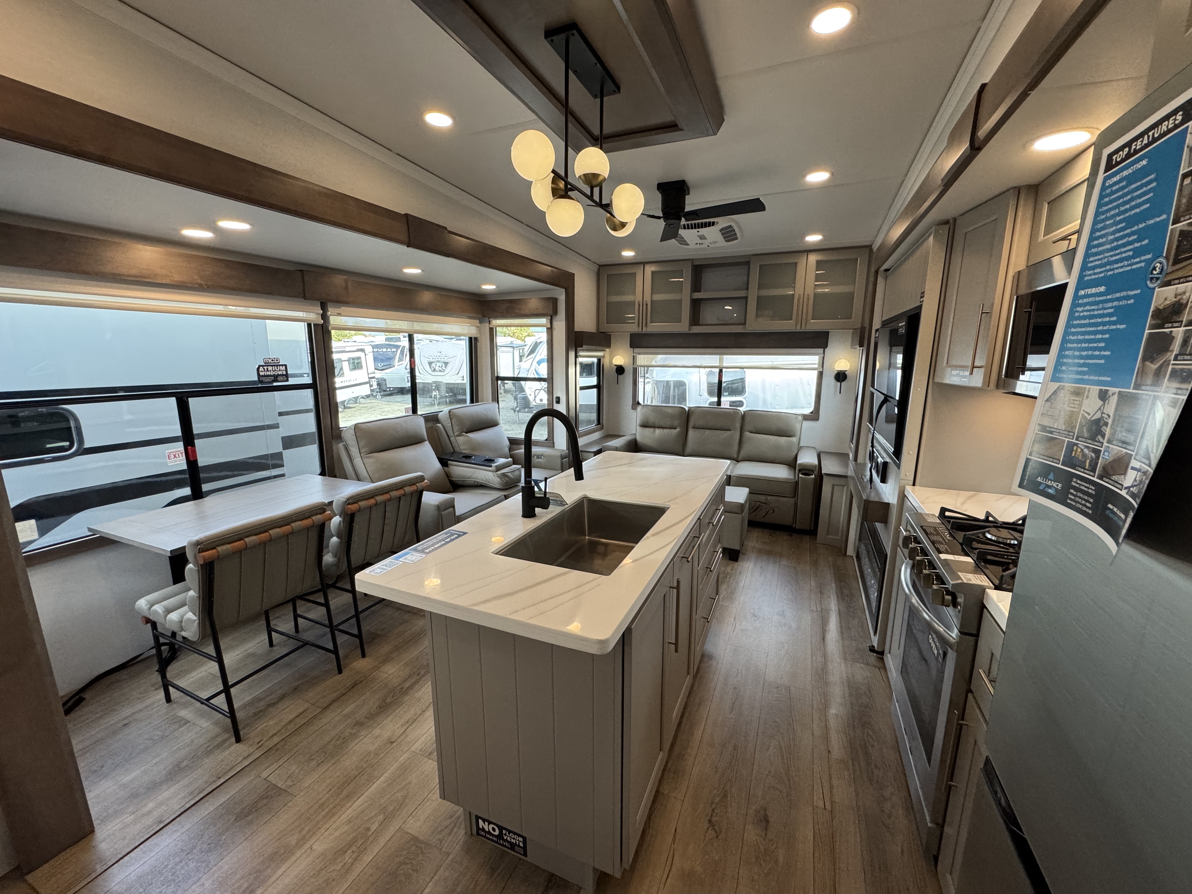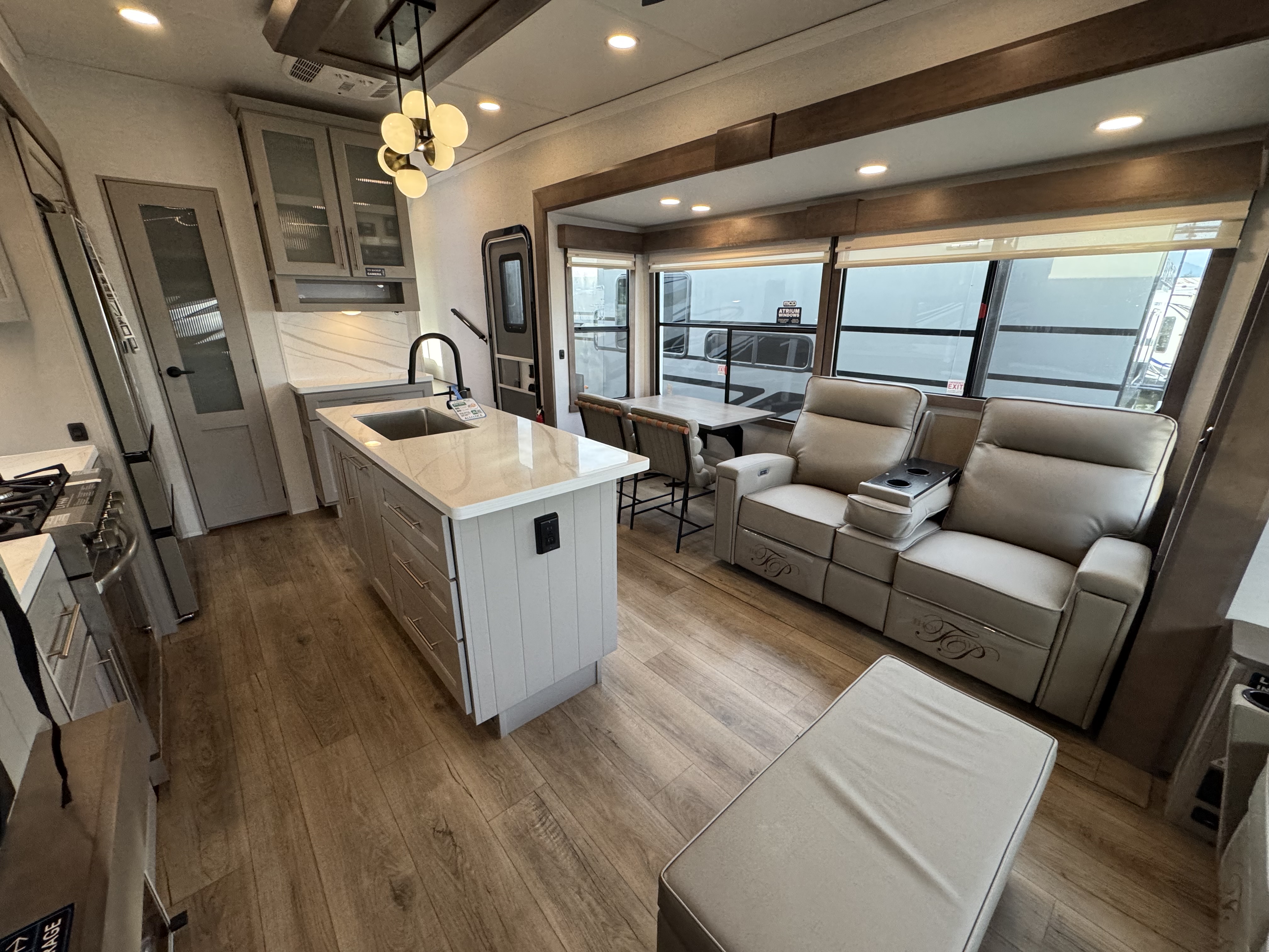 Step inside to a rear living area that’s designed for relaxation and entertainment. The dual recliner love seat faces a cozy fireplace and a large 50" Smart TV—the perfect setting to unwind after a day of exploring. The flush-floor kitchen slide creates a spacious cooking and dining area, with a kitchen island featuring a large undermount sink and dishwasher prep option, making clean-up a breeze. You’ll find two pantries for ample storage, plus a residential microwave, range, and a 3.73 cu. ft. oven to prepare delicious meals on the road.