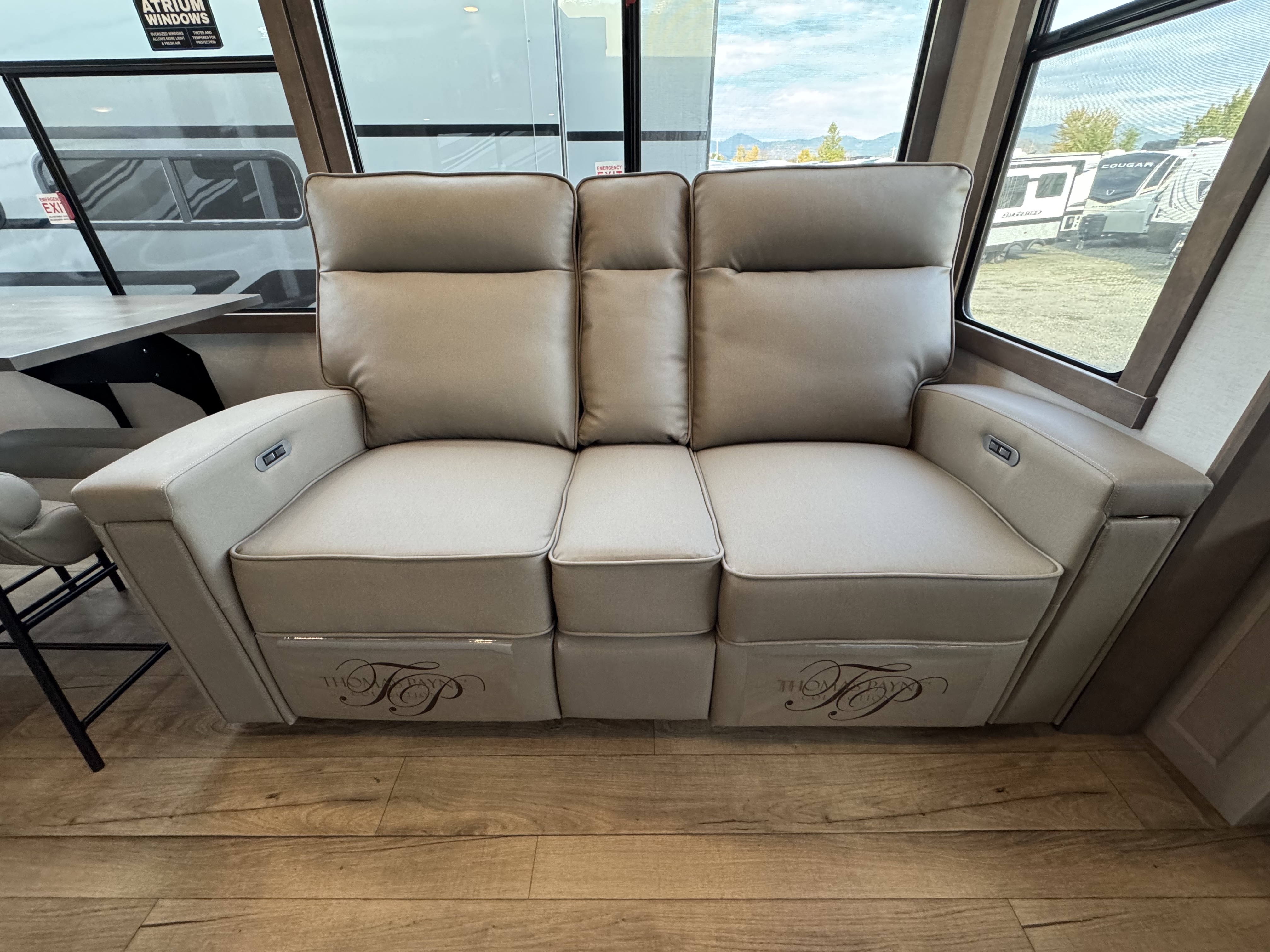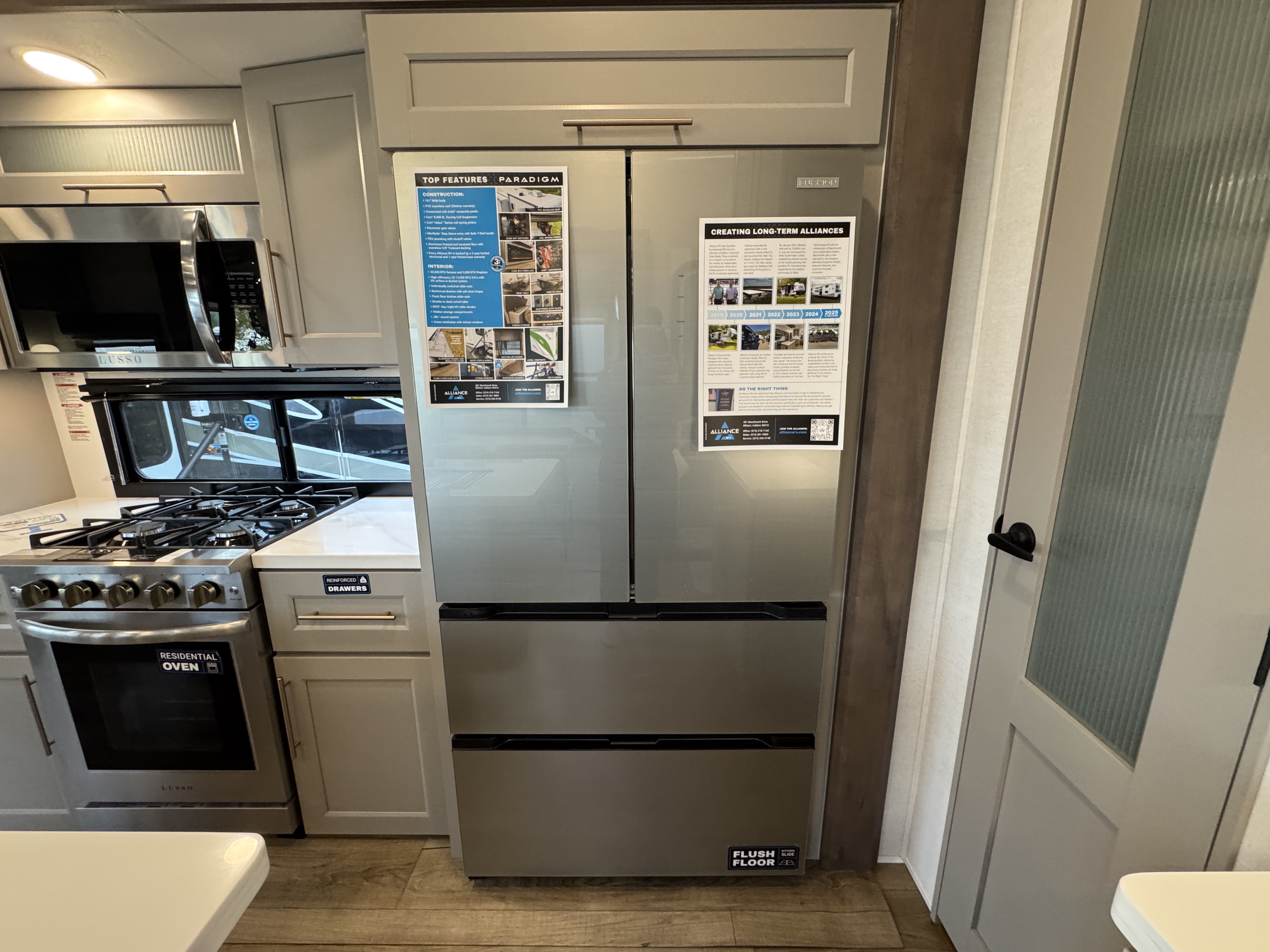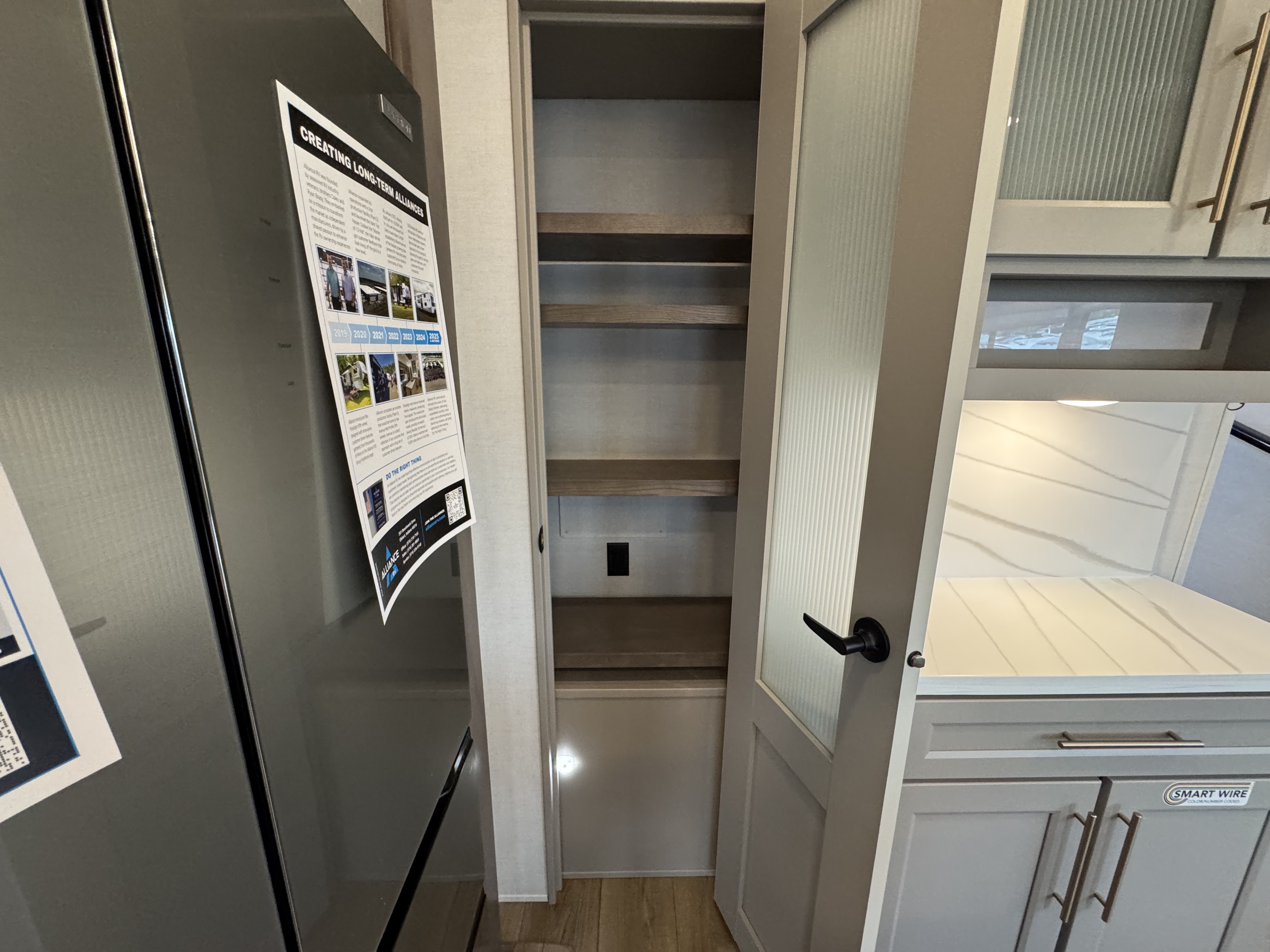 Step inside to a rear living area that’s designed for relaxation and entertainment. The dual recliner love seat faces a cozy fireplace and a large 50" Smart TV—the perfect setting to unwind after a day of exploring. The flush-floor kitchen slide creates a spacious cooking and dining area, with a kitchen island featuring a large undermount sink and dishwasher prep option, making clean-up a breeze. You’ll find two pantries for ample storage, plus a residential microwave, range, and a 3.73 cu. ft. oven to prepare delicious meals on the road.