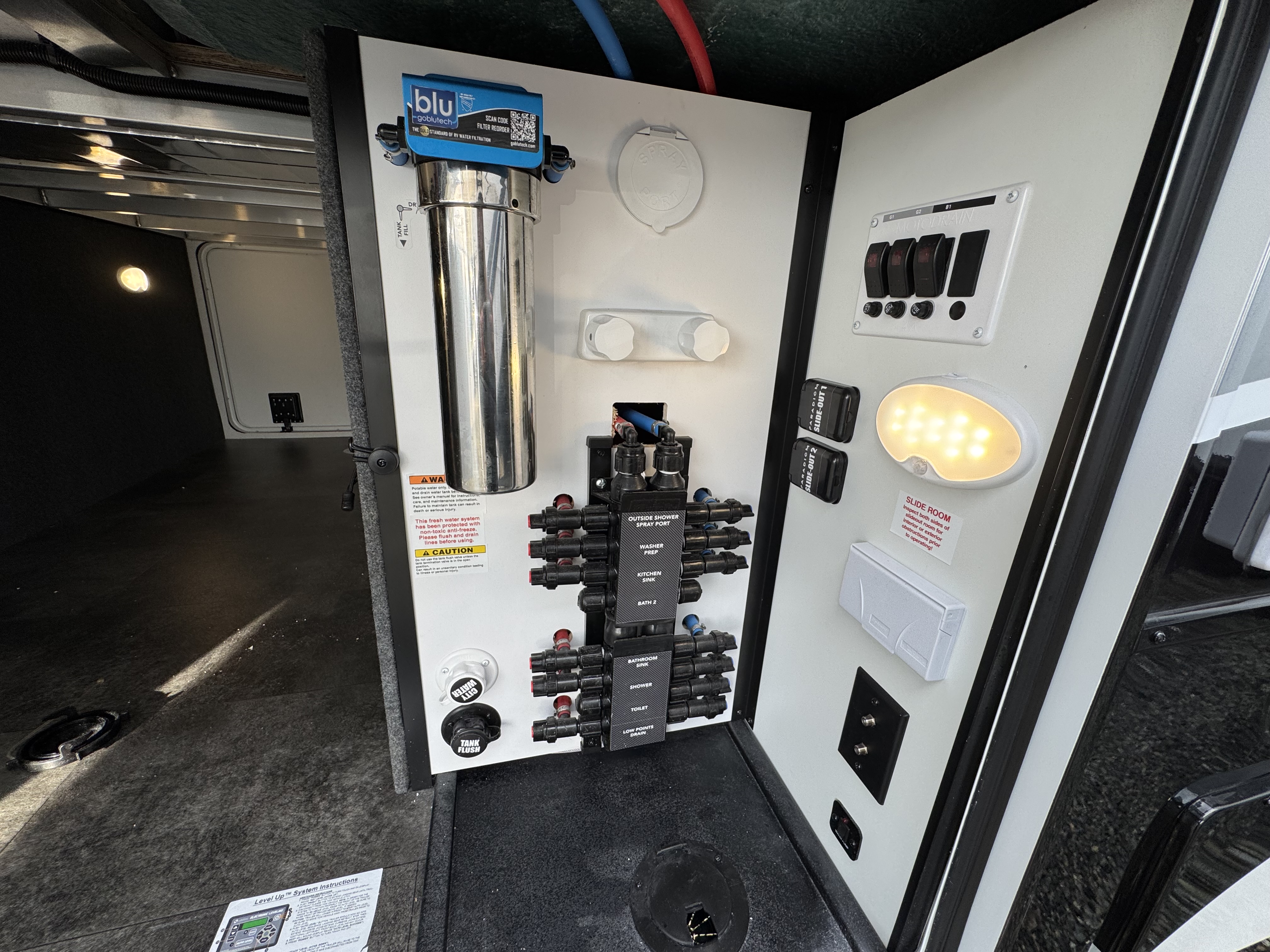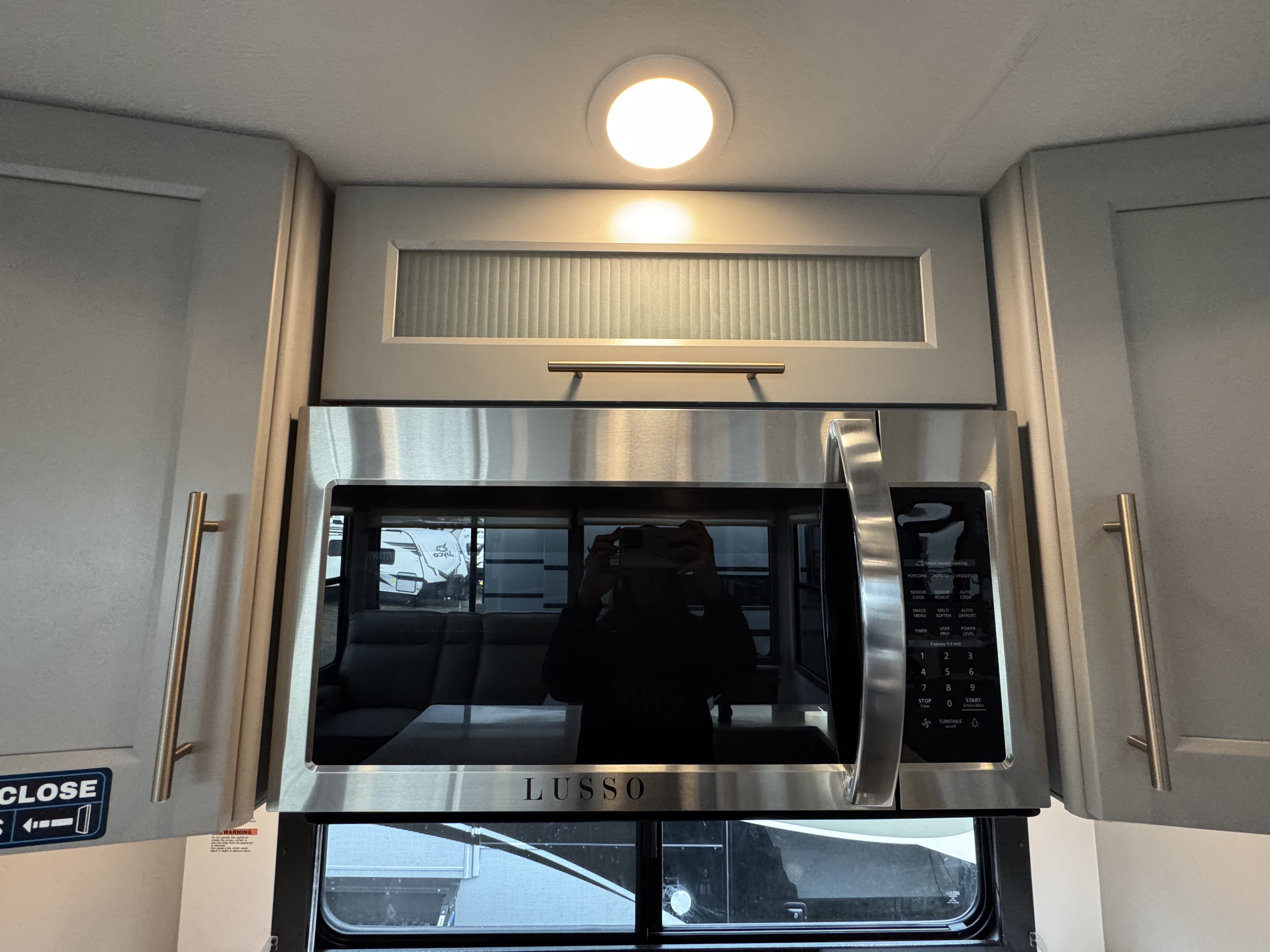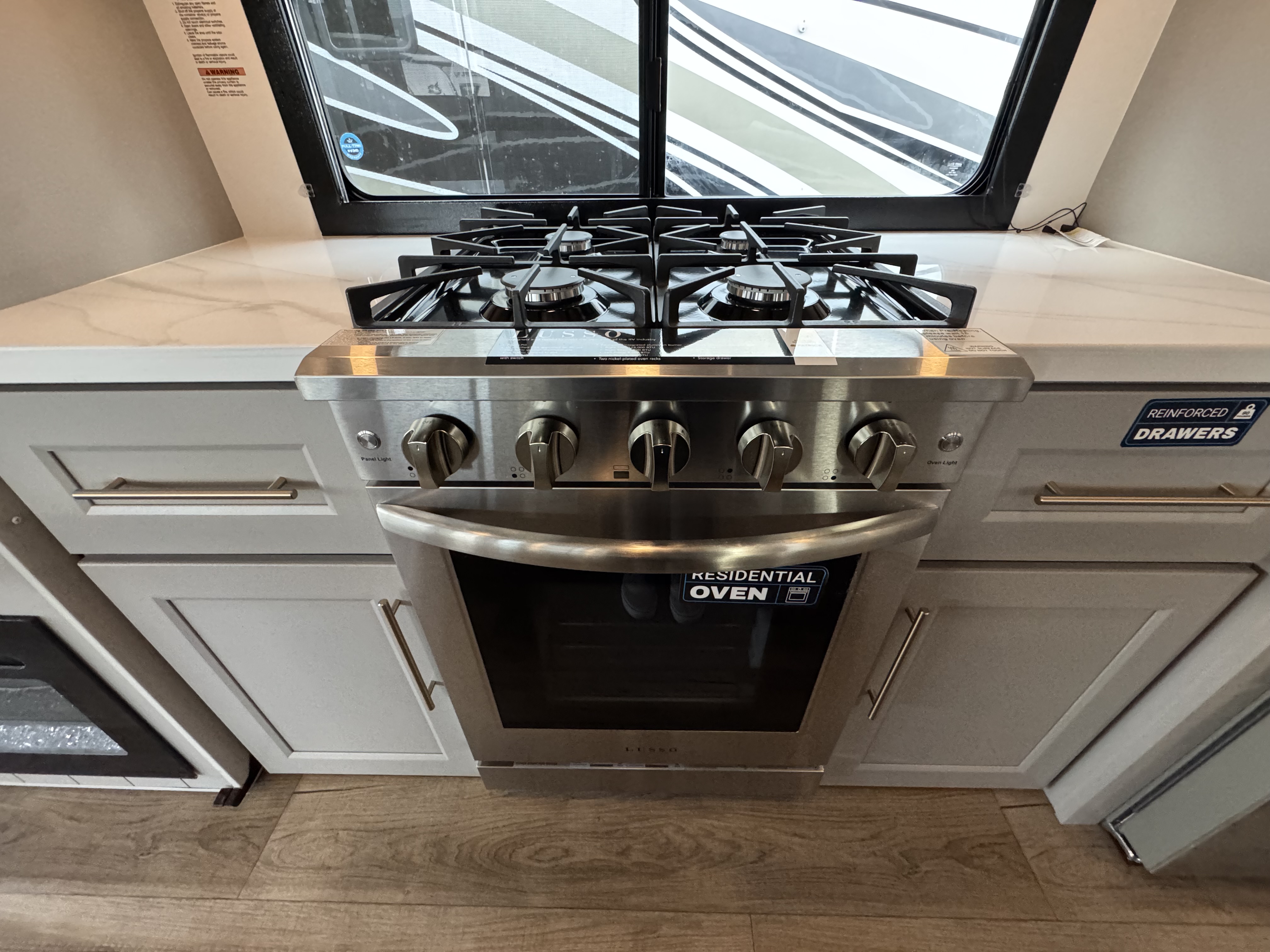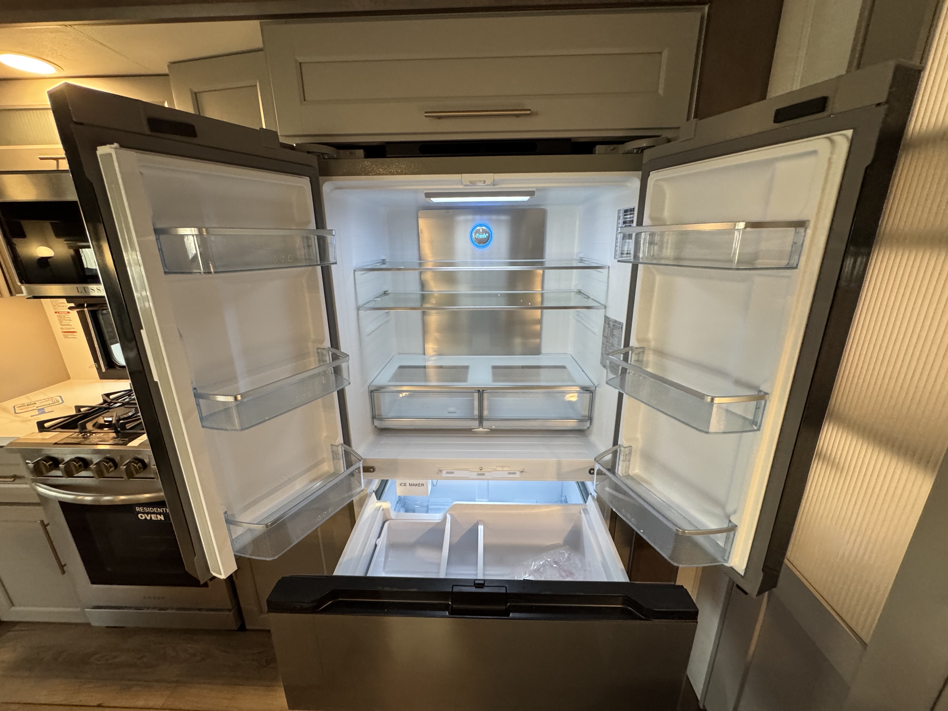 Step inside to a rear living area that’s designed for relaxation and entertainment. The dual recliner love seat faces a cozy fireplace and a large 50" Smart TV—the perfect setting to unwind after a day of exploring. The flush-floor kitchen slide creates a spacious cooking and dining area, with a kitchen island featuring a large undermount sink and dishwasher prep option, making clean-up a breeze. You’ll find two pantries for ample storage, plus a residential microwave, range, and a 3.73 cu. ft. oven to prepare delicious meals on the road.