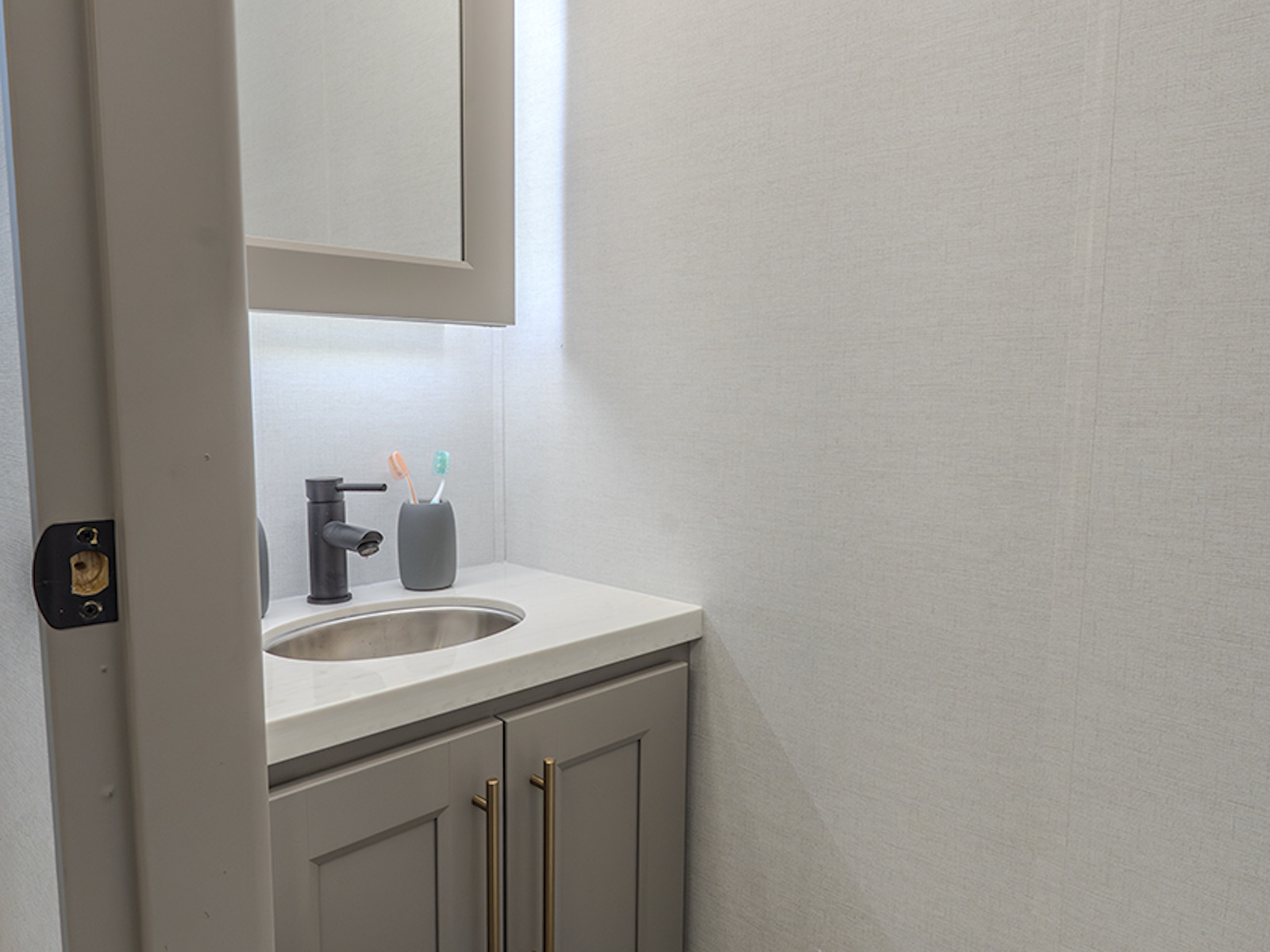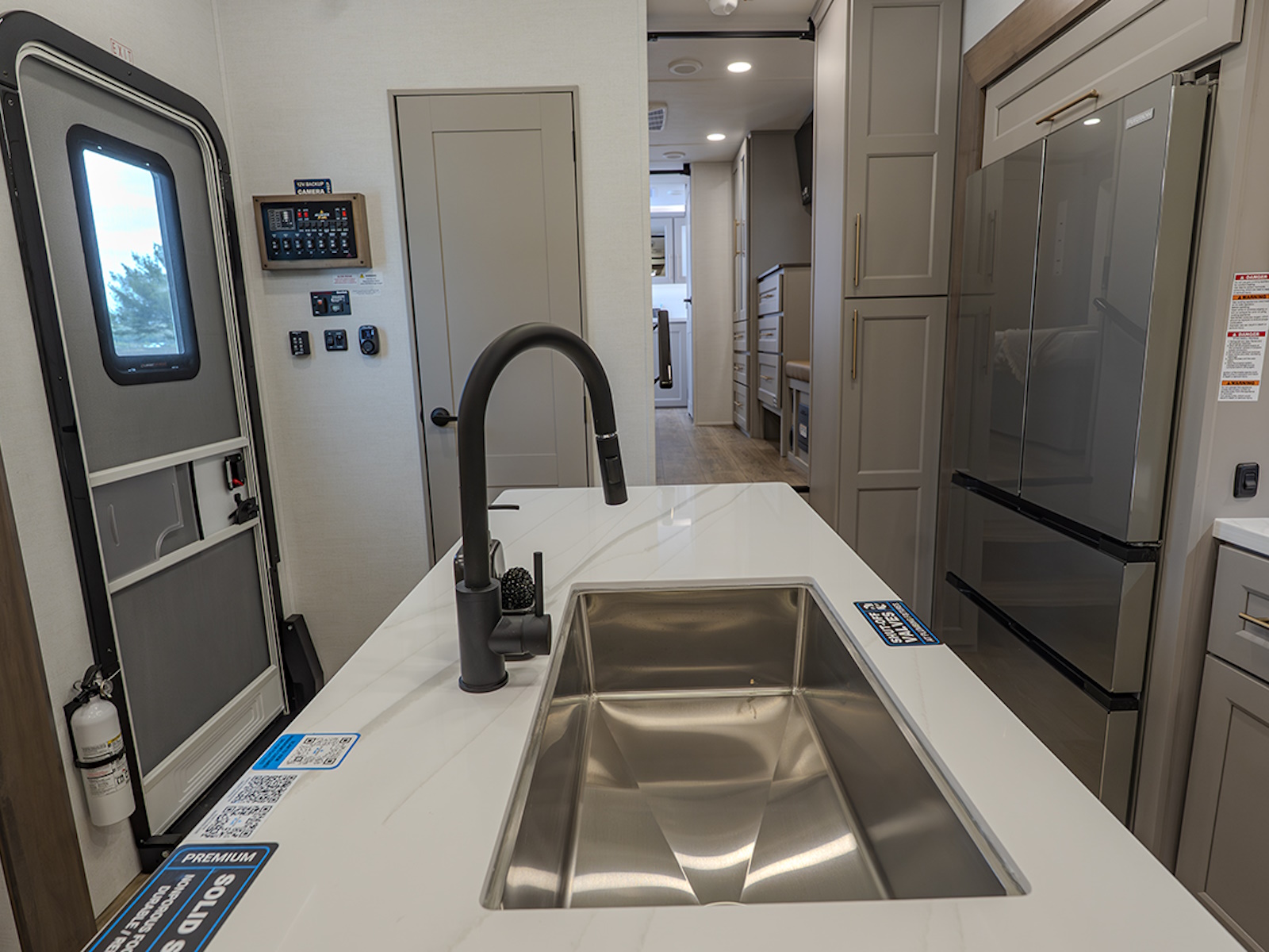 The half bath near the main entry adds convenience, and the separate kitchen offers a functional, well-equipped cooking space. The chef will love the residential microwave, range, and 19 cu. ft. 12V residential refrigerator, as well as the kitchen island with a large sink and extra counter space for meal prep. There’s also a pantry for additional storage.