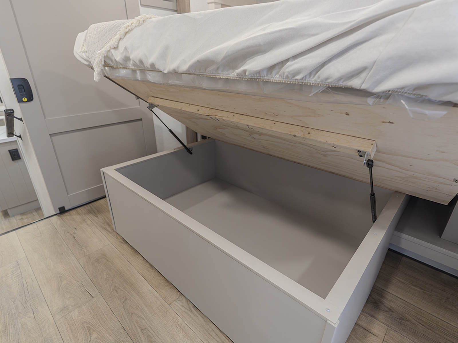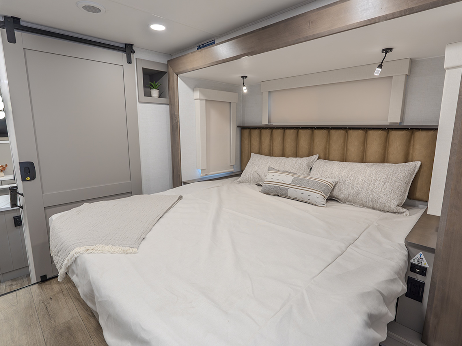 Inside, the master suite is a true retreat, featuring a king bed slide-out that maximizes space, along with a flip-top dresser, a Smart TV, and plenty of wardrobe and shelf storage. The rear bathroom includes a residential-style shower, a porcelain toilet with a soft-close seat, and more storage for your linens and essentials.