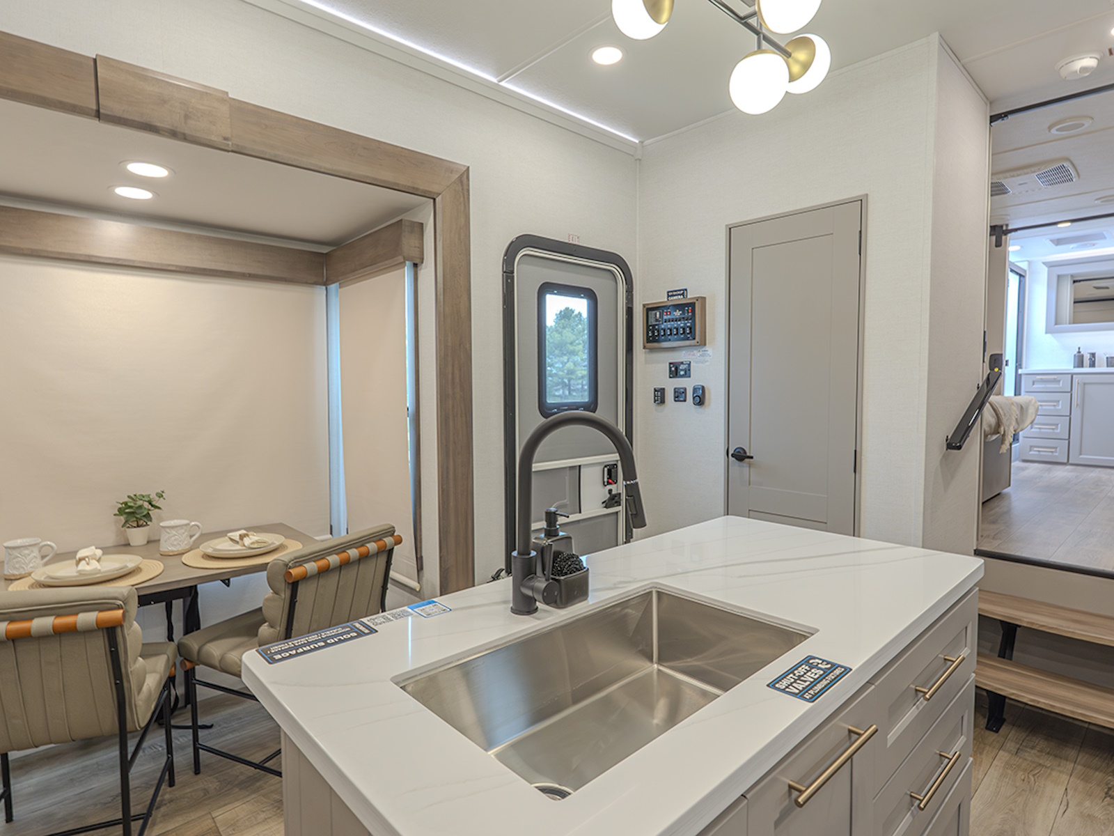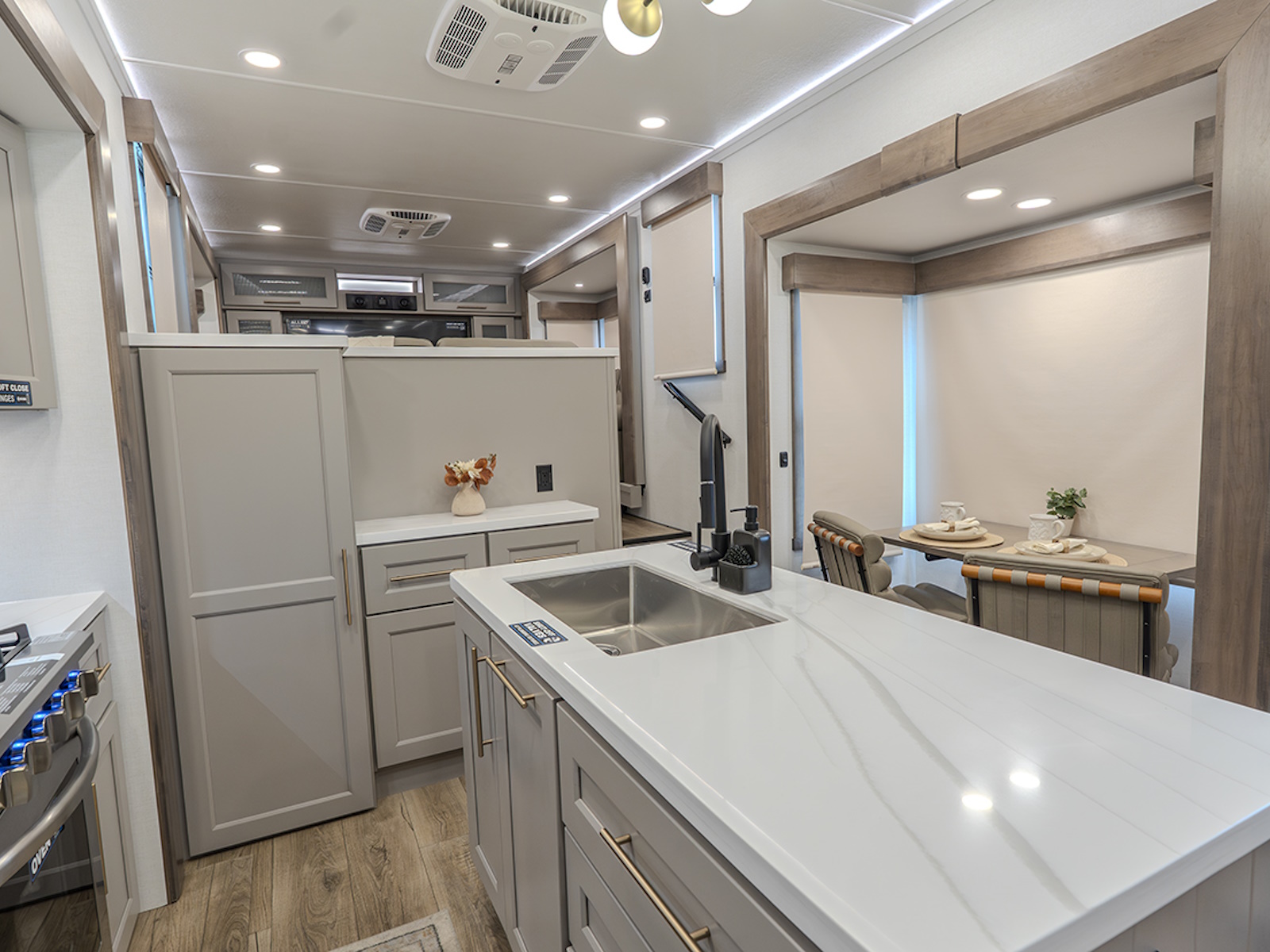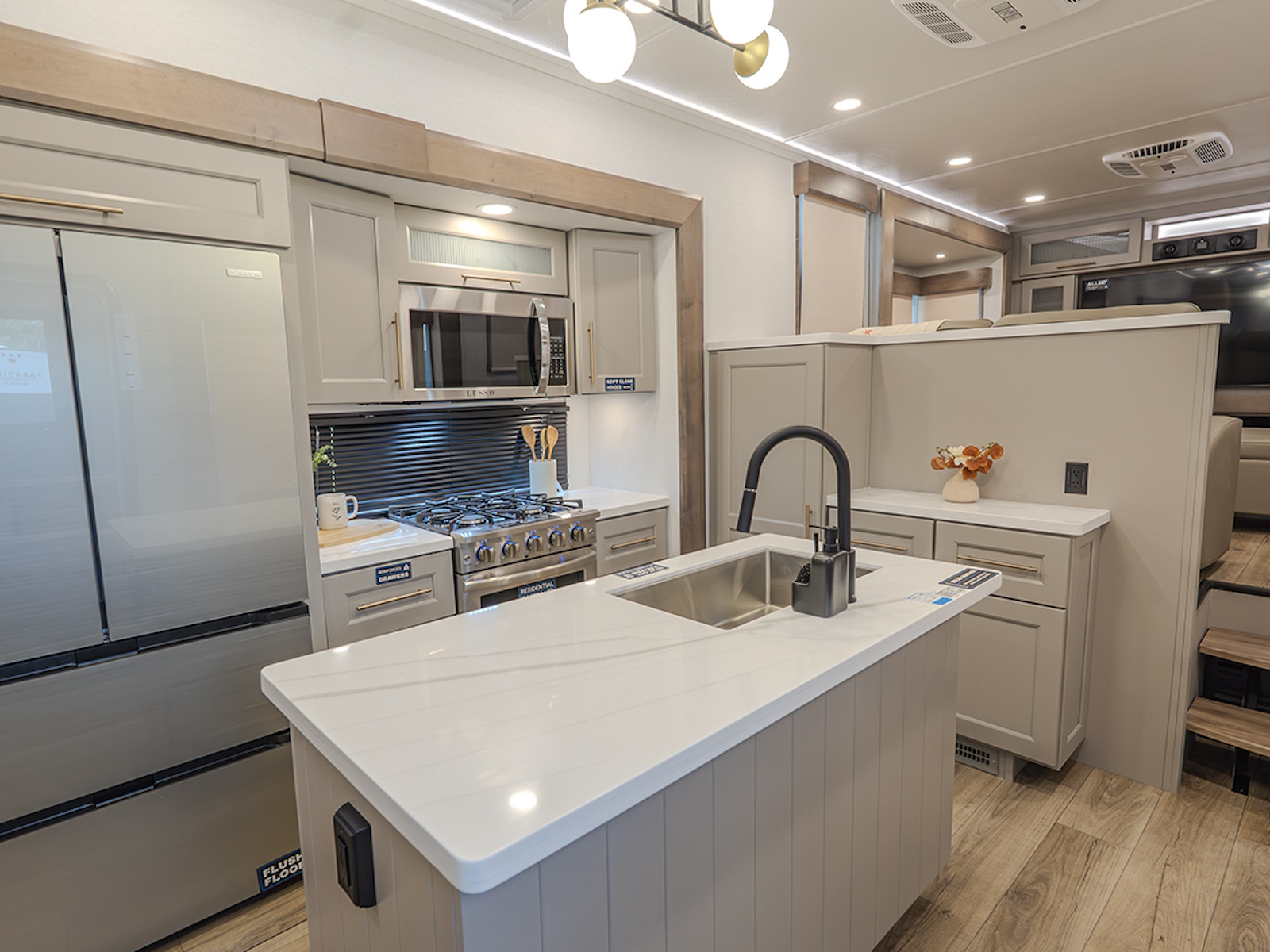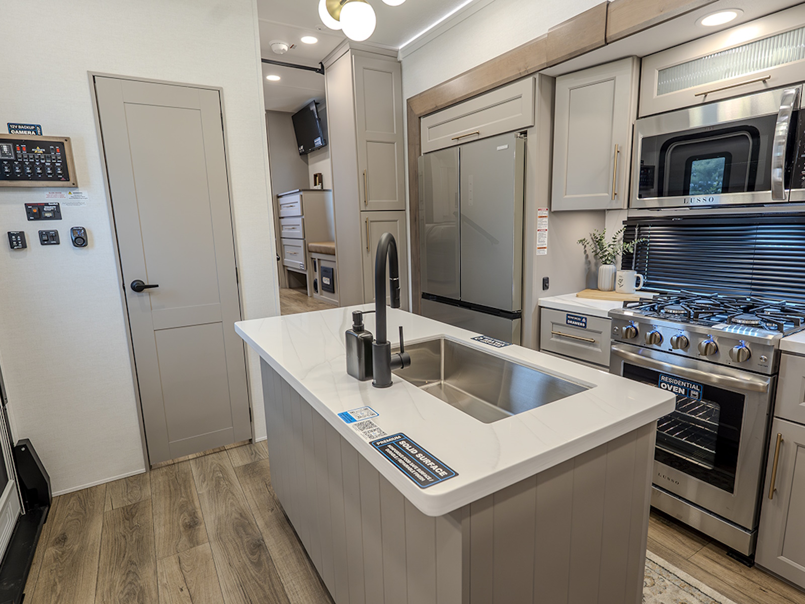 The half bath near the main entry adds convenience, and the separate kitchen offers a functional, well-equipped cooking space. The chef will love the residential microwave, range, and 19 cu. ft. 12V residential refrigerator, as well as the kitchen island with a large sink and extra counter space for meal prep. There’s also a pantry for additional storage.