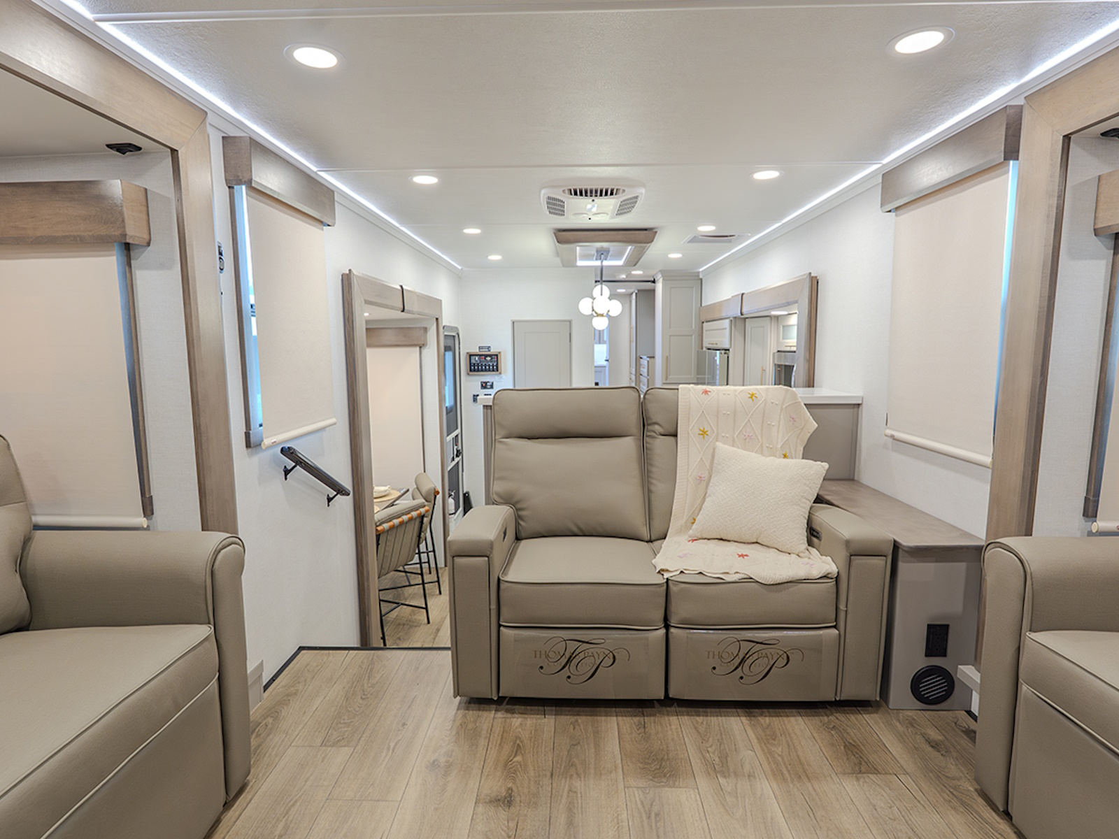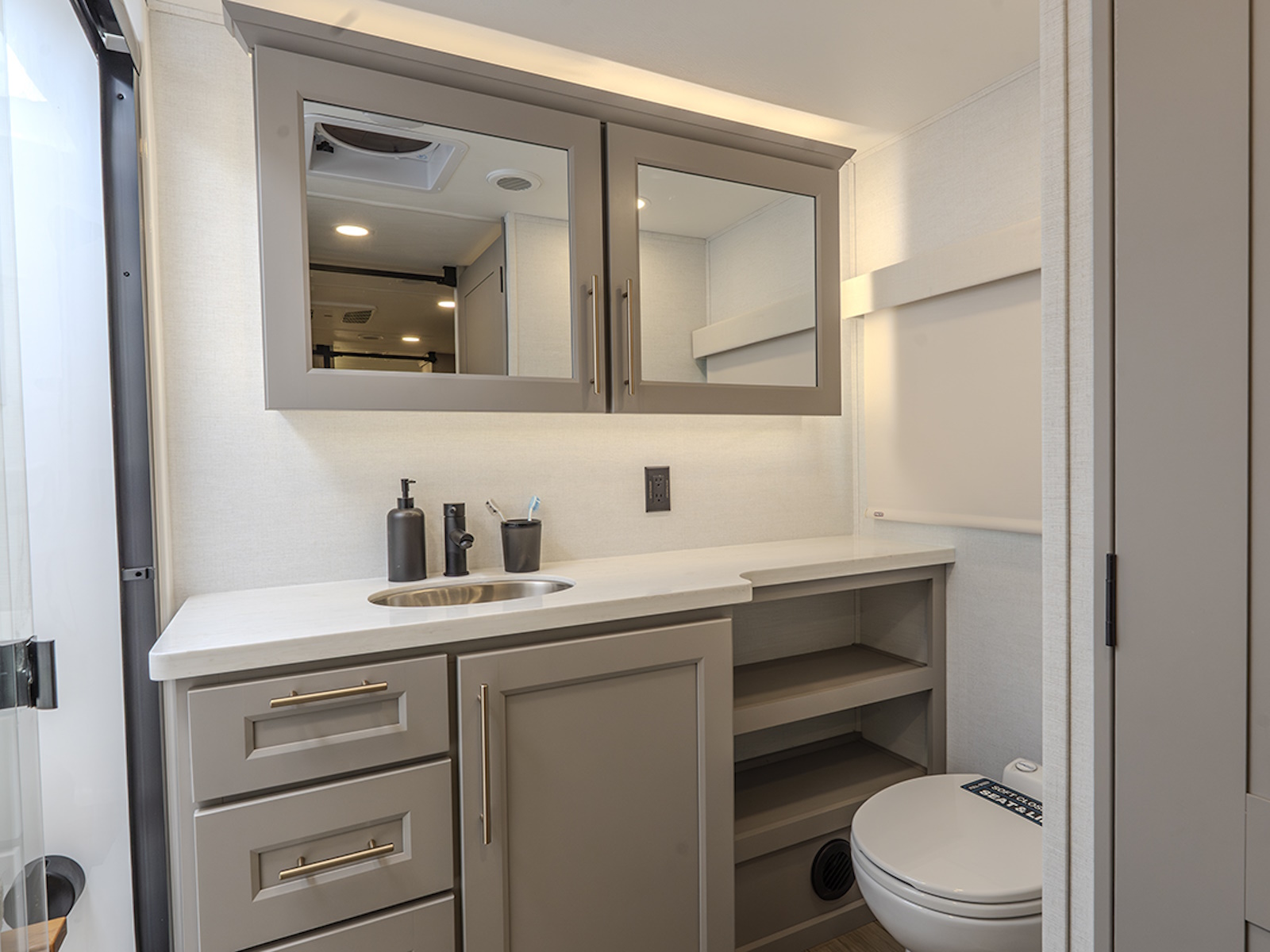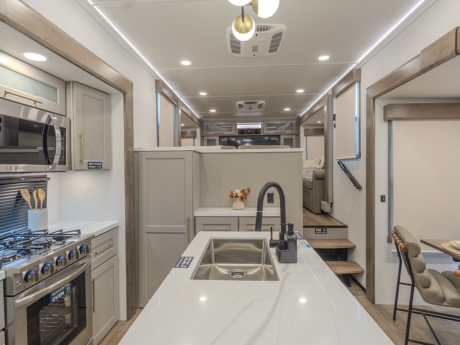 The half bath near the main entry adds convenience, and the separate kitchen offers a functional, well-equipped cooking space. The chef will love the residential microwave, range, and 19 cu. ft. 12V residential refrigerator, as well as the kitchen island with a large sink and extra counter space for meal prep. There’s also a pantry for additional storage.