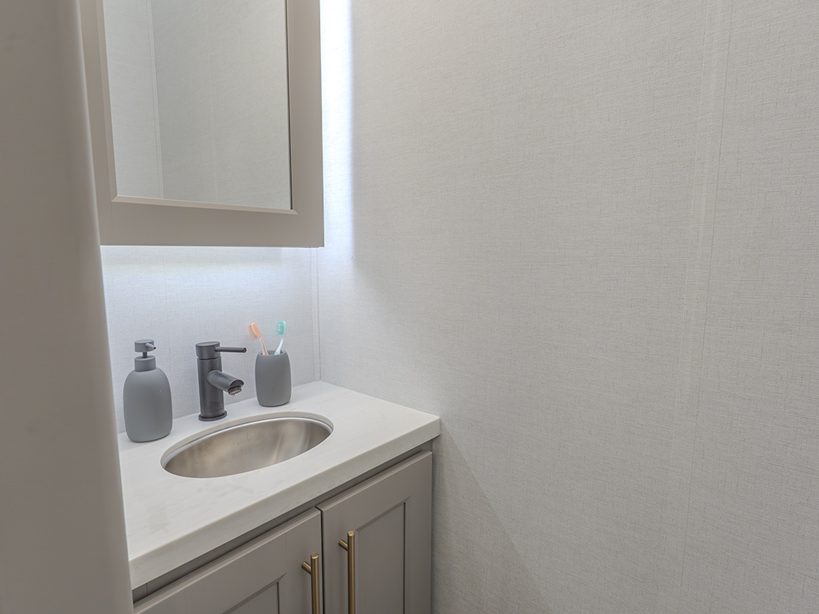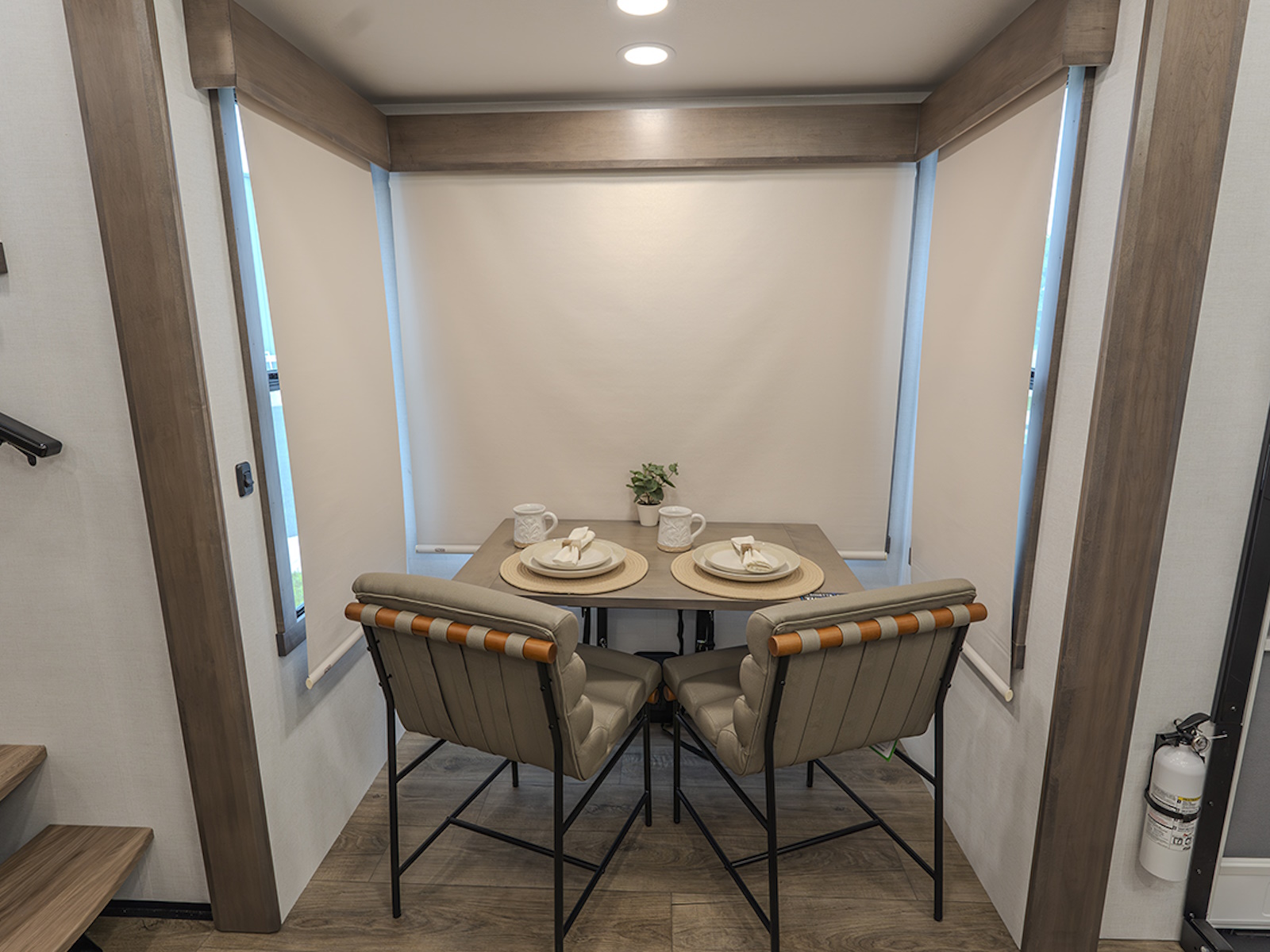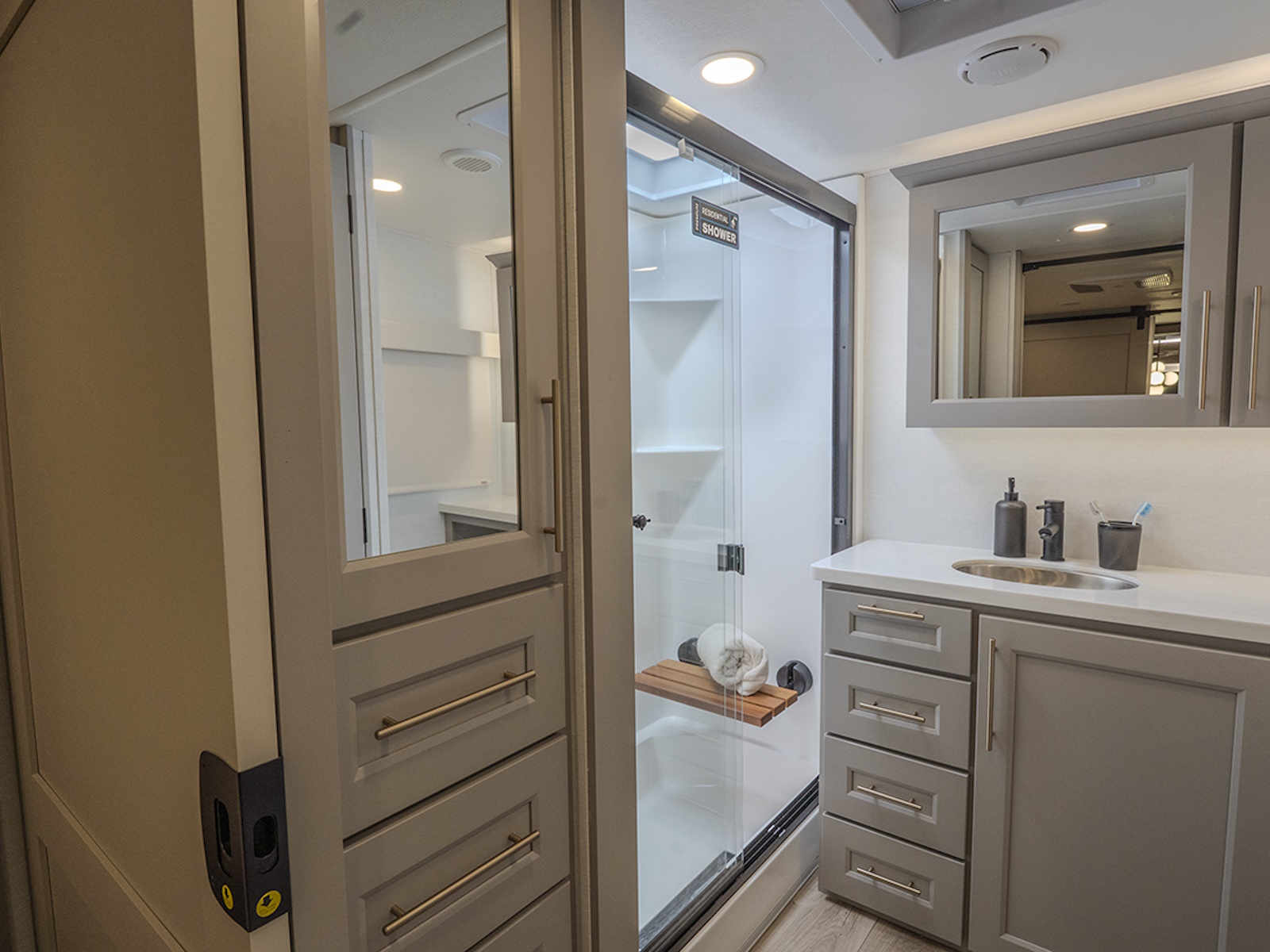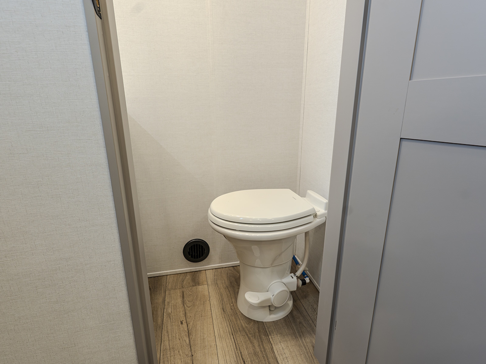 The half bath near the main entry adds convenience, and the separate kitchen offers a functional, well-equipped cooking space. The chef will love the residential microwave, range, and 19 cu. ft. 12V residential refrigerator, as well as the kitchen island with a large sink and extra counter space for meal prep. There’s also a pantry for additional storage.