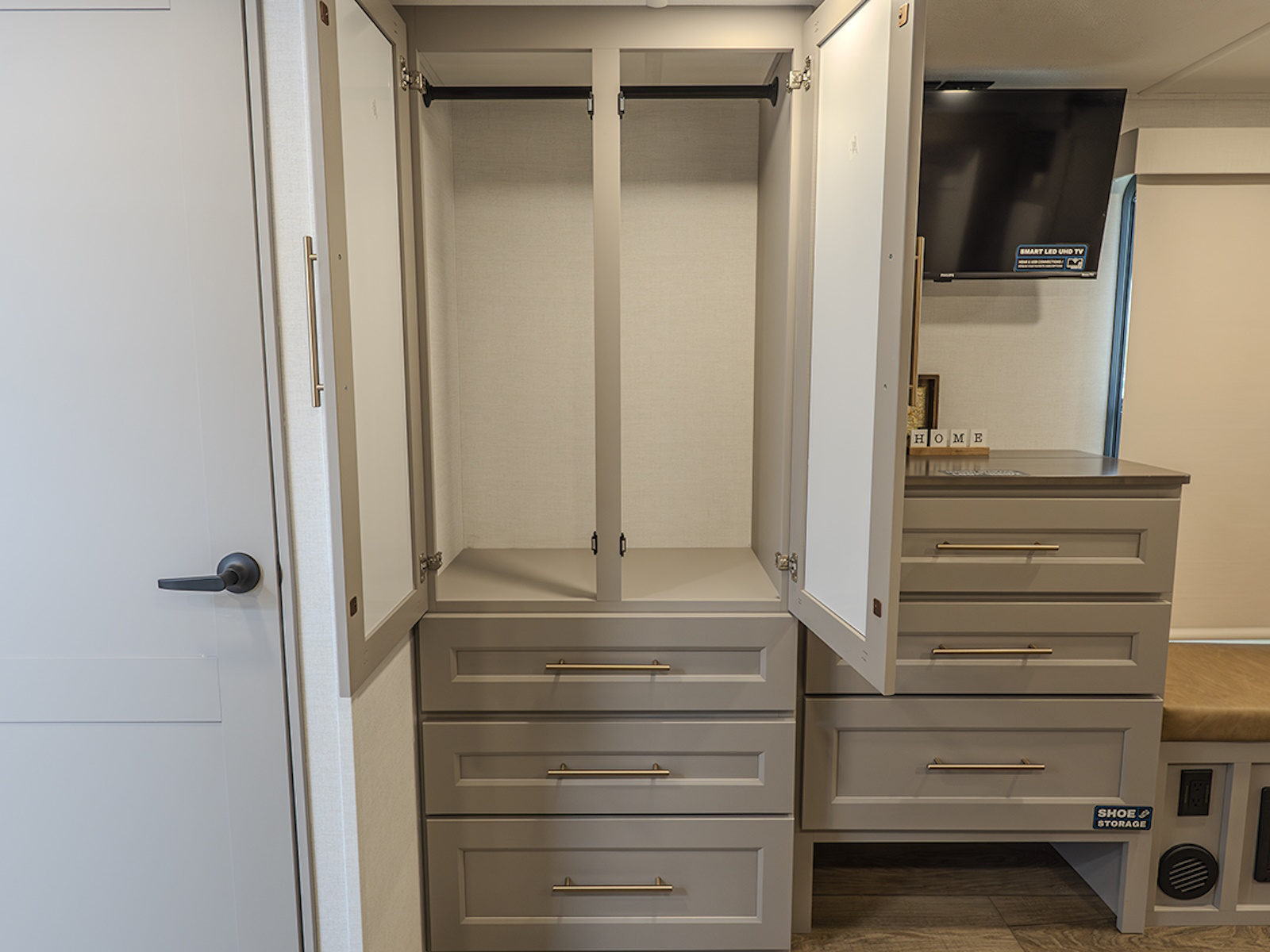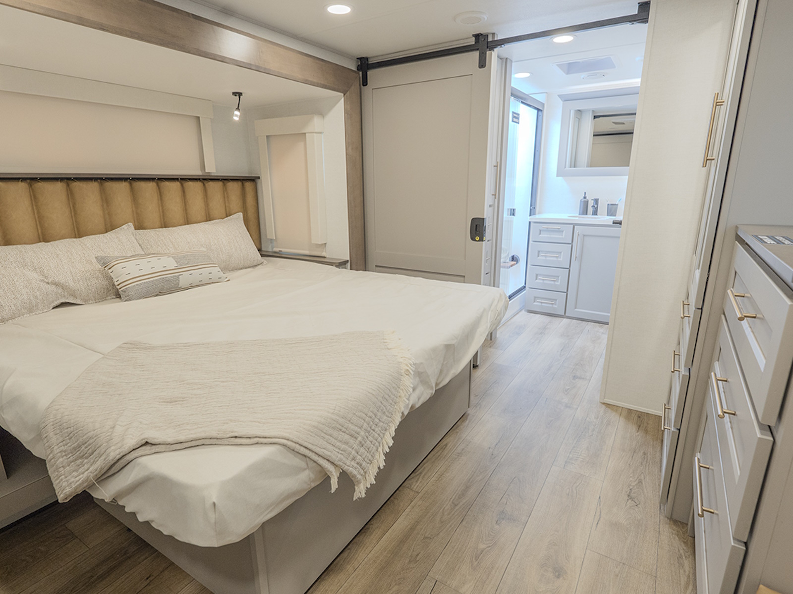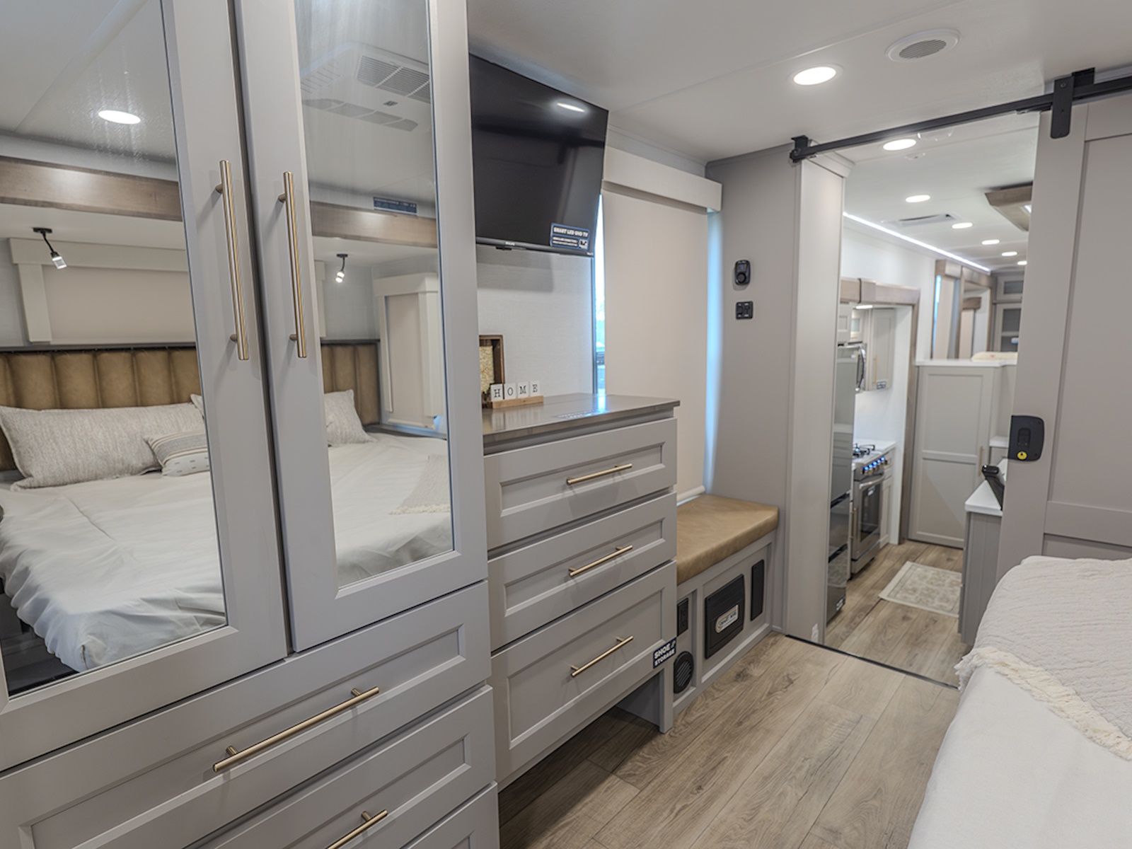 Inside, the master suite is a true retreat, featuring a king bed slide-out that maximizes space, along with a flip-top dresser, a Smart TV, and plenty of wardrobe and shelf storage. The rear bathroom includes a residential-style shower, a porcelain toilet with a soft-close seat, and more storage for your linens and essentials.