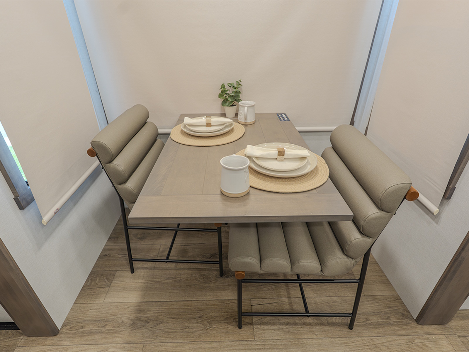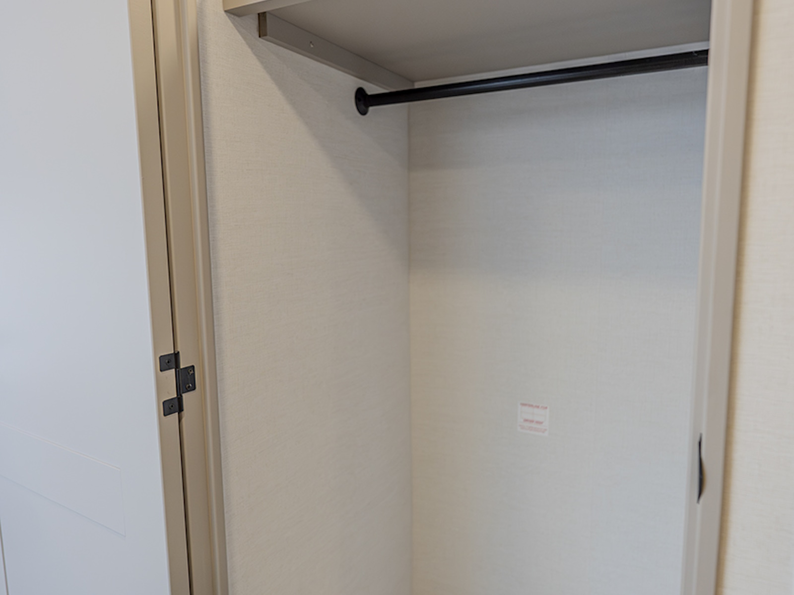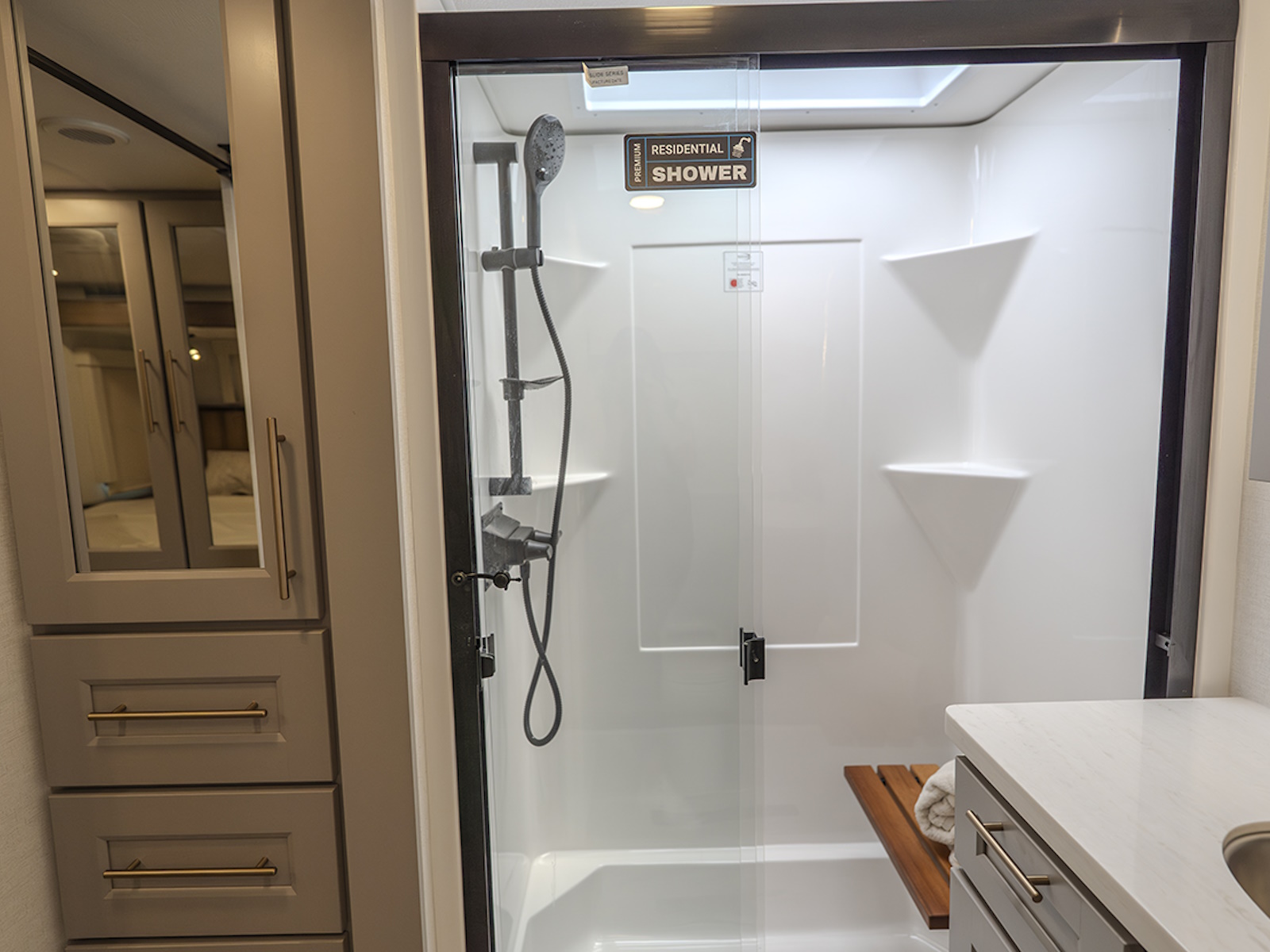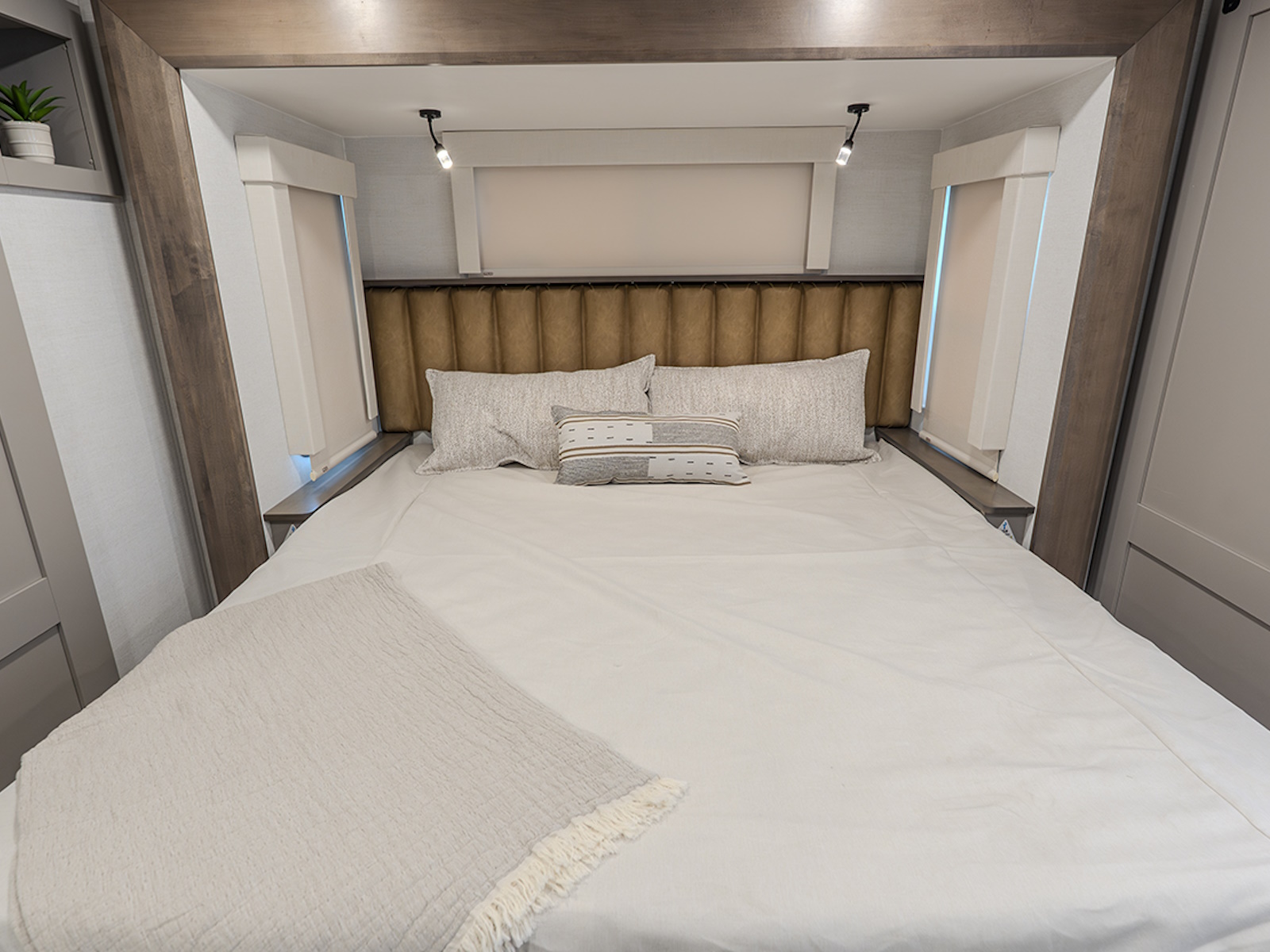 Inside, the master suite is a true retreat, featuring a king bed slide-out that maximizes space, along with a flip-top dresser, a Smart TV, and plenty of wardrobe and shelf storage. The rear bathroom includes a residential-style shower, a porcelain toilet with a soft-close seat, and more storage for your linens and essentials.