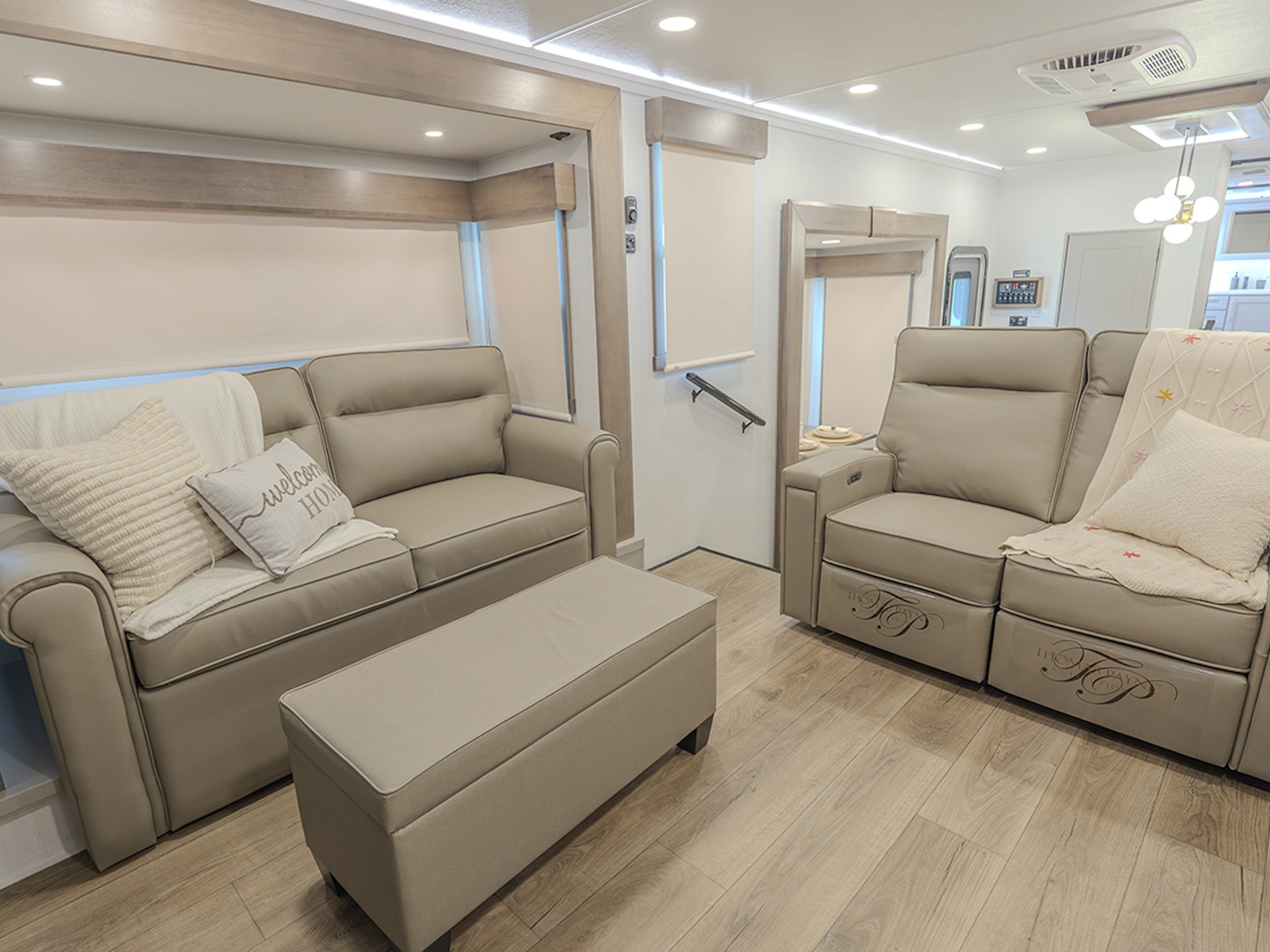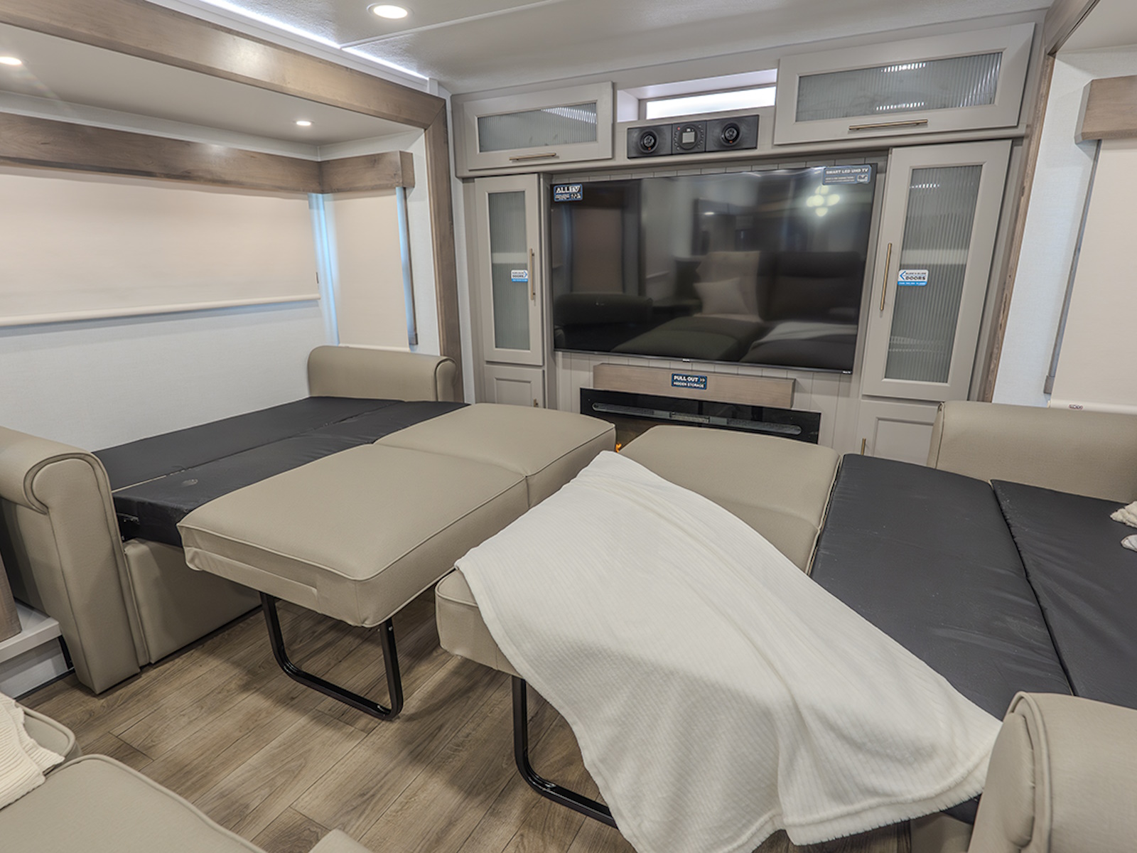The middle living area features dual sleeper sofas and a dual recliner loveseat, all positioned for optimal viewing of the 55" Smart TV with pull-out fireplace storage below. The swivel table and desk in the slide-out provide a versatile space to work or dine, with stunning views through the atrium windows.