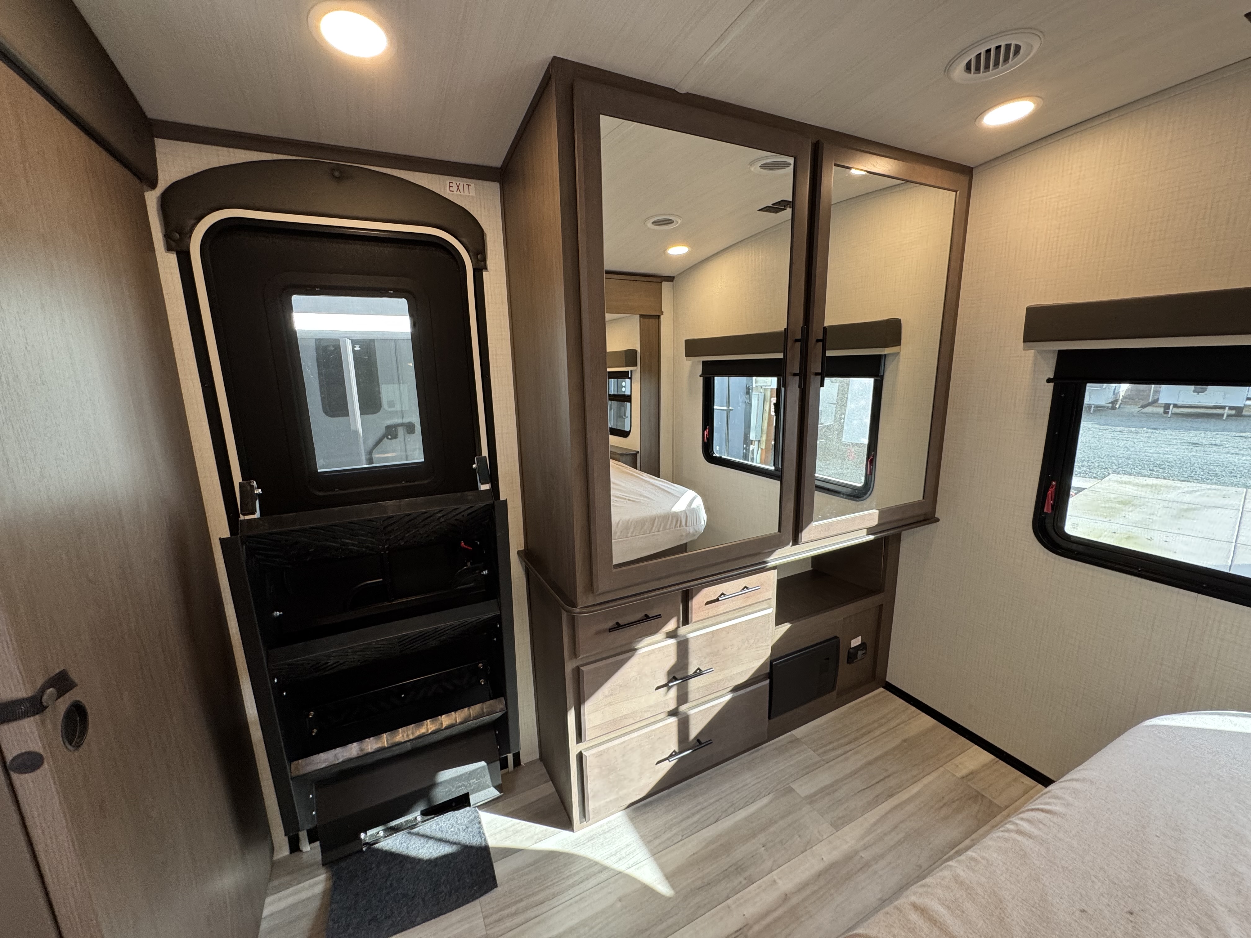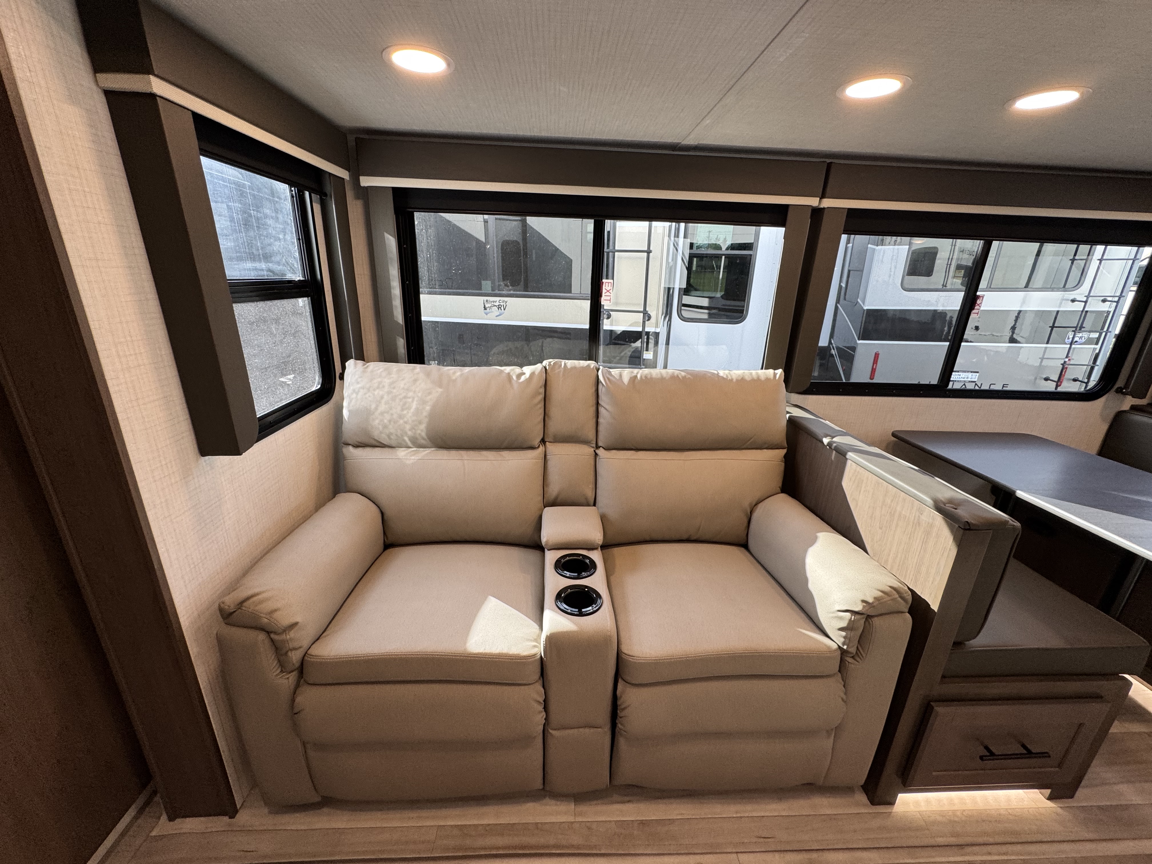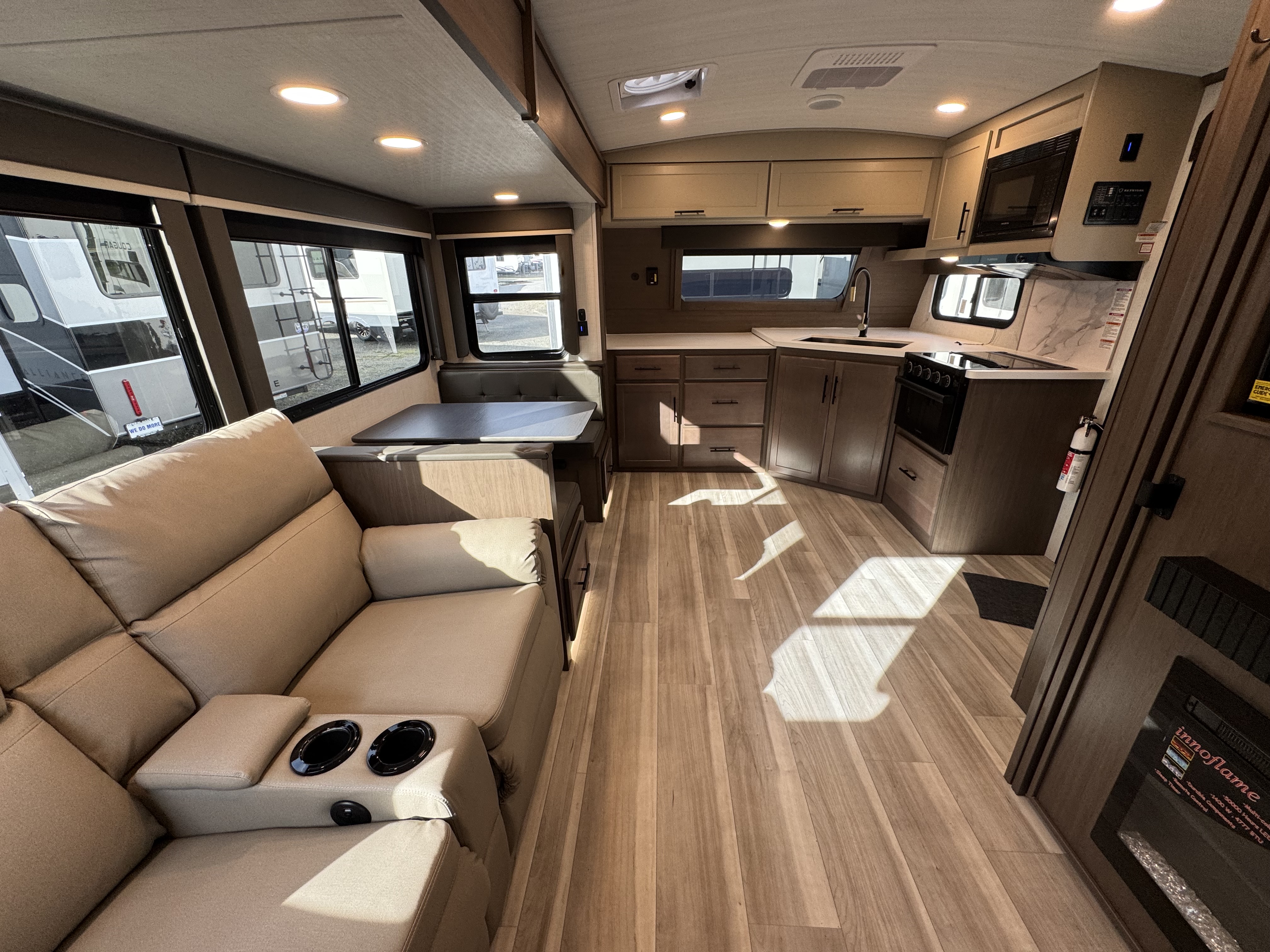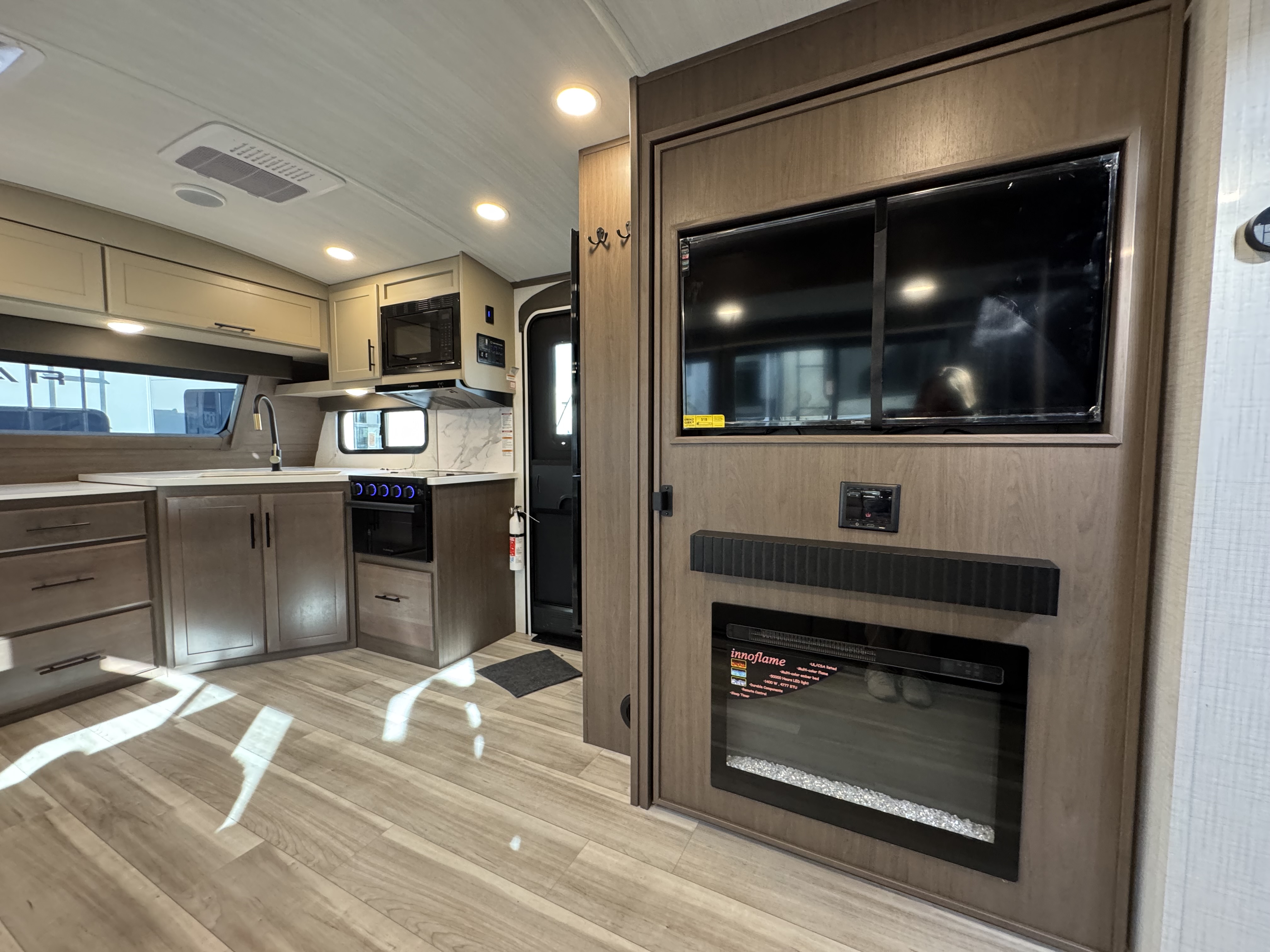 - LED HDTV in living area 12V Bluetooth® player with HDMI ARC control, 12v USB charging centers, & exterior TV hookup